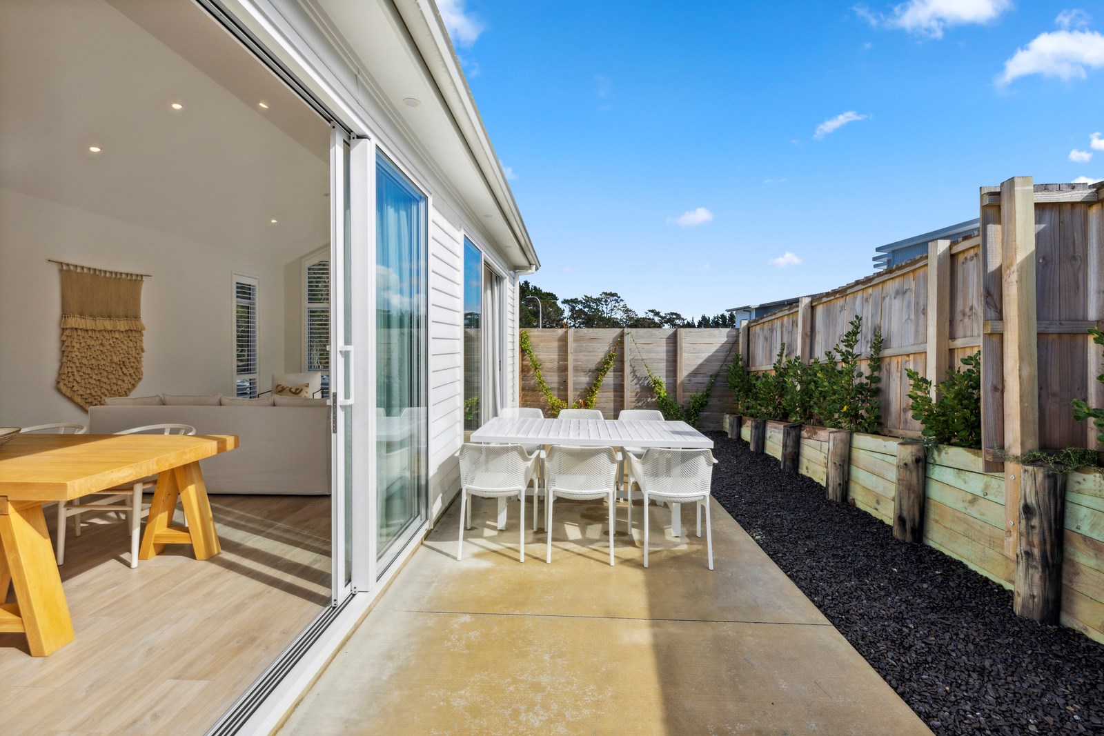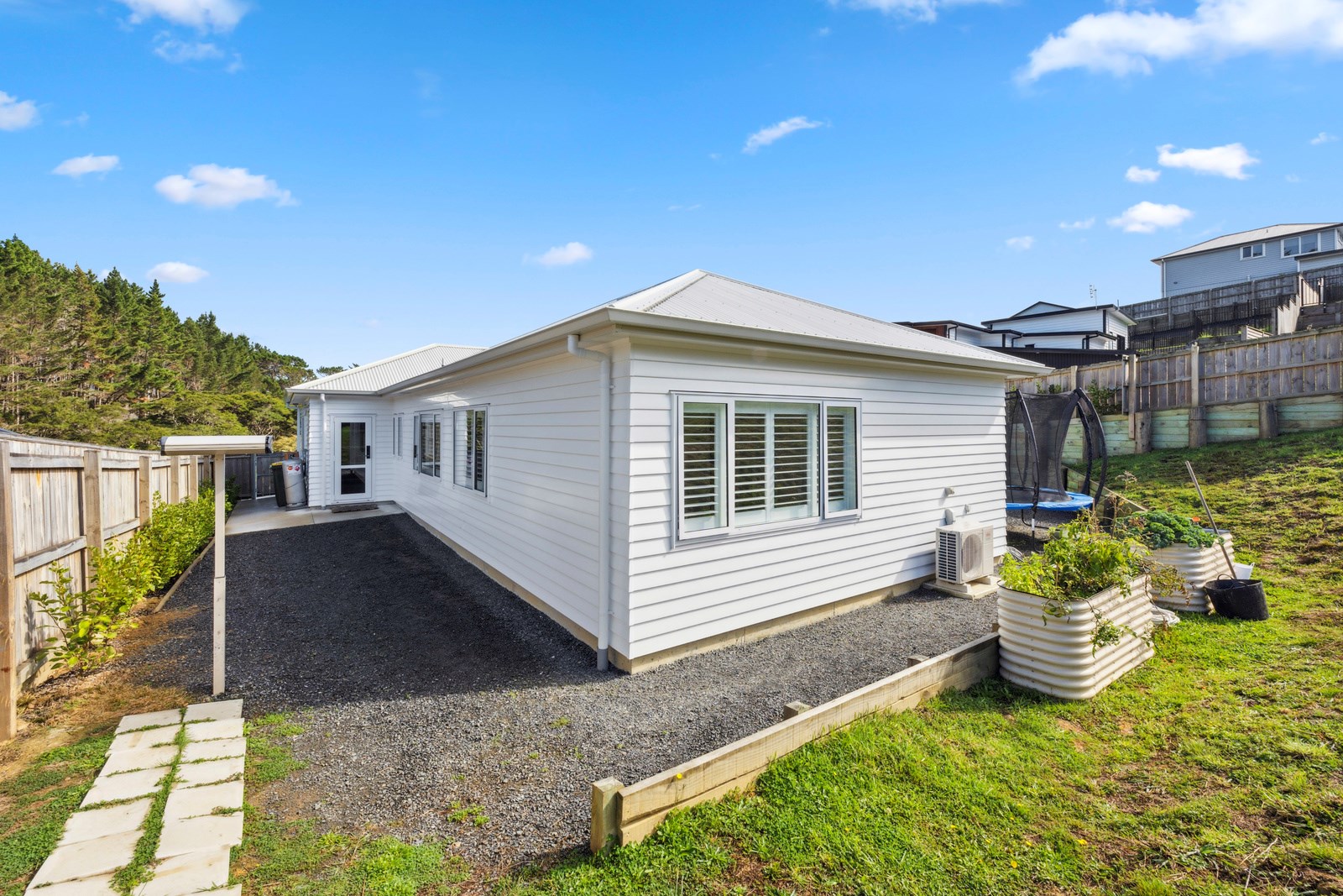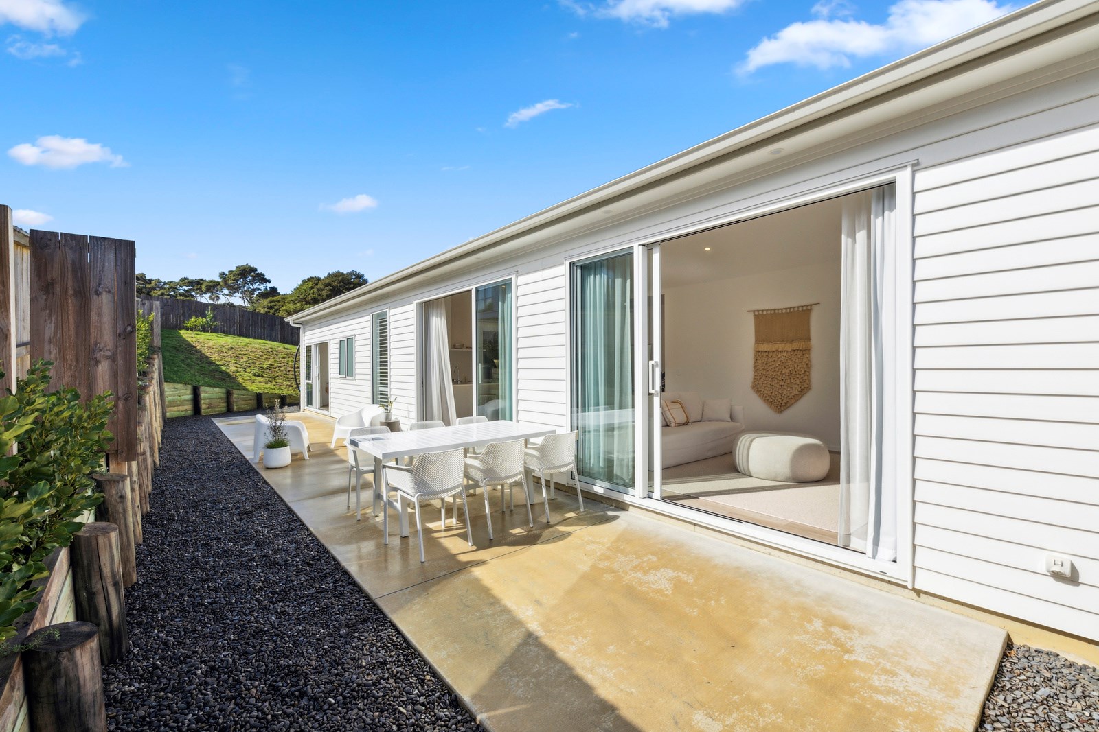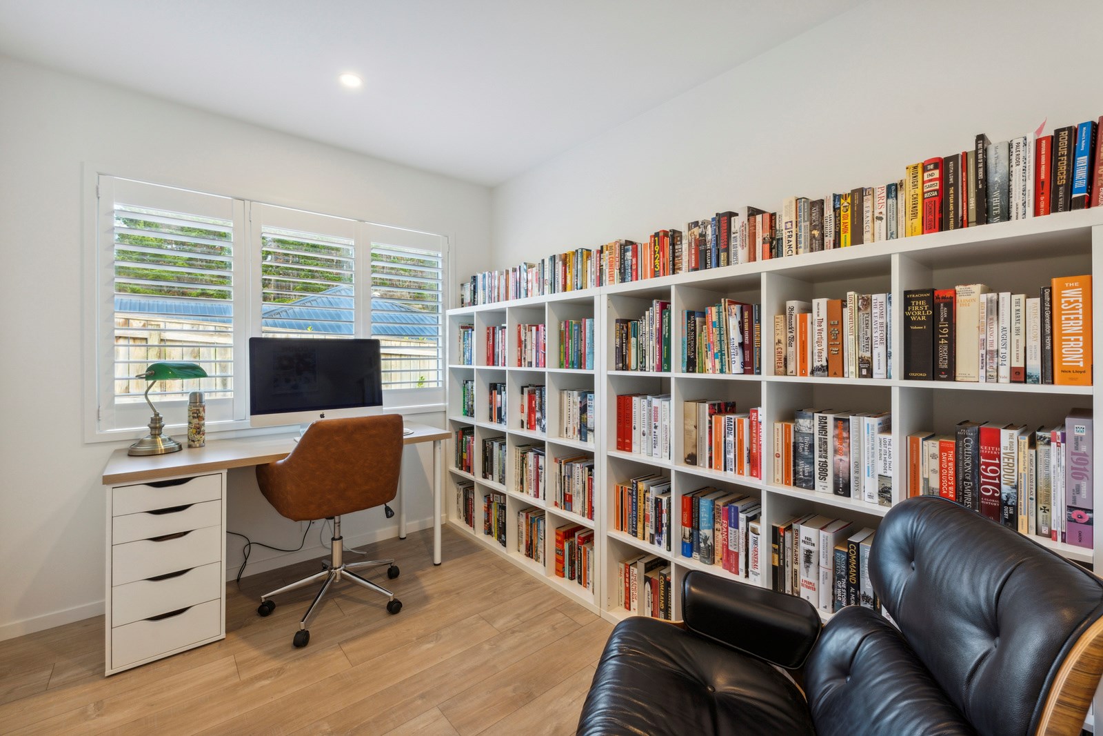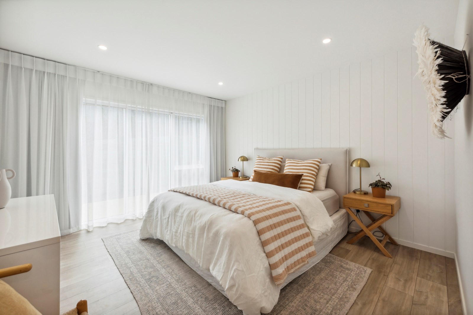 The very tight budget was paramount in the creation of this family home in East Auckland’s Maraetai. Working backwards, cost considerations had to be given to extensive earthworks, retaining walls, water tanks and specific plumbing and drainage requirements prior to any thought of how the house would look and feel. When it came to design, the brief was simple – three bedrooms, an office and open-plan living in a modern, maintenance-free house with lots of light. Palisade weatherboards and longrun roofing were chosen to embrace the conditions of the Pōhutukawa Coast location and provide clean lines. Full-height angled windows to the front facade provide balance between the house’s modern and classic characteristics. That balance is also evident in the kitchen, dining and lounge areas via the raised and raking ceilings and shuttered windows. Havanna Oak flooring continues through the barn-style door to a powder room, three bedrooms, two bathrooms, an office and internal garage.