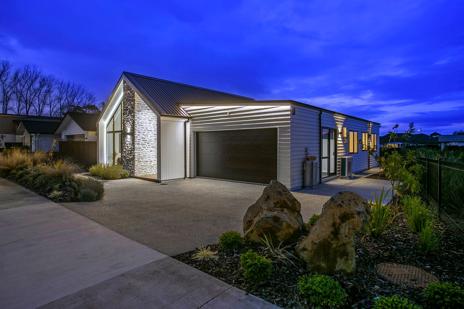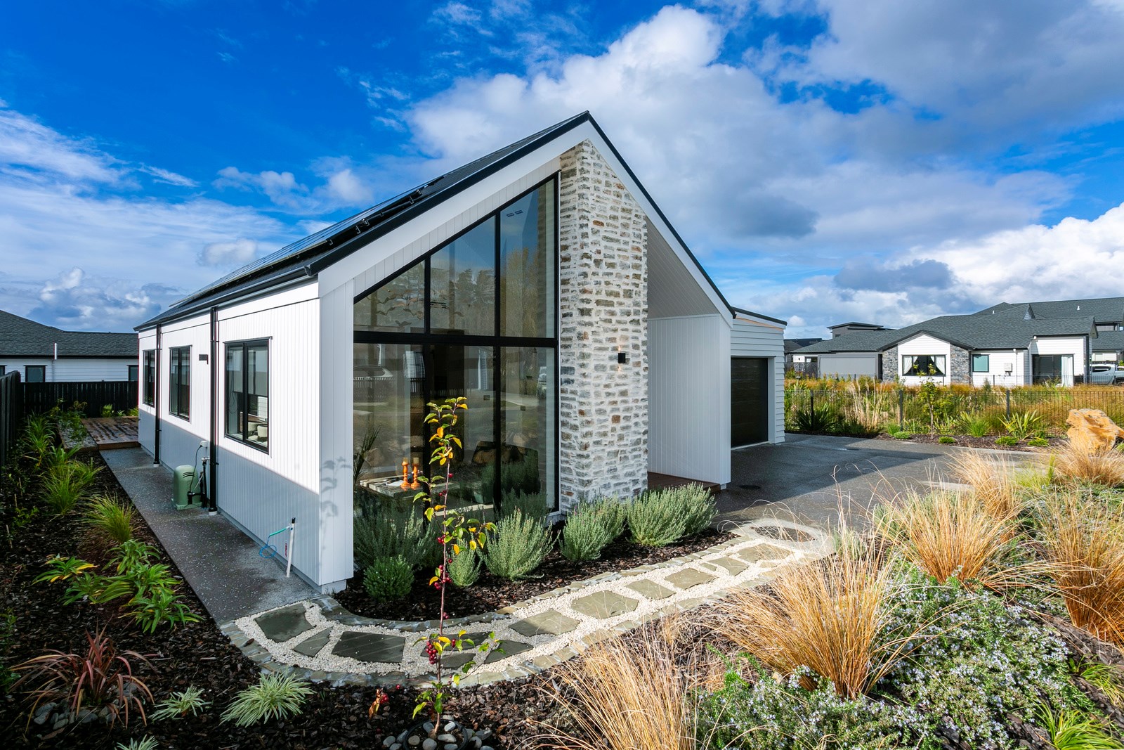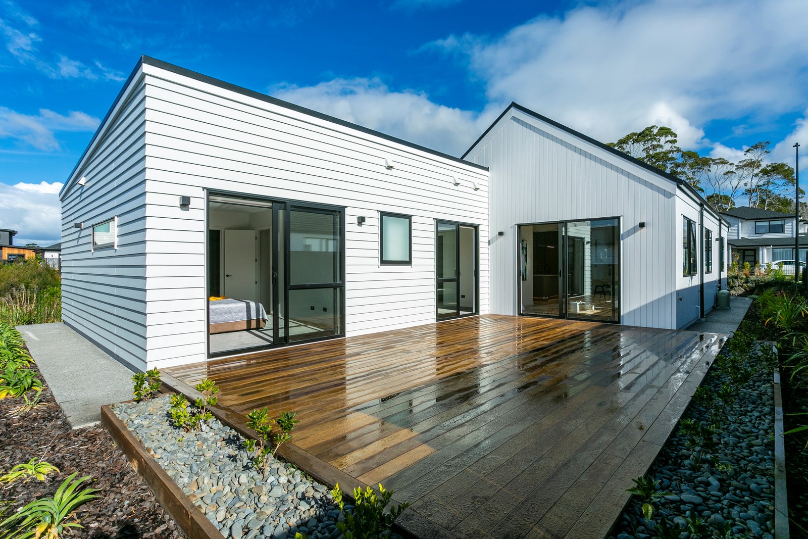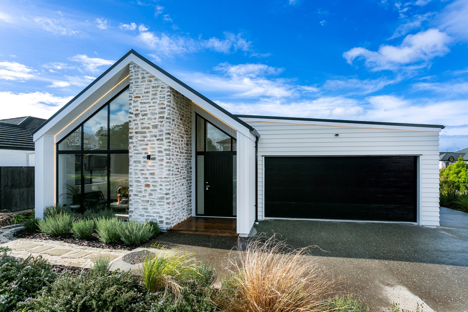 Some houses just look as if they belong, and this is a prime example. Curb appeal is instant, thanks to white vertical and horizontal weatherboard, a black garage door, floor-to-ceiling windows and a striking schist-clad fireplace. Everything is settled and softened with contemporary landscaping. The 203sqm home exudes timeless elegance. That sense of enduring style continues inside where light streams in through all those windows as well as sliders that open onto timber decking. The living room and two of the four bedrooms enjoy access to this sunny outdoor area. Anchoring the inviting open-plan dining-living space in pale and natural shades is a designer kitchen with cabinets that manage to both complement and contrast in a darker woody hue. The marbled splashback and counter atop the stylish curved island are jewels; a walk-in pantry is supremely practical.