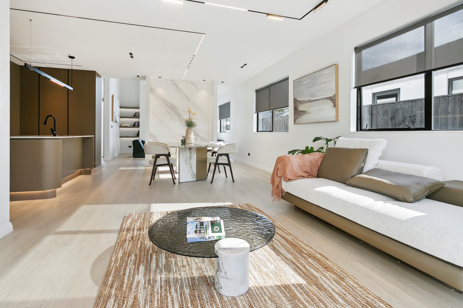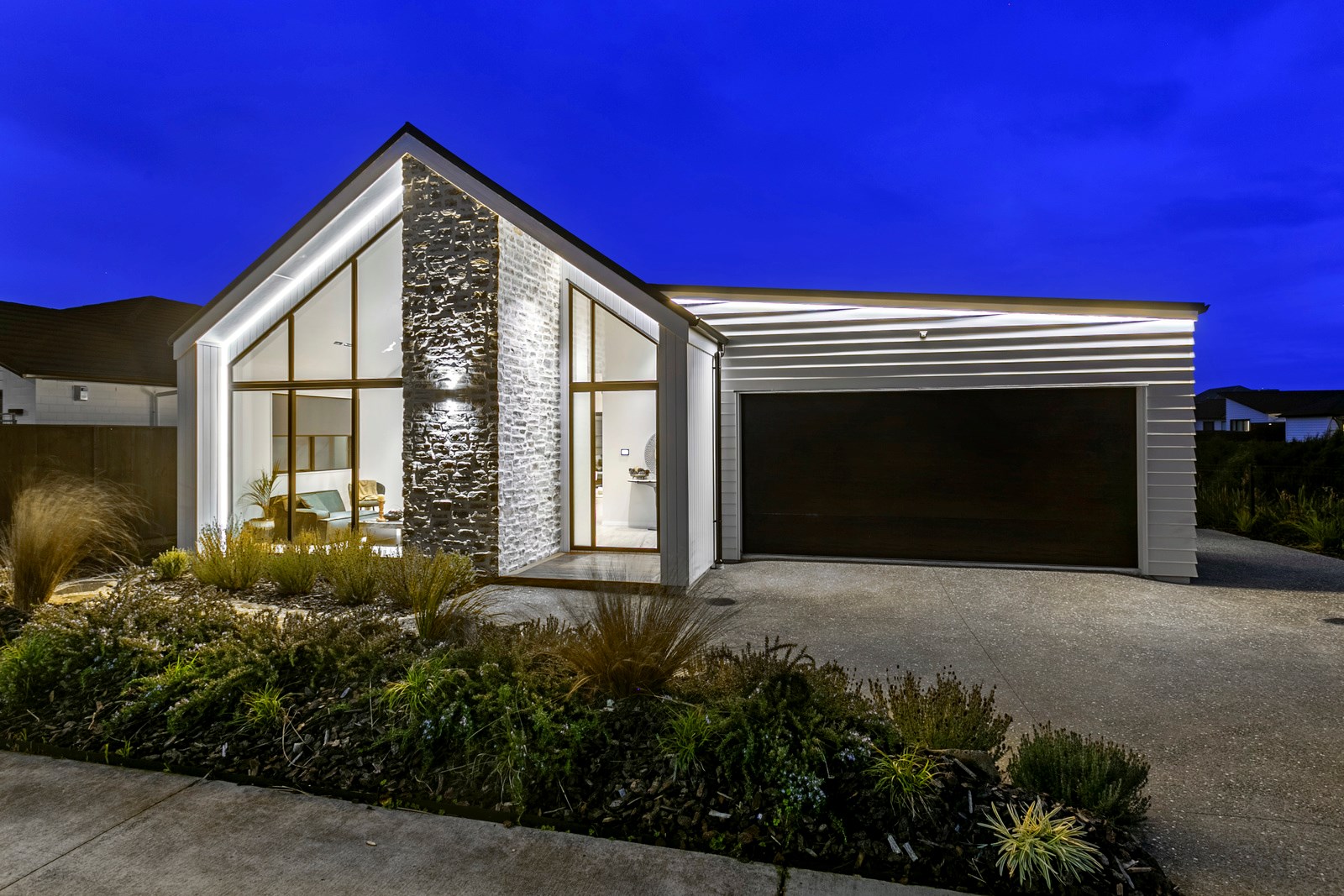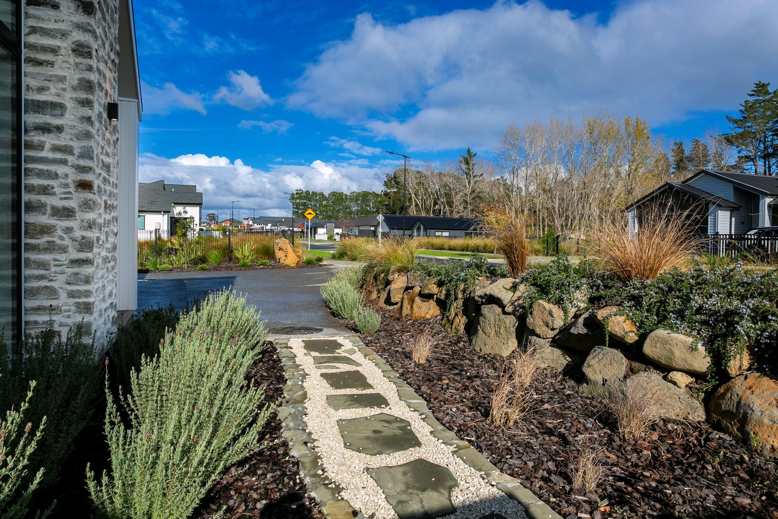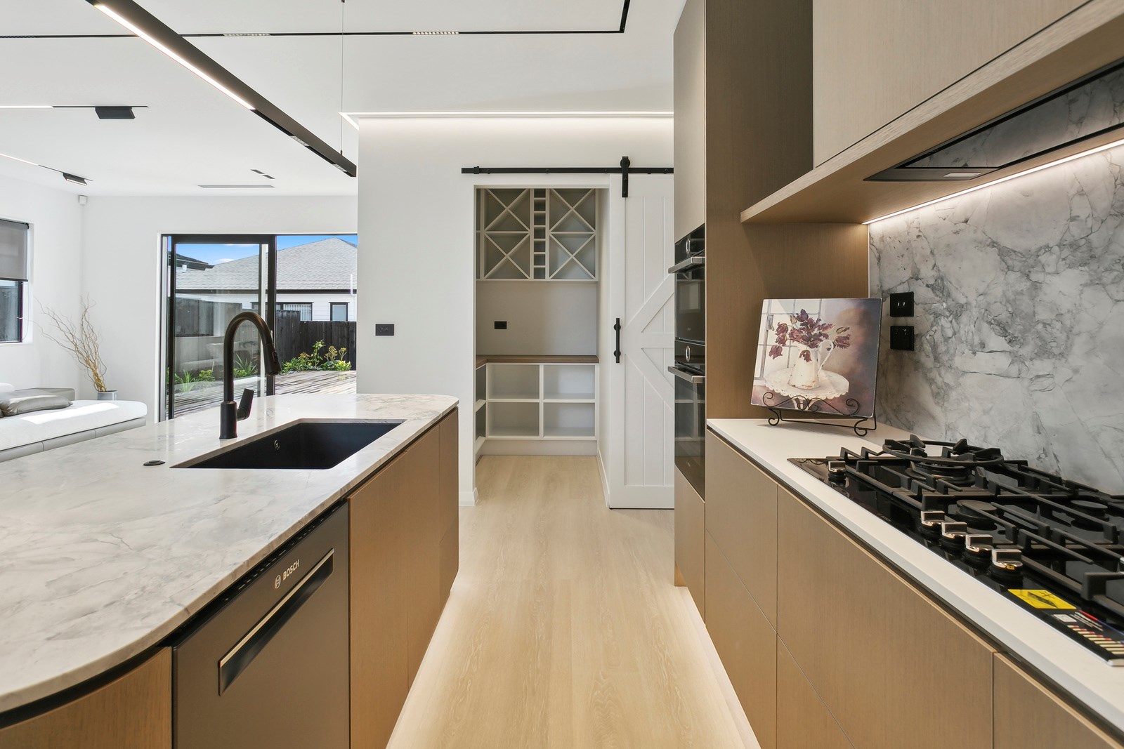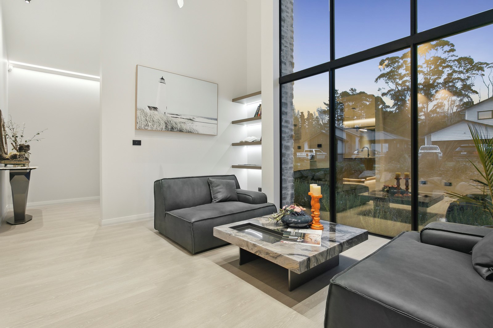 Some houses just look as if they belong, and this is a prime example. Curb appeal is instant, thanks to white vertical and horizontal weatherboard, a black garage door, floor-to-ceiling windows and a striking schist-clad fireplace. Everything is settled and softened with contemporary landscaping. The 203sqm home exudes timeless elegance. That sense of enduring style continues inside where light streams in through all those windows as well as sliders that open onto timber decking. The living room and two of the four bedrooms enjoy access to this sunny outdoor area. Anchoring the inviting open-plan dining-living space in pale and natural shades is a designer kitchen with cabinets that manage to both complement and contrast in a darker woody hue. The marbled splashback and counter atop the stylish curved island are jewels; a walk-in pantry is supremely practical.