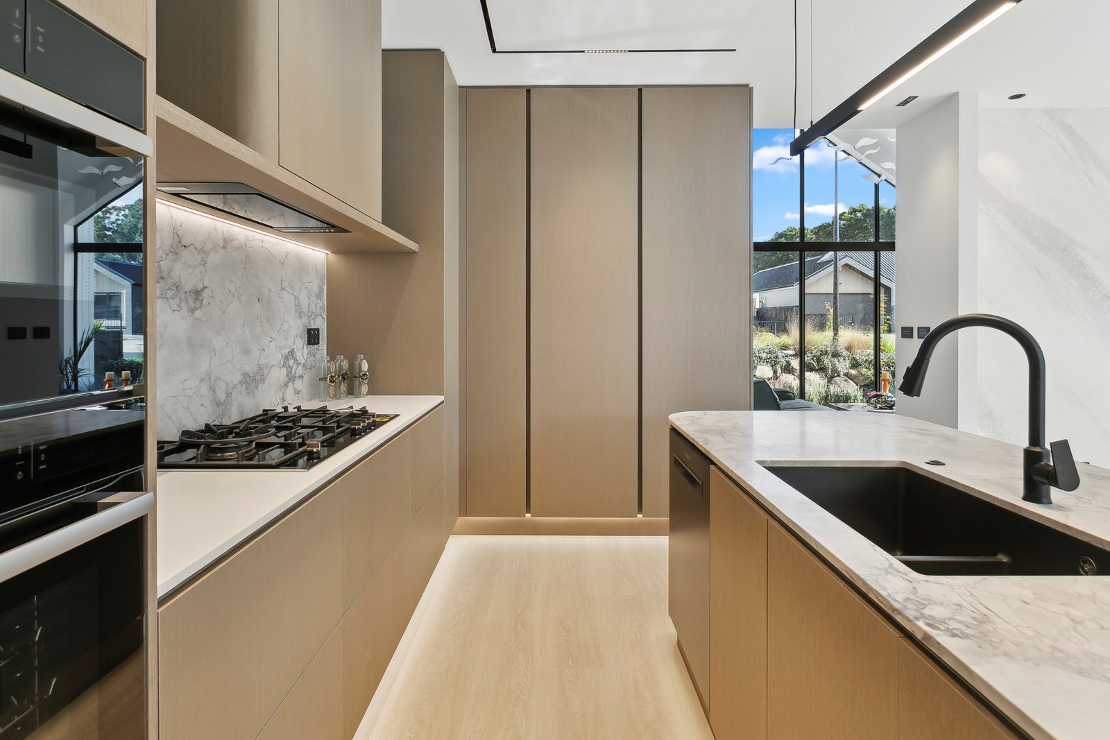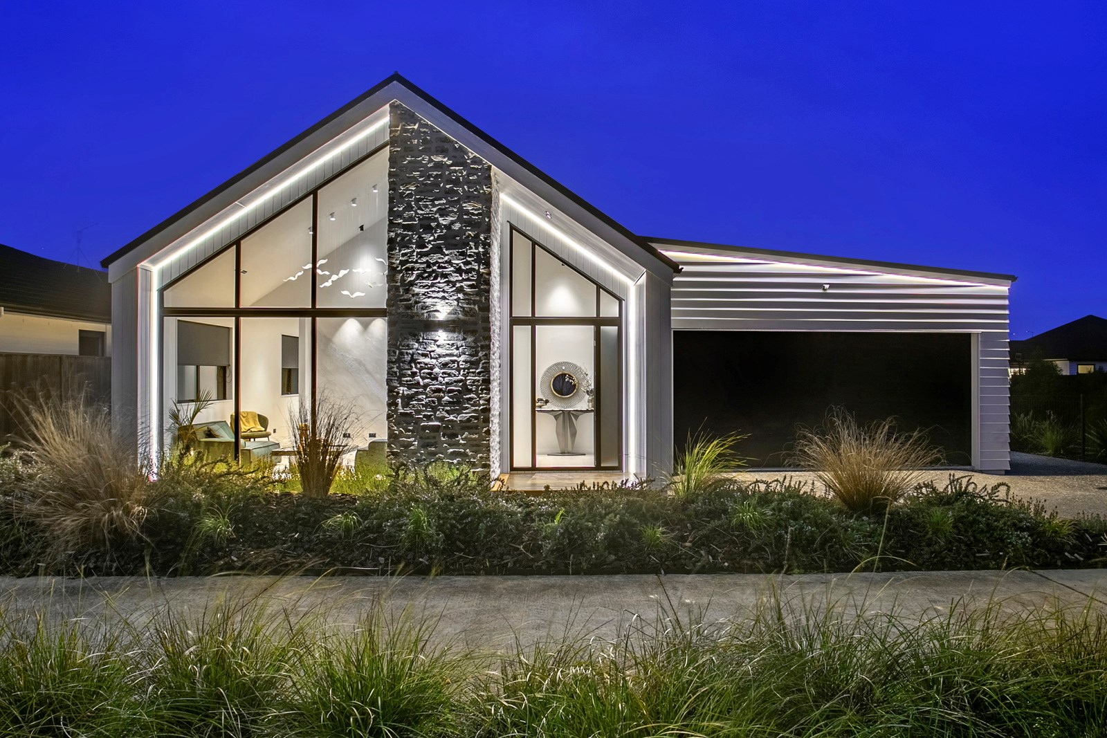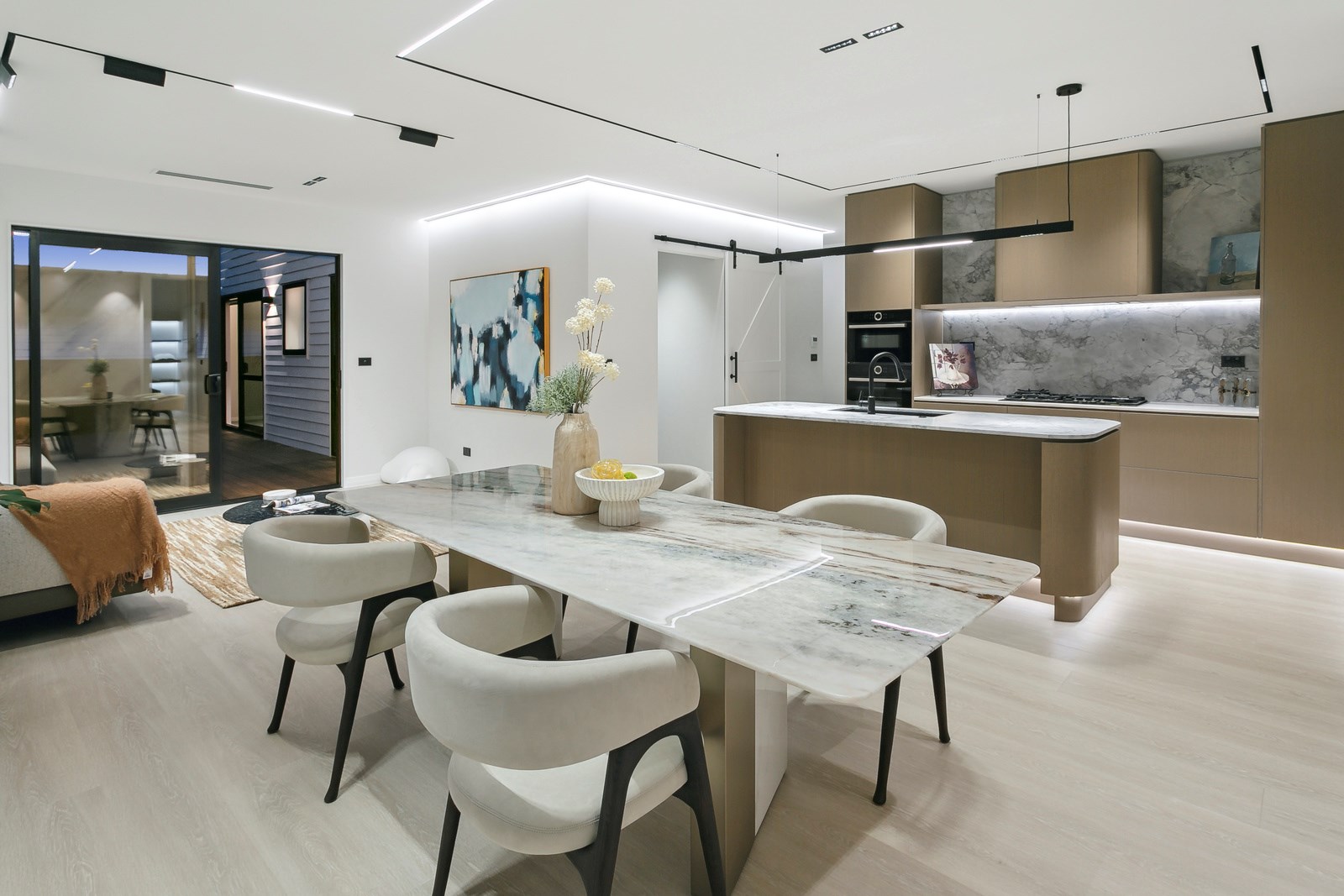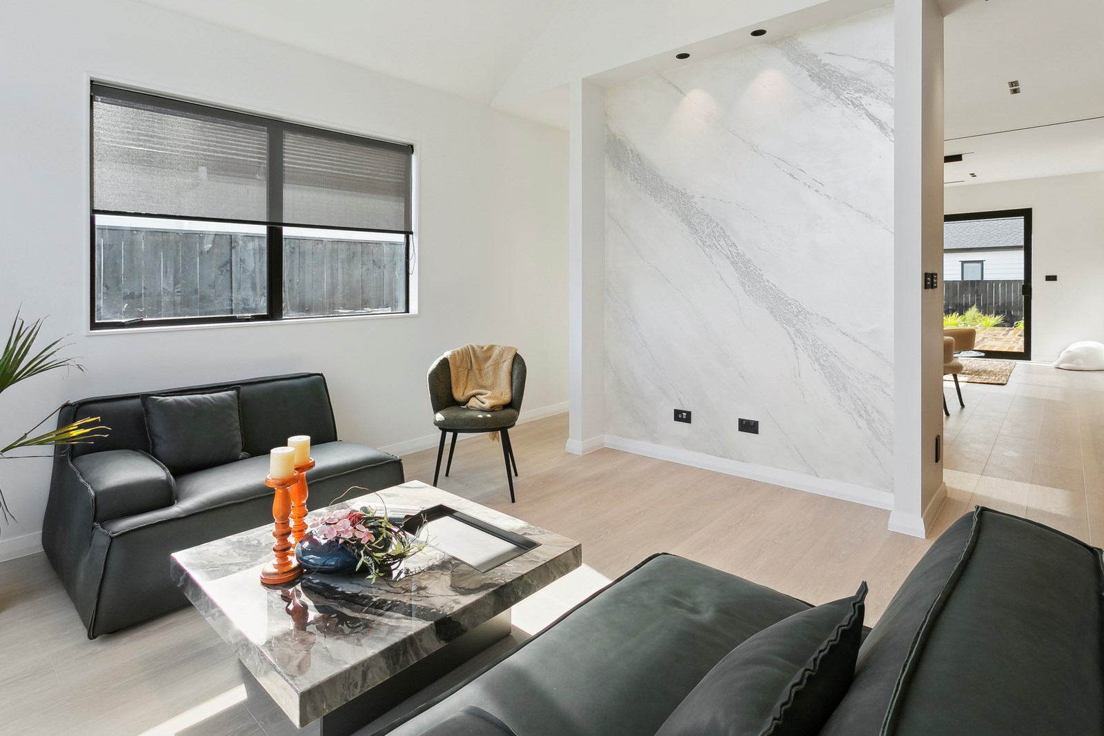 Some houses just look as if they belong, and this is a prime example. Curb appeal is instant, thanks to white vertical and horizontal weatherboard, a black garage door, floor-to-ceiling windows and a striking schist-clad fireplace. Everything is settled and softened with contemporary landscaping. The 203sqm home exudes timeless elegance. That sense of enduring style continues inside where light streams in through all those windows as well as sliders that open onto timber decking. The living room and two of the four bedrooms enjoy access to this sunny outdoor area. Anchoring the inviting open-plan dining-living space in pale and natural shades is a designer kitchen with cabinets that manage to both complement and contrast in a darker woody hue. The marbled splashback and counter atop the stylish curved island are jewels; a walk-in pantry is supremely practical.