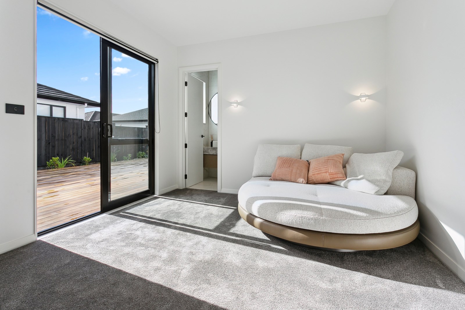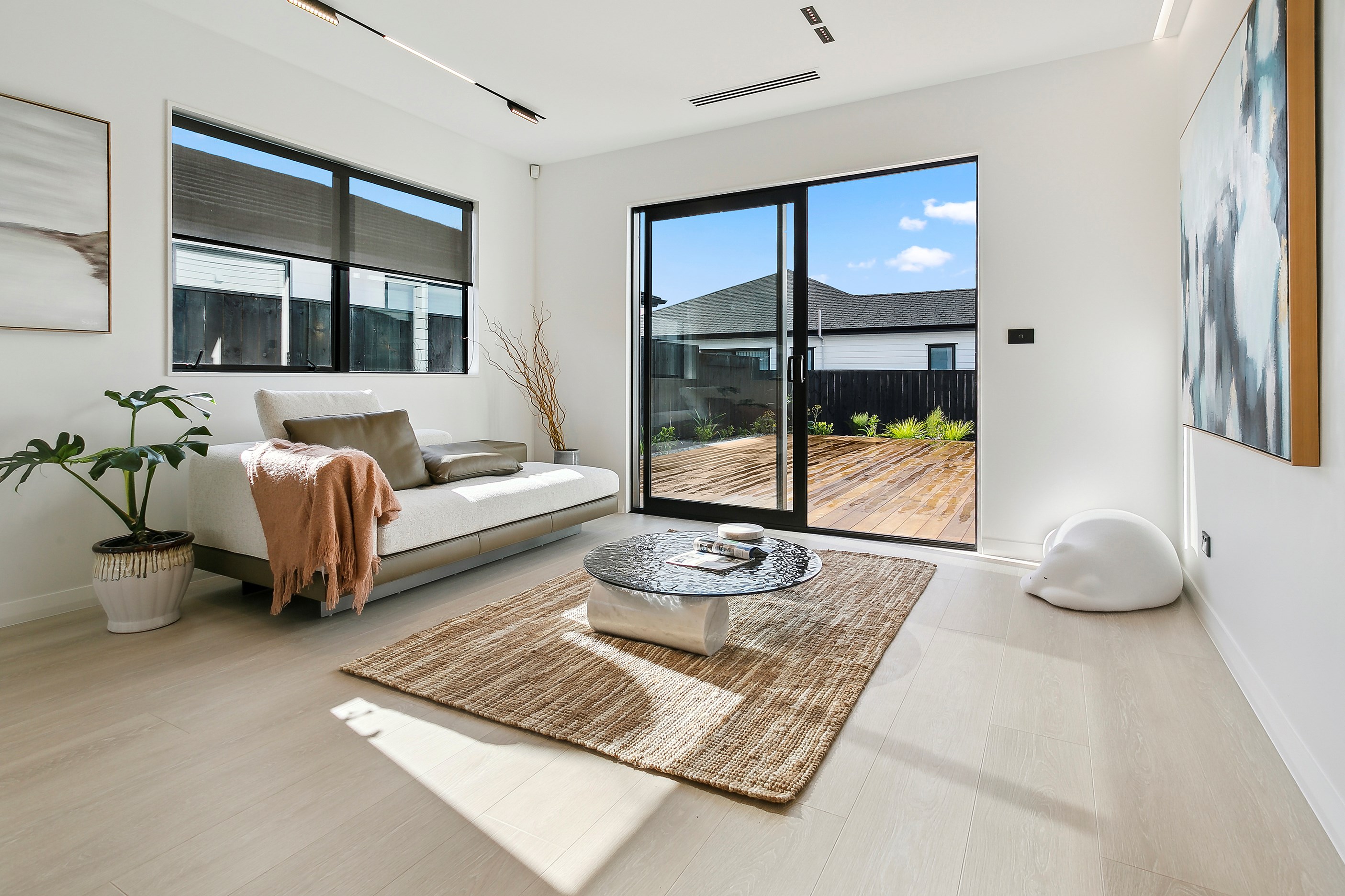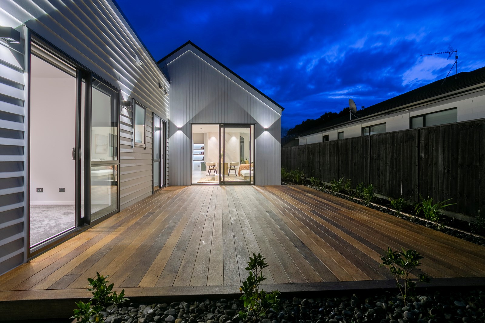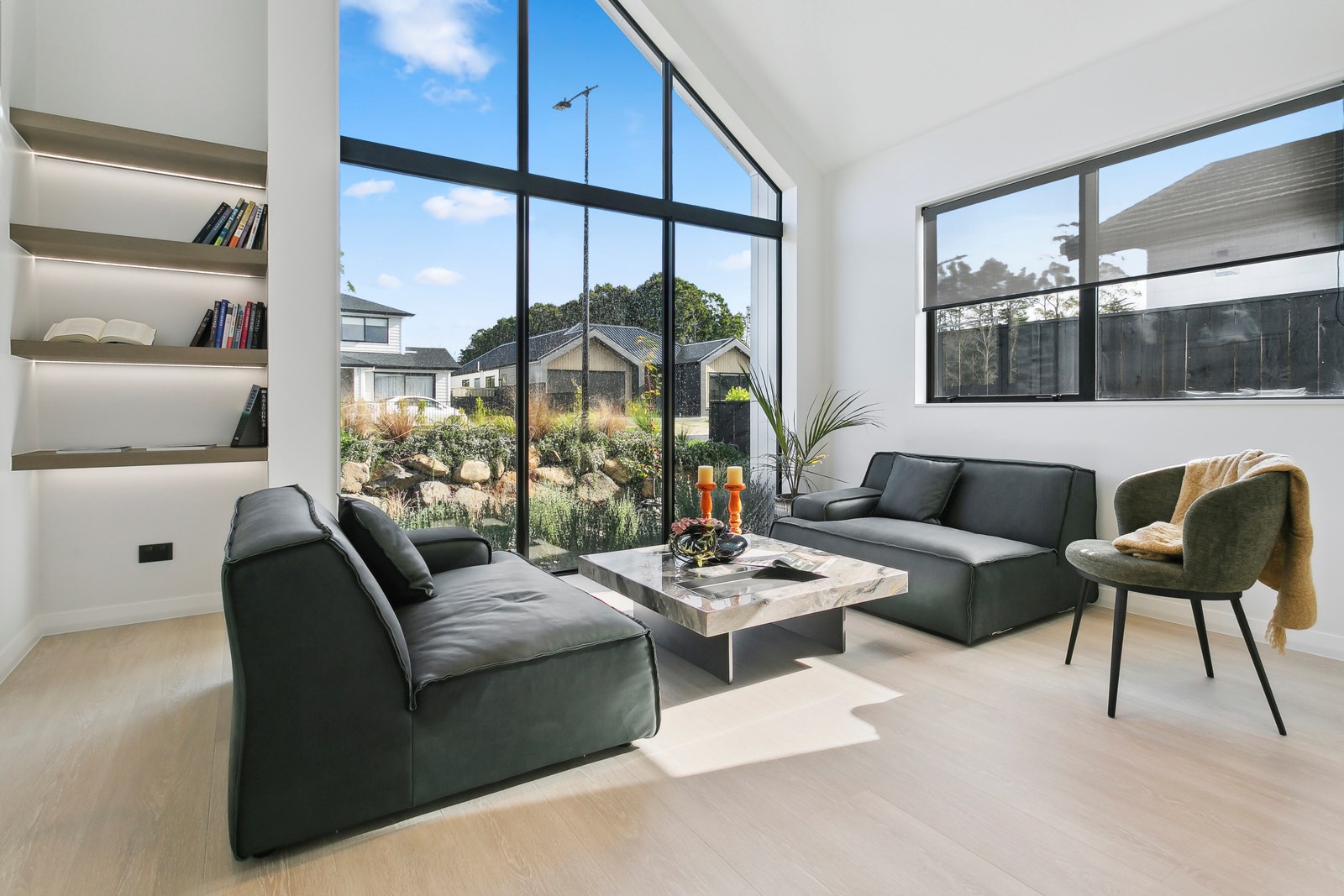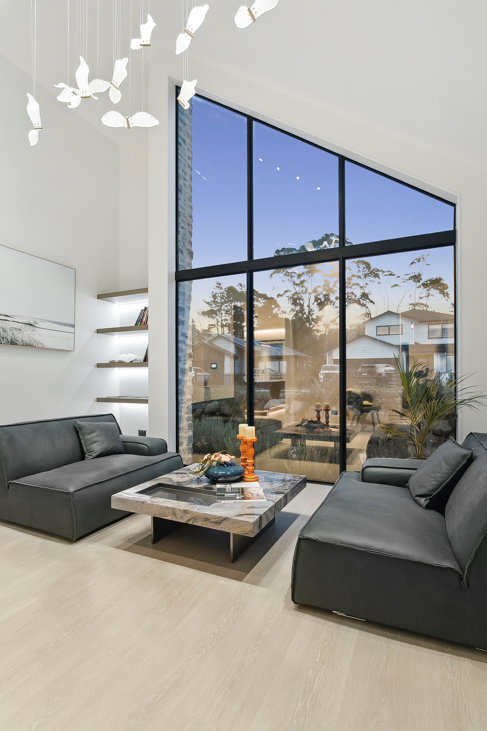 Some houses just look as if they belong, and this is a prime example. Curb appeal is instant, thanks to white vertical and horizontal weatherboard, a black garage door, floor-to-ceiling windows and a striking schist-clad fireplace. Everything is settled and softened with contemporary landscaping. The 203sqm home exudes timeless elegance. That sense of enduring style continues inside where light streams in through all those windows as well as sliders that open onto timber decking. The living room and two of the four bedrooms enjoy access to this sunny outdoor area. Anchoring the inviting open-plan dining-living space in pale and natural shades is a designer kitchen with cabinets that manage to both complement and contrast in a darker woody hue. The marbled splashback and counter atop the stylish curved island are jewels; a walk-in pantry is supremely practical.