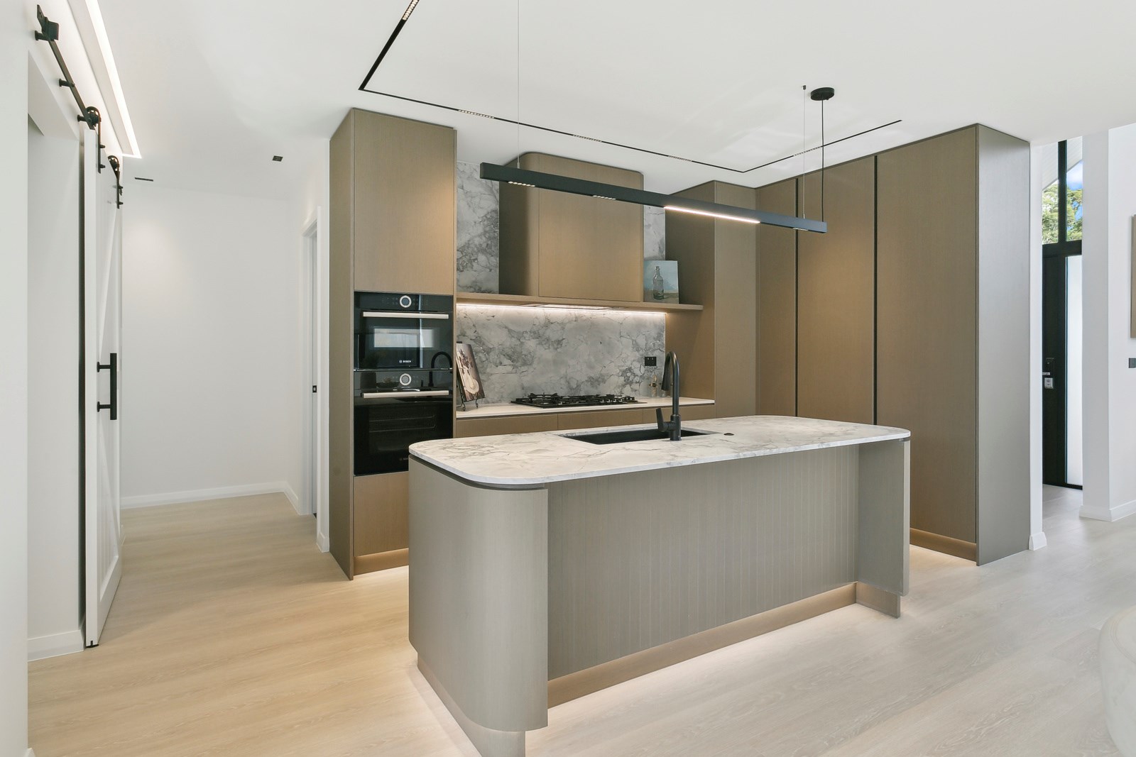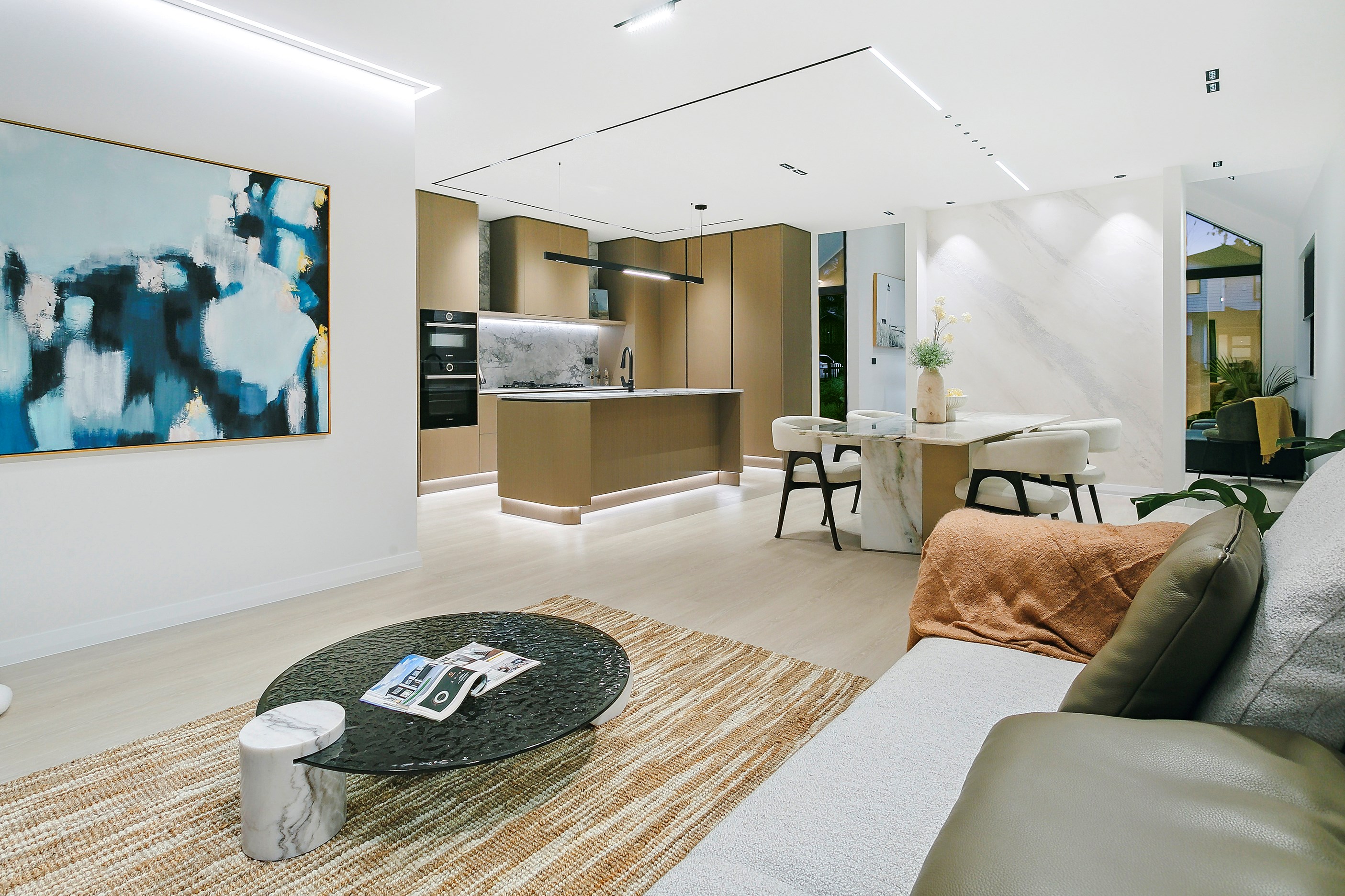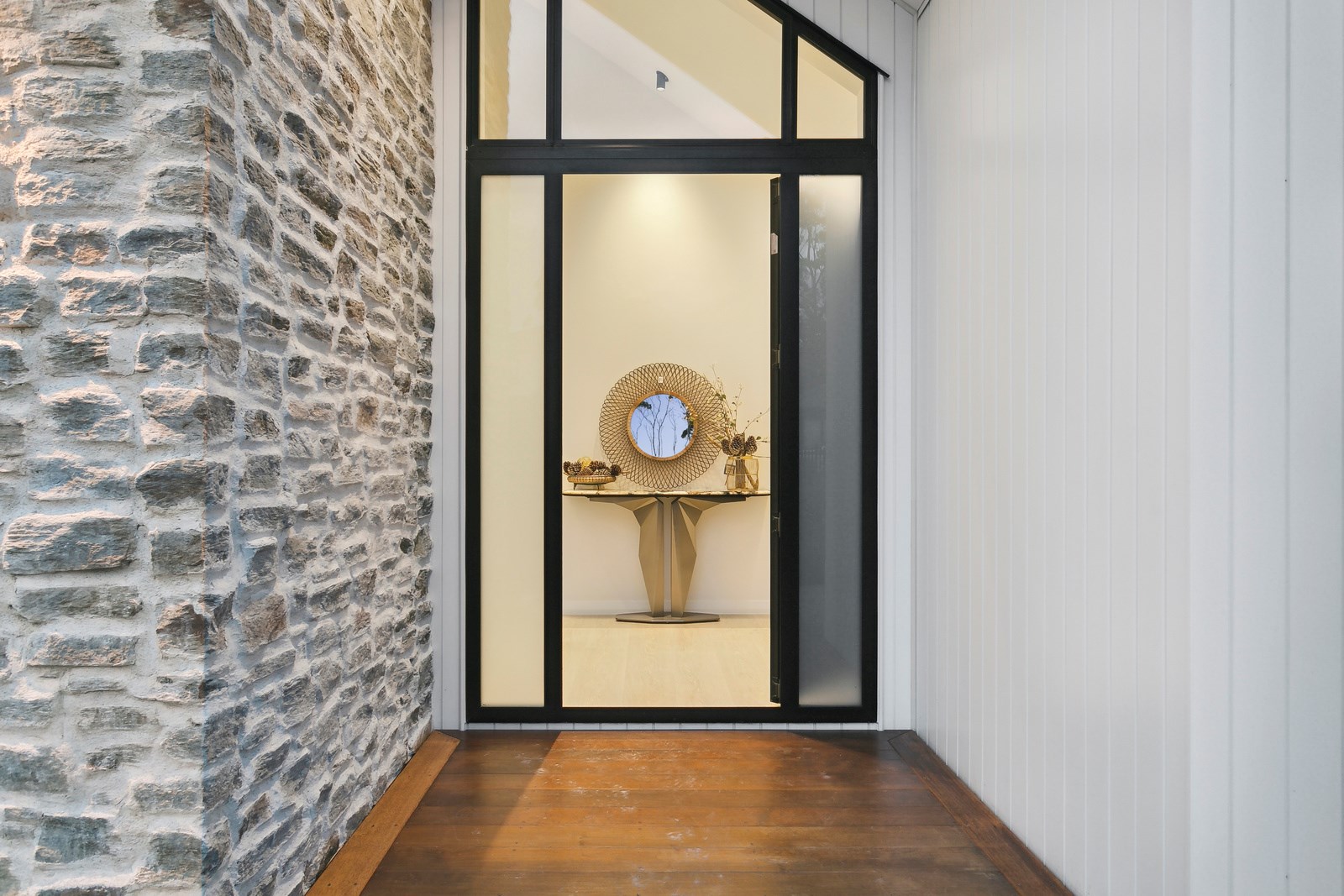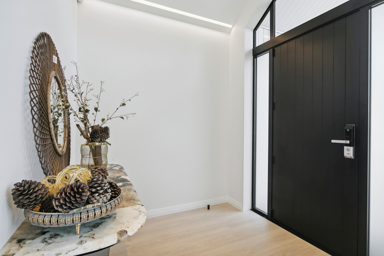 Some houses just look as if they belong, and this is a prime example. Curb appeal is instant, thanks to white vertical and horizontal weatherboard, a black garage door, floor-to-ceiling windows and a striking schist-clad fireplace. Everything is settled and softened with contemporary landscaping. The 203sqm home exudes timeless elegance. That sense of enduring style continues inside where light streams in through all those windows as well as sliders that open onto timber decking. The living room and two of the four bedrooms enjoy access to this sunny outdoor area. Anchoring the inviting open-plan dining-living space in pale and natural shades is a designer kitchen with cabinets that manage to both complement and contrast in a darker woody hue. The marbled splashback and counter atop the stylish curved island are jewels; a walk-in pantry is supremely practical.