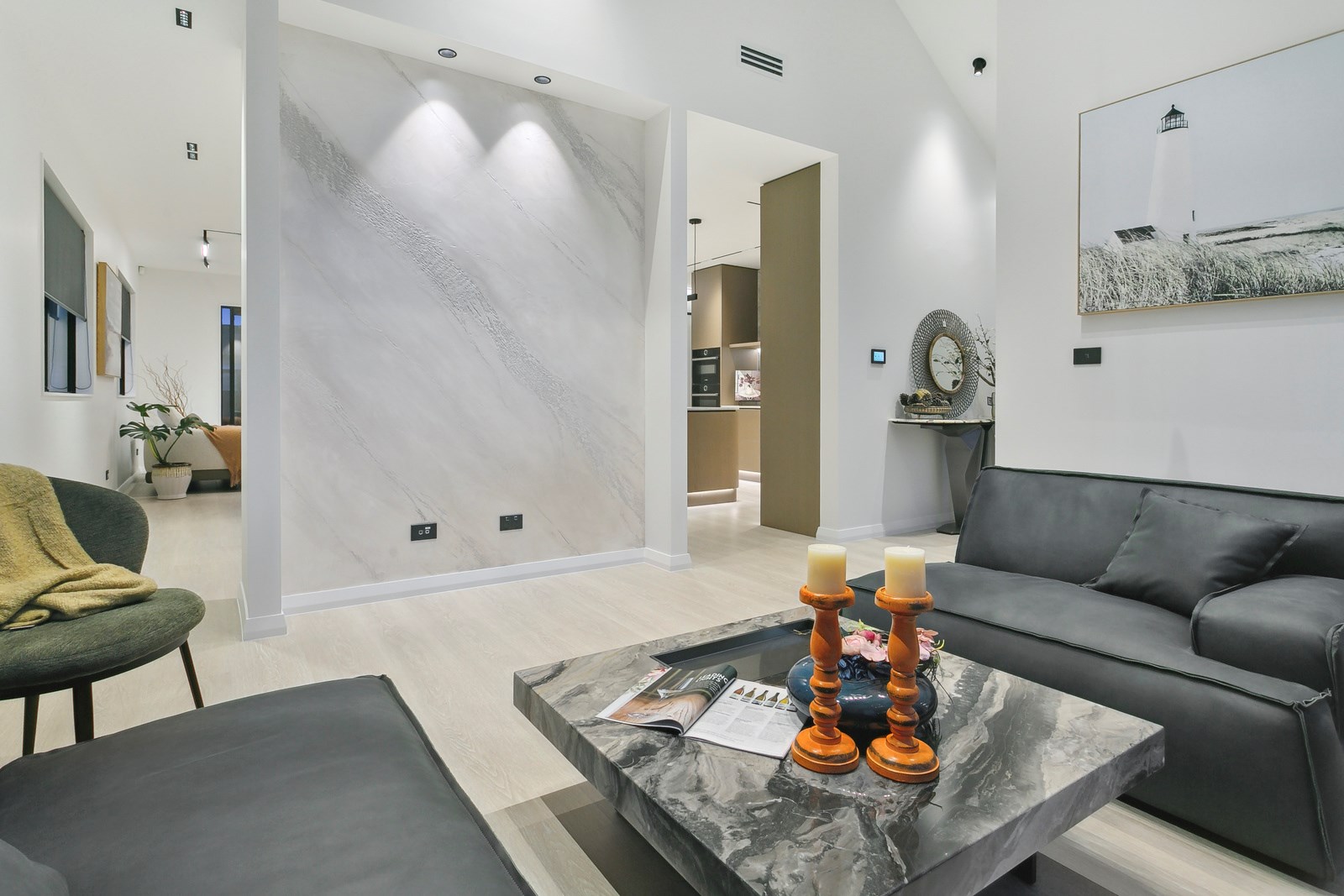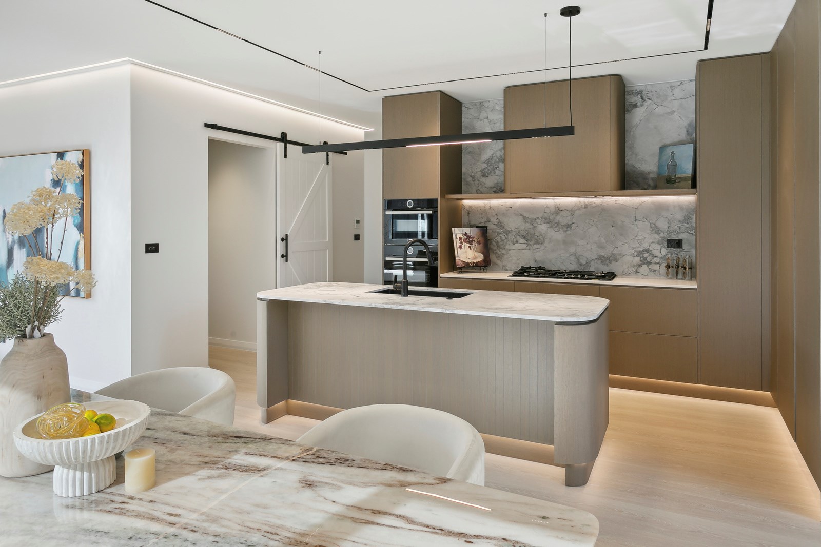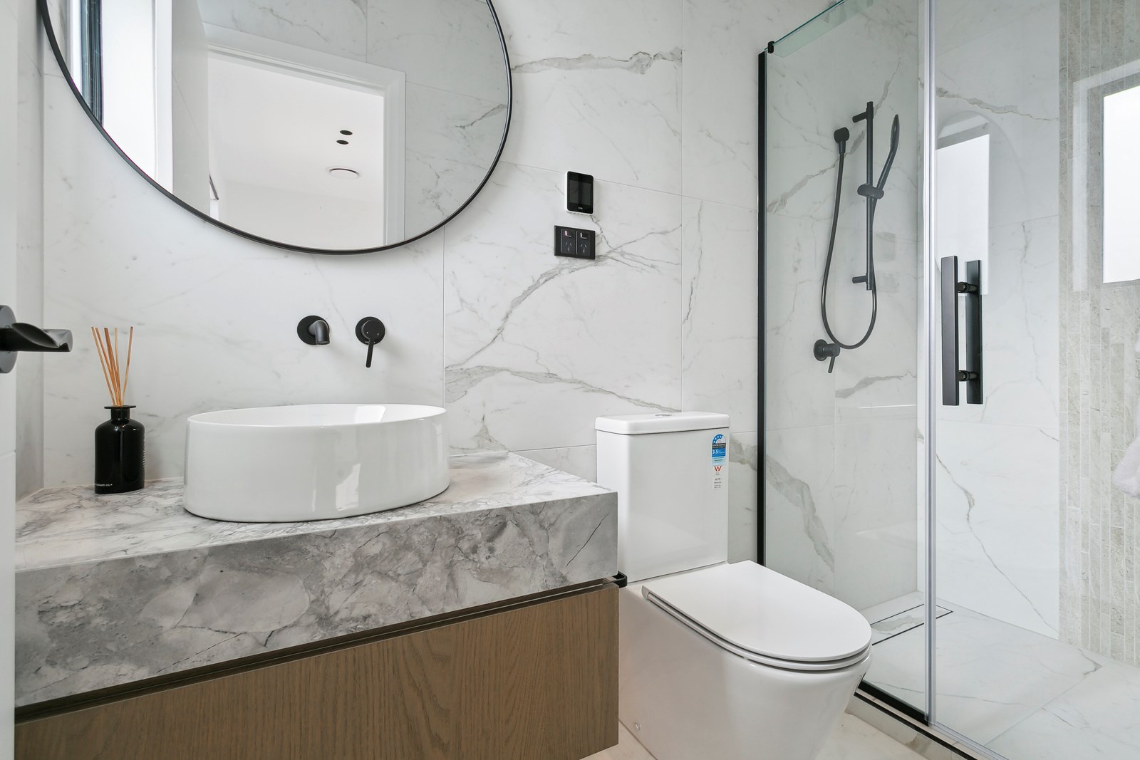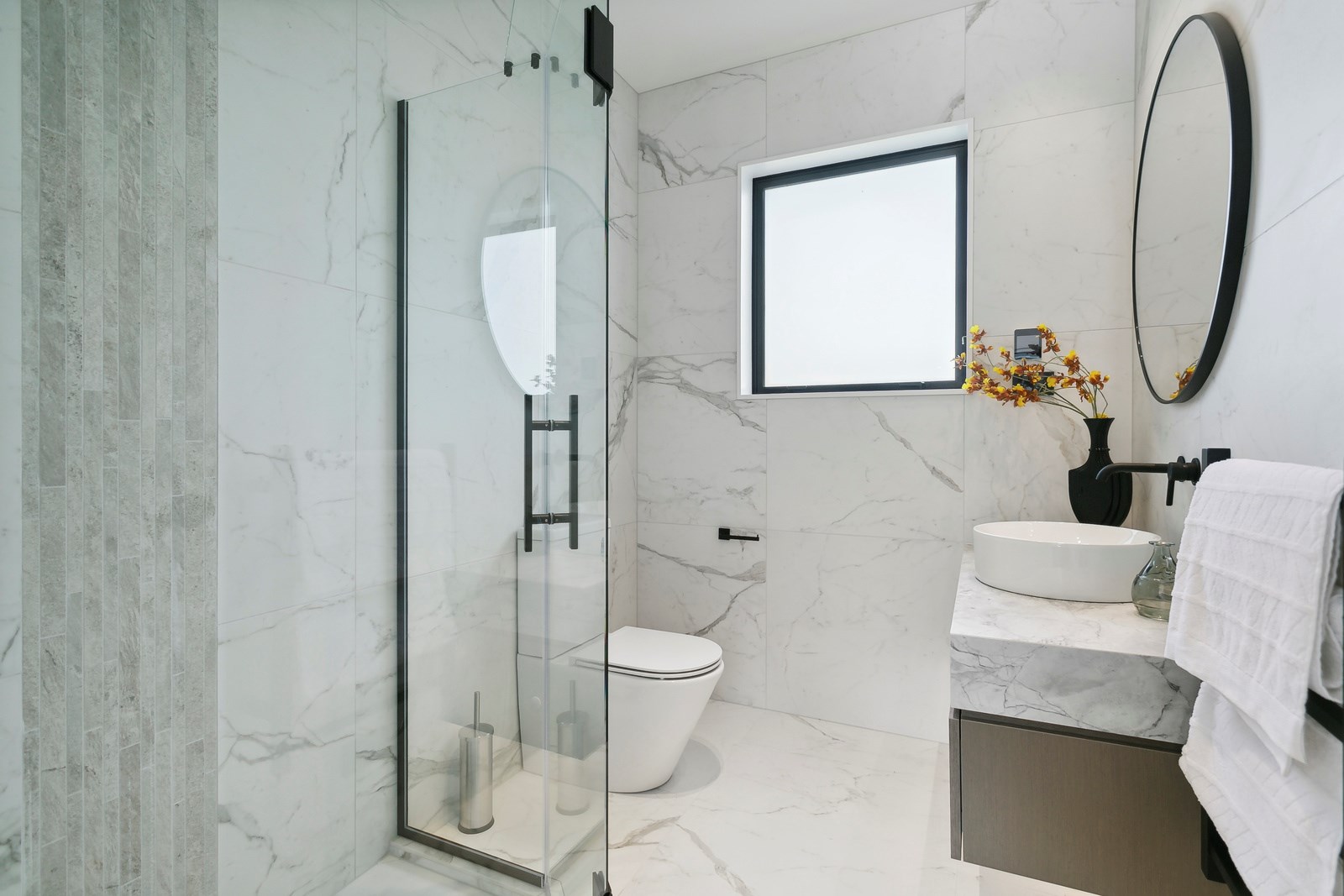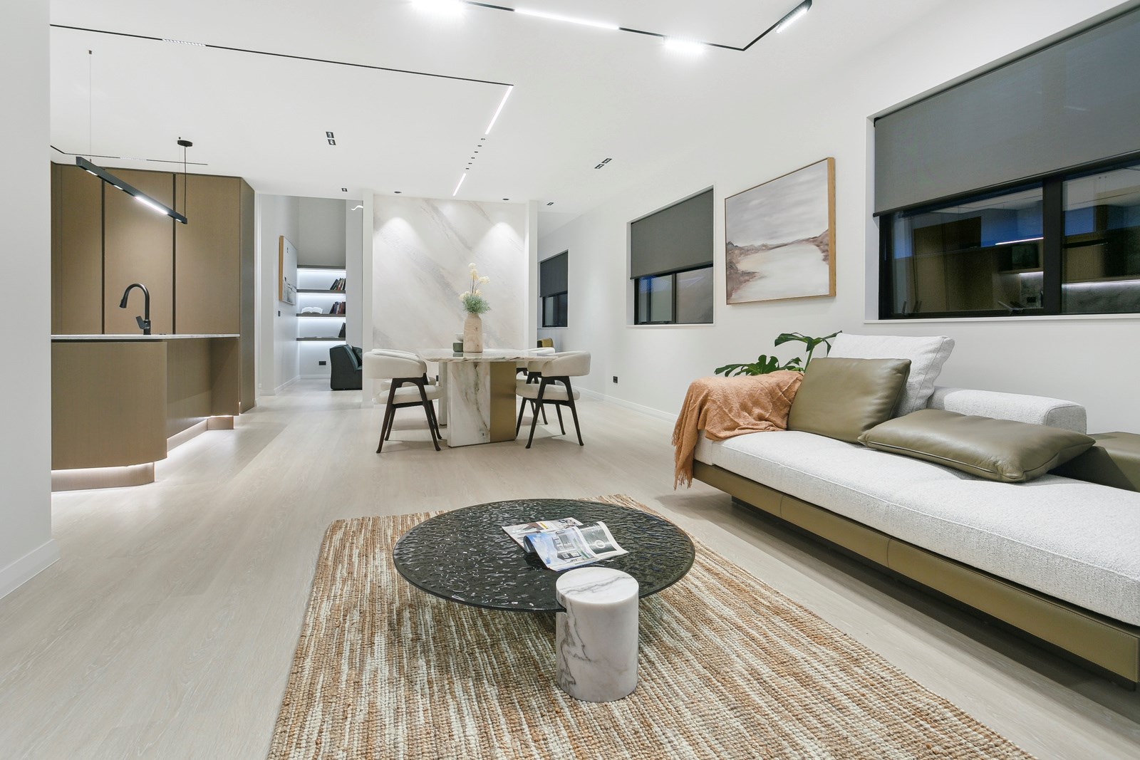 Some houses just look as if they belong, and this is a prime example. Curb appeal is instant, thanks to white vertical and horizontal weatherboard, a black garage door, floor-to-ceiling windows and a striking schist-clad fireplace. Everything is settled and softened with contemporary landscaping. The 203sqm home exudes timeless elegance. That sense of enduring style continues inside where light streams in through all those windows as well as sliders that open onto timber decking. The living room and two of the four bedrooms enjoy access to this sunny outdoor area. Anchoring the inviting open-plan dining-living space in pale and natural shades is a designer kitchen with cabinets that manage to both complement and contrast in a darker woody hue. The marbled splashback and counter atop the stylish curved island are jewels; a walk-in pantry is supremely practical.