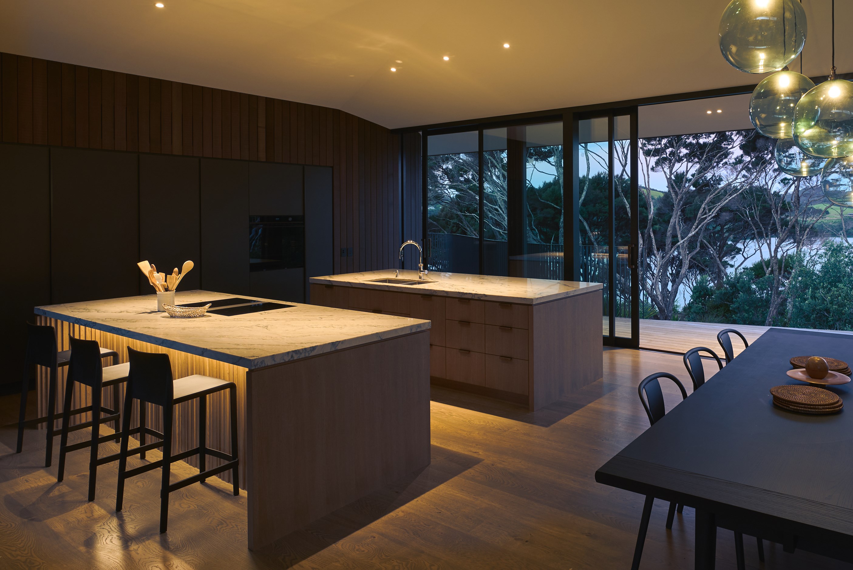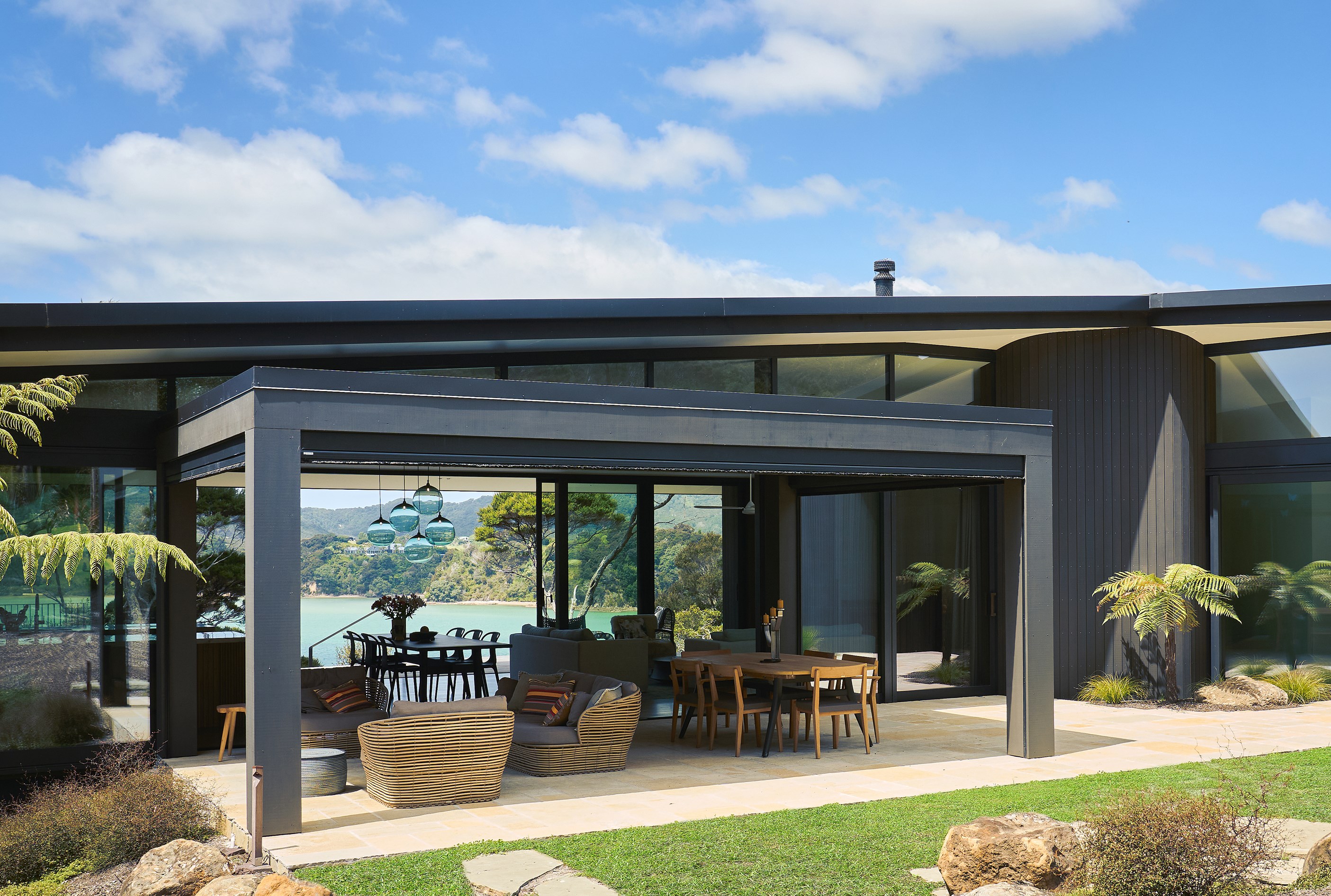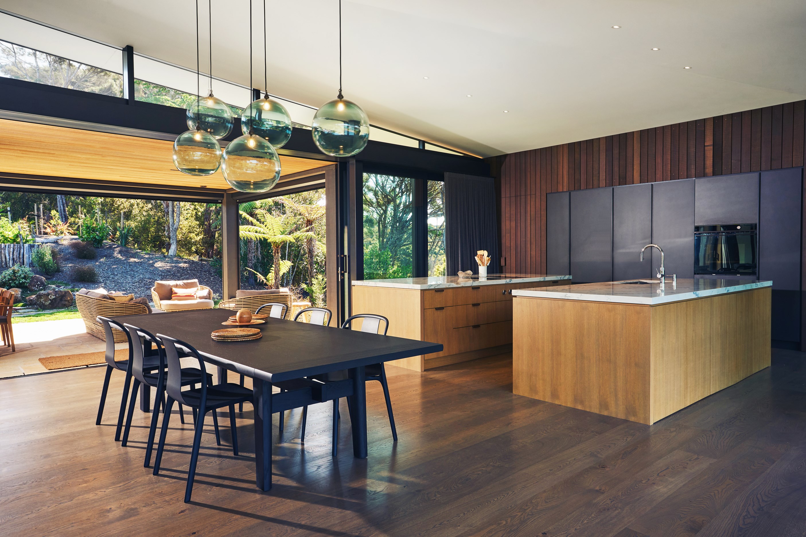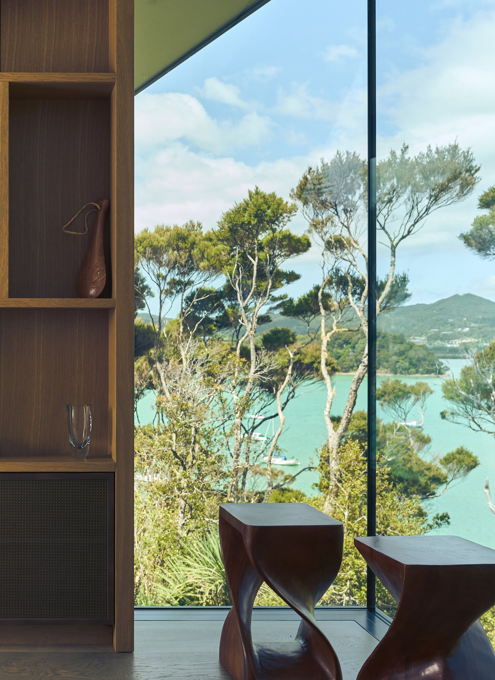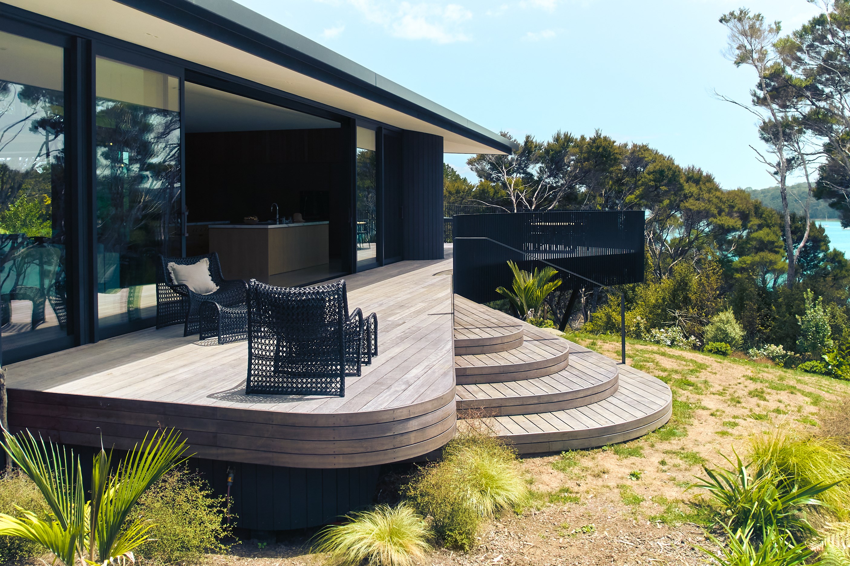 Are you inside or are you out? Such is the flow between the two at this resort-like Northland property, it’s difficult to ascertain. The views of trees and sea can even be enjoyed through the house – wide doors in the vast living space open to a semi-covered deck on one side and an entirely covered patio on the other. The 475sqm L-shaped home snuggles into its site above a serene bay. It’s unobtrusive, and was designed to be. The three-bedroom home was built with as little disruption to the environment as possible. Beautiful custom curved walls rise organically from the ground, and are cocooned in native trees. A swathe of timber decking organically bends and arcs around the dark house. And while the form of this building and its connection to the landscape is remarkable, the minutiae is just as impressive – right down to the kitchen drawers. Attention to detail is evident at every turn.