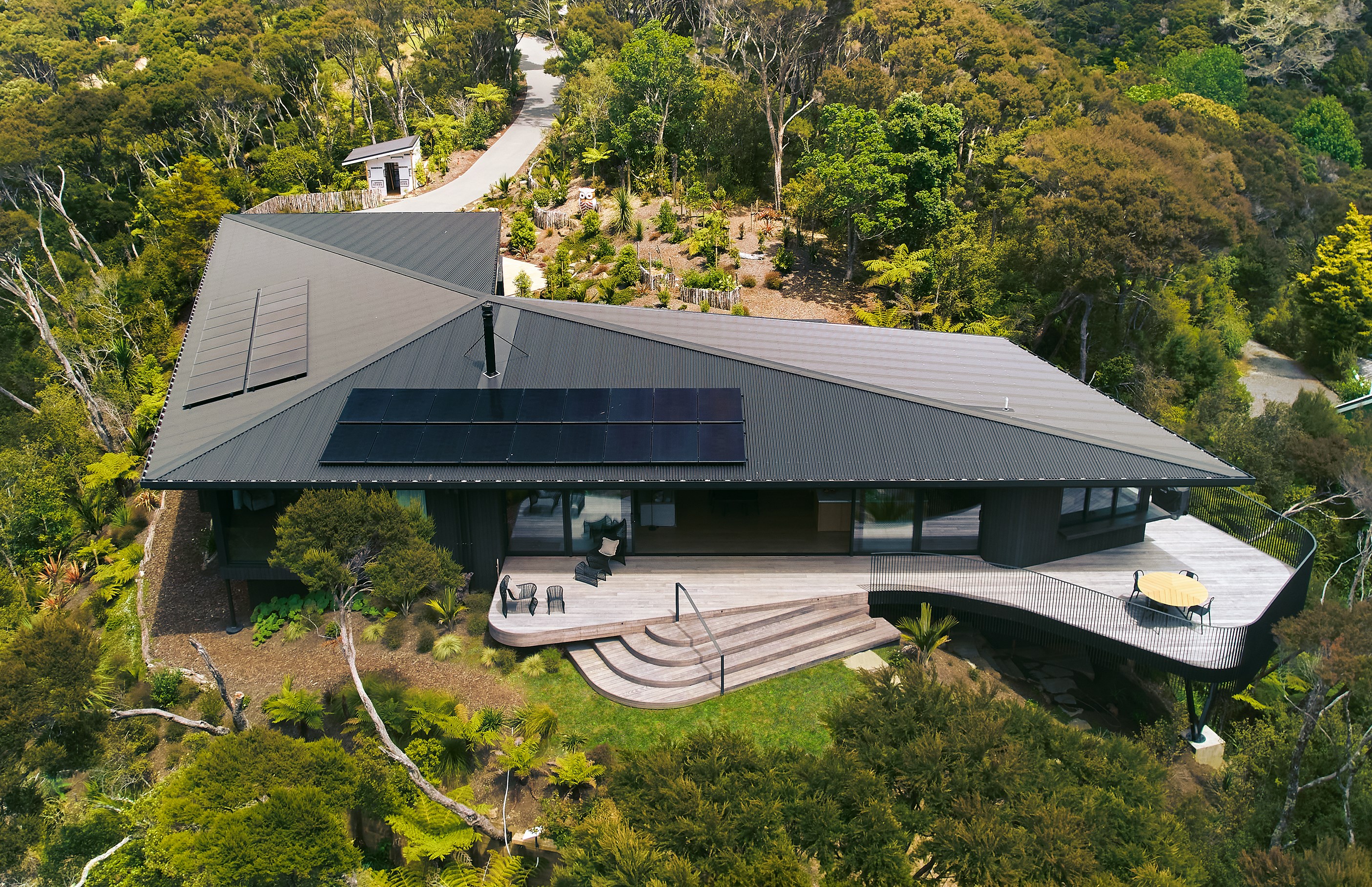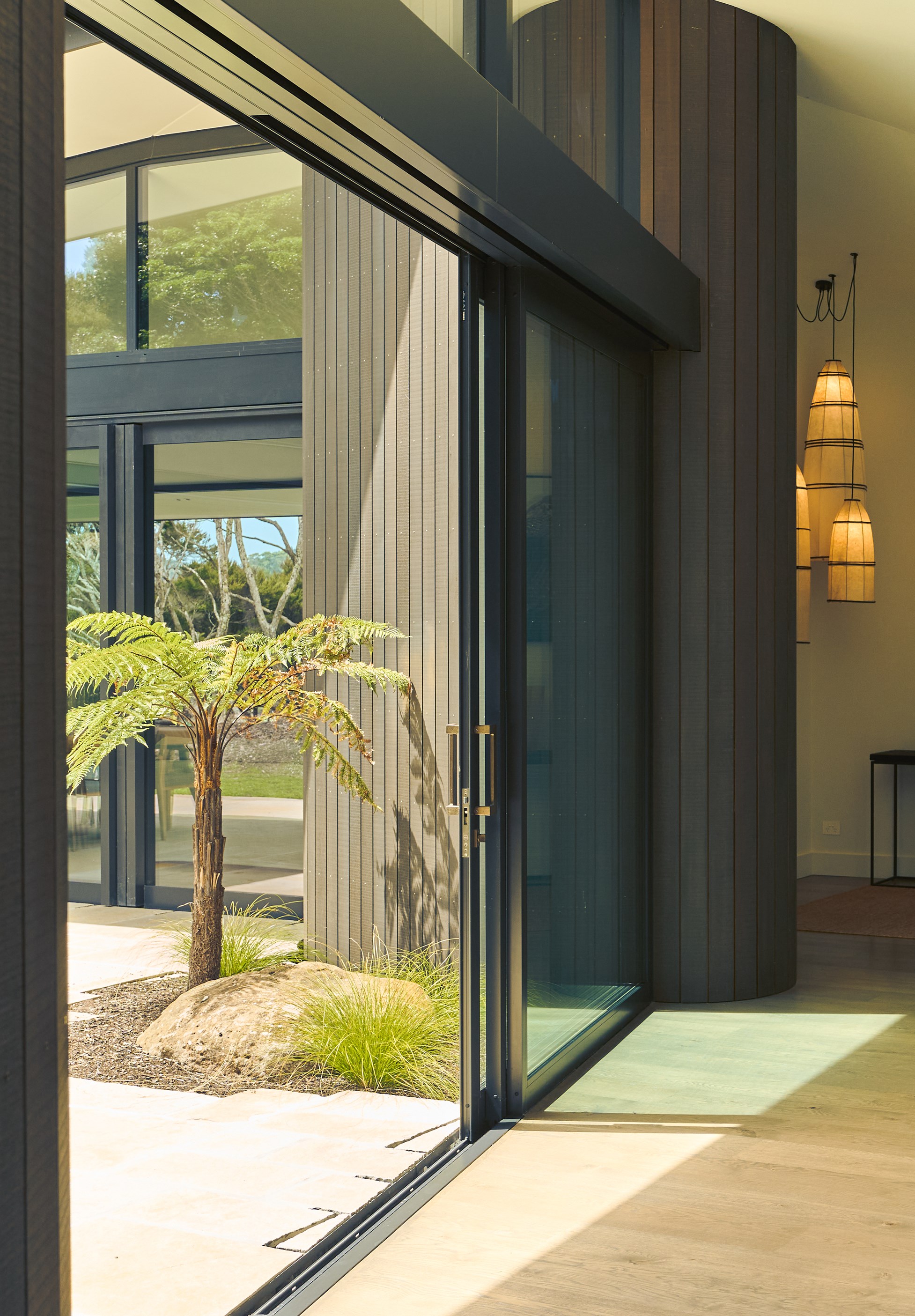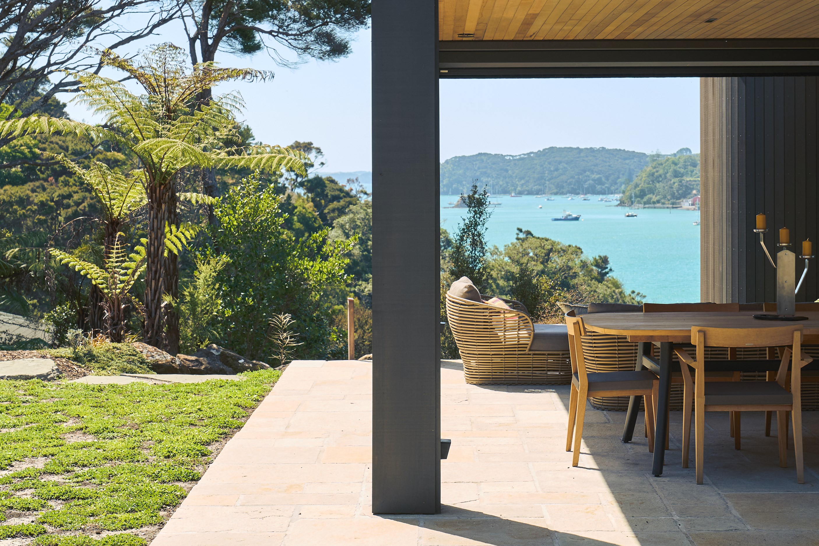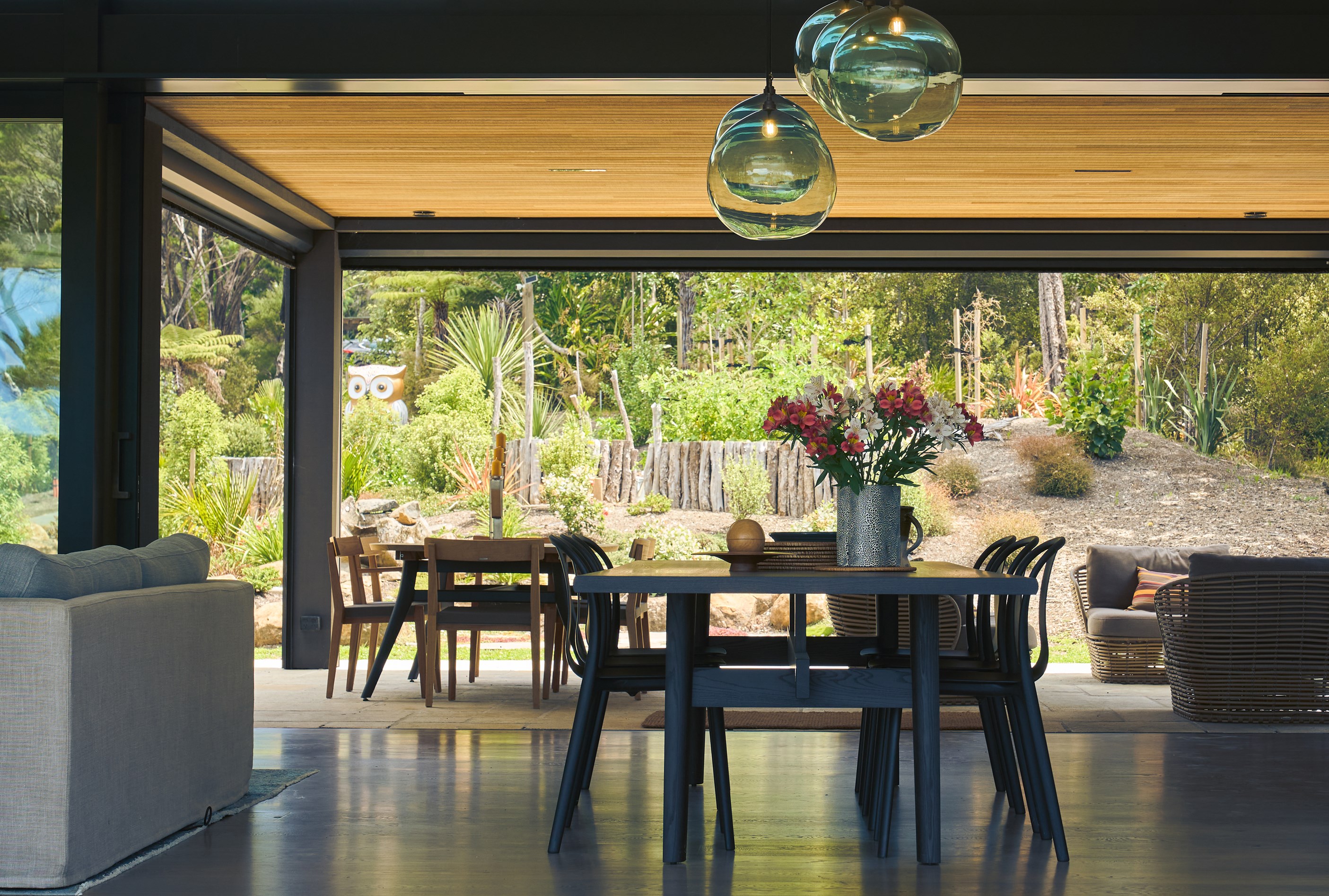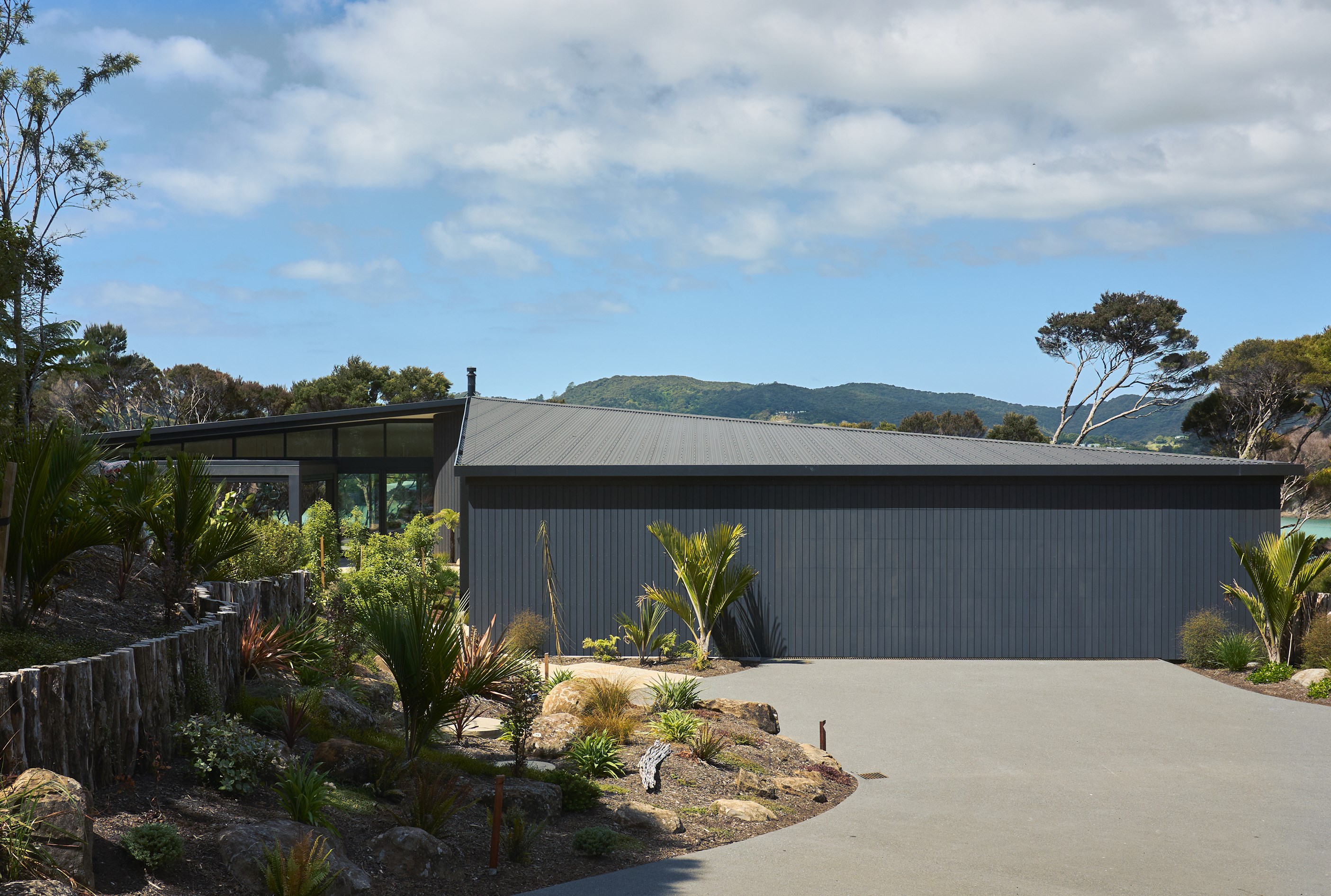 Are you inside or are you out? Such is the flow between the two at this resort-like Northland property, it’s difficult to ascertain. The views of trees and sea can even be enjoyed through the house – wide doors in the vast living space open to a semi-covered deck on one side and an entirely covered patio on the other. The 475sqm L-shaped home snuggles into its site above a serene bay. It’s unobtrusive, and was designed to be. The three-bedroom home was built with as little disruption to the environment as possible. Beautiful custom curved walls rise organically from the ground, and are cocooned in native trees. A swathe of timber decking organically bends and arcs around the dark house. And while the form of this building and its connection to the landscape is remarkable, the minutiae is just as impressive – right down to the kitchen drawers. Attention to detail is evident at every turn.