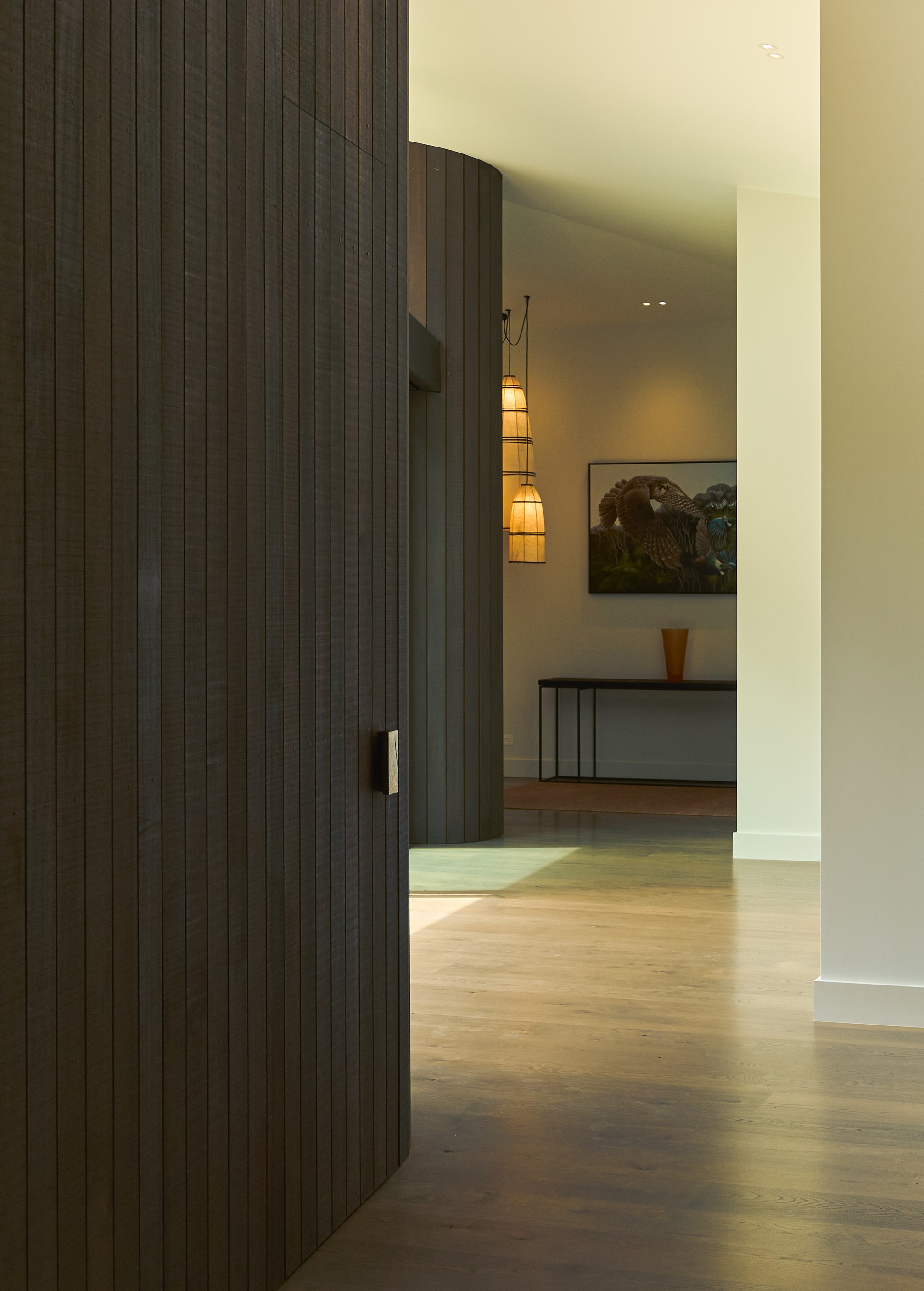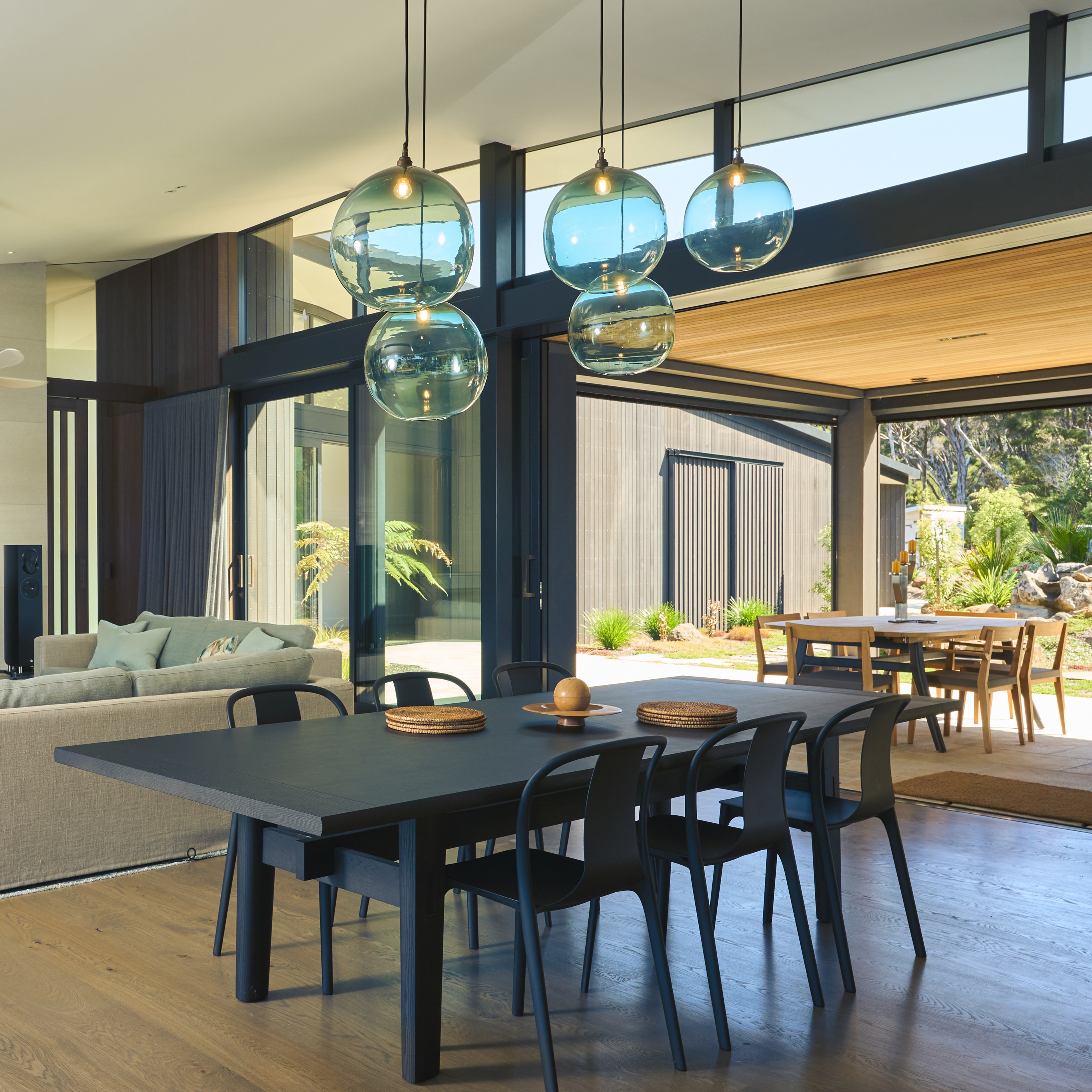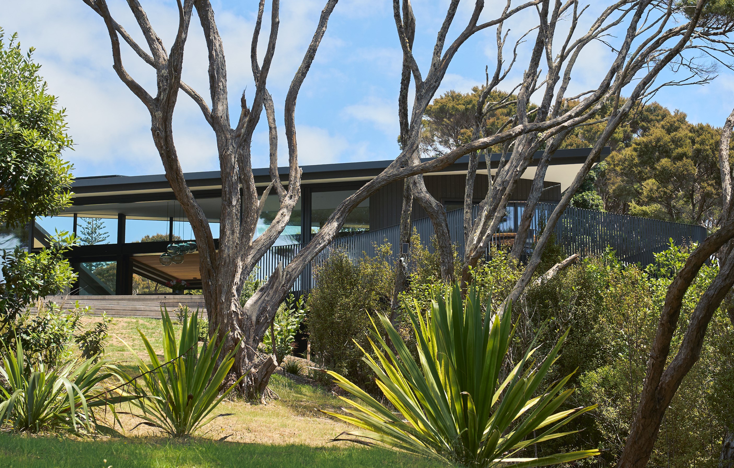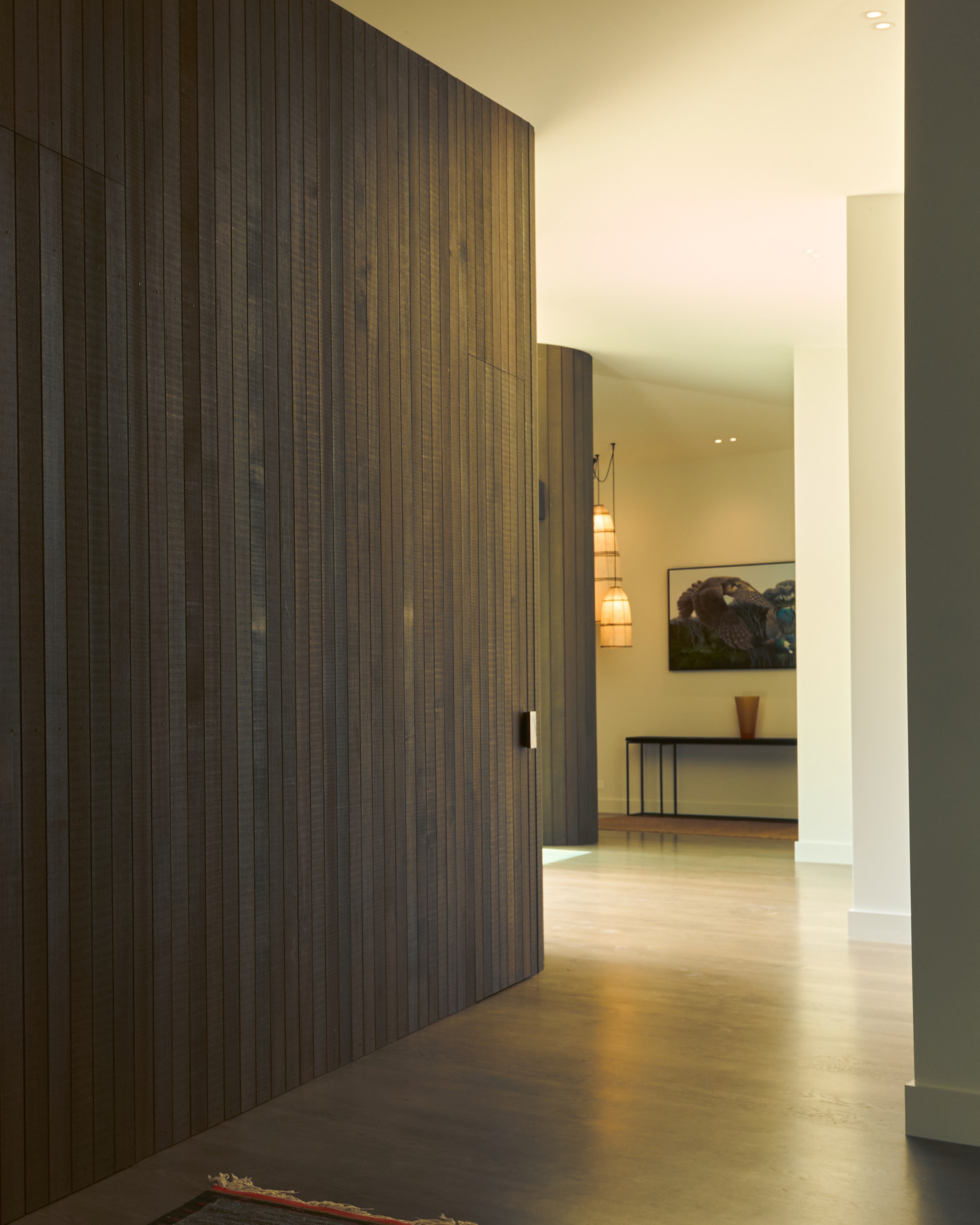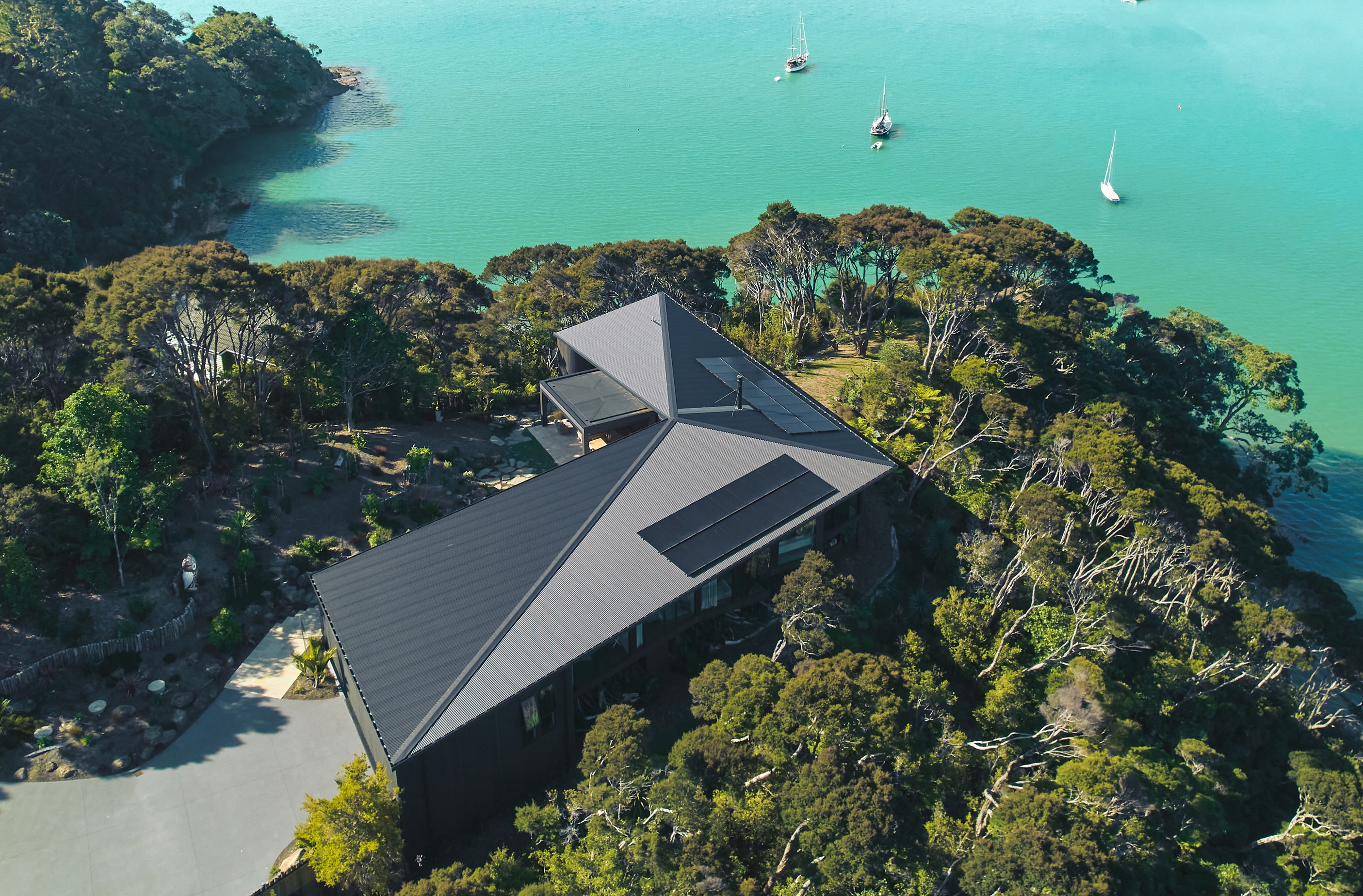 Are you inside or are you out? Such is the flow between the two at this resort-like Northland property, it’s difficult to ascertain. The views of trees and sea can even be enjoyed through the house – wide doors in the vast living space open to a semi-covered deck on one side and an entirely covered patio on the other. The 475sqm L-shaped home snuggles into its site above a serene bay. It’s unobtrusive, and was designed to be. The three-bedroom home was built with as little disruption to the environment as possible. Beautiful custom curved walls rise organically from the ground, and are cocooned in native trees. A swathe of timber decking organically bends and arcs around the dark house. And while the form of this building and its connection to the landscape is remarkable, the minutiae is just as impressive – right down to the kitchen drawers. Attention to detail is evident at every turn.