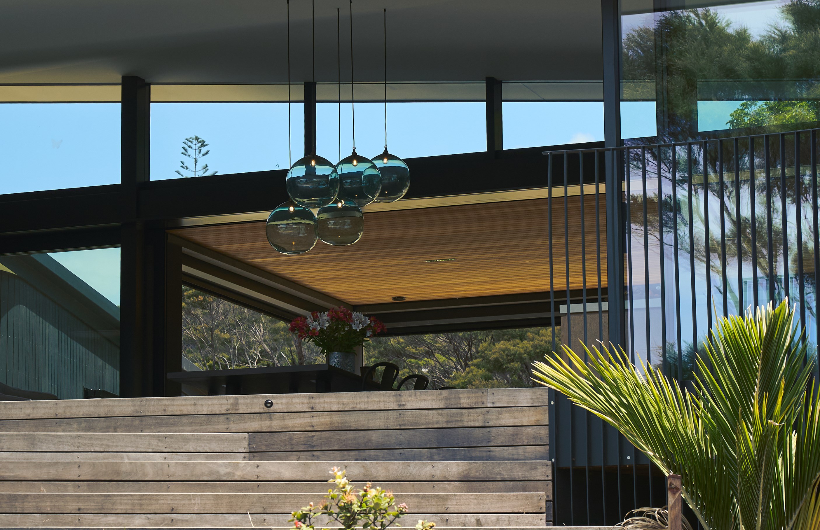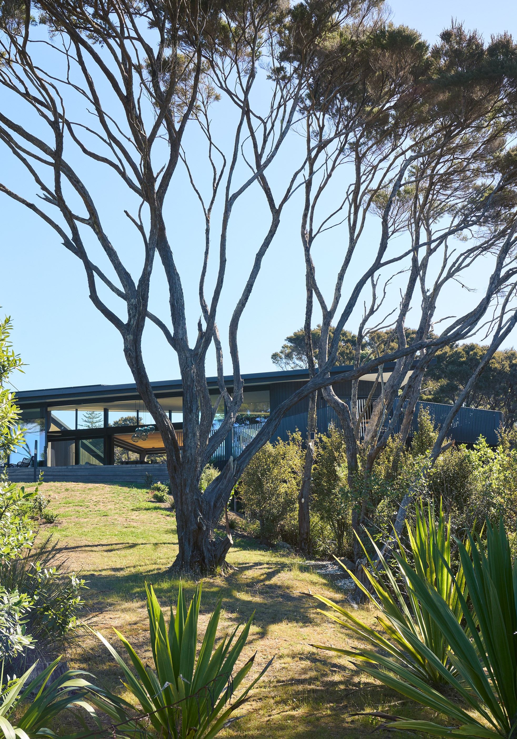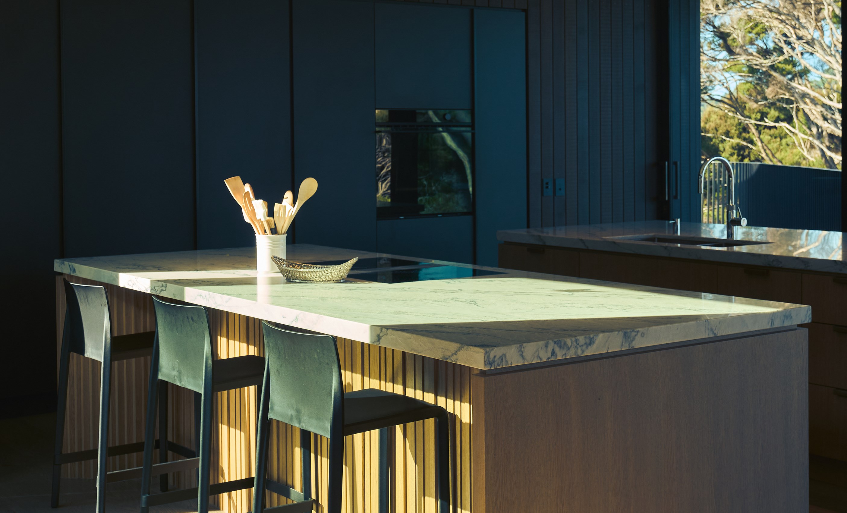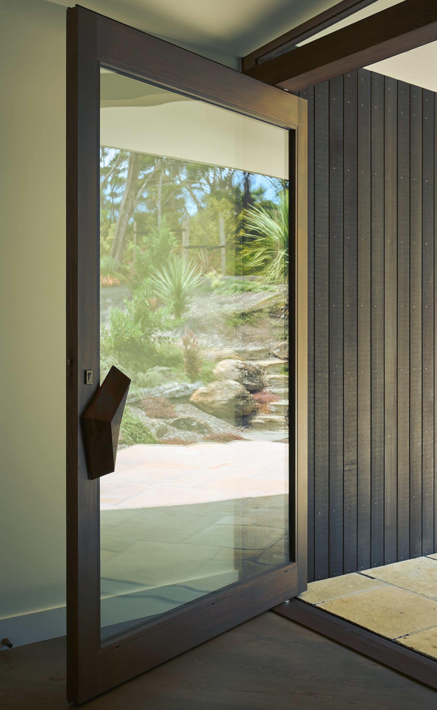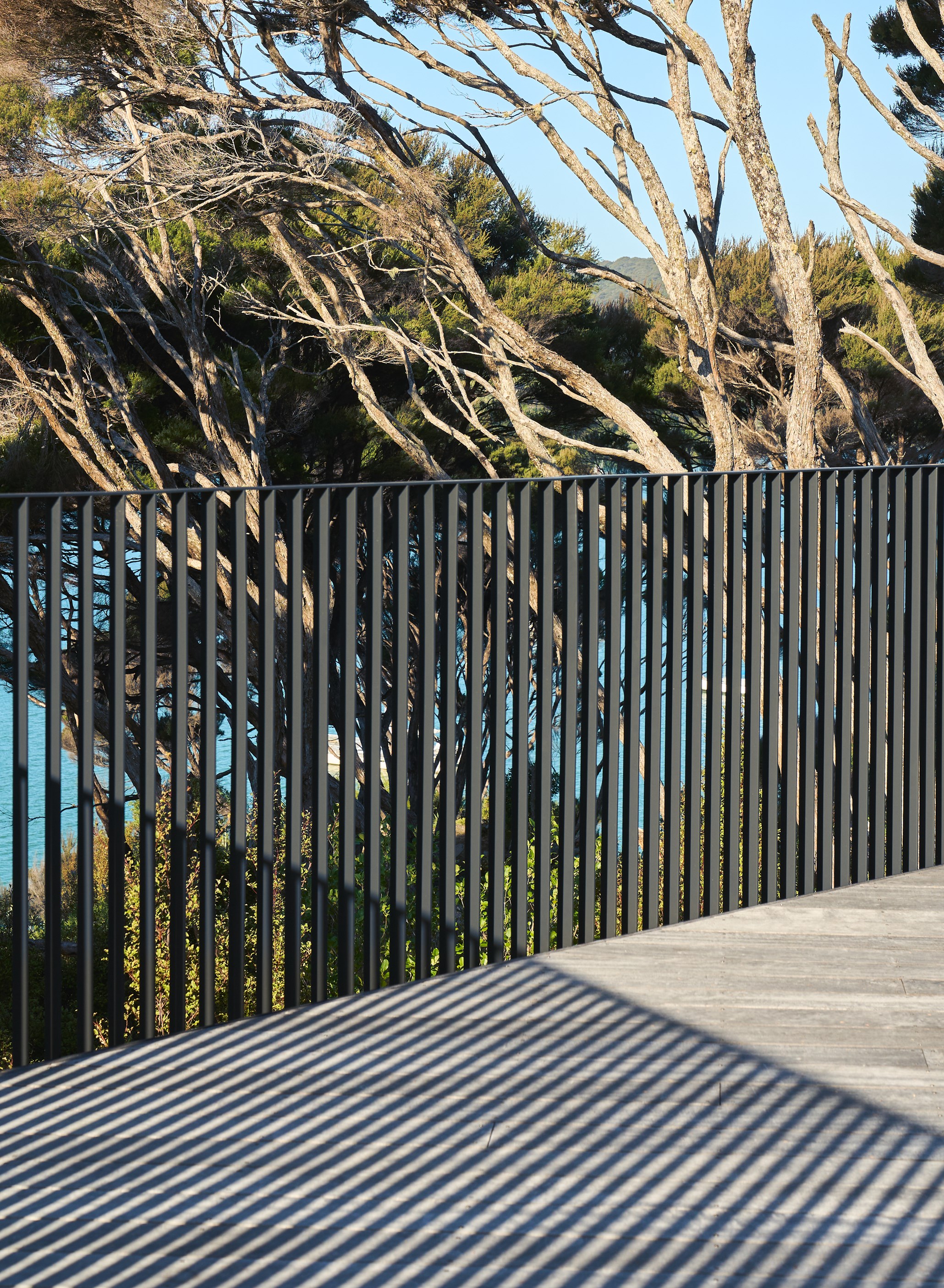 Are you inside or are you out? Such is the flow between the two at this resort-like Northland property, it’s difficult to ascertain. The views of trees and sea can even be enjoyed through the house – wide doors in the vast living space open to a semi-covered deck on one side and an entirely covered patio on the other. The 475sqm L-shaped home snuggles into its site above a serene bay. It’s unobtrusive, and was designed to be. The three-bedroom home was built with as little disruption to the environment as possible. Beautiful custom curved walls rise organically from the ground, and are cocooned in native trees. A swathe of timber decking organically bends and arcs around the dark house. And while the form of this building and its connection to the landscape is remarkable, the minutiae is just as impressive – right down to the kitchen drawers. Attention to detail is evident at every turn.