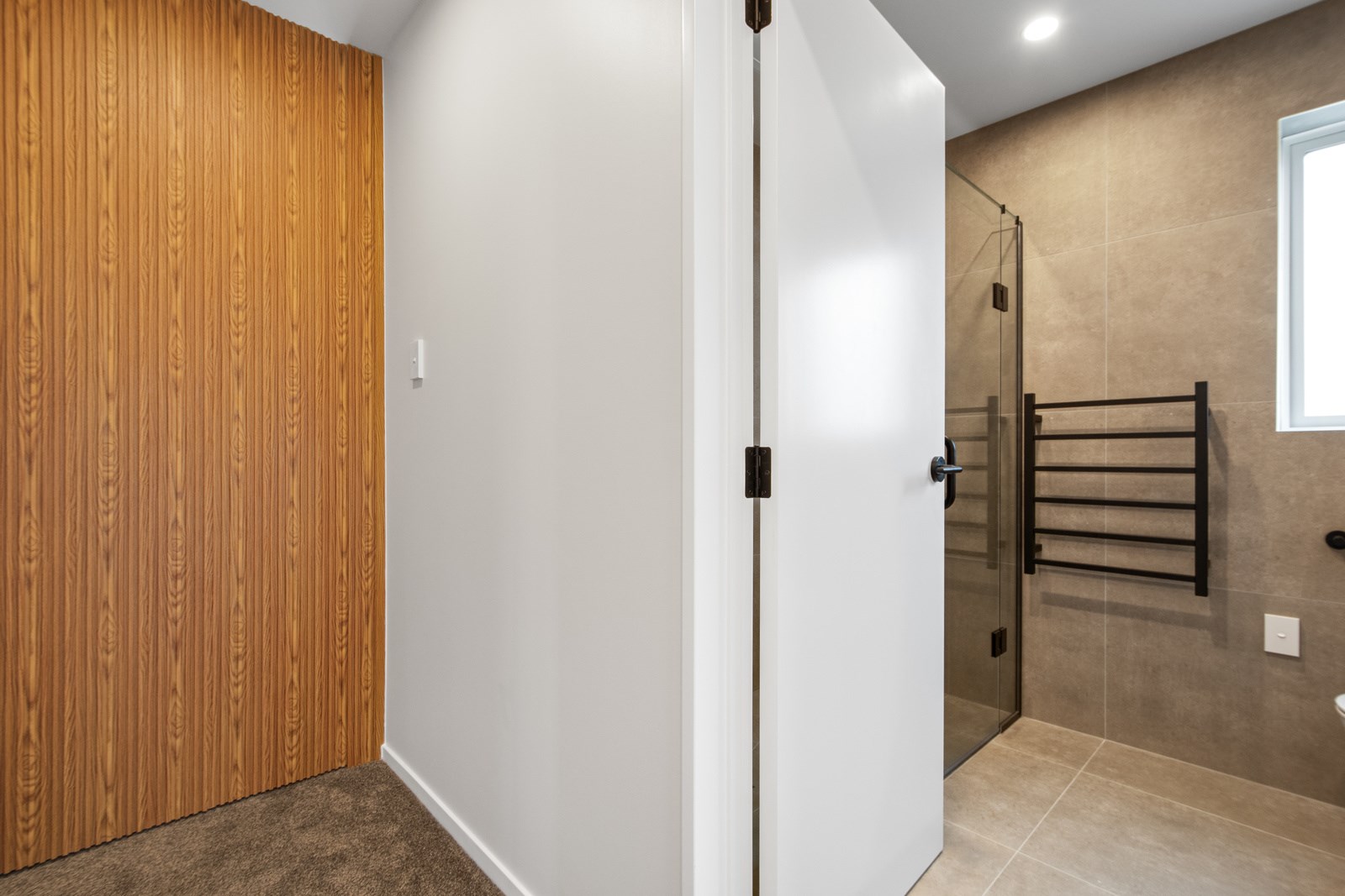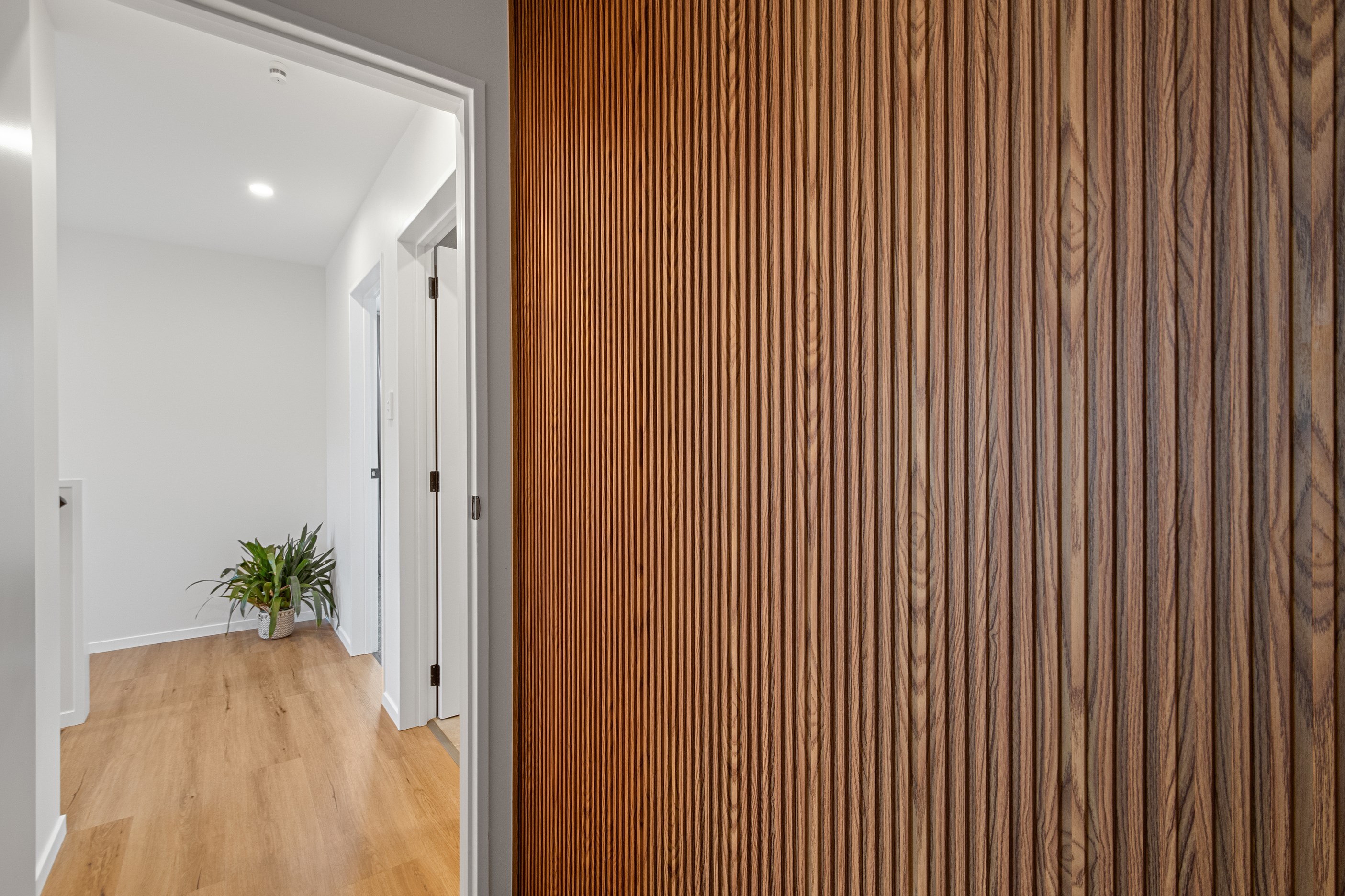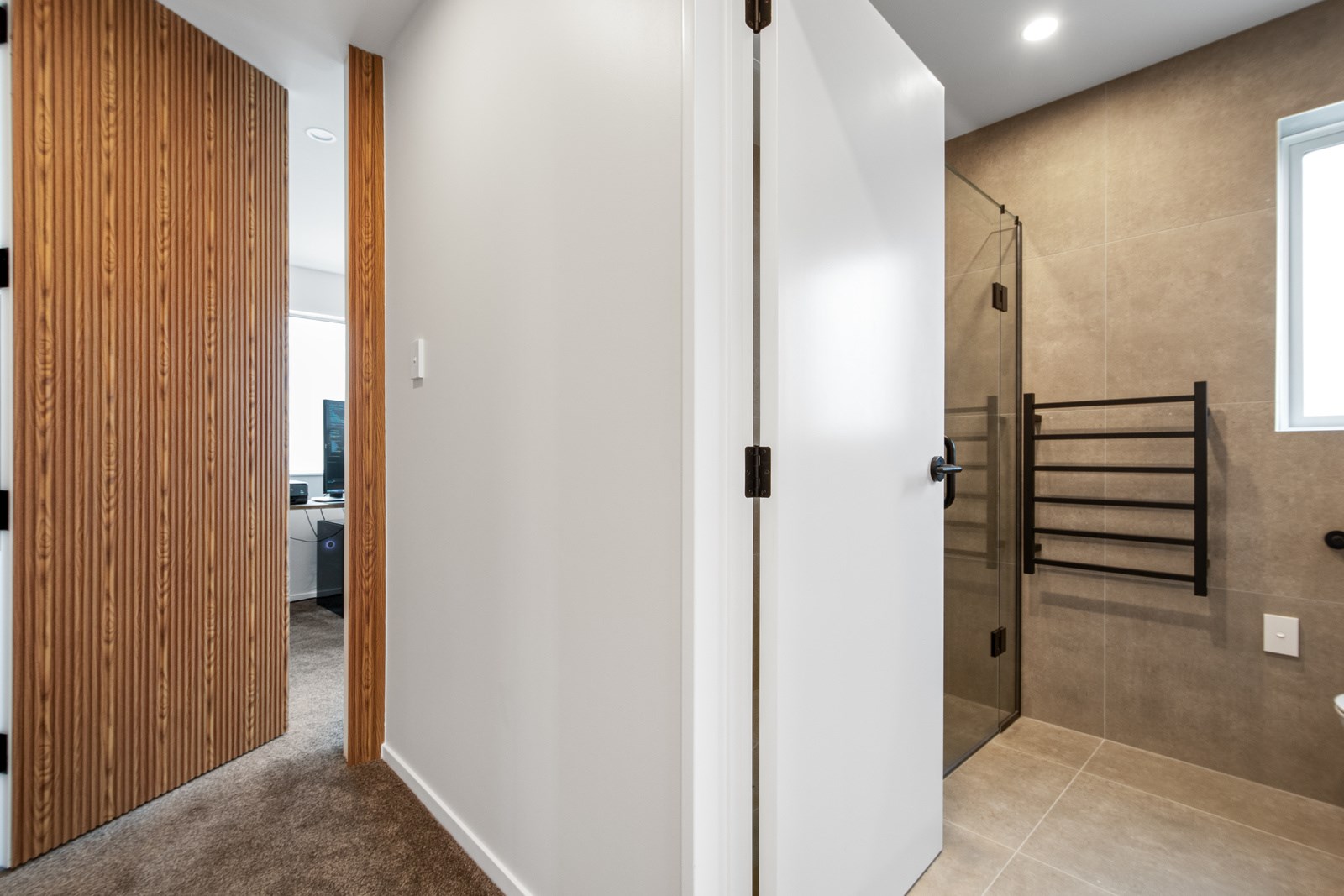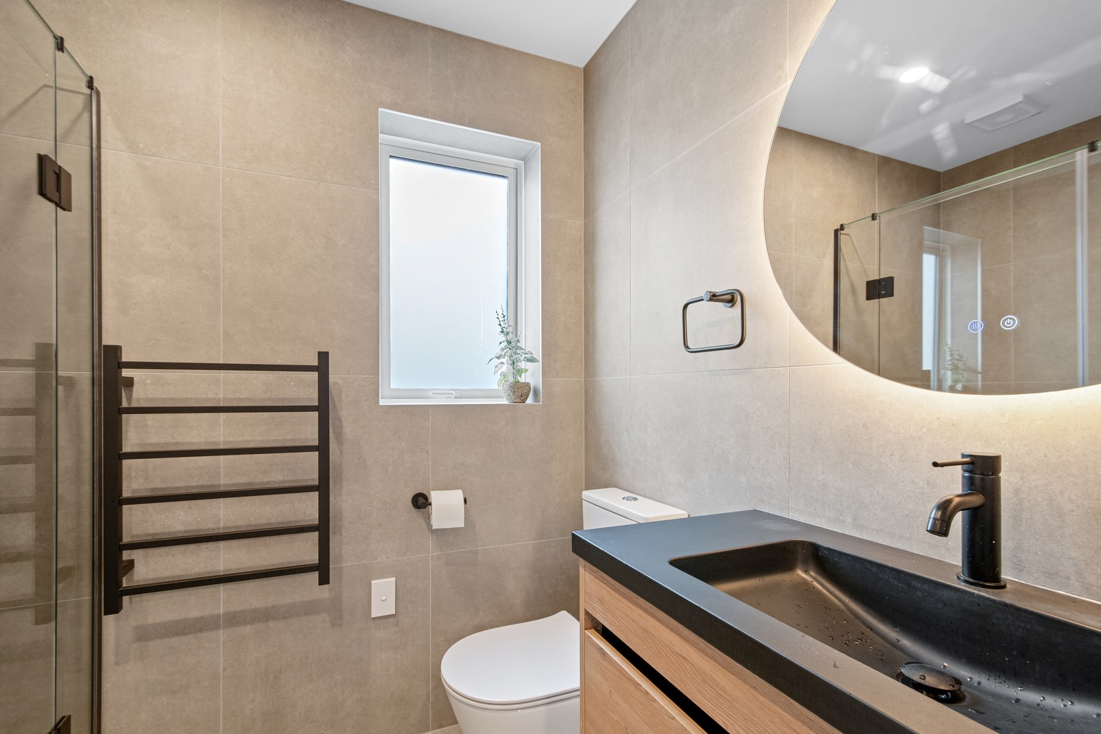 Upstairs are three more bedrooms, and the main suite has an ensuite and dressing room. There’s another family bathroom up here, and even an office. Bathrooms are all tiled with matte finishes. Though the sunny home is a seamless blend of smooth contemporary design and tasteful decor, you’ll also find statement features – black taps, fittings, towel rack and basins in the bathrooms; black fixtures, appliances and trims in the kitchen; and there’s a black handrail on the staircase. This house, along with others in its development, is designed for family living, but also for discerning buyers seeking quality finishes, warmth, light, indoor-outdoor living and sustainable design.