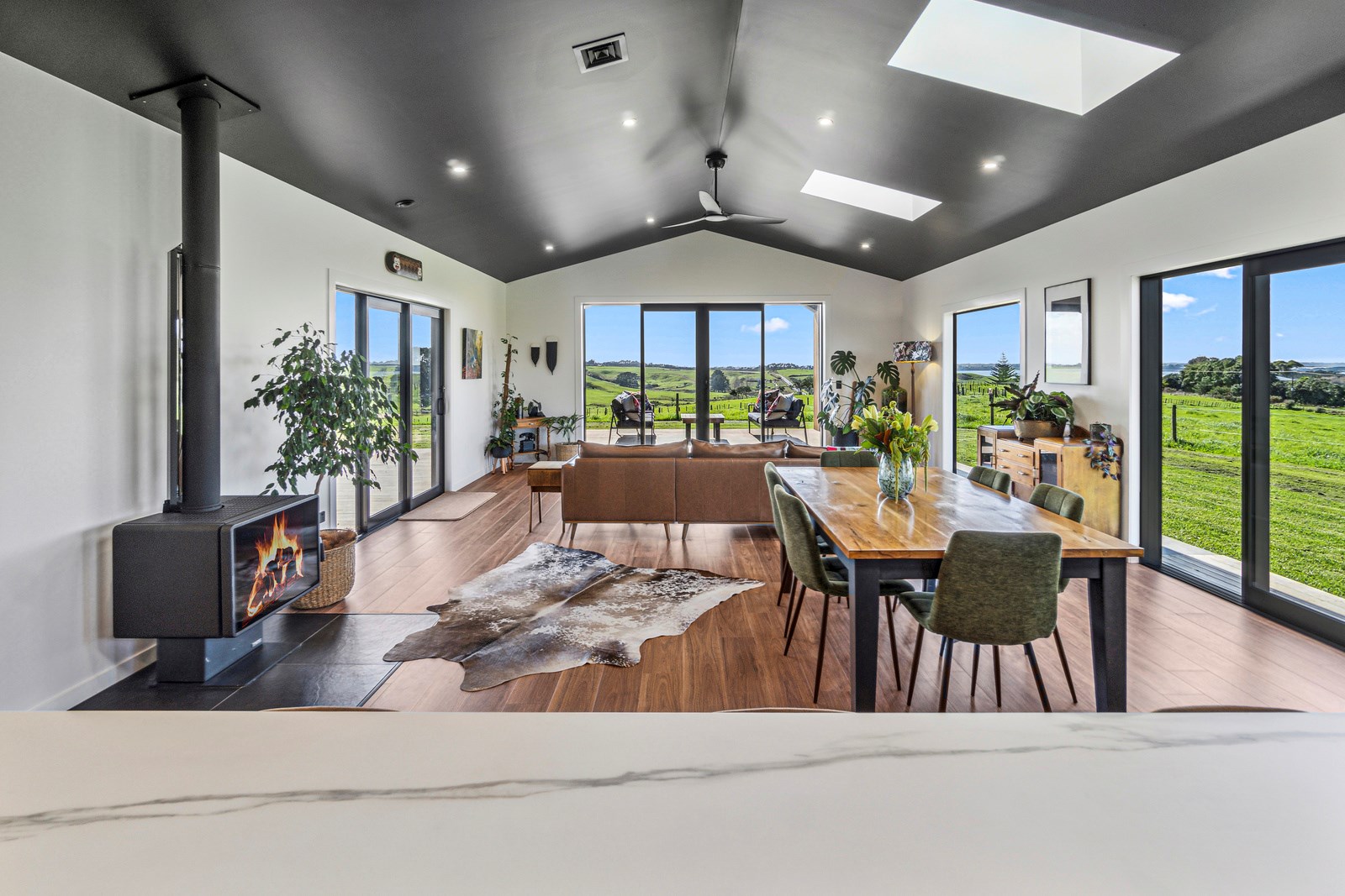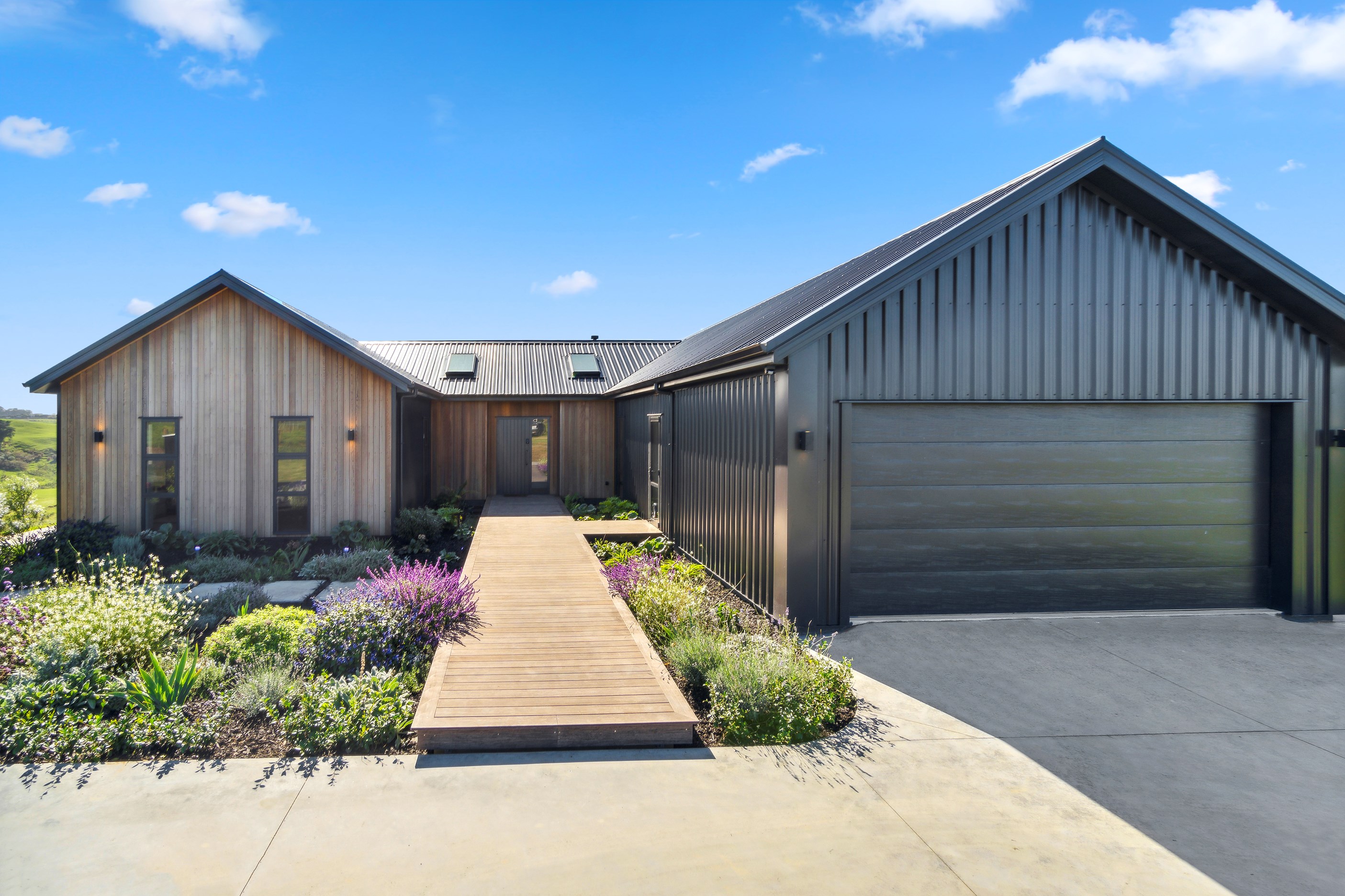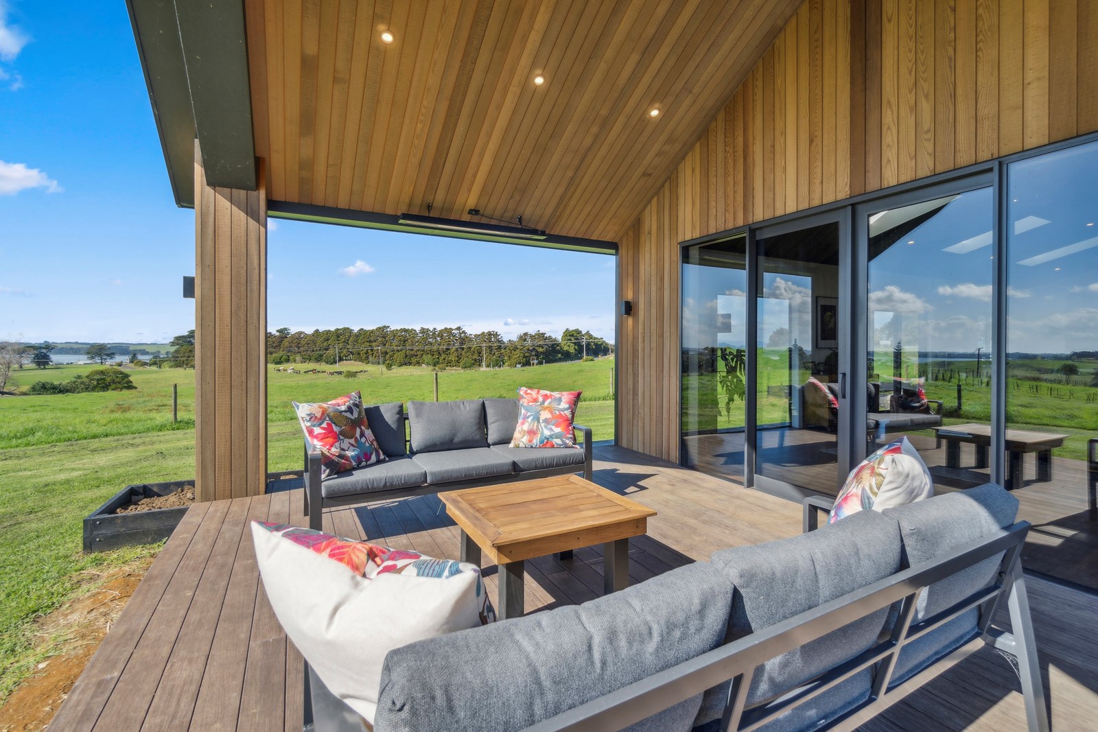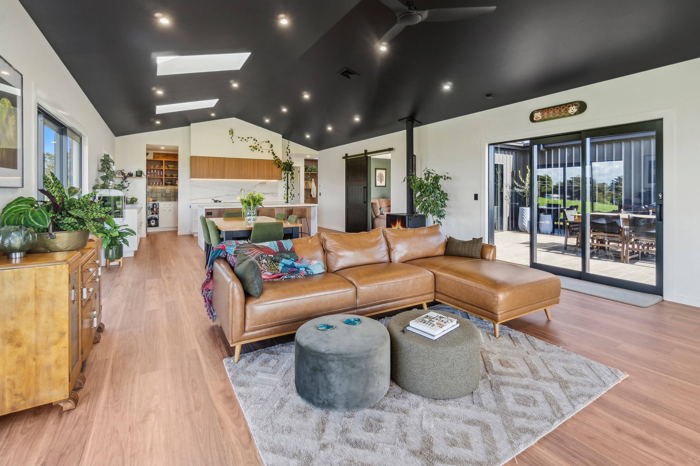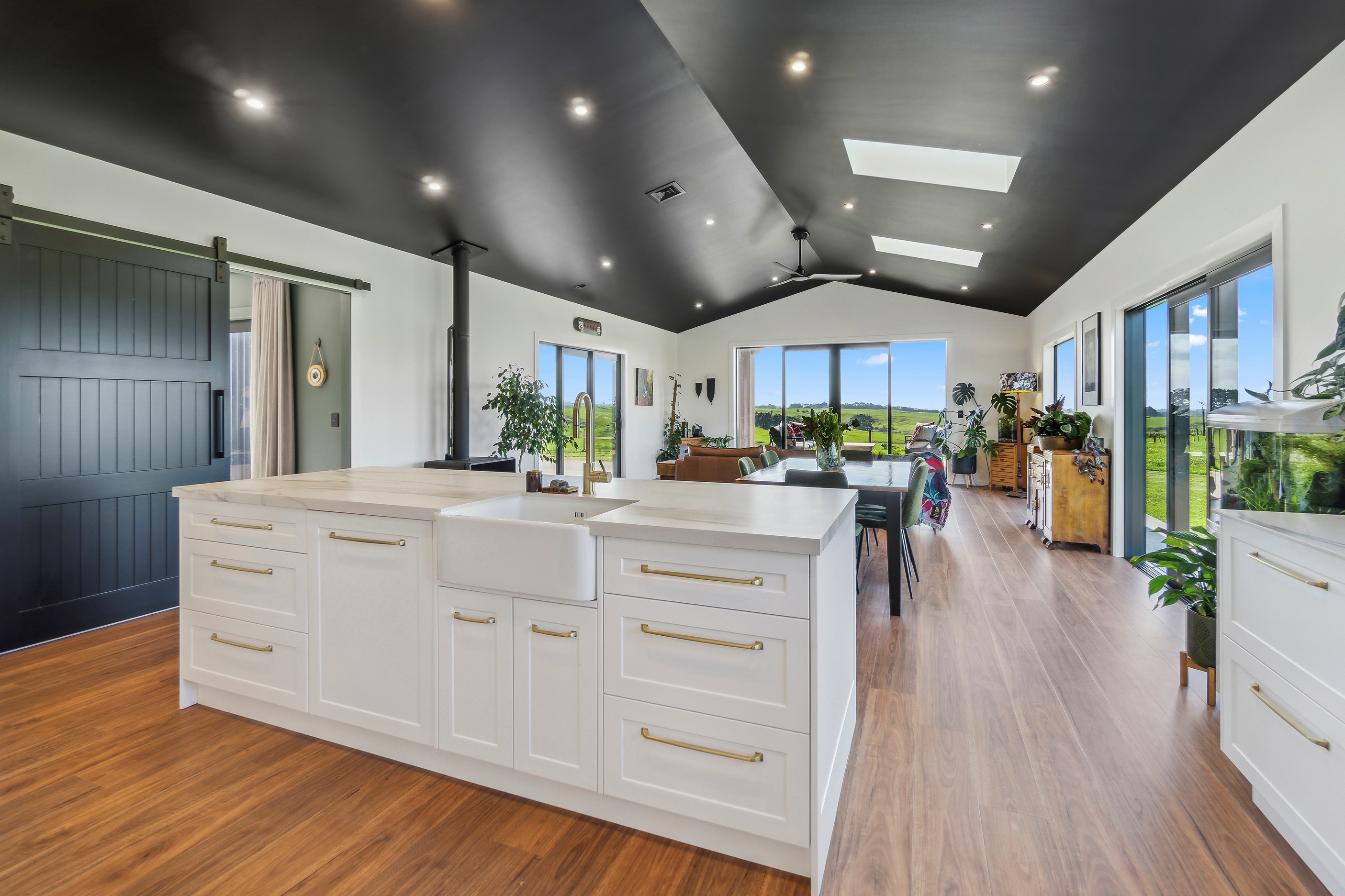If this homestead were a movie, three parties would play starring roles: the father of one of the clients, the clients themselves and Versatile Homes and Buildings. Dad designed it, daughter made many of the decisions while son-in-law worked on the farm, and Versatile built it. It’s a heavenly result, as evidence by the night- sky raked ceiling in the open-plan kitchen, dining and living space, which is punctured with lights – like twinkling stars. The outlook from this space is just as good. Extensive use of glass means the couple can take in the views from almost anywhere they stand. The H-shaped 278sqm property overlooks a landscape of green pastures that run down to the sea.