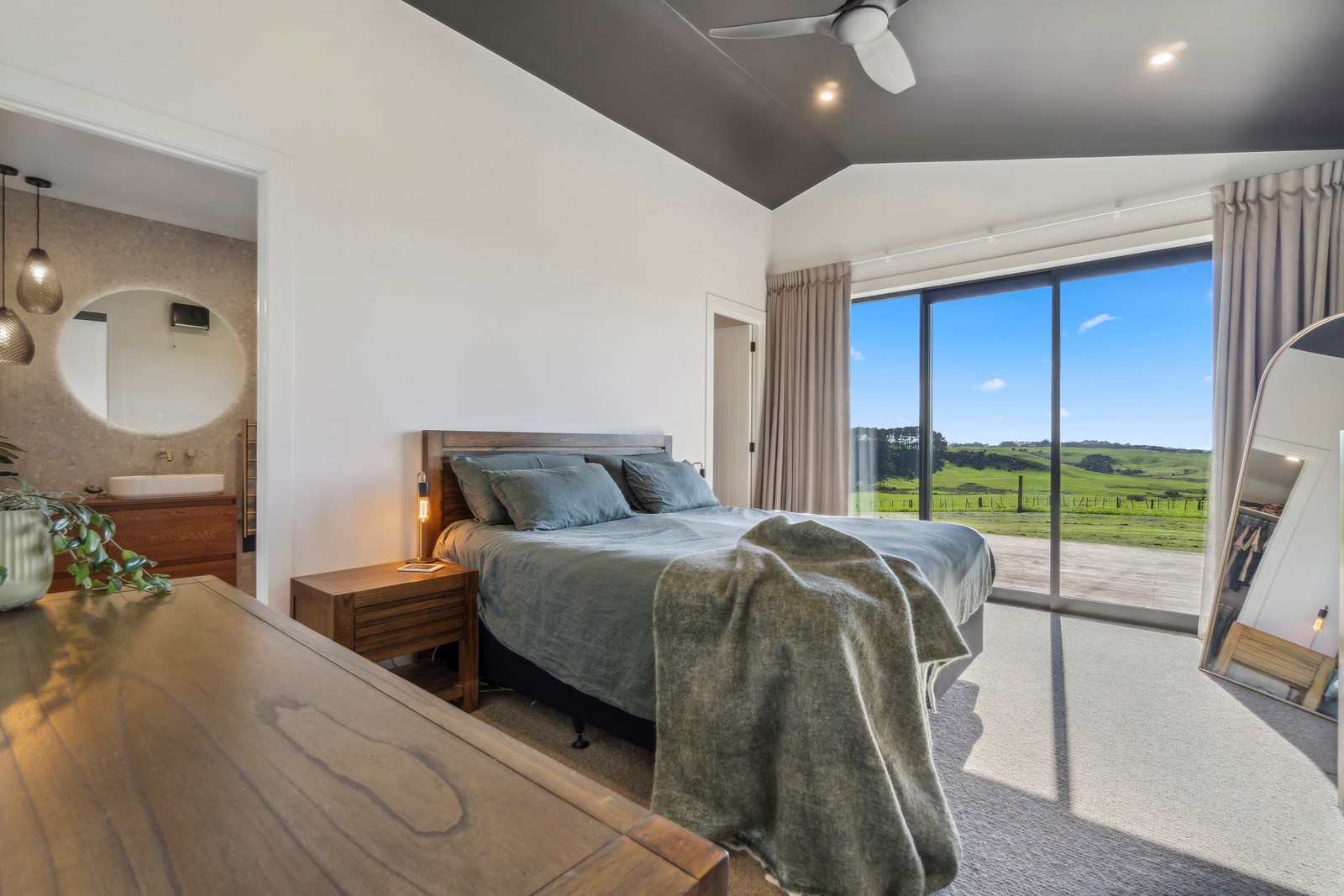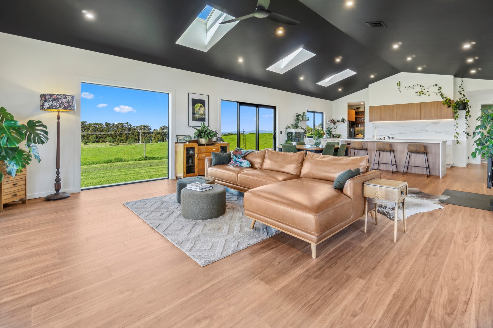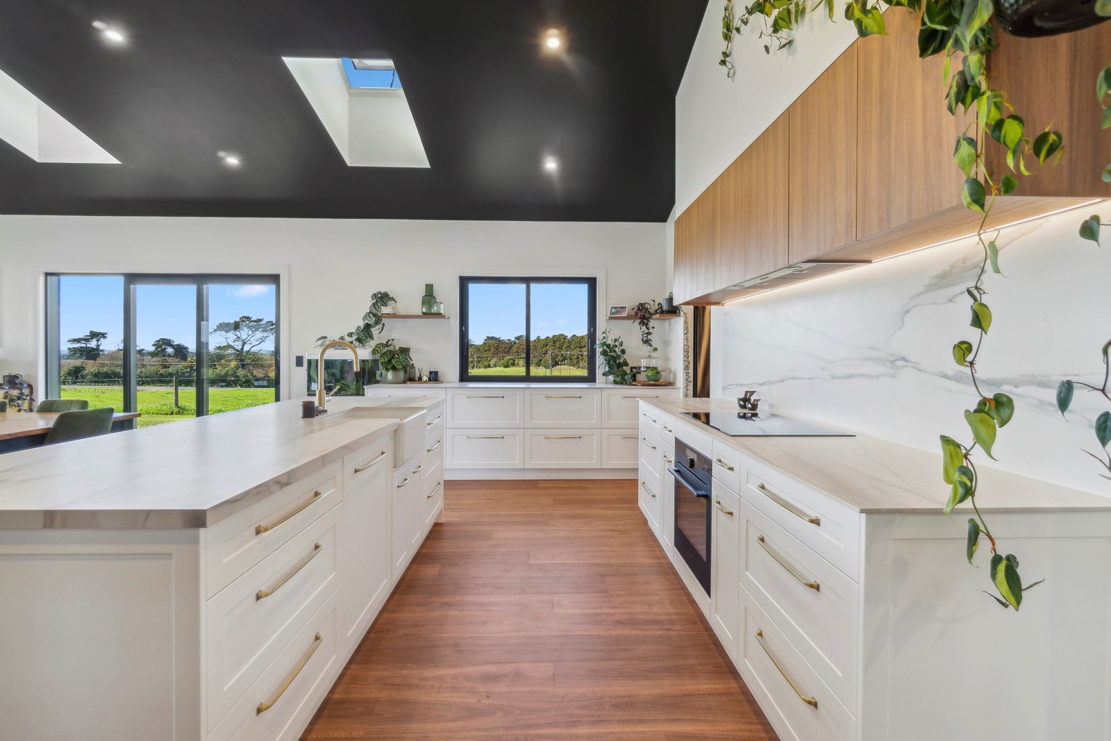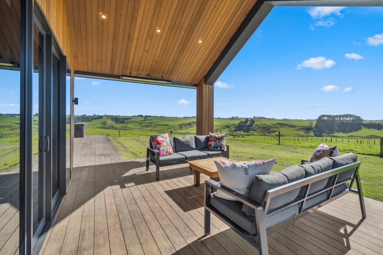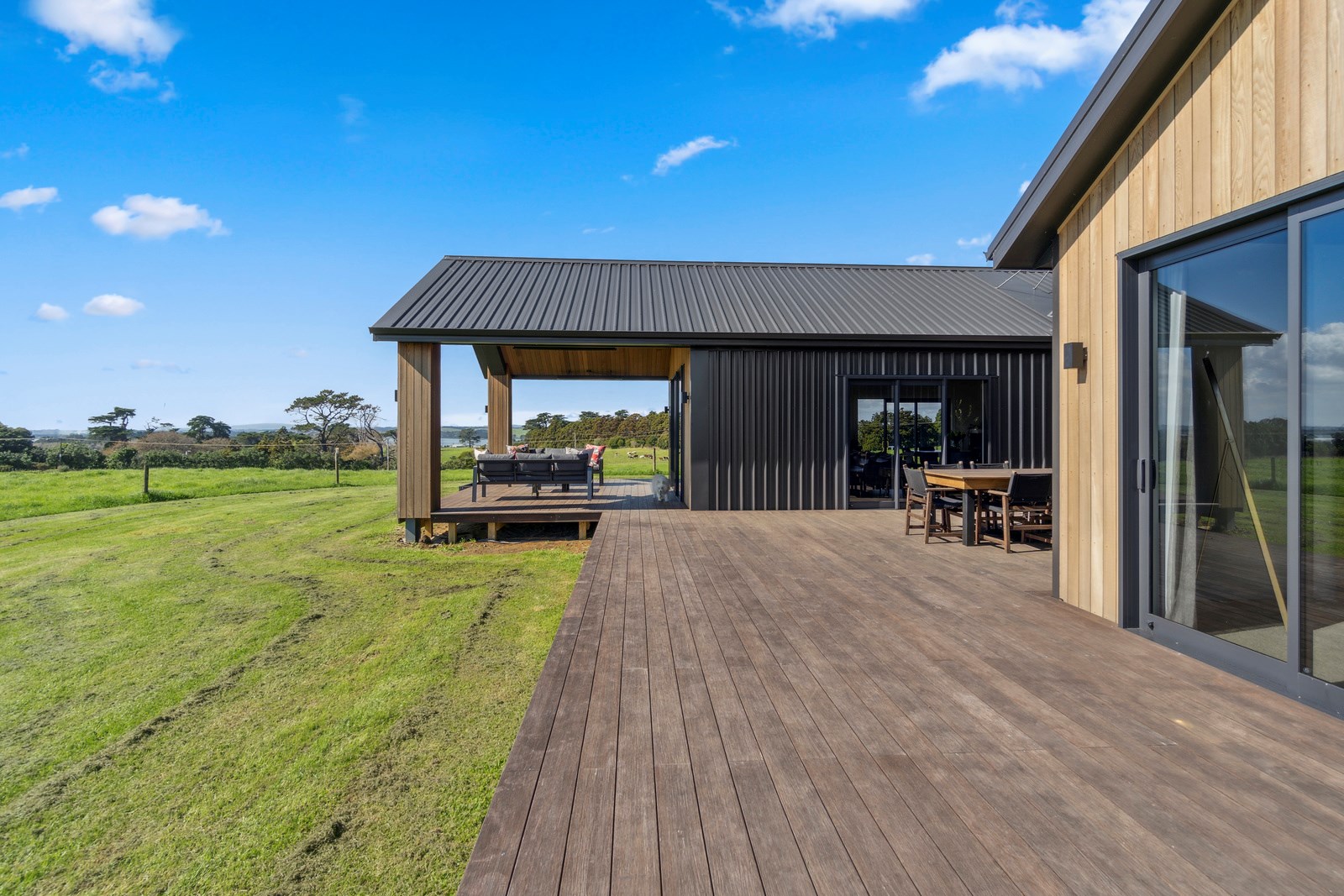 If this homestead were a movie, three parties would play starring roles: the father of one of the clients, the clients themselves and Versatile Homes and Buildings. Dad designed it, daughter made many of the decisions while son-in-law worked on the farm, and Versatile built it. It’s a heavenly result, as evidence by the night- sky raked ceiling in the open-plan kitchen, dining and living space, which is punctured with lights – like twinkling stars. The outlook from this space is just as good. Extensive use of glass means the couple can take in the views from almost anywhere they stand. The H-shaped 278sqm property overlooks a landscape of green pastures that run down to the sea.