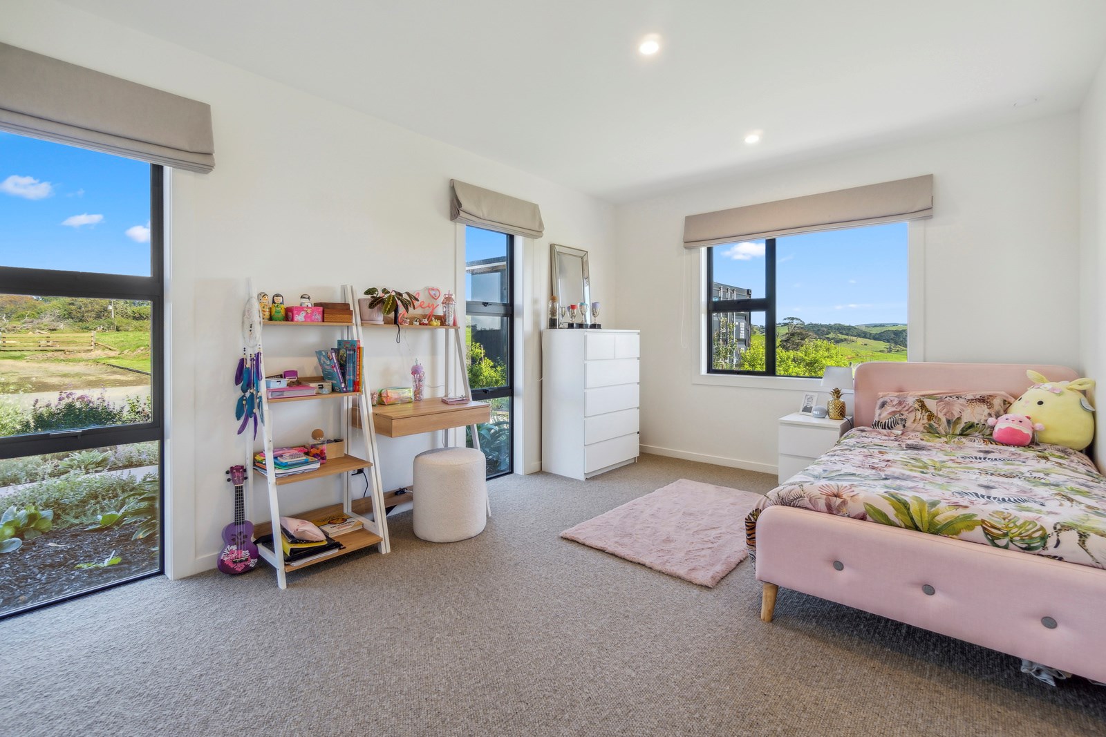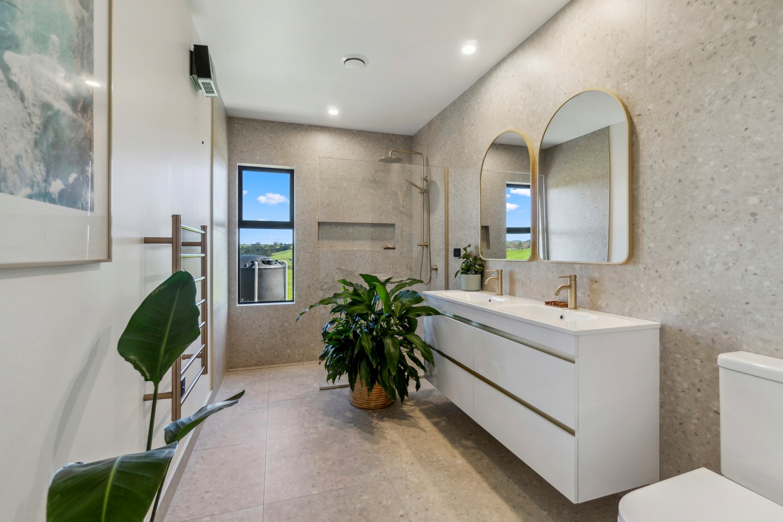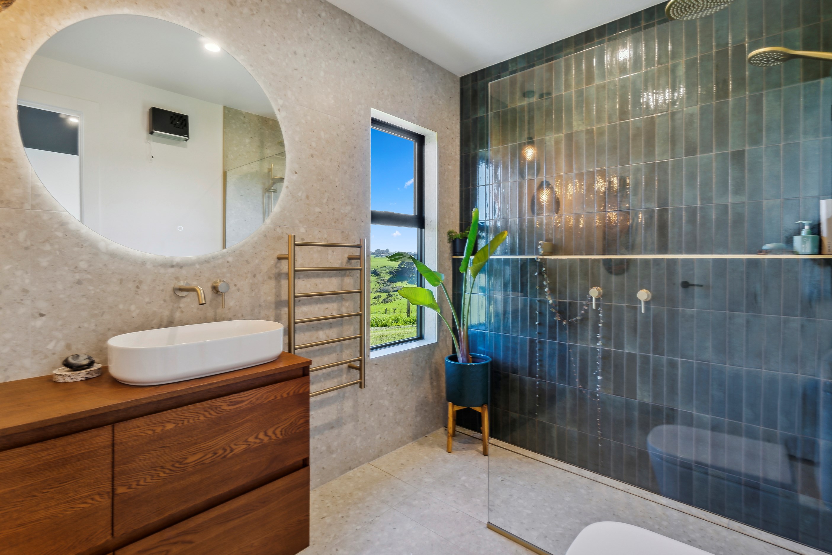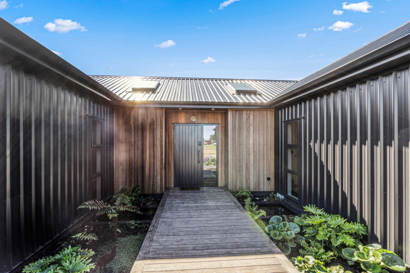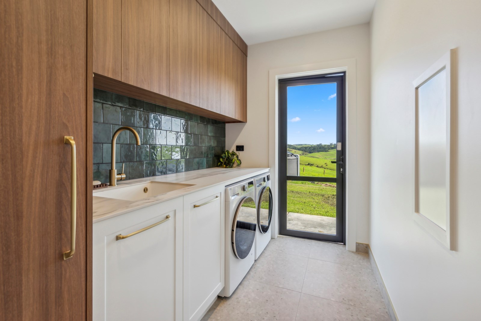 If this homestead were a movie, three parties would play starring roles: the father of one of the clients, the clients themselves and Versatile Homes and Buildings. Dad designed it, daughter made many of the decisions while son-in-law worked on the farm, and Versatile built it. It’s a heavenly result, as evidence by the night- sky raked ceiling in the open-plan kitchen, dining and living space, which is punctured with lights – like twinkling stars. The outlook from this space is just as good. Extensive use of glass means the couple can take in the views from almost anywhere they stand. The H-shaped 278sqm property overlooks a landscape of green pastures that run down to the sea.