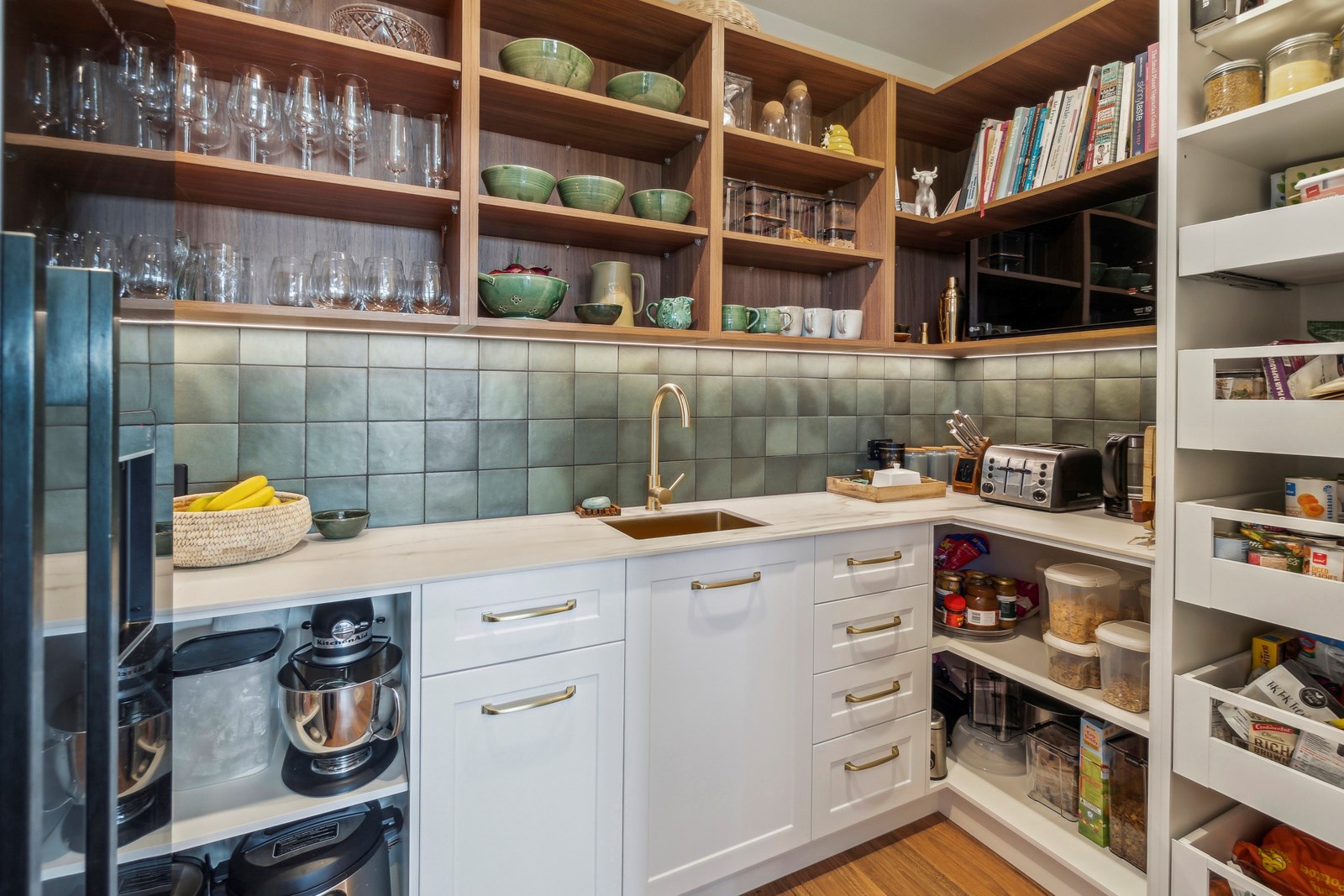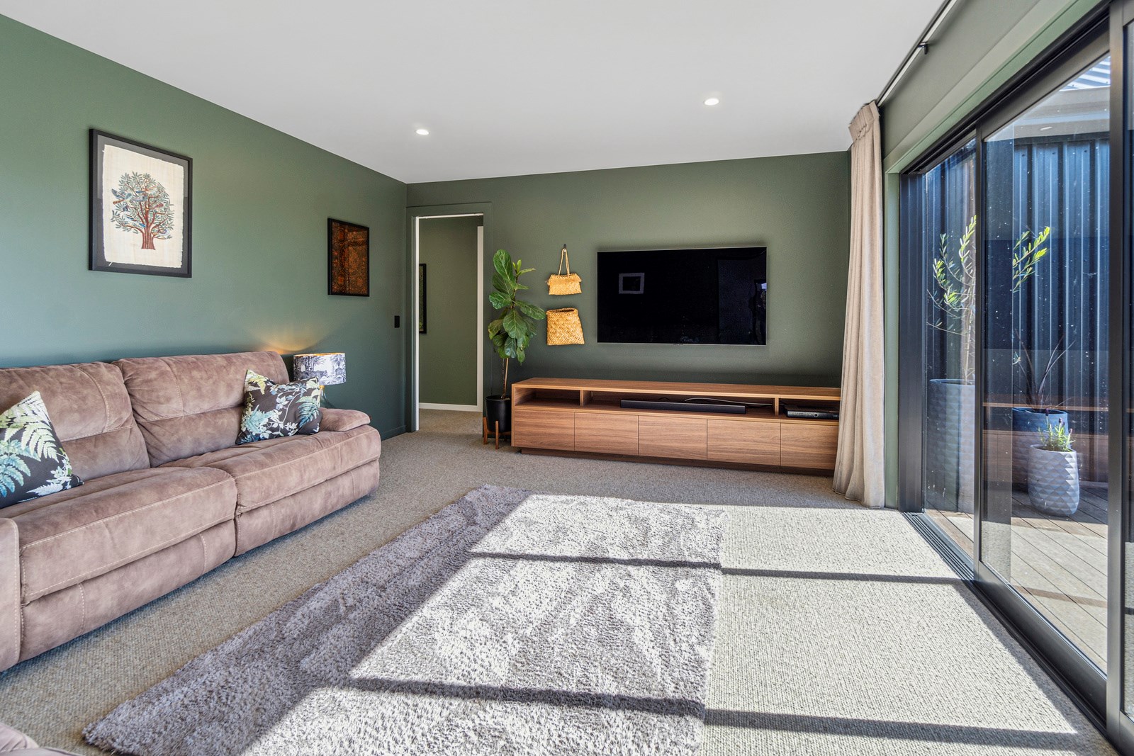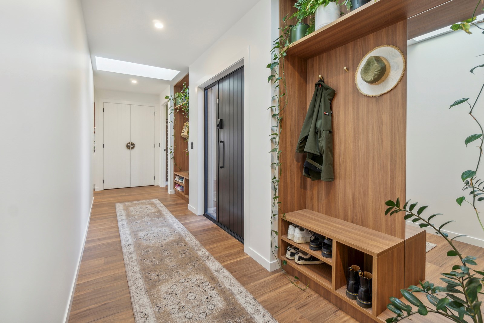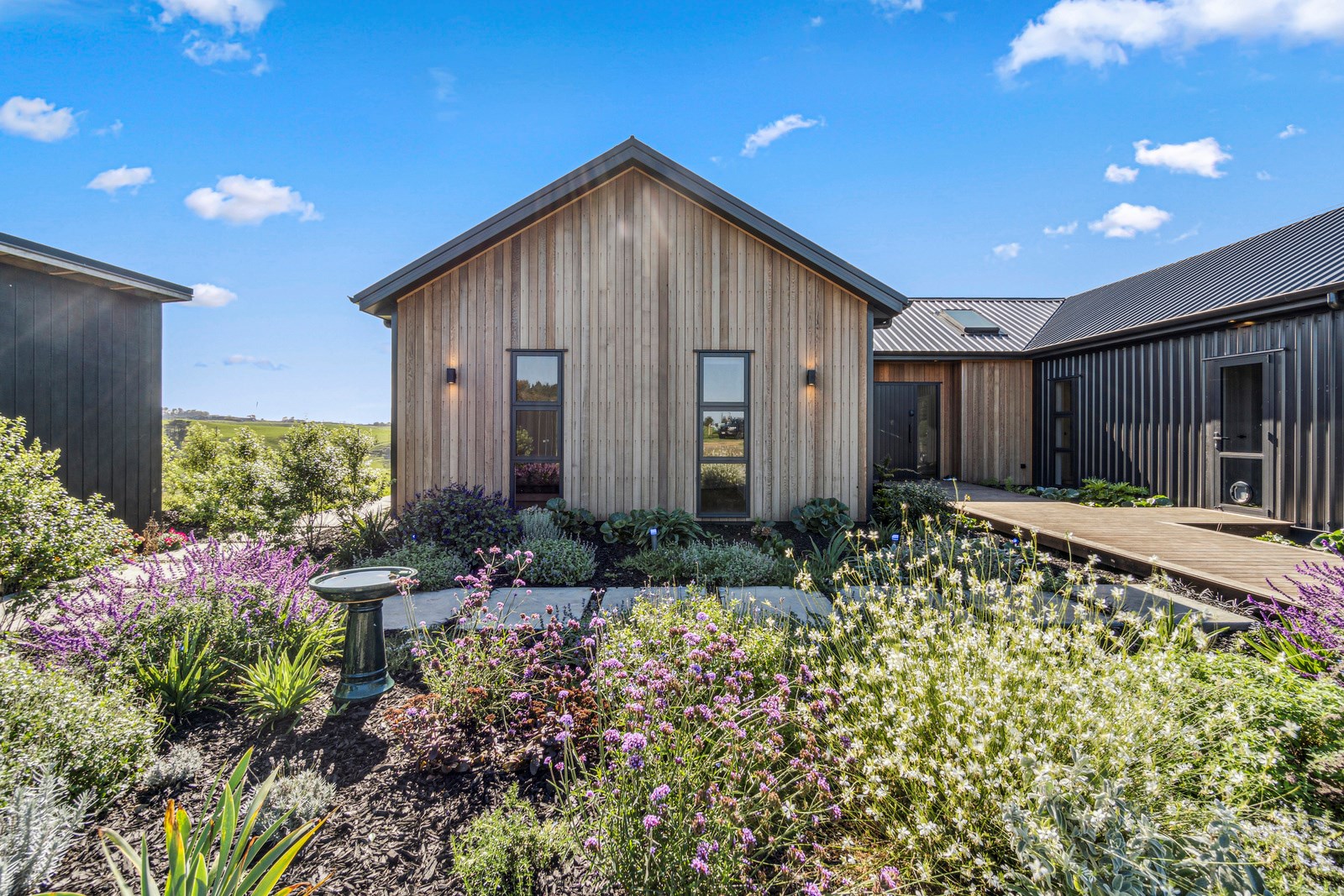 It also faces north, so it’s warm and sunny. The notches in the H-shape have timber decking and the living space extends in a portico ensuring there are always sheltered outdoor spaces. The flow from inside to out is intuitive and seamless. Divine features abound in this three-bedroom, two-bathroom home, many of which were chosen by the clients, from the cedar cladding and interior palette to the minutiae of the kitchen fit-out. You’ll also find a roomy scullery, a vertical timber-lined nook with hooks and shelving in the entrance, tiled laundry and bathrooms, walls painted in a tasteful sage hue, and a boardwalk-style entrance that says, ‘welcome home’.