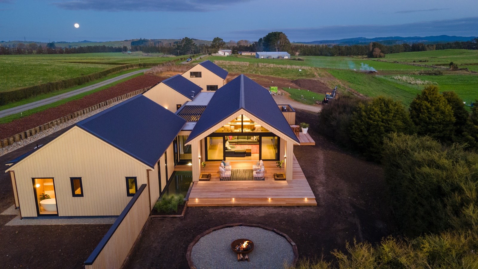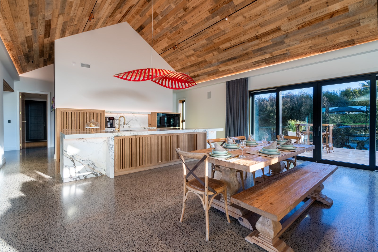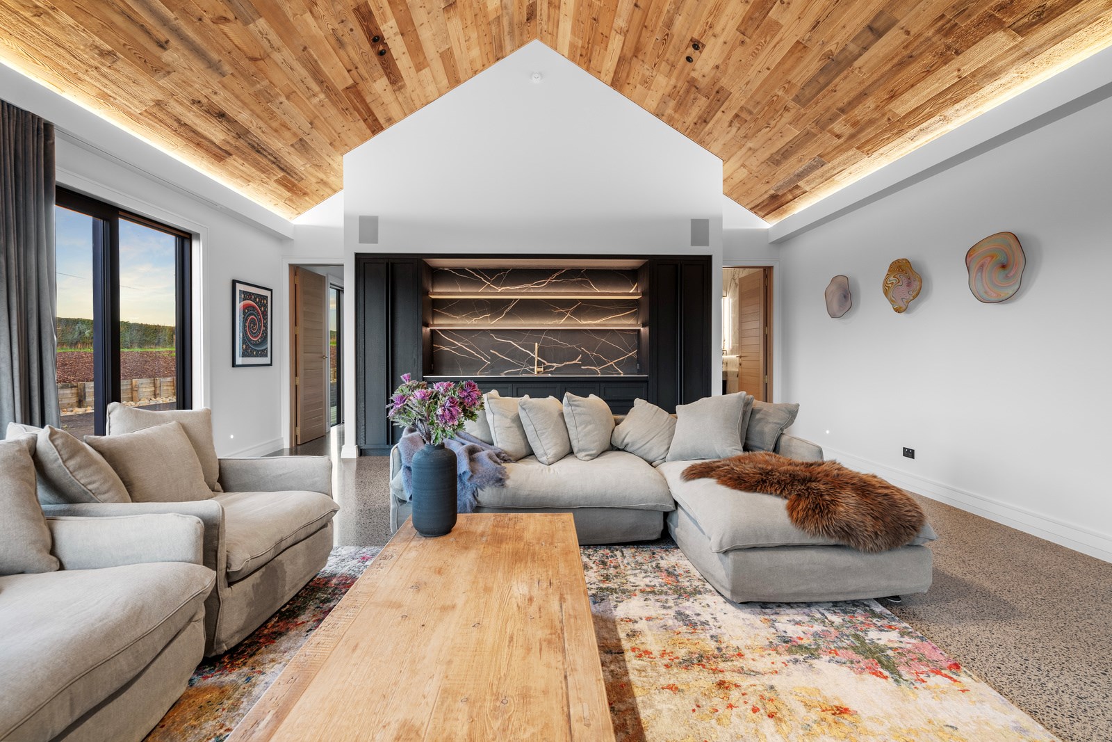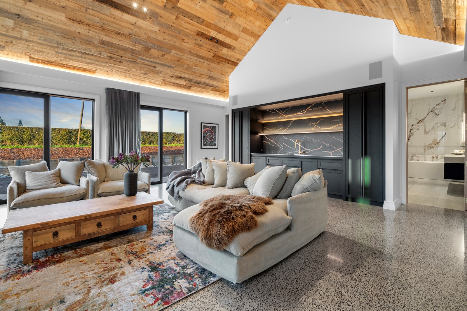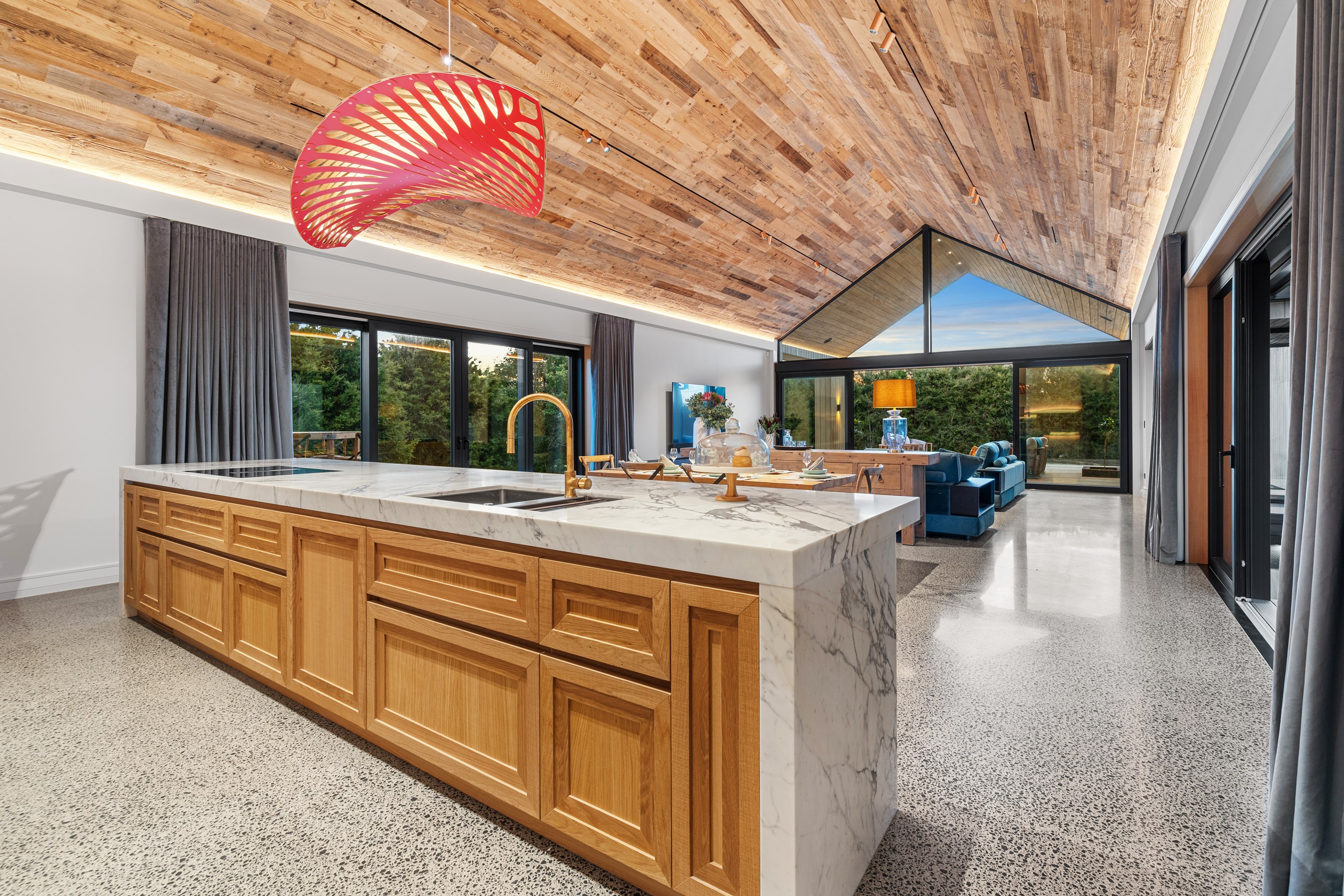 This 445sqm contemporary farmhouse combines luxury, high energy performance, and cutting-edge materials and methods designed for sustainability.  There are three bedrooms, all with en suites, in the three shiplap-clad linked pavilions, including a standalone guest pavilion.  One of the standout features is a canal-like rill water feature that runs along the exterior of the main living pavilion framed by floor-to-ceiling glass. Other exceptional details of the home are polished concrete floors, and a rich palette of Tasmanian oak, reclaimed timber ceilings and charred wood. The open-plan living and dining space is anchored by a striking marble-wrapped kitchen island with oak cabinetry. The living area extends out into a portico over a large deck. Opulent bathrooms feature floor-to-ceiling glazed porcelain tiles, bespoke cabinetry, and brushed brass fittings.
