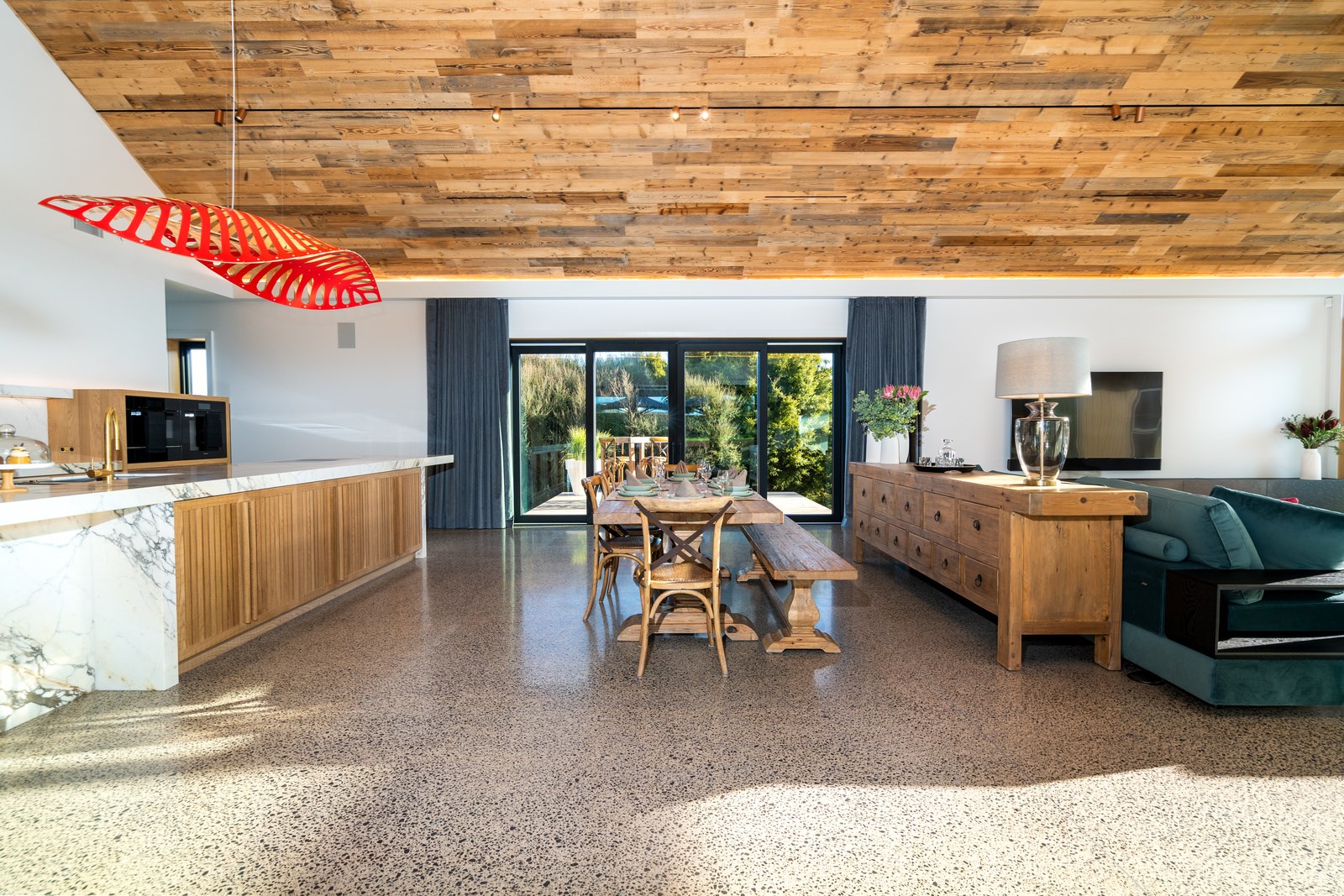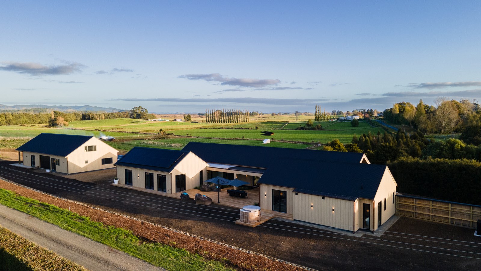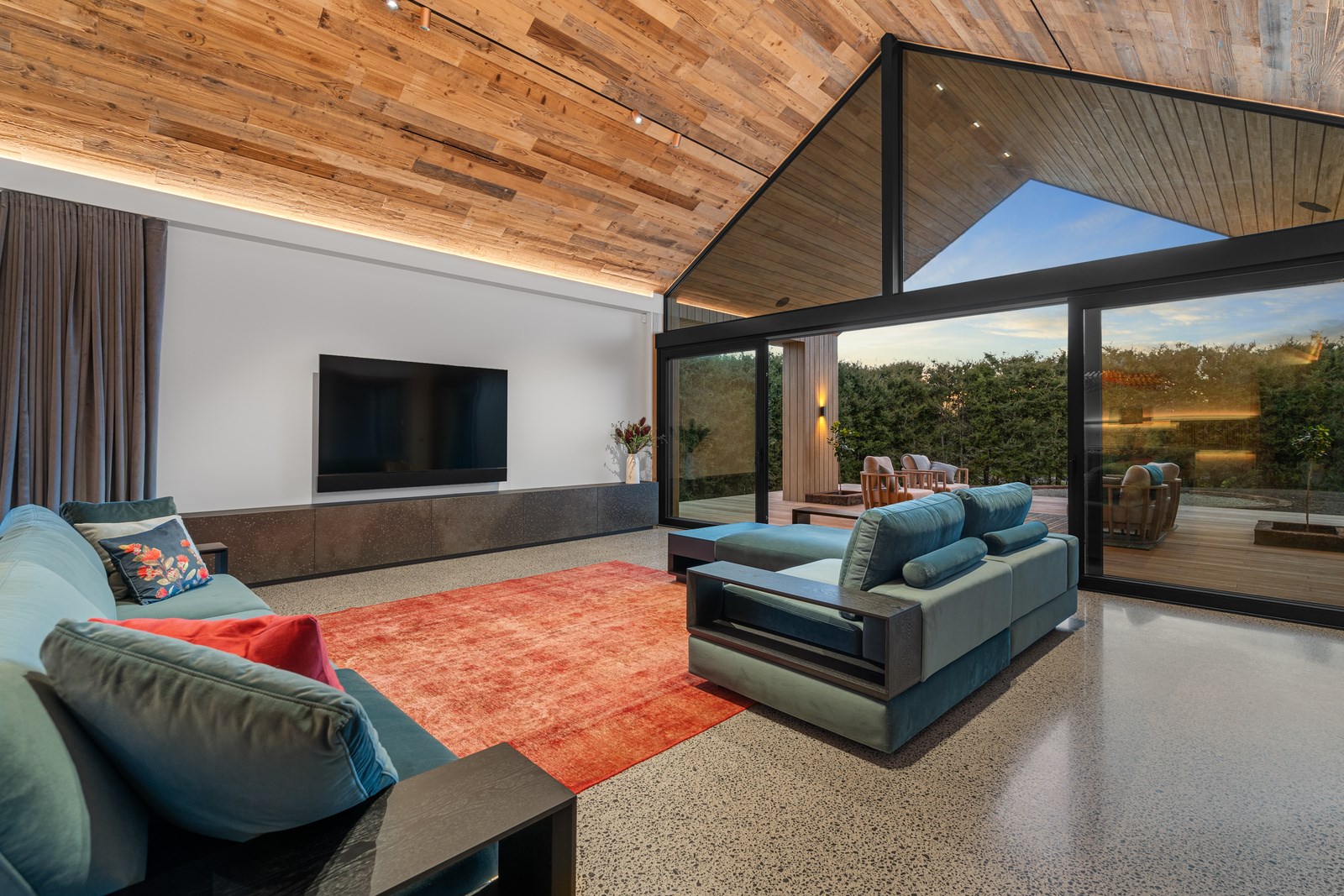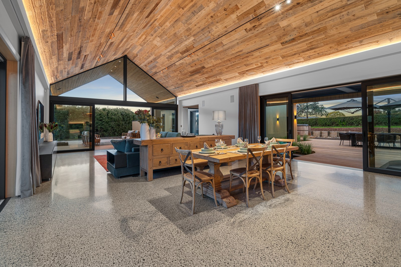 This 445sqm contemporary farmhouse combines luxury, high energy performance, and cutting-edge materials and methods designed for sustainability.  There are three bedrooms, all with en suites, in the three shiplap-clad linked pavilions, including a standalone guest pavilion.  One of the standout features is a canal-like rill water feature that runs along the exterior of the main living pavilion framed by floor-to-ceiling glass. Other exceptional details of the home are polished concrete floors, and a rich palette of Tasmanian oak, reclaimed timber ceilings and charred wood. The open-plan living and dining space is anchored by a striking marble-wrapped kitchen island with oak cabinetry. The living area extends out into a portico over a large deck. Opulent bathrooms feature floor-to-ceiling glazed porcelain tiles, bespoke cabinetry, and brushed brass fittings.