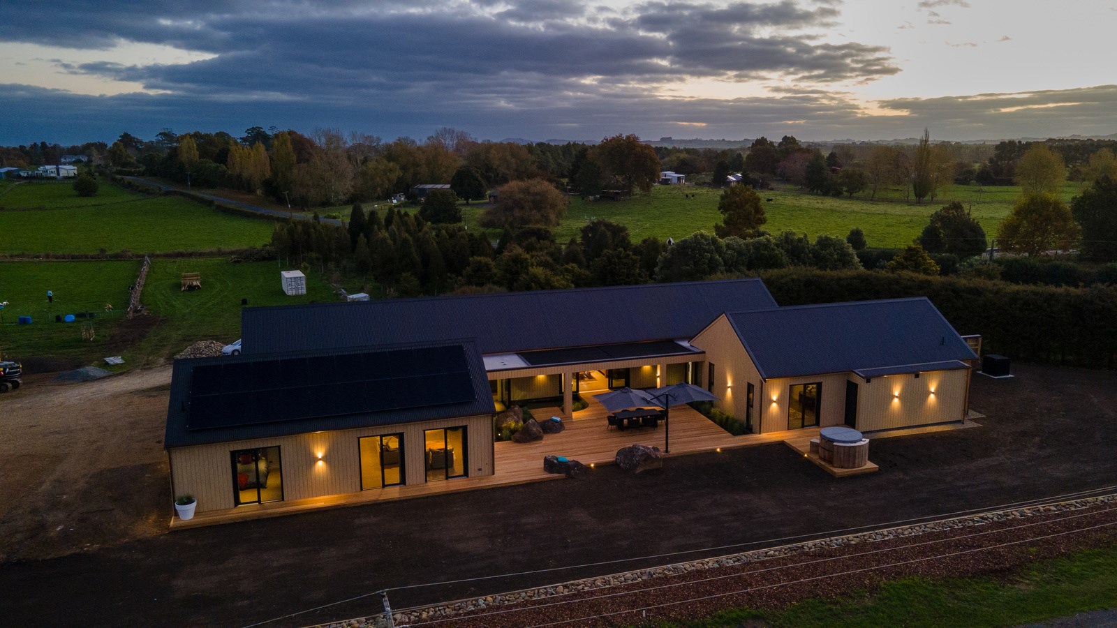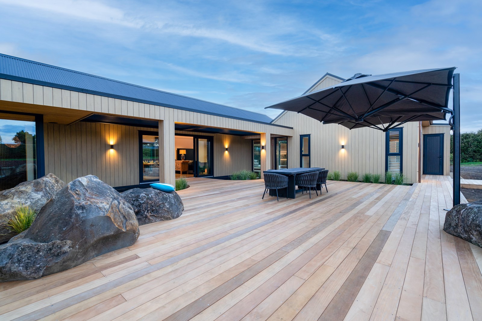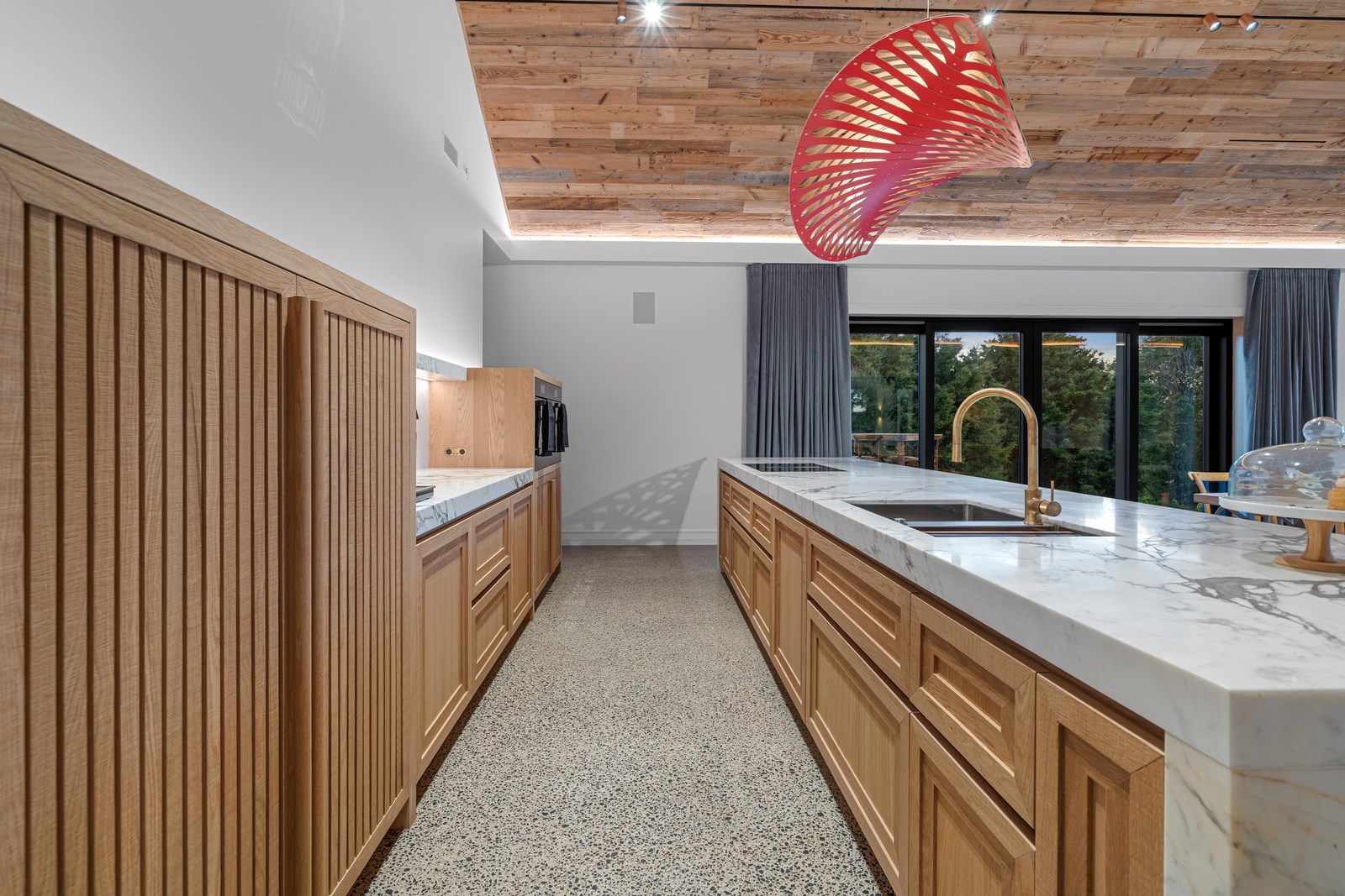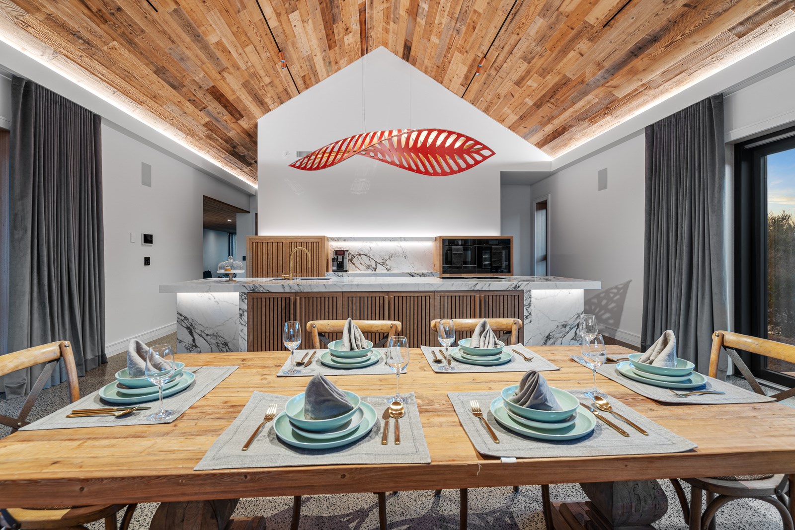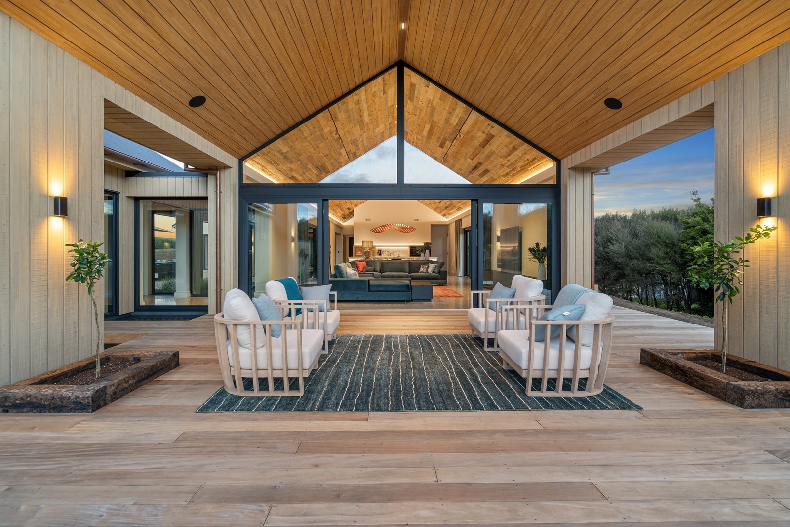 This 445sqm contemporary farmhouse combines luxury, high energy performance, and cutting-edge materials and methods designed for sustainability.  There are three bedrooms, all with en suites, in the three shiplap-clad linked pavilions, including a standalone guest pavilion.  One of the standout features is a canal-like rill water feature that runs along the exterior of the main living pavilion framed by floor-to-ceiling glass. Other exceptional details of the home are polished concrete floors, and a rich palette of Tasmanian oak, reclaimed timber ceilings and charred wood. The open-plan living and dining space is anchored by a striking marble-wrapped kitchen island with oak cabinetry. The living area extends out into a portico over a large deck. Opulent bathrooms feature floor-to-ceiling glazed porcelain tiles, bespoke cabinetry, and brushed brass fittings.