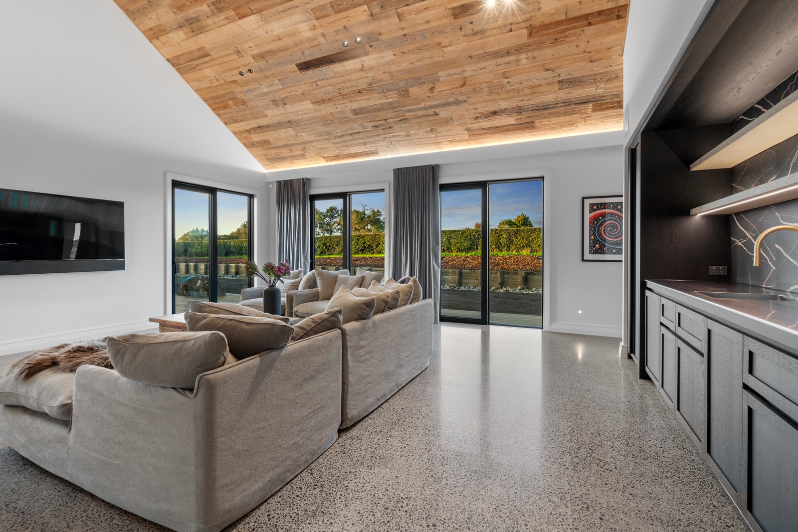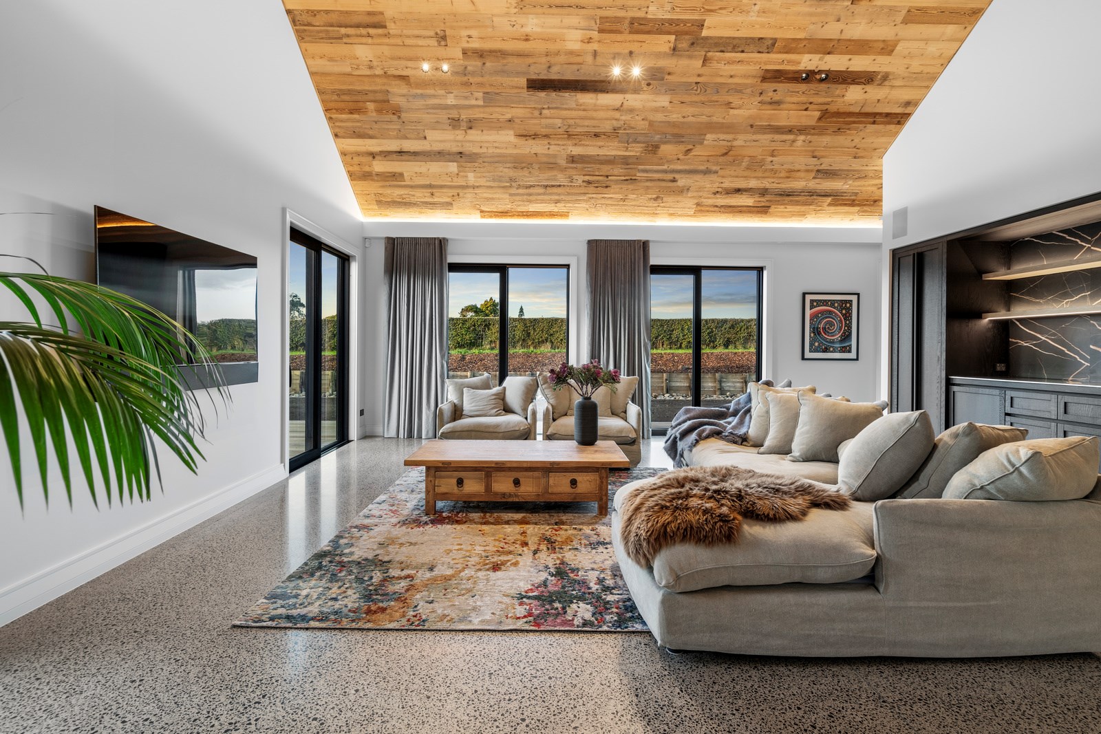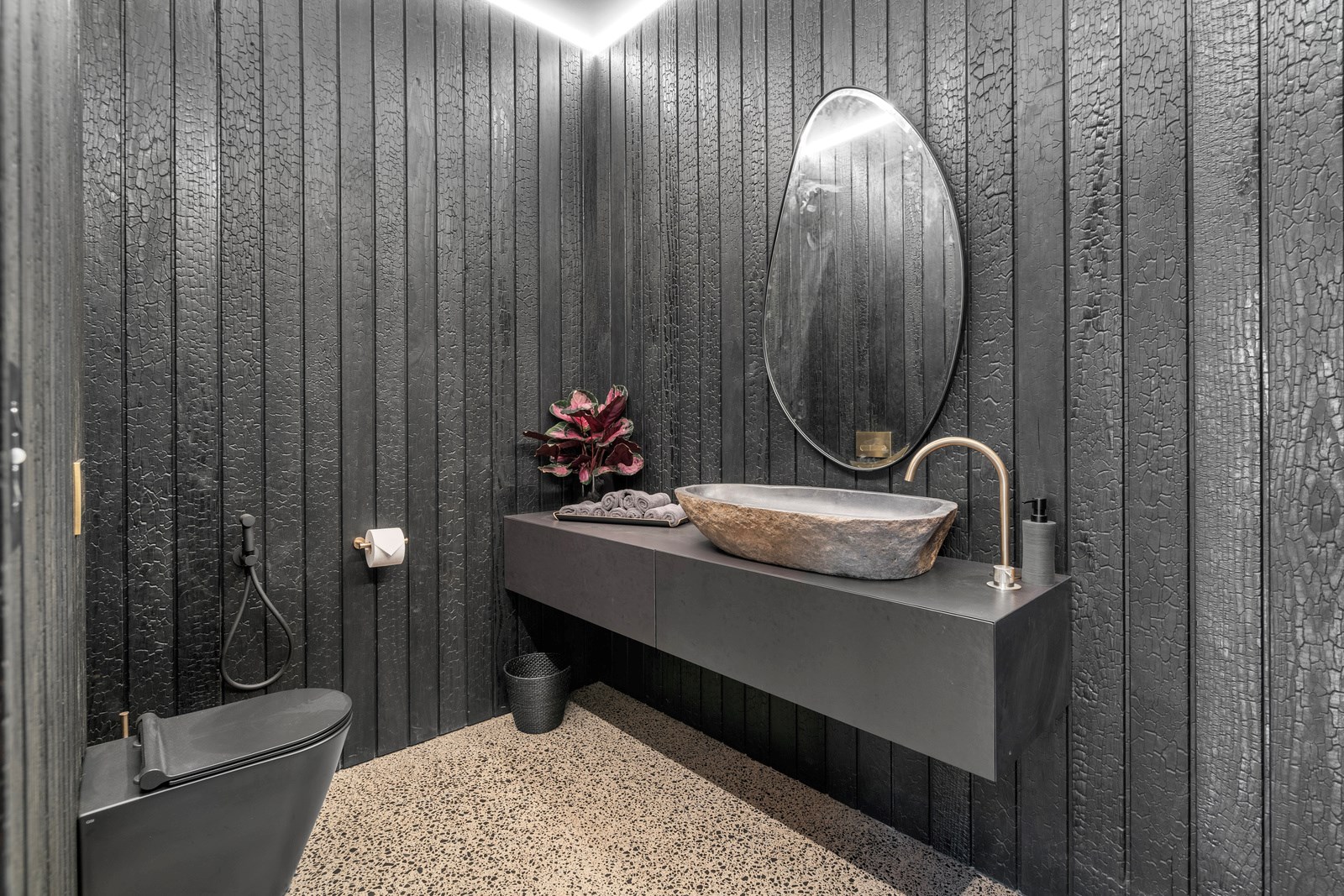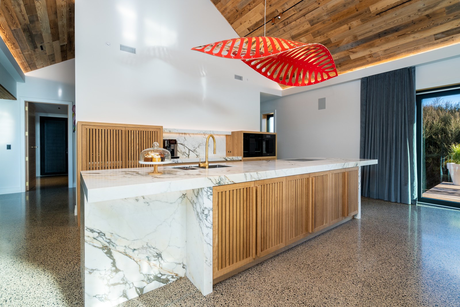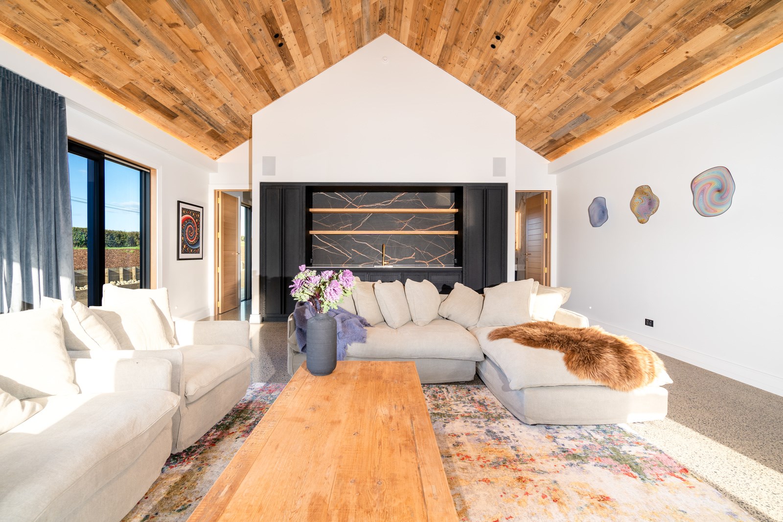 This 445sqm contemporary farmhouse combines luxury, high energy performance, and cutting-edge materials and methods designed for sustainability.  There are three bedrooms, all with en suites, in the three shiplap-clad linked pavilions, including a standalone guest pavilion.  One of the standout features is a canal-like rill water feature that runs along the exterior of the main living pavilion framed by floor-to-ceiling glass. Other exceptional details of the home are polished concrete floors, and a rich palette of Tasmanian oak, reclaimed timber ceilings and charred wood. The open-plan living and dining space is anchored by a striking marble-wrapped kitchen island with oak cabinetry. The living area extends out into a portico over a large deck. Opulent bathrooms feature floor-to-ceiling glazed porcelain tiles, bespoke cabinetry, and brushed brass fittings.