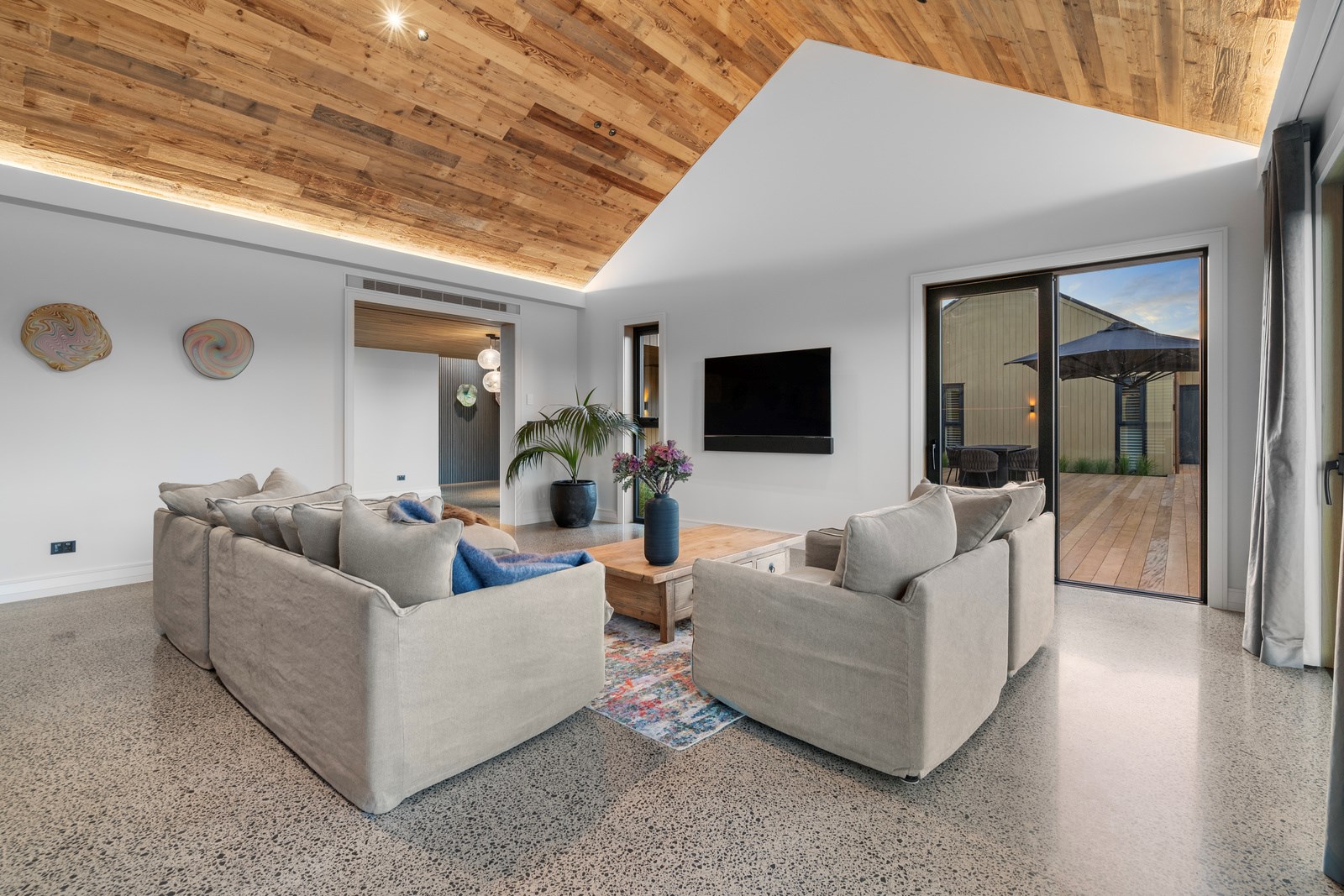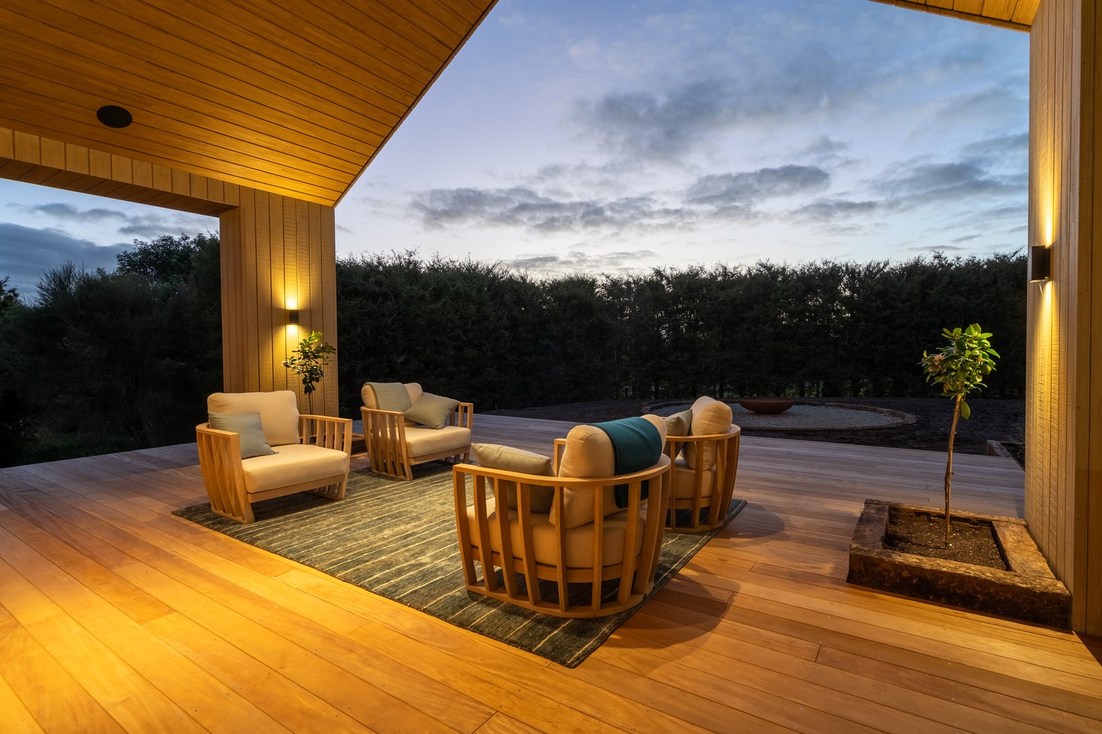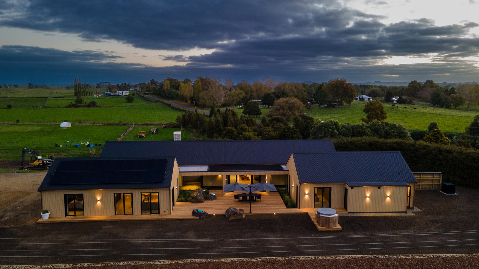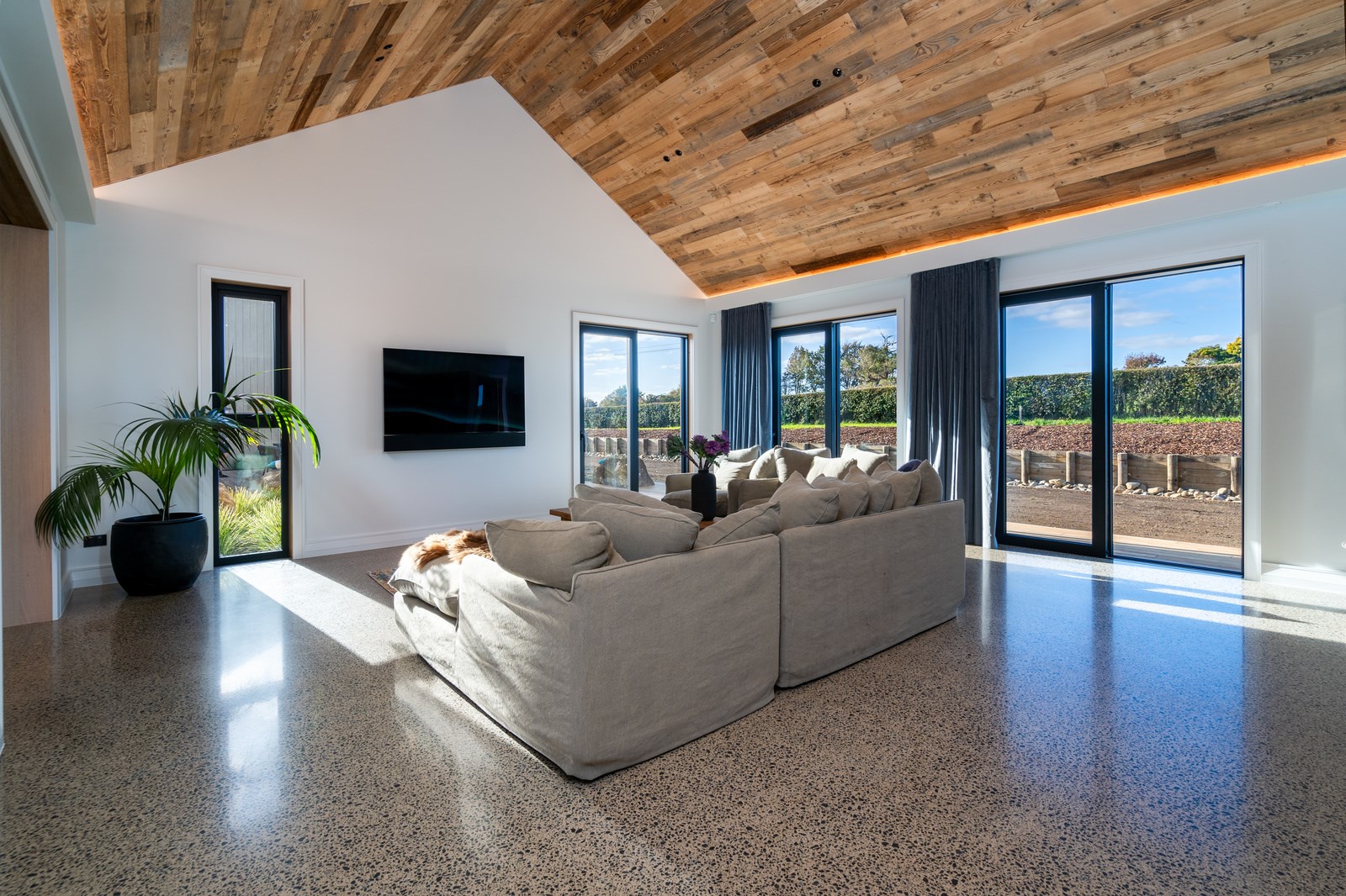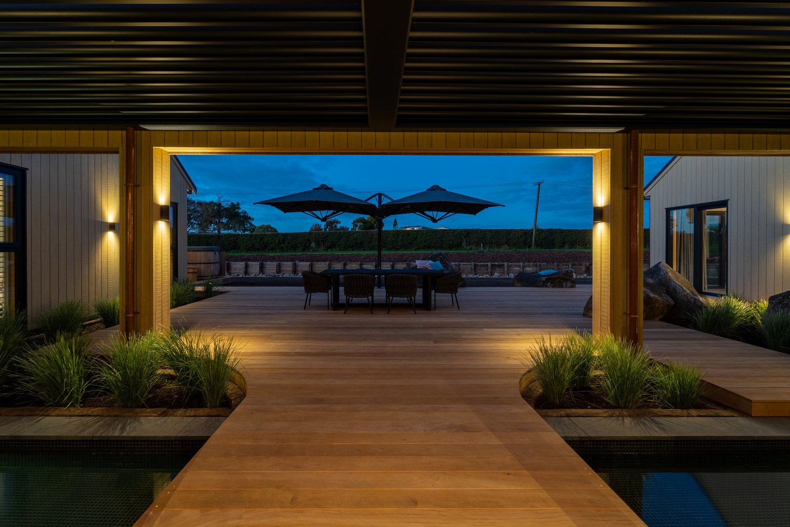 This 445sqm contemporary farmhouse combines luxury, high energy performance, and cutting-edge materials and methods designed for sustainability.  There are three bedrooms, all with en suites, in the three shiplap-clad linked pavilions, including a standalone guest pavilion.  One of the standout features is a canal-like rill water feature that runs along the exterior of the main living pavilion framed by floor-to-ceiling glass. Other exceptional details of the home are polished concrete floors, and a rich palette of Tasmanian oak, reclaimed timber ceilings and charred wood. The open-plan living and dining space is anchored by a striking marble-wrapped kitchen island with oak cabinetry. The living area extends out into a portico over a large deck. Opulent bathrooms feature floor-to-ceiling glazed porcelain tiles, bespoke cabinetry, and brushed brass fittings.