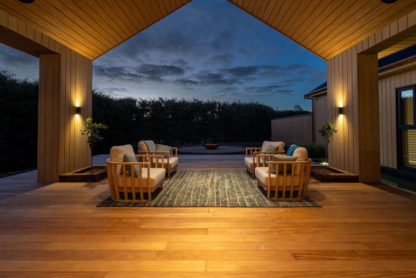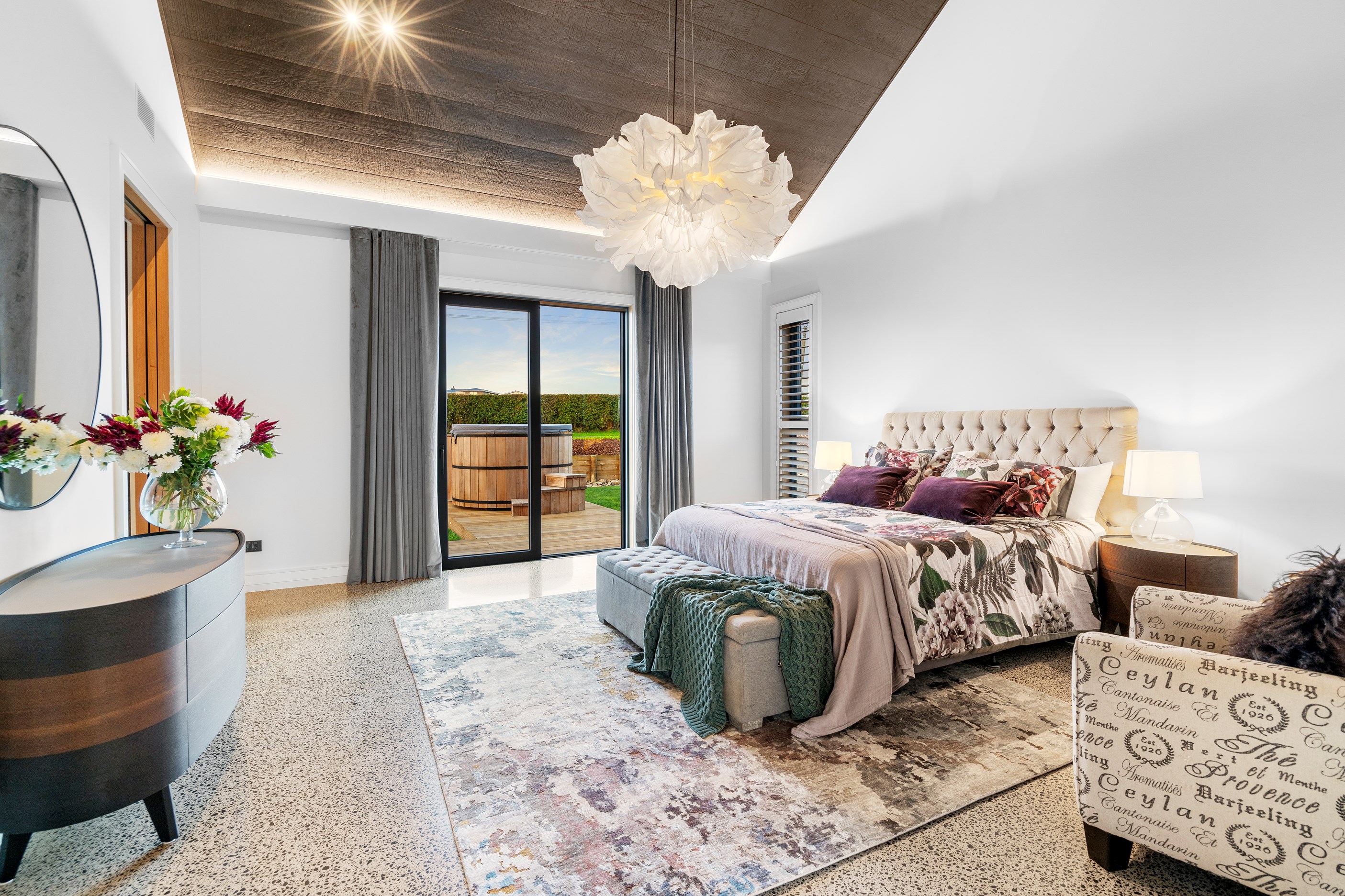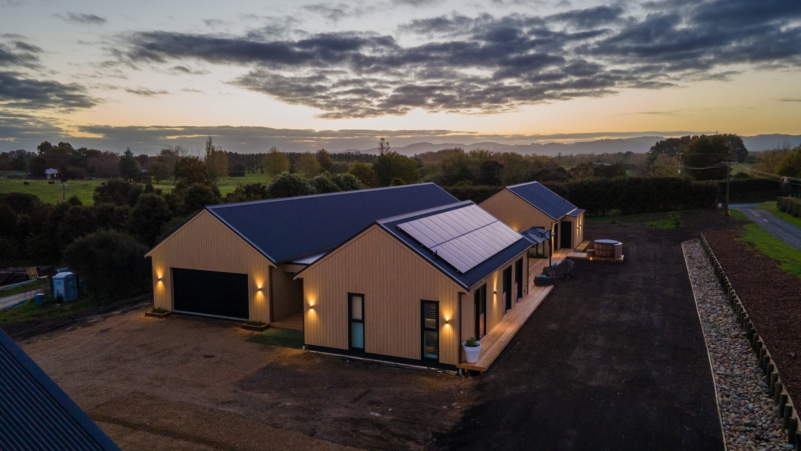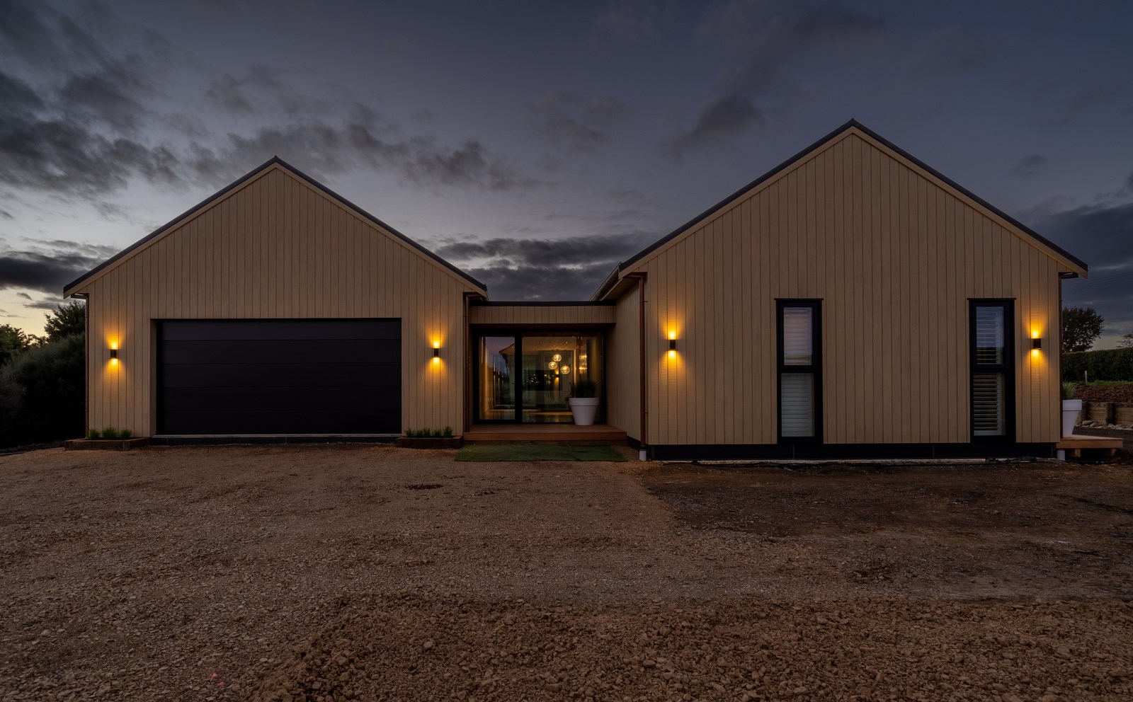 This 445sqm contemporary farmhouse combines luxury, high energy performance, and cutting-edge materials and methods designed for sustainability.  There are three bedrooms, all with en suites, in the three shiplap-clad linked pavilions, including a standalone guest pavilion.  One of the standout features is a canal-like rill water feature that runs along the exterior of the main living pavilion framed by floor-to-ceiling glass. Other exceptional details of the home are polished concrete floors, and a rich palette of Tasmanian oak, reclaimed timber ceilings and charred wood. The open-plan living and dining space is anchored by a striking marble-wrapped kitchen island with oak cabinetry. The living area extends out into a portico over a large deck. Opulent bathrooms feature floor-to-ceiling glazed porcelain tiles, bespoke cabinetry, and brushed brass fittings.