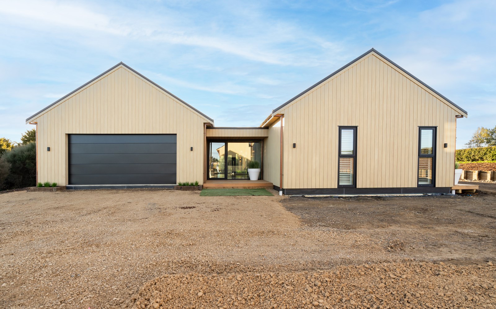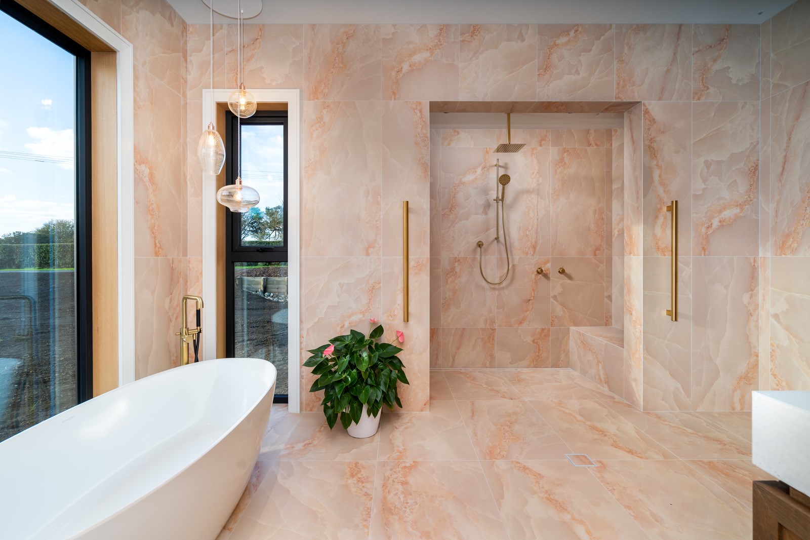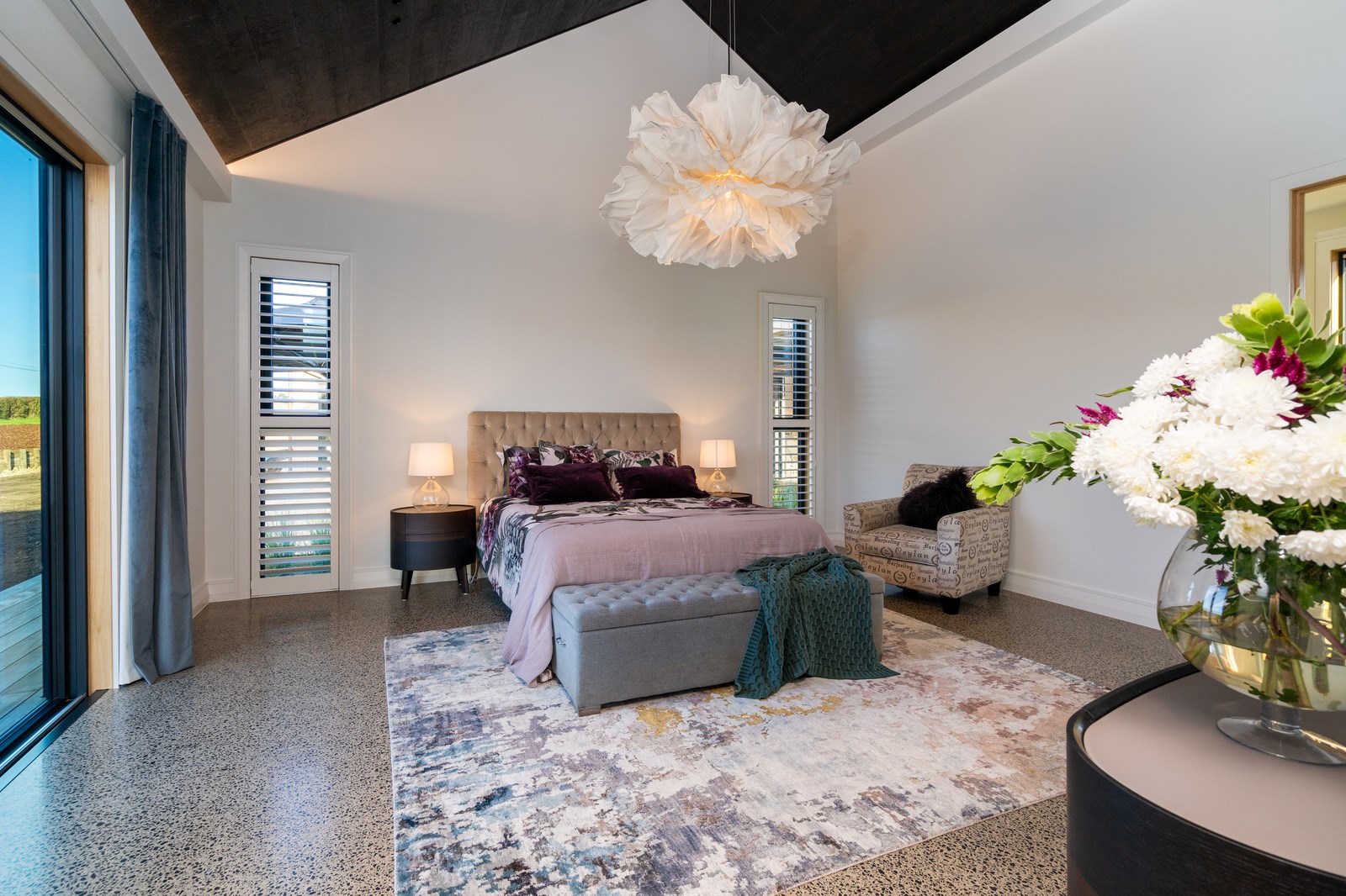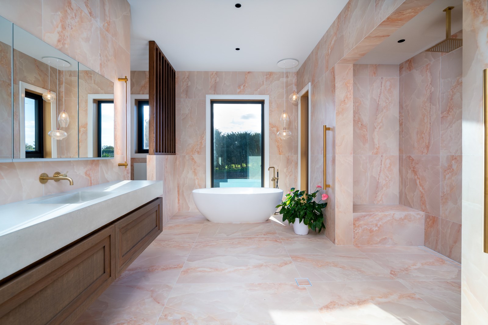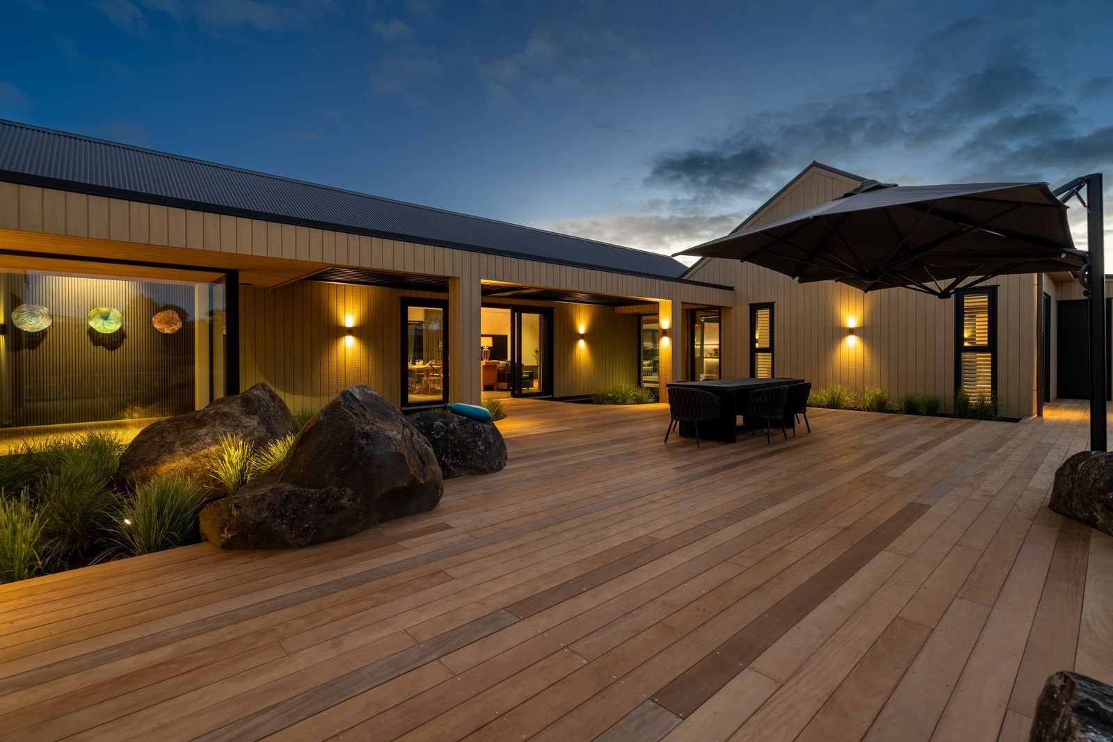 This 445sqm contemporary farmhouse combines luxury, high energy performance, and cutting-edge materials and methods designed for sustainability.  There are three bedrooms, all with en suites, in the three shiplap-clad linked pavilions, including a standalone guest pavilion.  One of the standout features is a canal-like rill water feature that runs along the exterior of the main living pavilion framed by floor-to-ceiling glass. Other exceptional details of the home are polished concrete floors, and a rich palette of Tasmanian oak, reclaimed timber ceilings and charred wood. The open-plan living and dining space is anchored by a striking marble-wrapped kitchen island with oak cabinetry. The living area extends out into a portico over a large deck. Opulent bathrooms feature floor-to-ceiling glazed porcelain tiles, bespoke cabinetry, and brushed brass fittings.