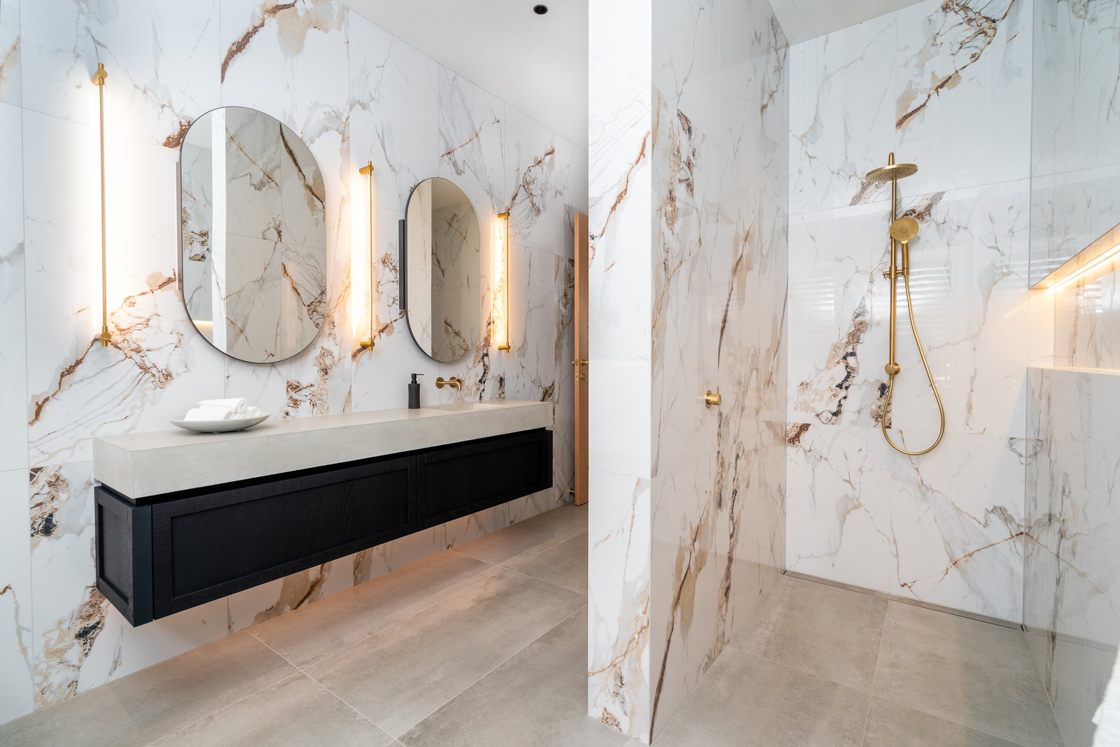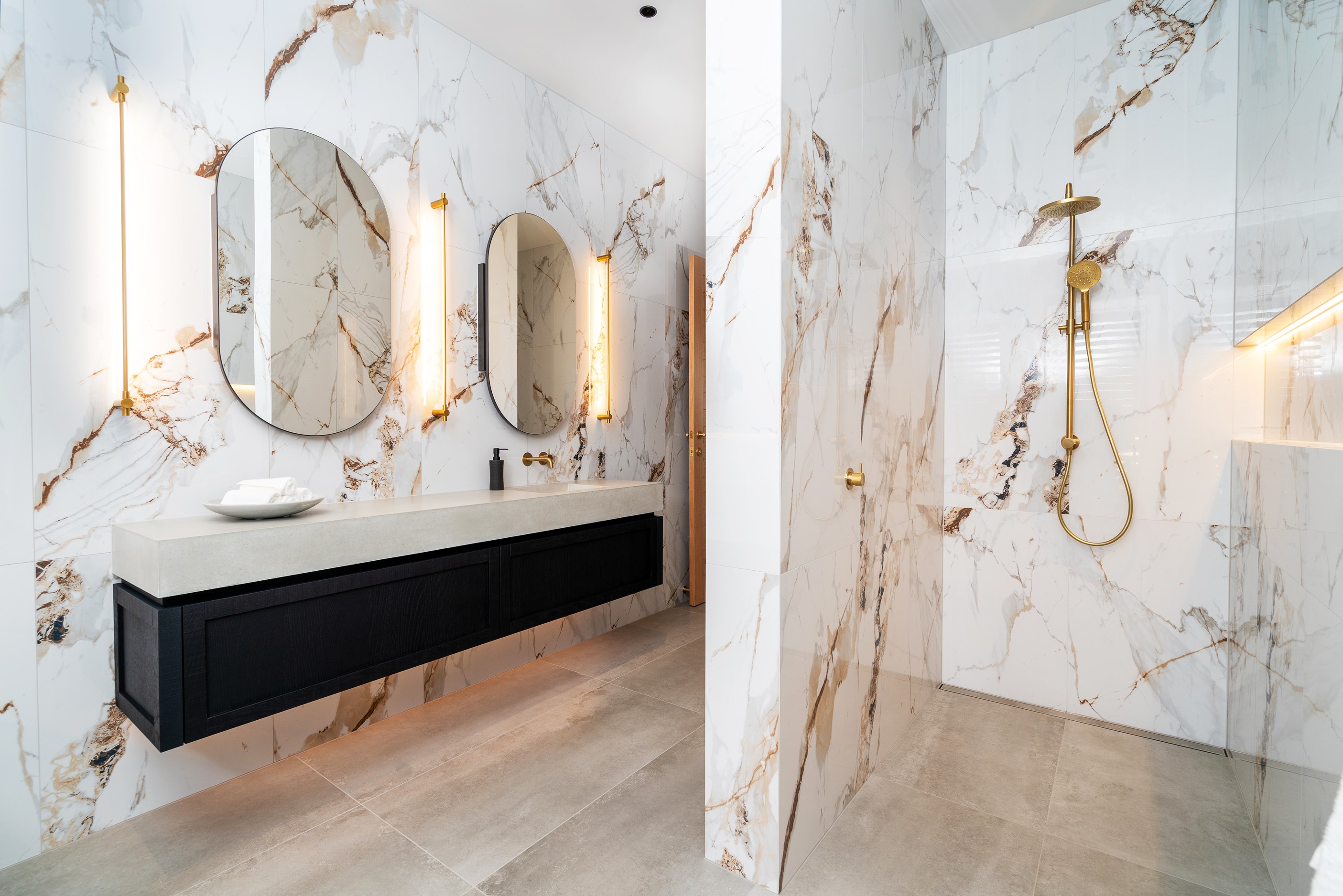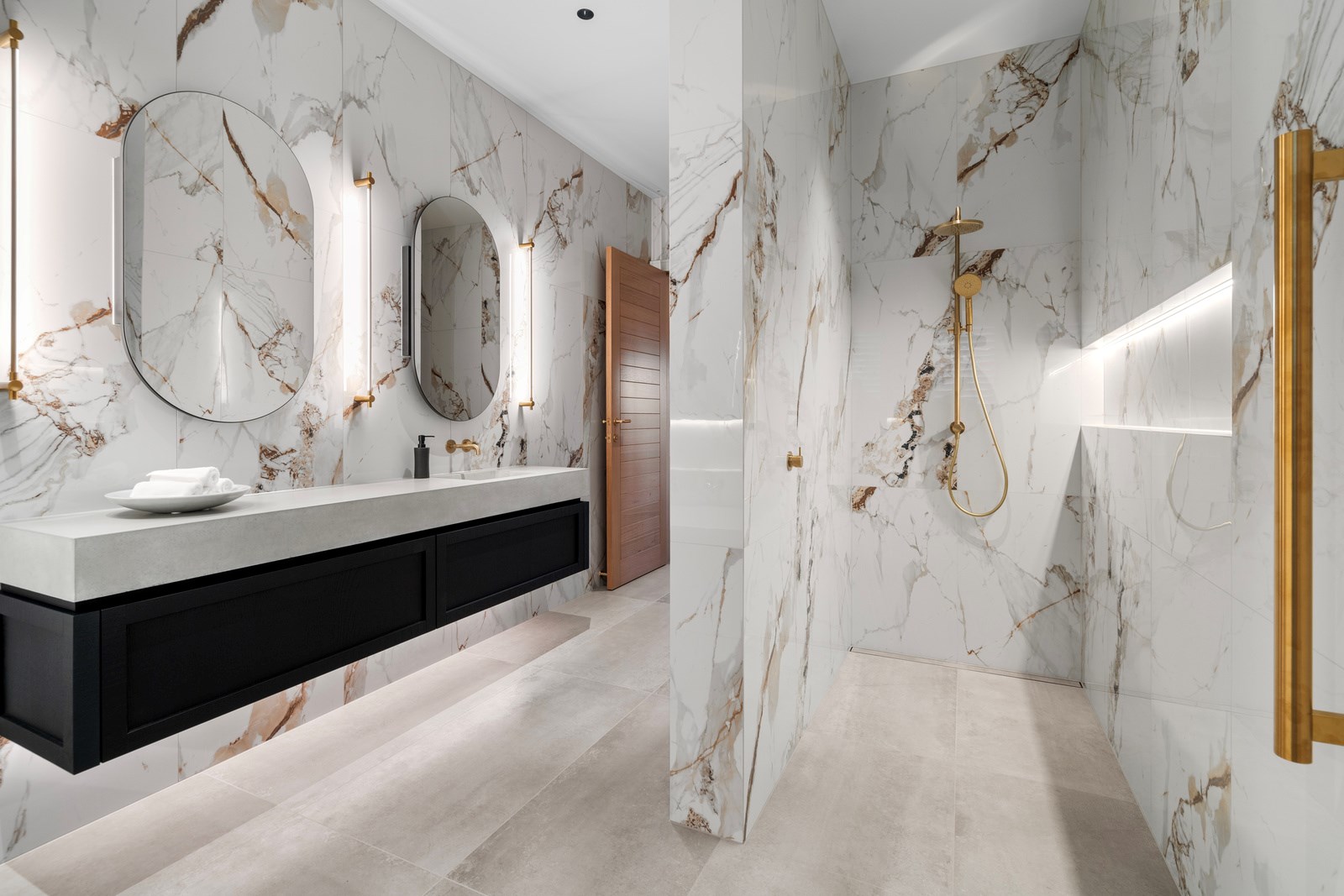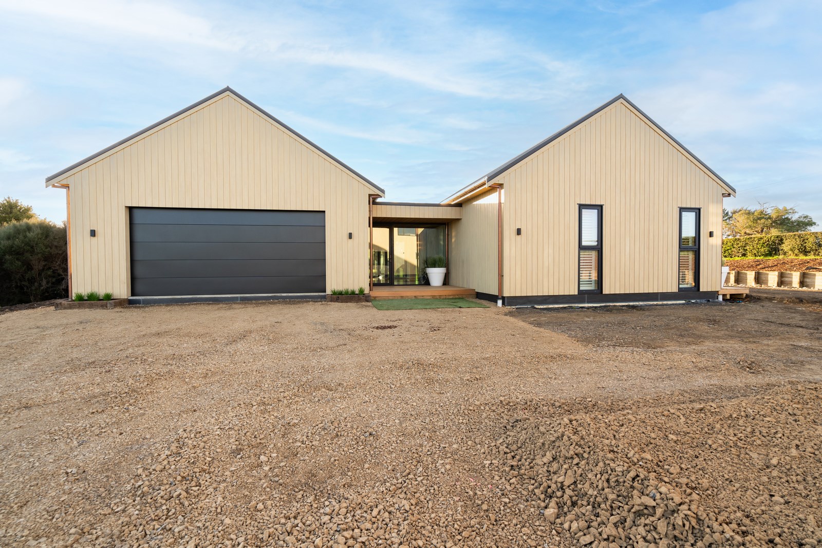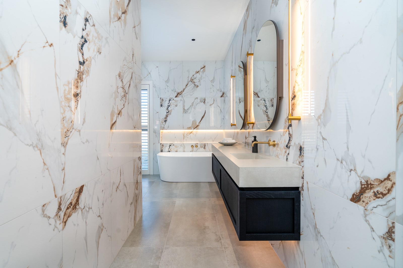 This 445sqm contemporary farmhouse combines luxury, high energy performance, and cutting-edge materials and methods designed for sustainability.  There are three bedrooms, all with en suites, in the three shiplap-clad linked pavilions, including a standalone guest pavilion.  One of the standout features is a canal-like rill water feature that runs along the exterior of the main living pavilion framed by floor-to-ceiling glass. Other exceptional details of the home are polished concrete floors, and a rich palette of Tasmanian oak, reclaimed timber ceilings and charred wood. The open-plan living and dining space is anchored by a striking marble-wrapped kitchen island with oak cabinetry. The living area extends out into a portico over a large deck. Opulent bathrooms feature floor-to-ceiling glazed porcelain tiles, bespoke cabinetry, and brushed brass fittings.