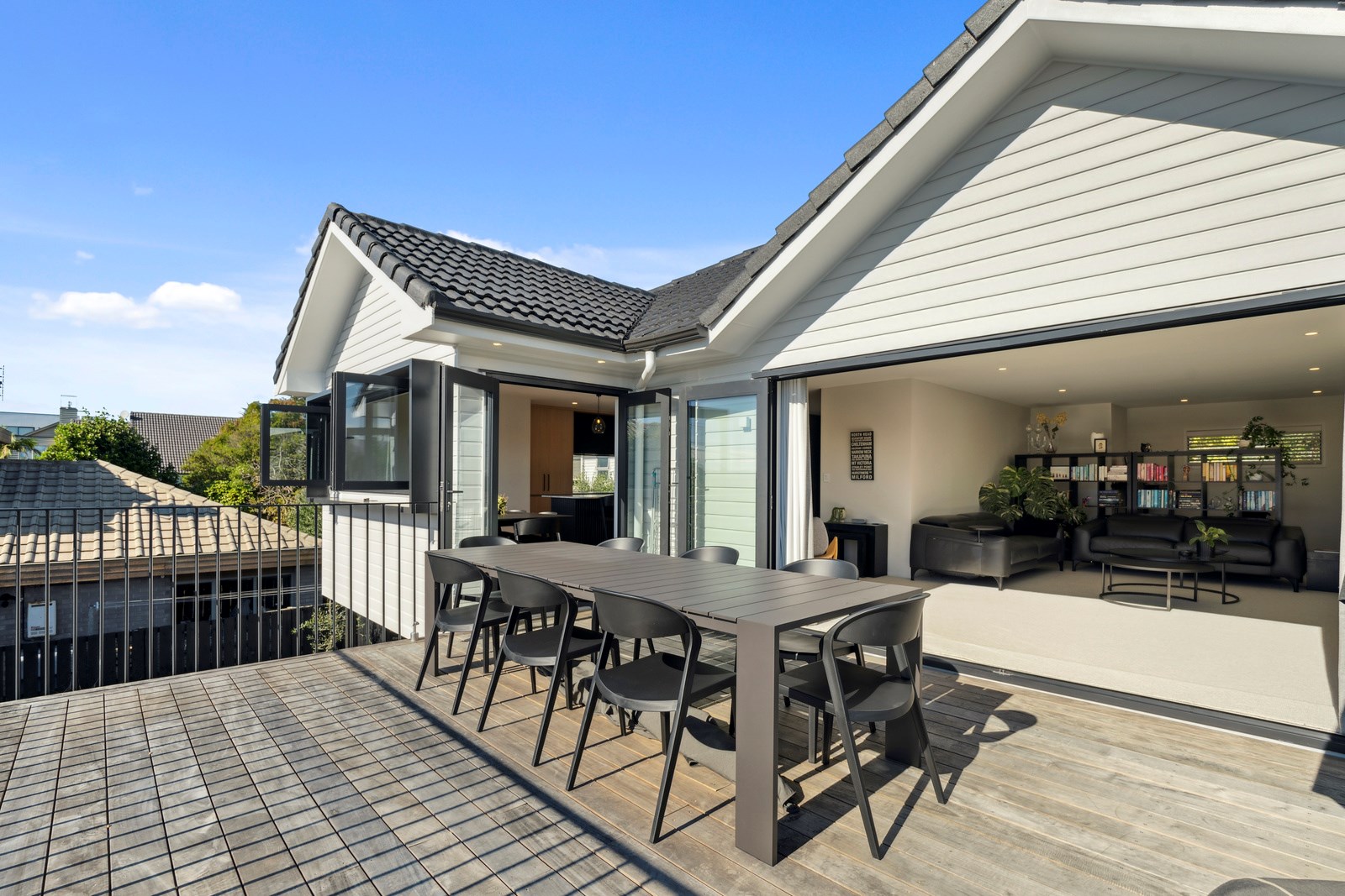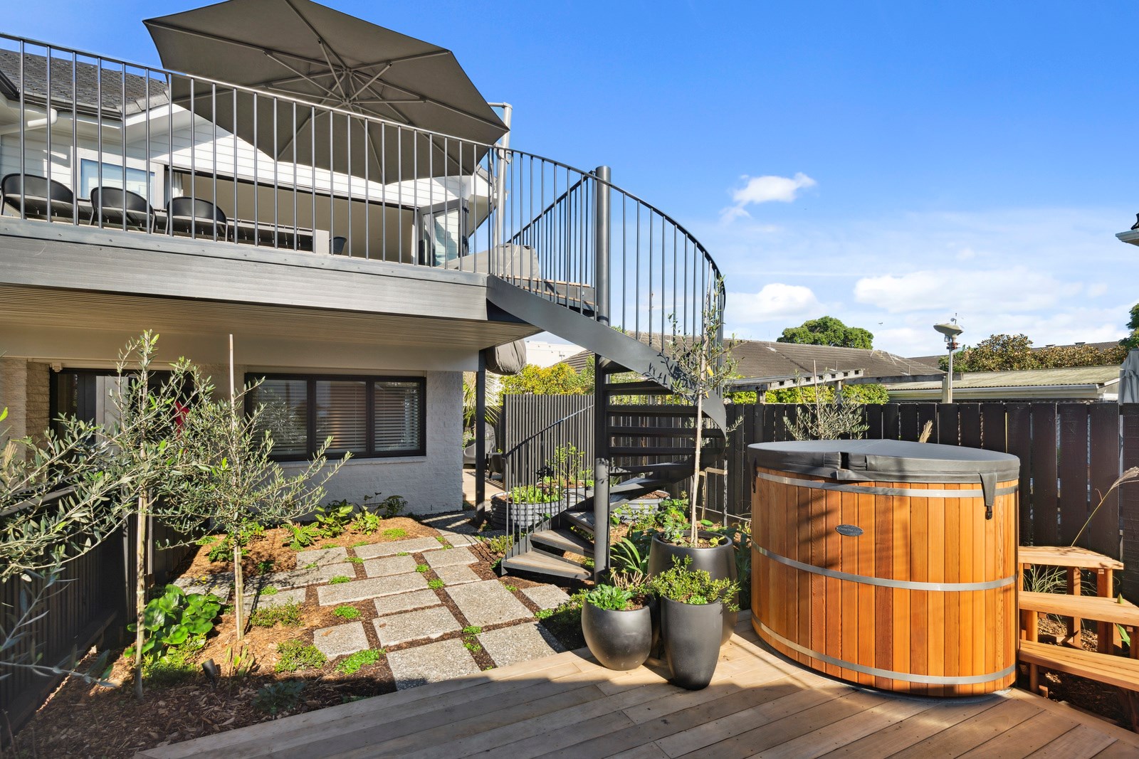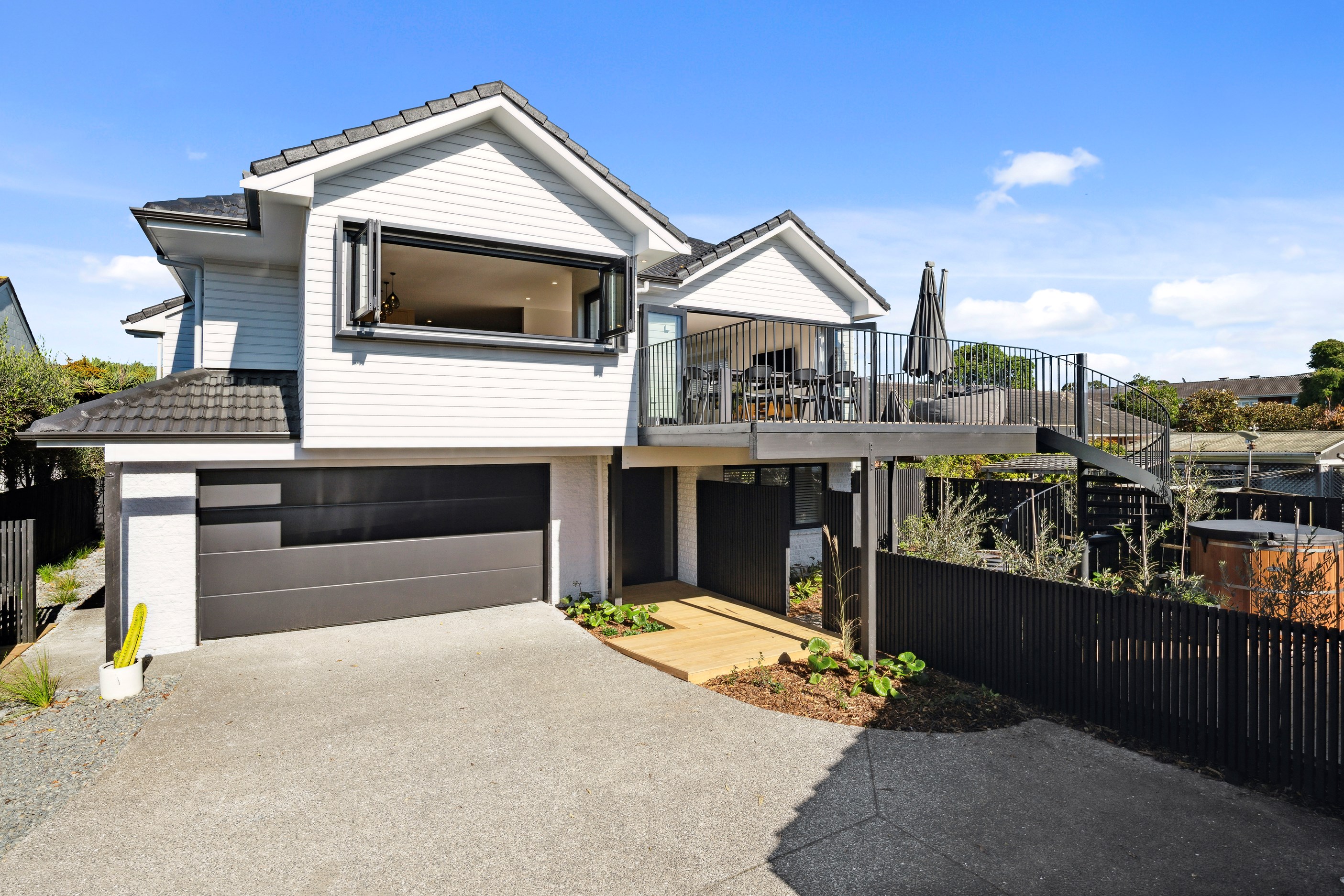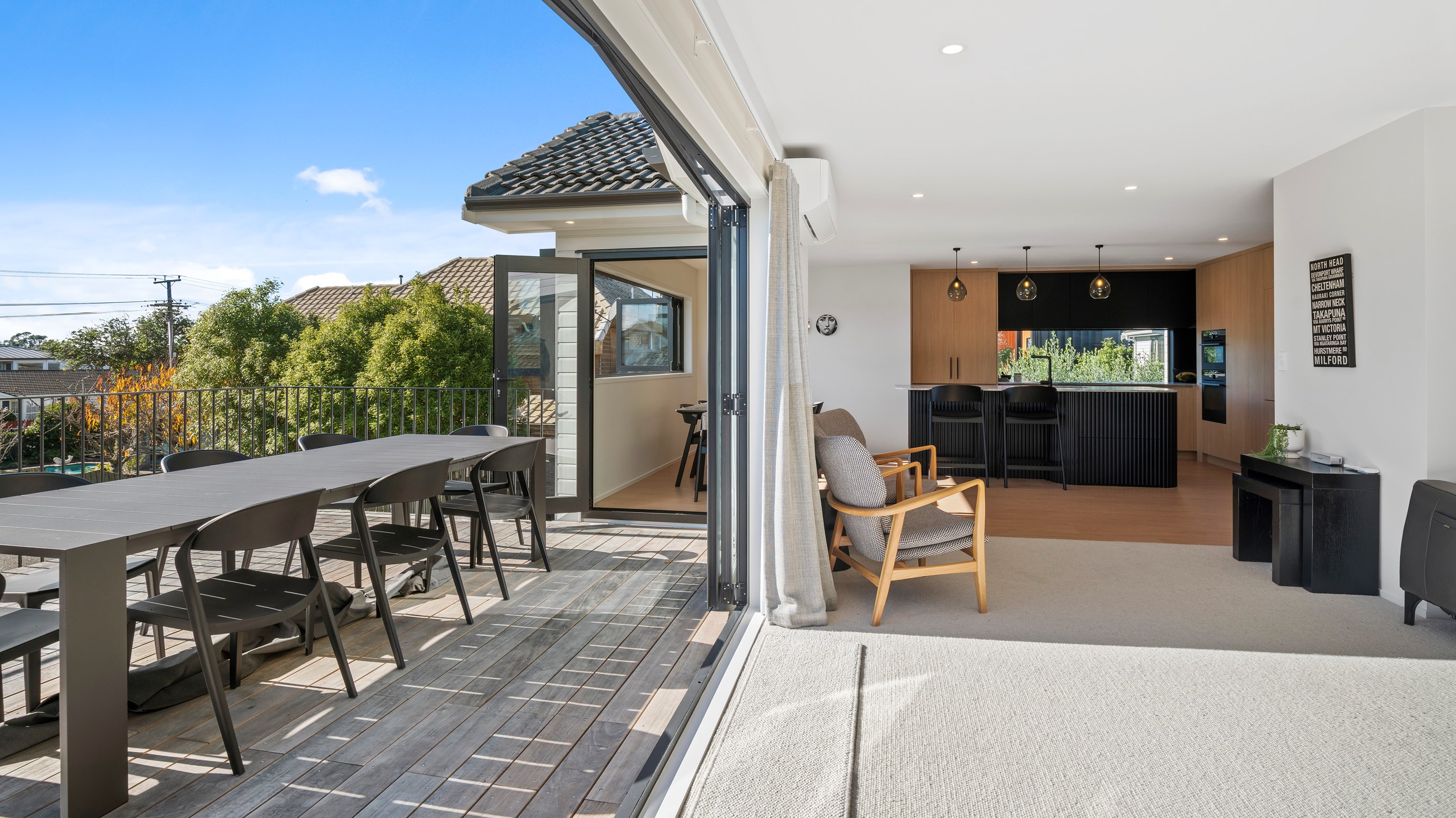 What was once a traditional three-bedroom home with kitchen separate from living, and a small balcony the only connection to the outdoors, has been completely redesigned for modern living with a more open and spacious layout, and contemporary interiors. A highlight is the external spiral staircase that travels from the new, vastly bigger deck that opens off the living area, down to the fenced patio area at ground level. Life now flows from inside to out in the most elegant of ways and panoramic Milford views have been maximised from the deck and through banks of doors and windows in the now open-plan living, kitchen and dining.