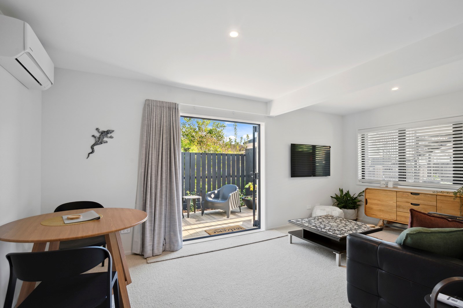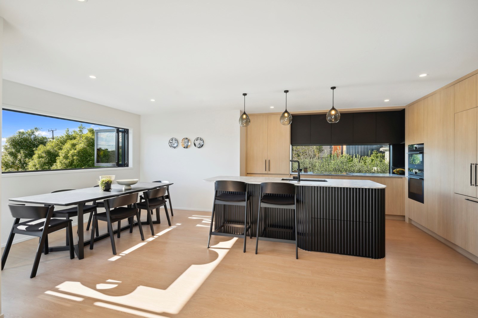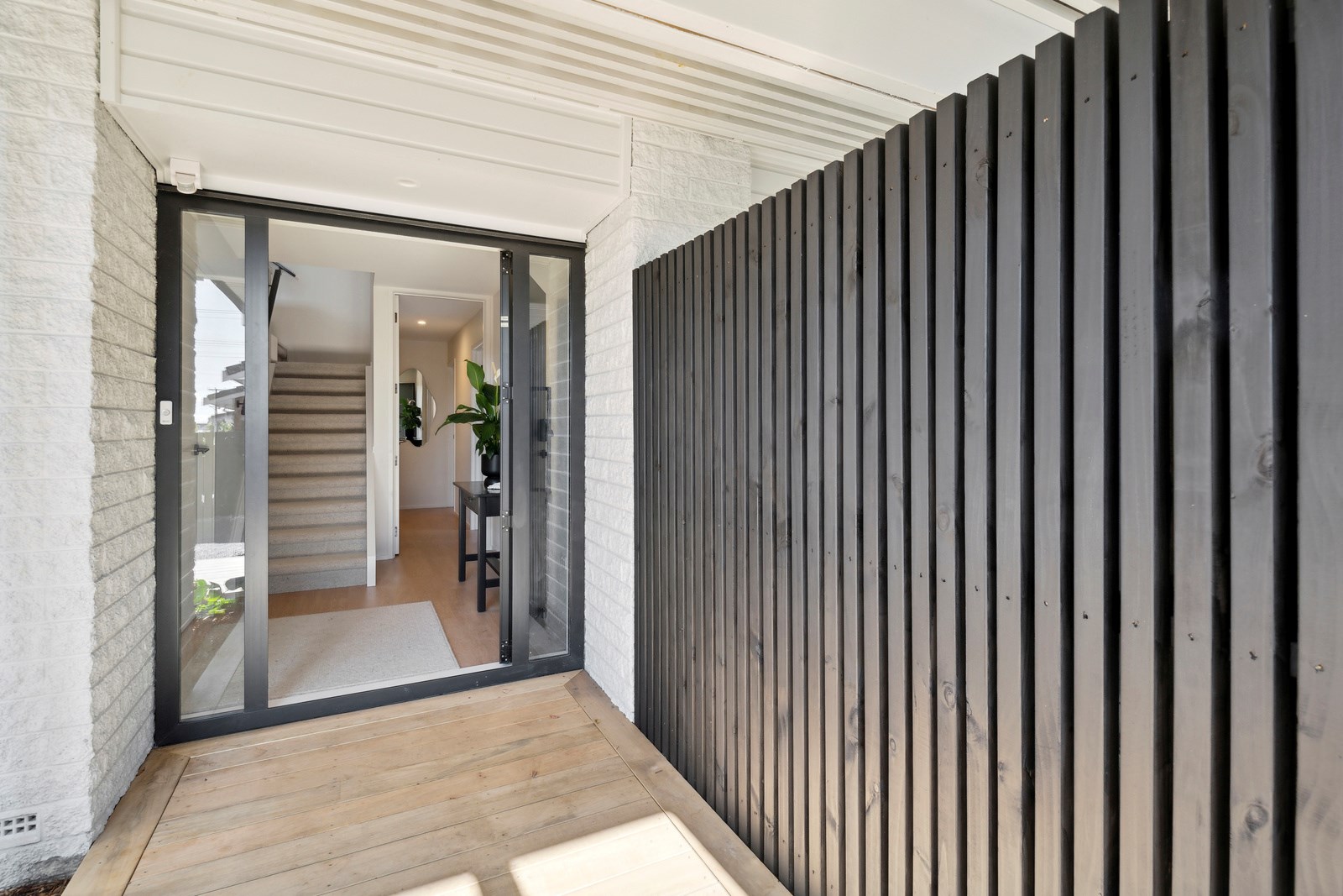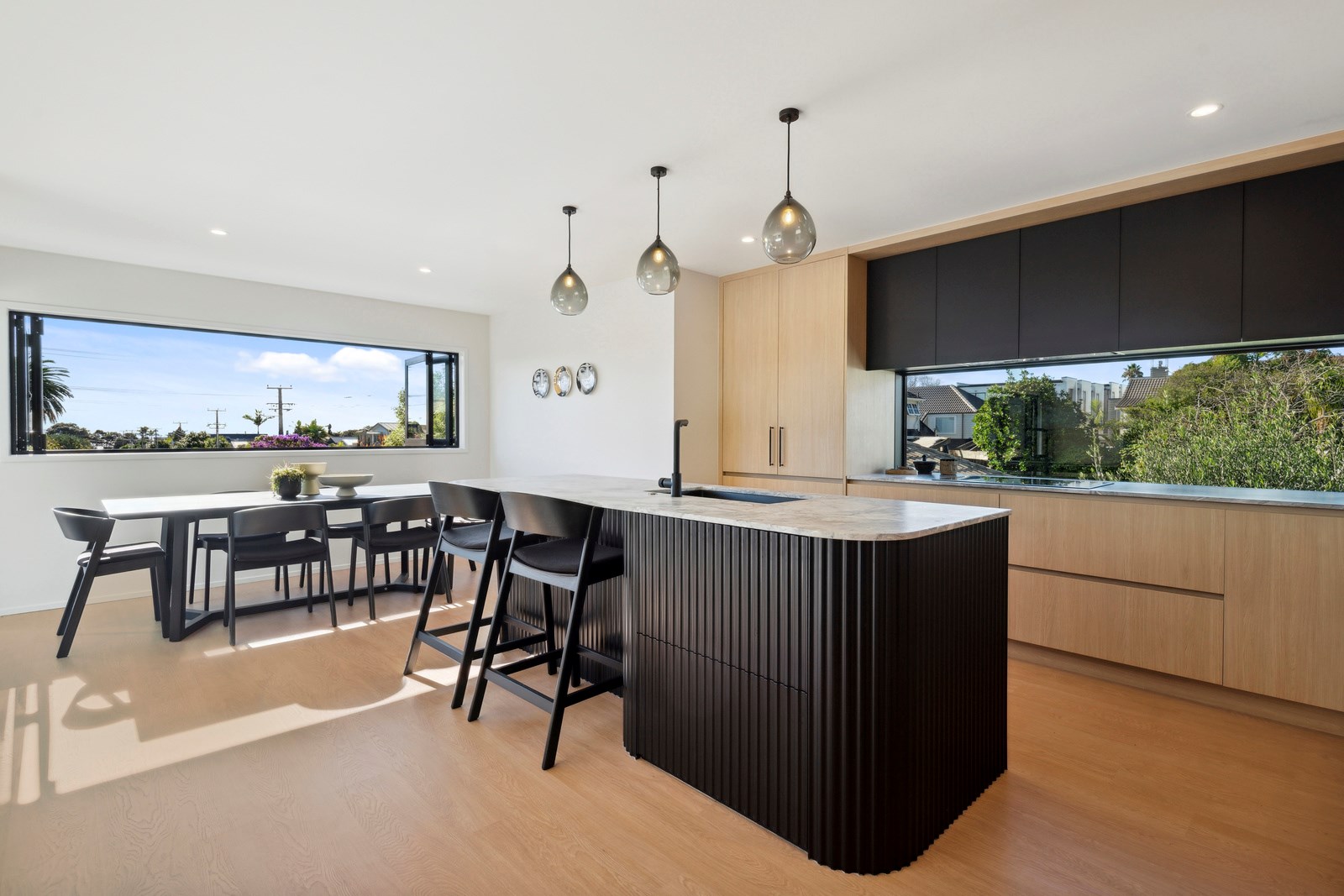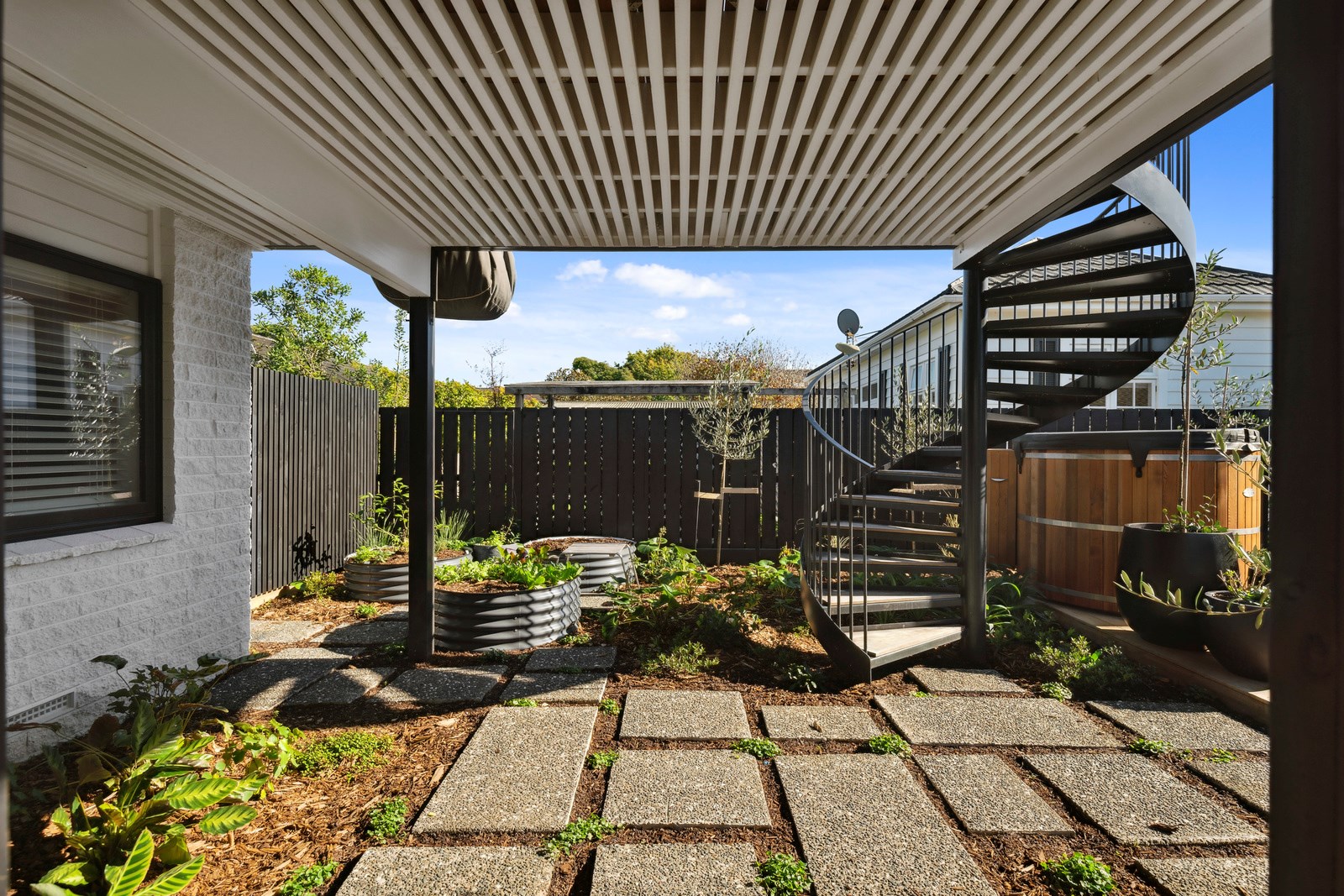 What was once a traditional three-bedroom home with kitchen separate from living, and a small balcony the only connection to the outdoors, has been completely redesigned for modern living with a more open and spacious layout, and contemporary interiors. A highlight is the external spiral staircase that travels from the new, vastly bigger deck that opens off the living area, down to the fenced patio area at ground level. Life now flows from inside to out in the most elegant of ways and panoramic Milford views have been maximised from the deck and through banks of doors and windows in the now open-plan living, kitchen and dining.