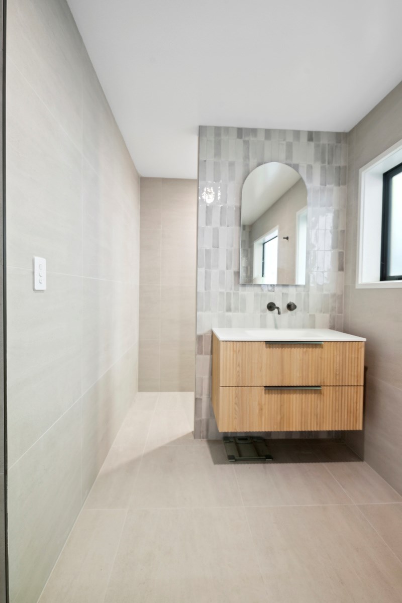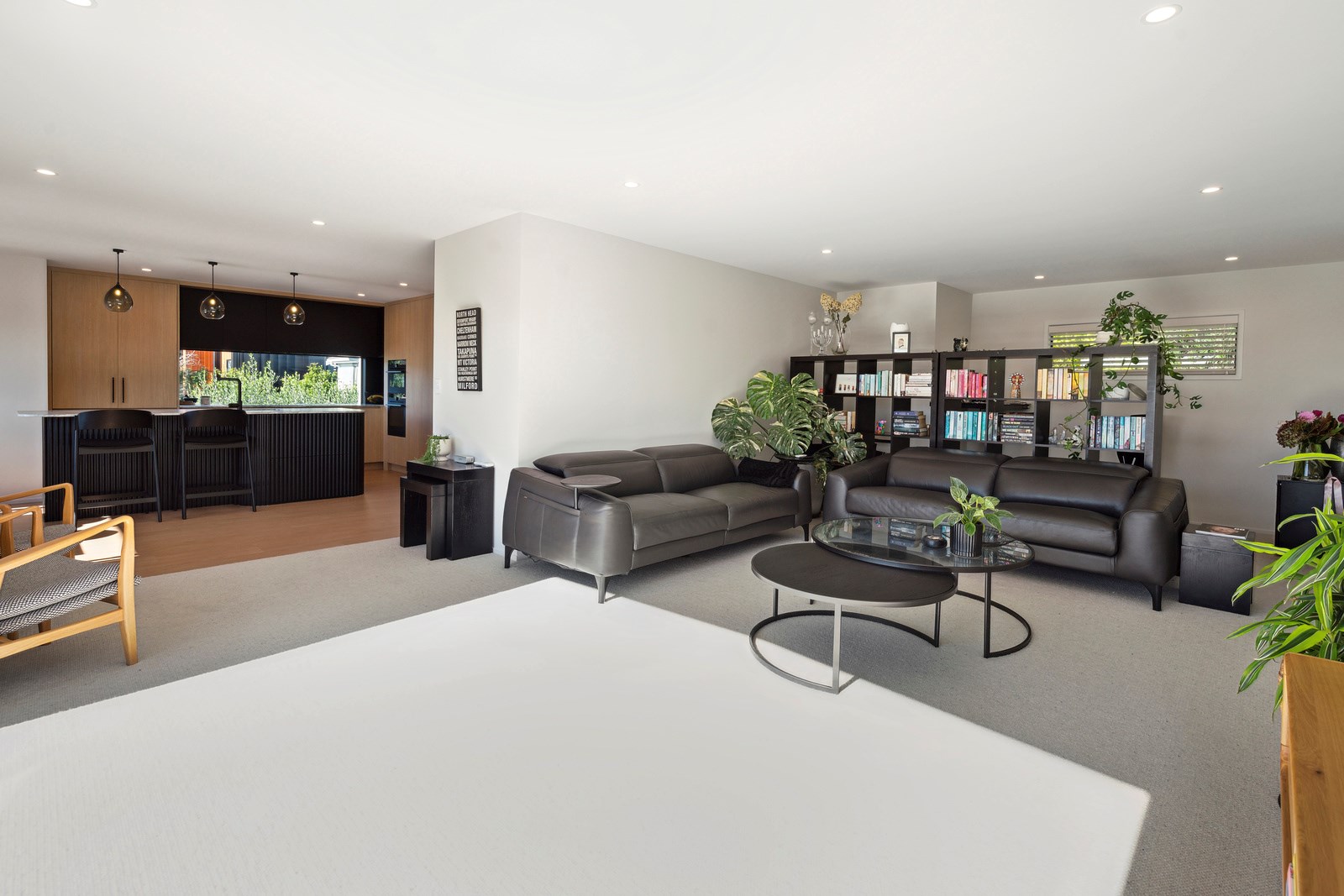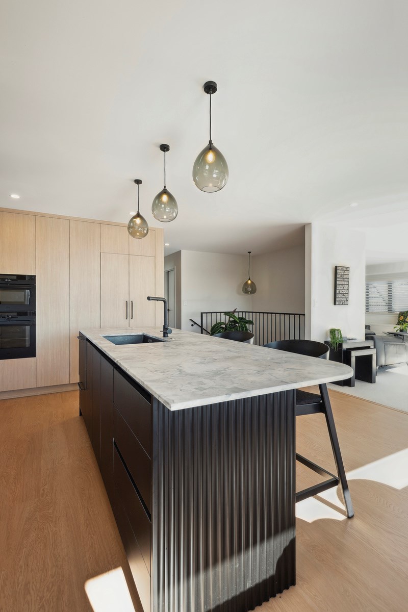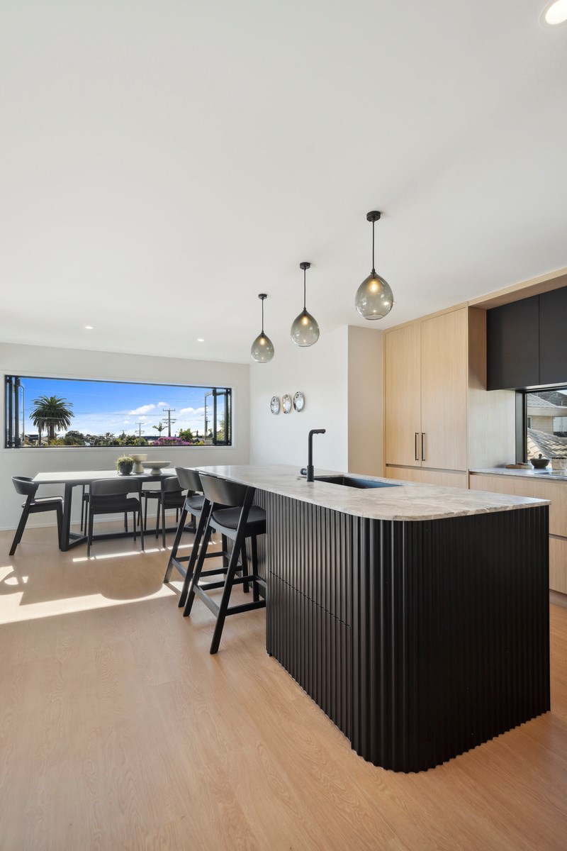 A main suite is also located on the upstairs living level, with two bedrooms, a second living room, bathroom and internal double garaging downstairs. Bathrooms have been given an extra luxurious and spa-like feel with walk-in showers and soothing colour palettes. The kitchen is modern and minimalist with contrasting light and dark cabinetry, and stone benchtops. A long rectangular window forms a splashback with a view. The house has a cosy, inviting atmosphere that was previously lacking. Luxury blends with functionality to deliver a sanctuary where the owners can relax and fully embrace coastal living.