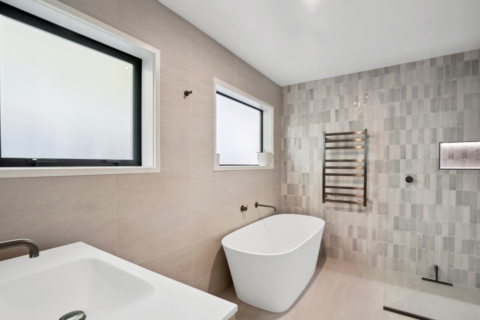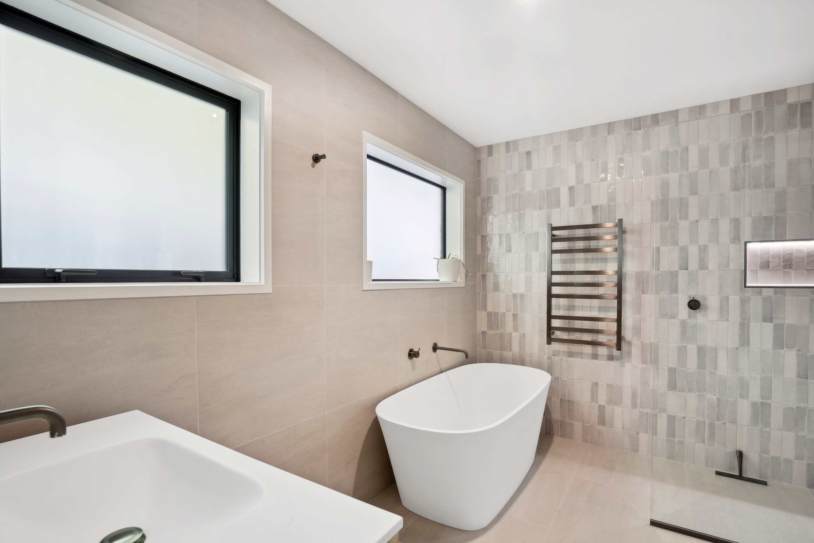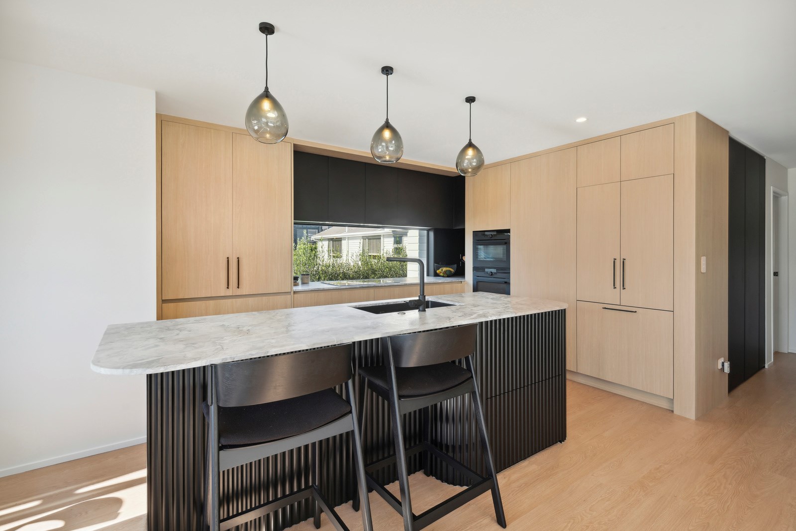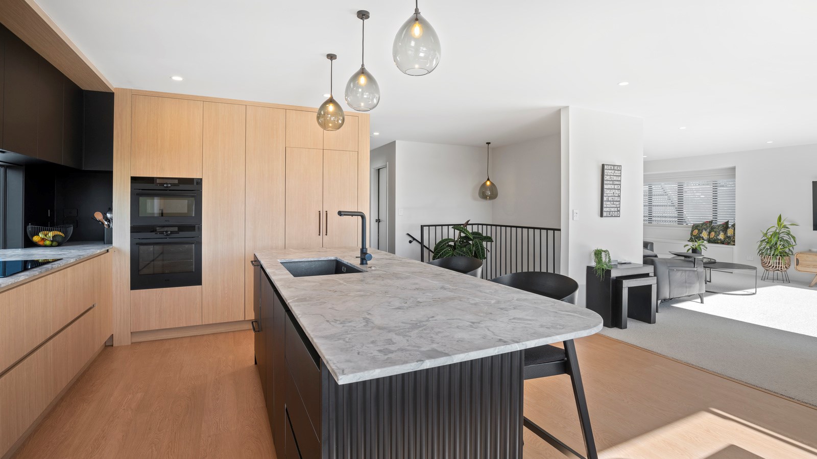 A main suite is also located on the upstairs living level, with two bedrooms, a second living room, bathroom and internal double garaging downstairs. Bathrooms have been given an extra luxurious and spa-like feel with walk-in showers and soothing colour palettes. The kitchen is modern and minimalist with contrasting light and dark cabinetry, and stone benchtops. A long rectangular window forms a splashback with a view. The house has a cosy, inviting atmosphere that was previously lacking. Luxury blends with functionality to deliver a sanctuary where the owners can relax and fully embrace coastal living.