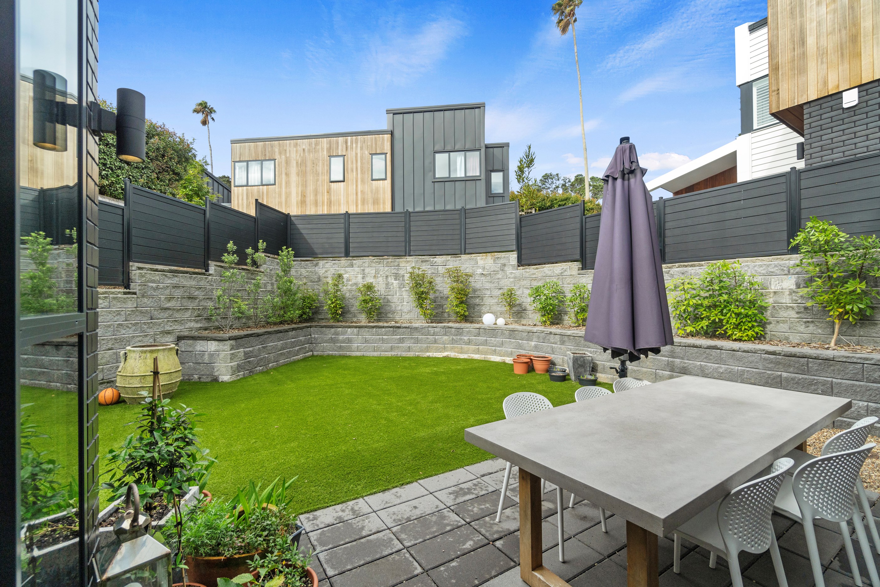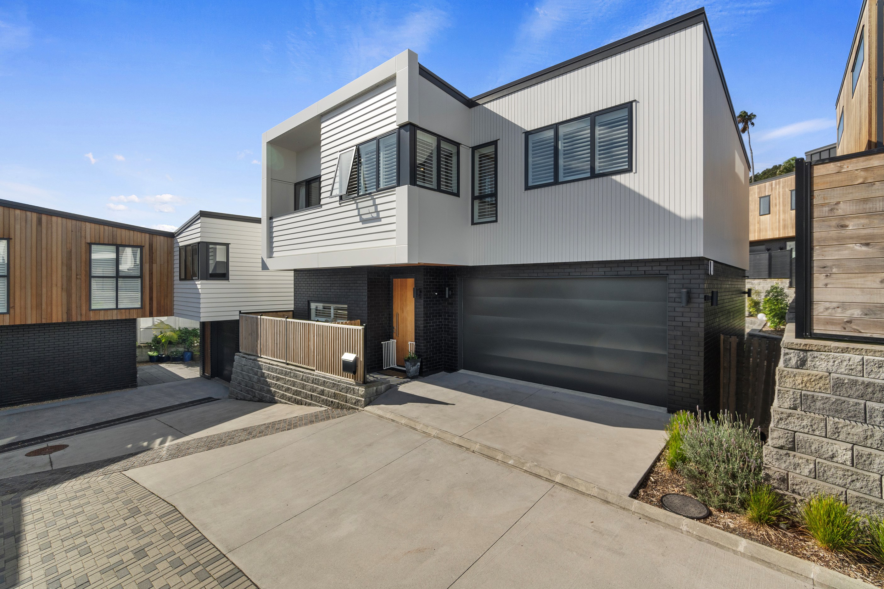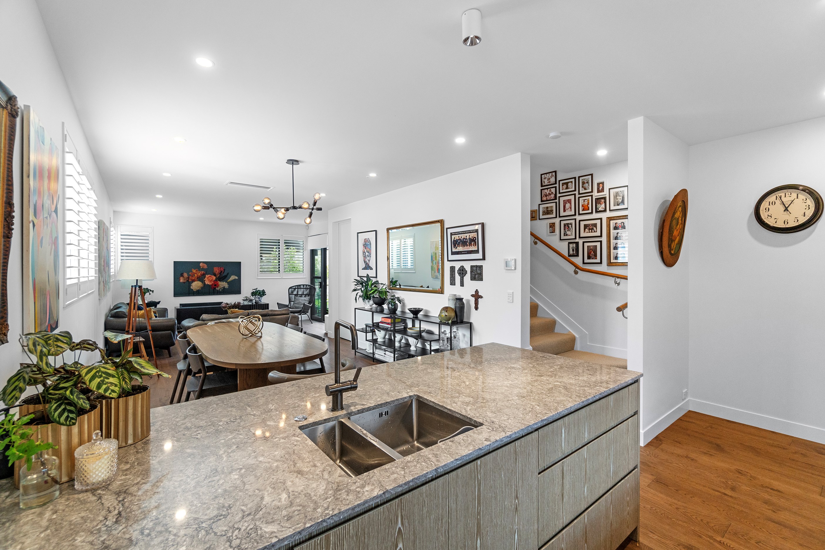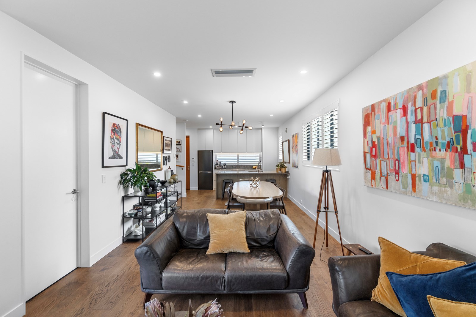 This is where panache meets practical, where form meets function – and it’s all in a 181sqm package in a smart contemporary village. The four-bedroom, two-bathroom townhouse offers the residents space, light and designer details that give the architectural home its identity. A white interior also provides the owners with a neutral backdrop on which to stamp their own mark. But let’s start at the dapper exterior where contrasting lines and textures provide immediate appeal and pique the interest. Dark brick, light-coloured vertical and horizontal timber weatherboards and Espan coloured-steel cladding set the scene. Dark joinery merges into dark cladding and pops from the light. Step through the front door to find a long open-plan space full of light and connected to a patio and lawn.