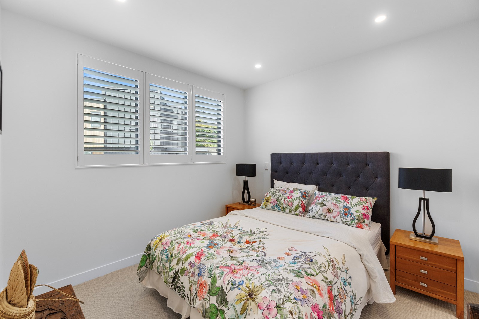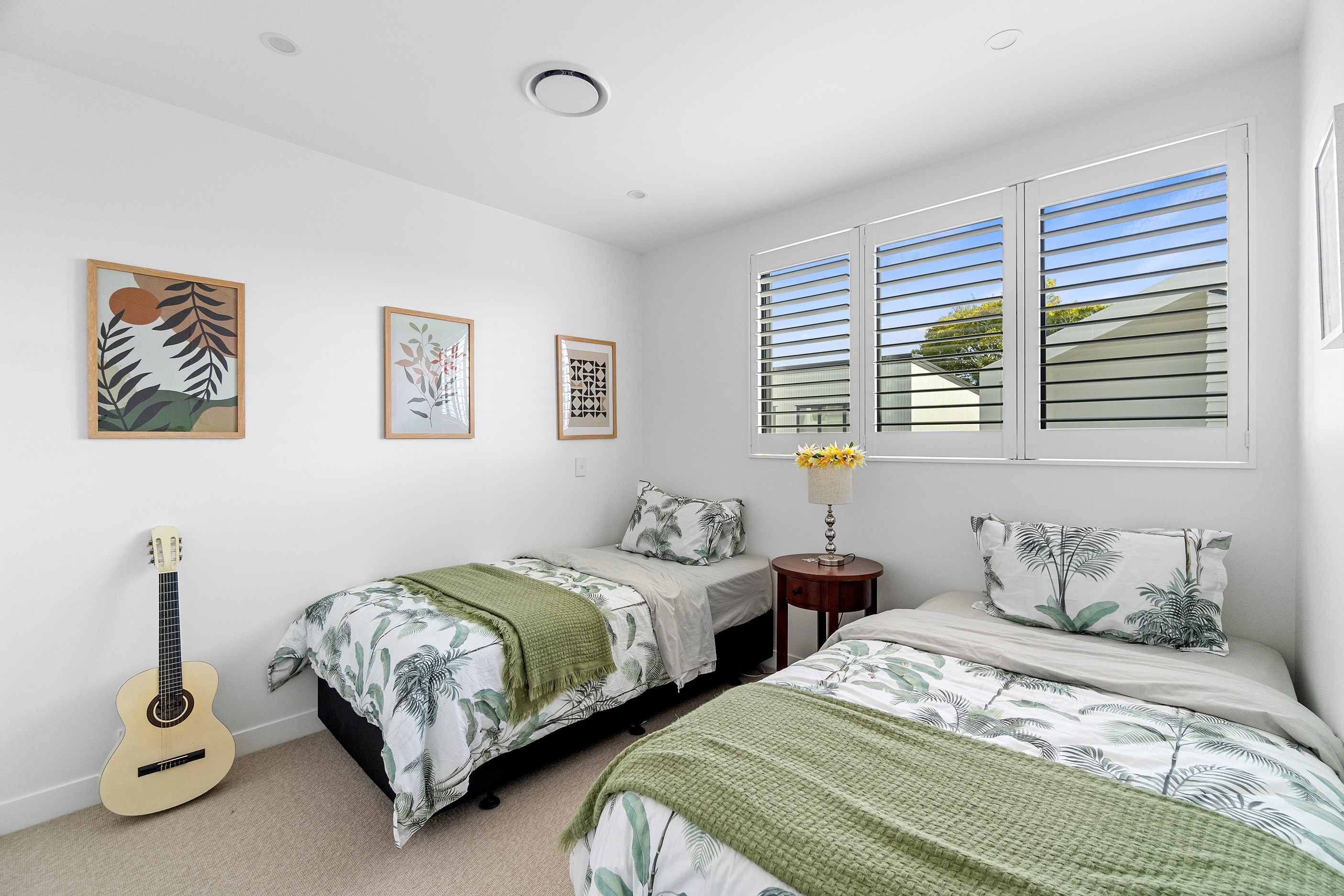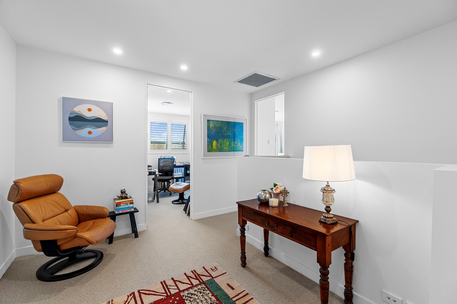 At one end is the elegant kitchen with marble island benchtop and wow-factor light fixture over the dining space. White shutters provide privacy, there’s a handy powder room on this floor, and internal access to the garage, too. On the upper level are the four bedrooms, including the spacious main-bedroom suite with ensuite, walk-in dressing room and access to its own balcony. You’ll also find a family bathroom with tiles and a study space. More white shutters add to the smart, airy vibe of the house.