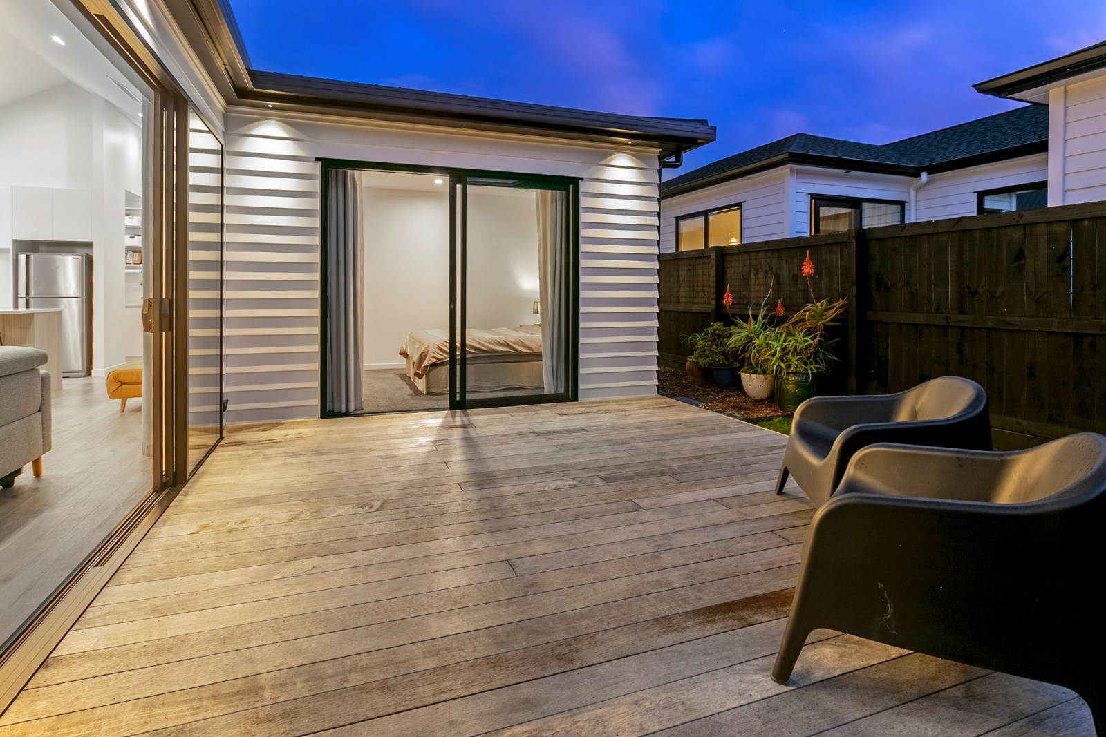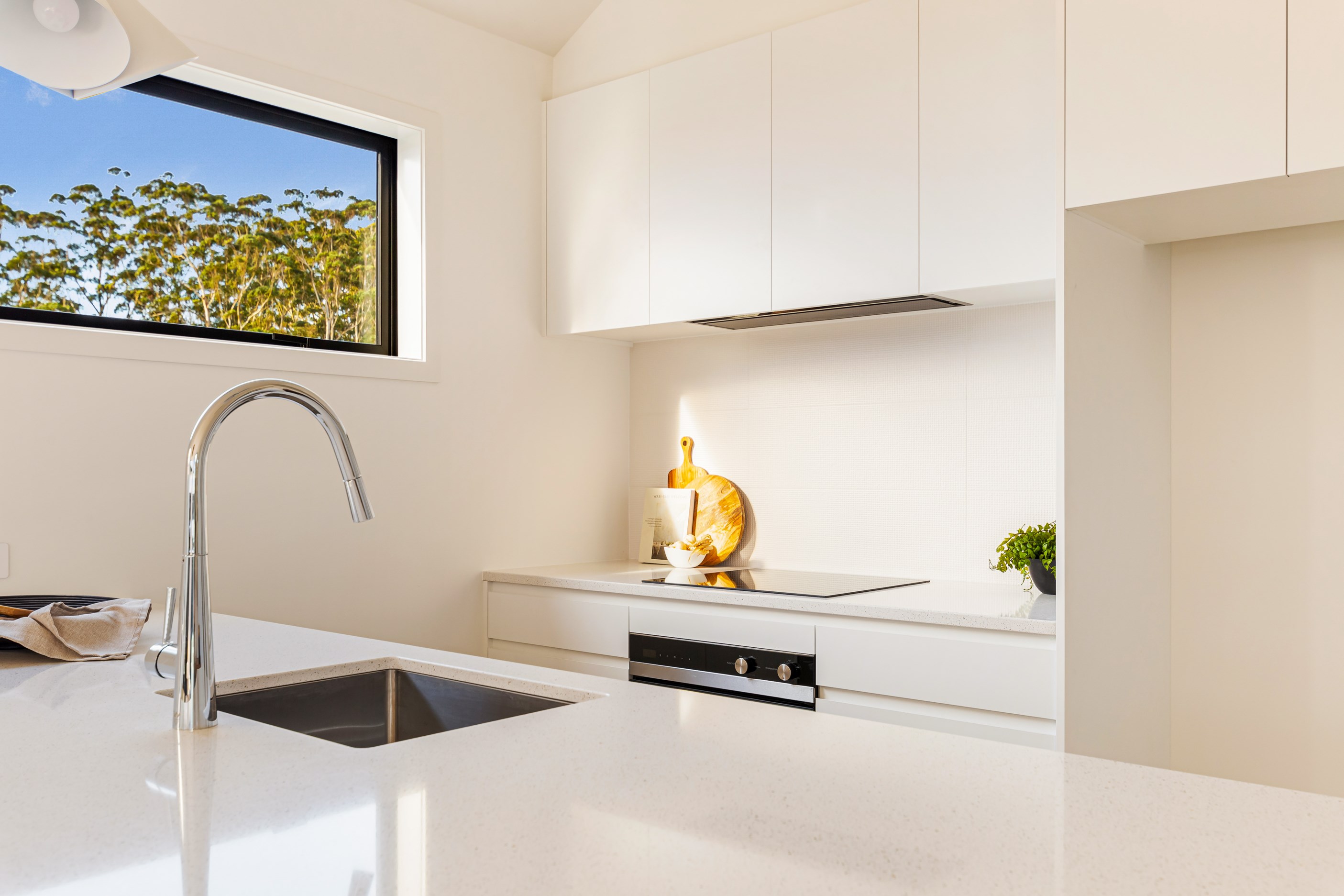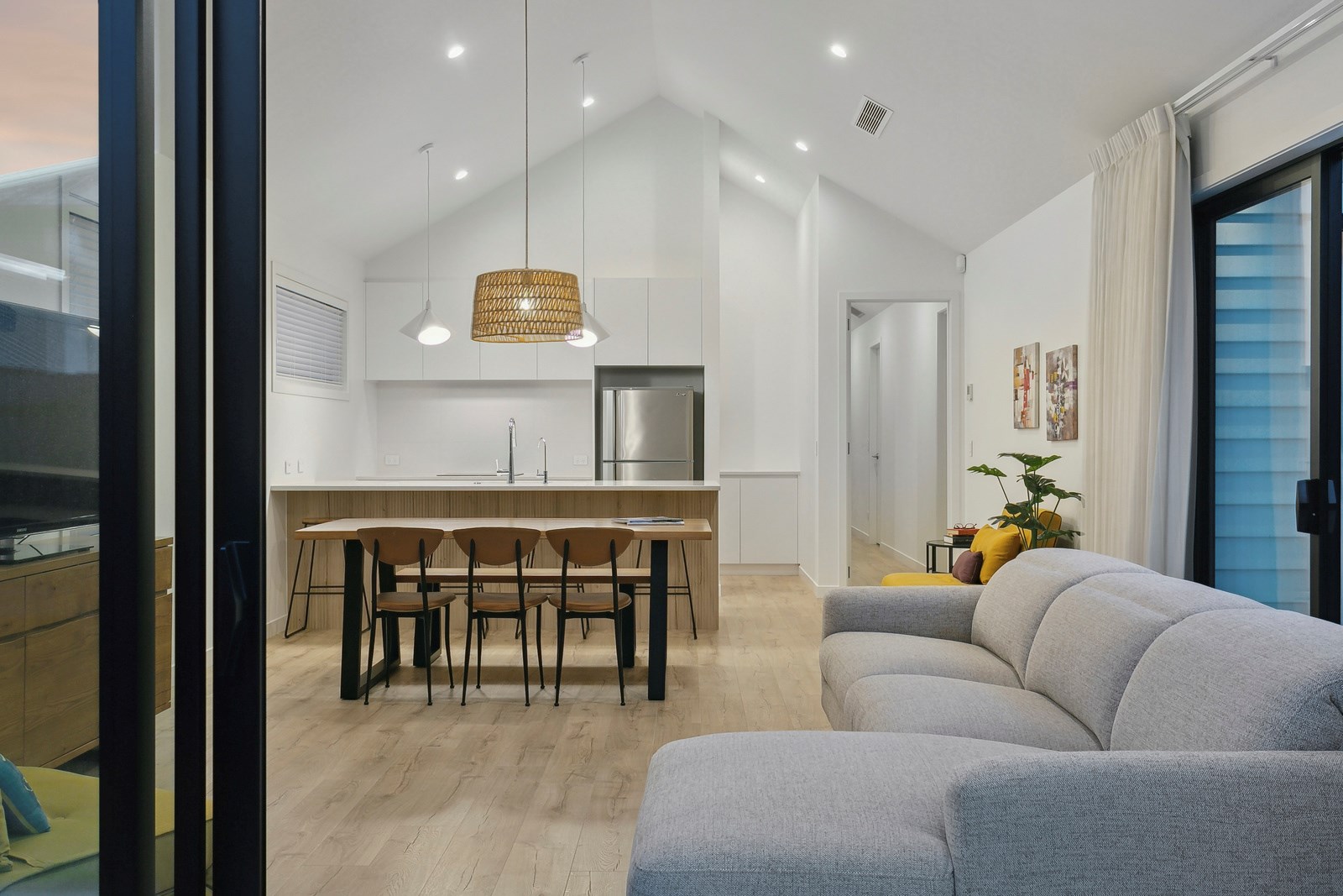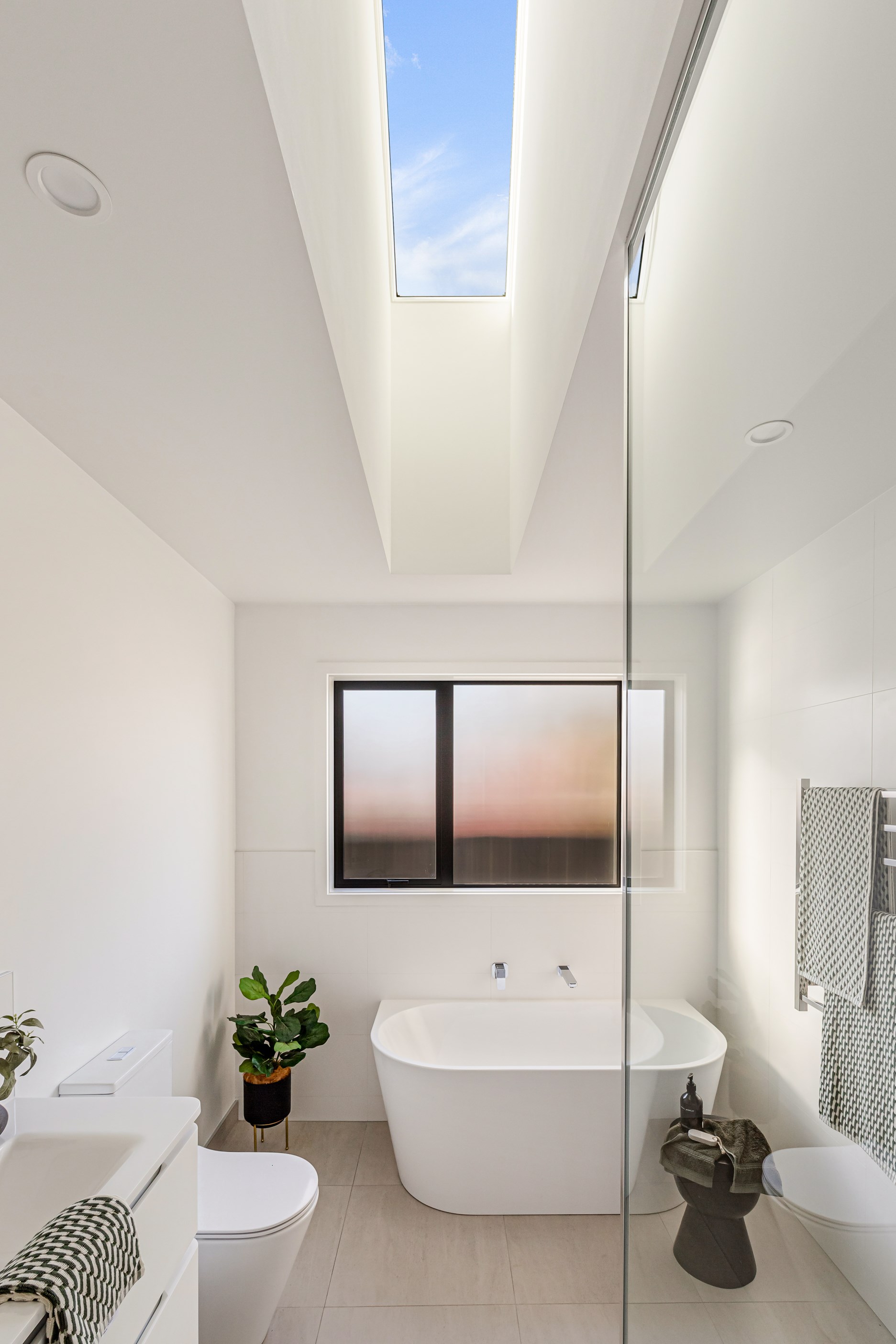 Sliders that run along two walls invite in natural light that further illuminates the airy space. These doors open directly onto north-facing timber decking encouraging alfresco dining and entertaining. The main bedroom, with walk-in wardrobe and ensuite, also has sliding doors onto a deck. Morning coffee and bagels, anyone? There’s a bathroom with a standalone bath and skylight, oversized single-car garage and separate laundry with a full-height linen cupboard and lots of shelving. It’s all polished and supremely practical.