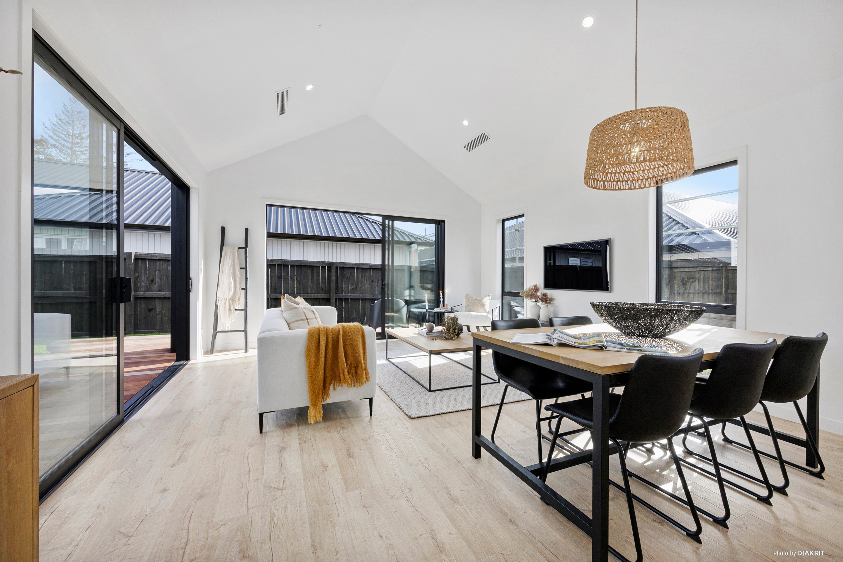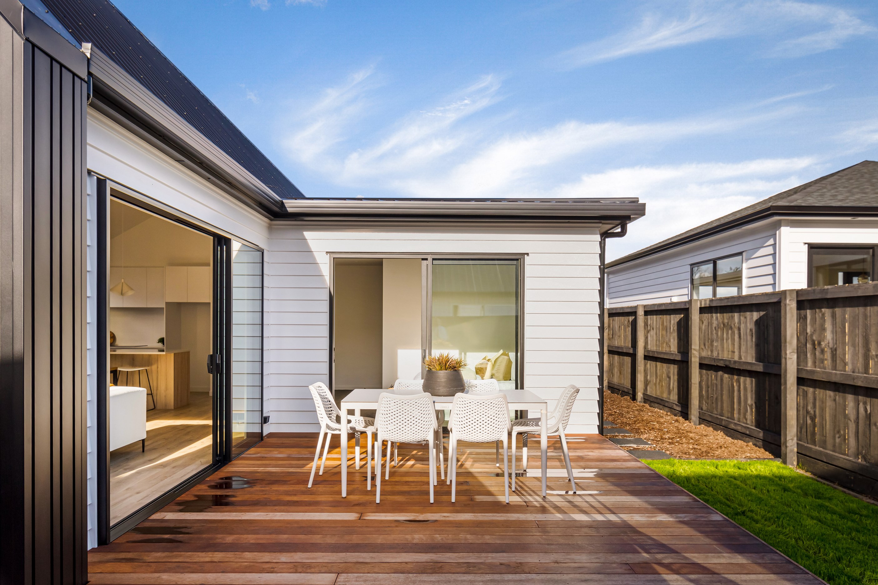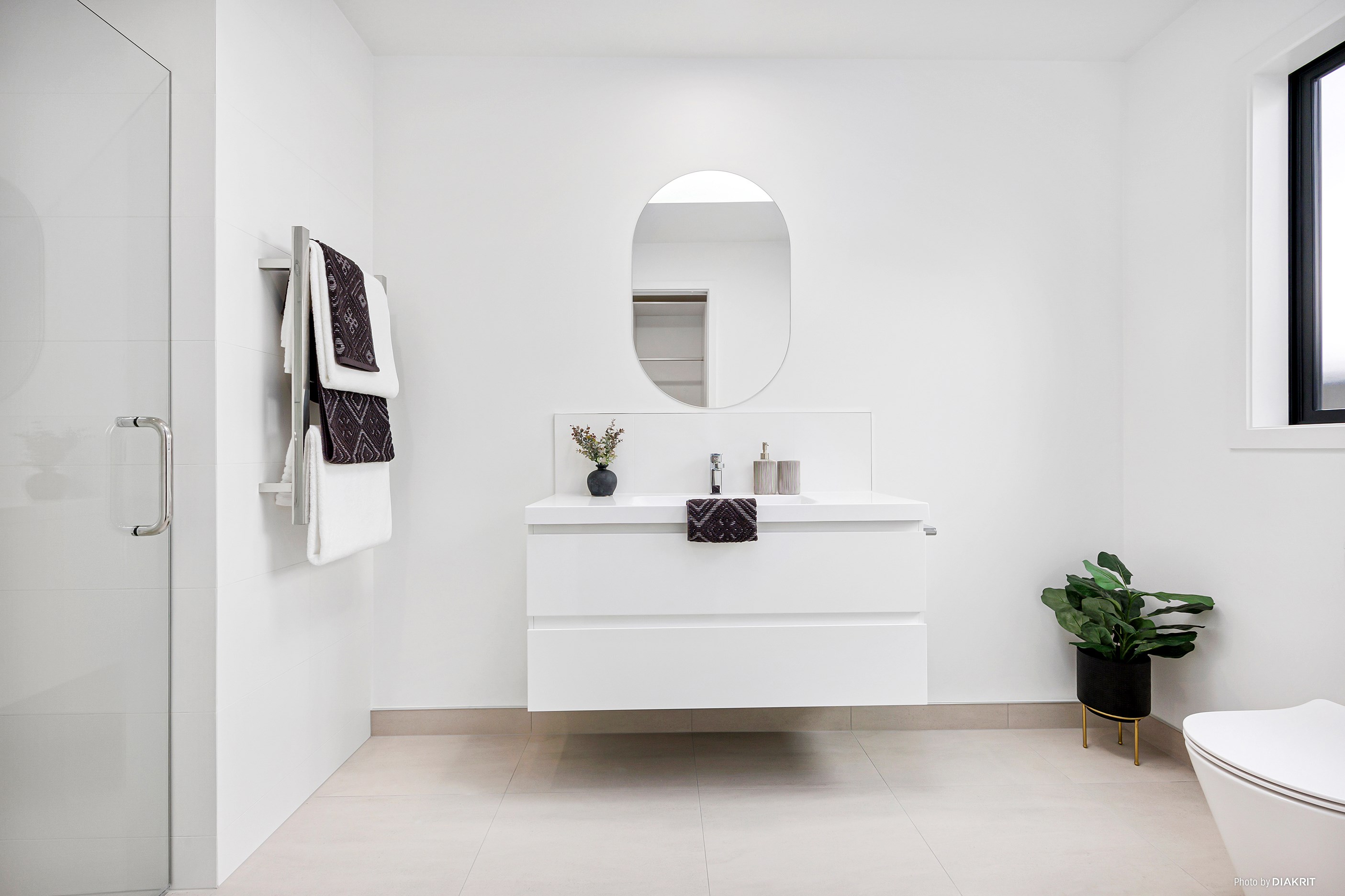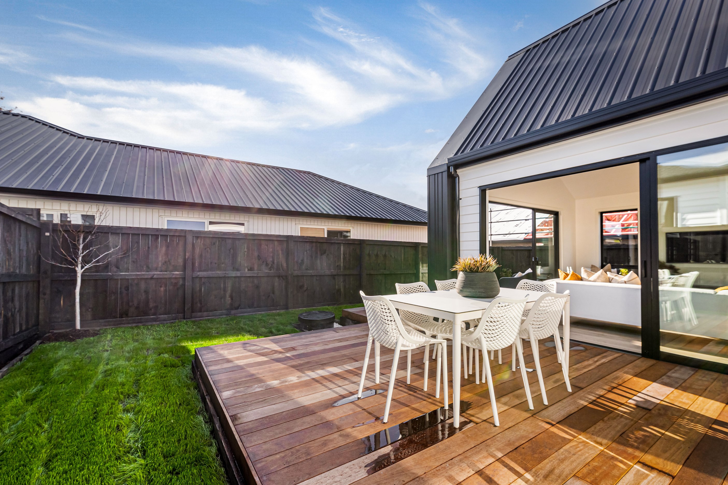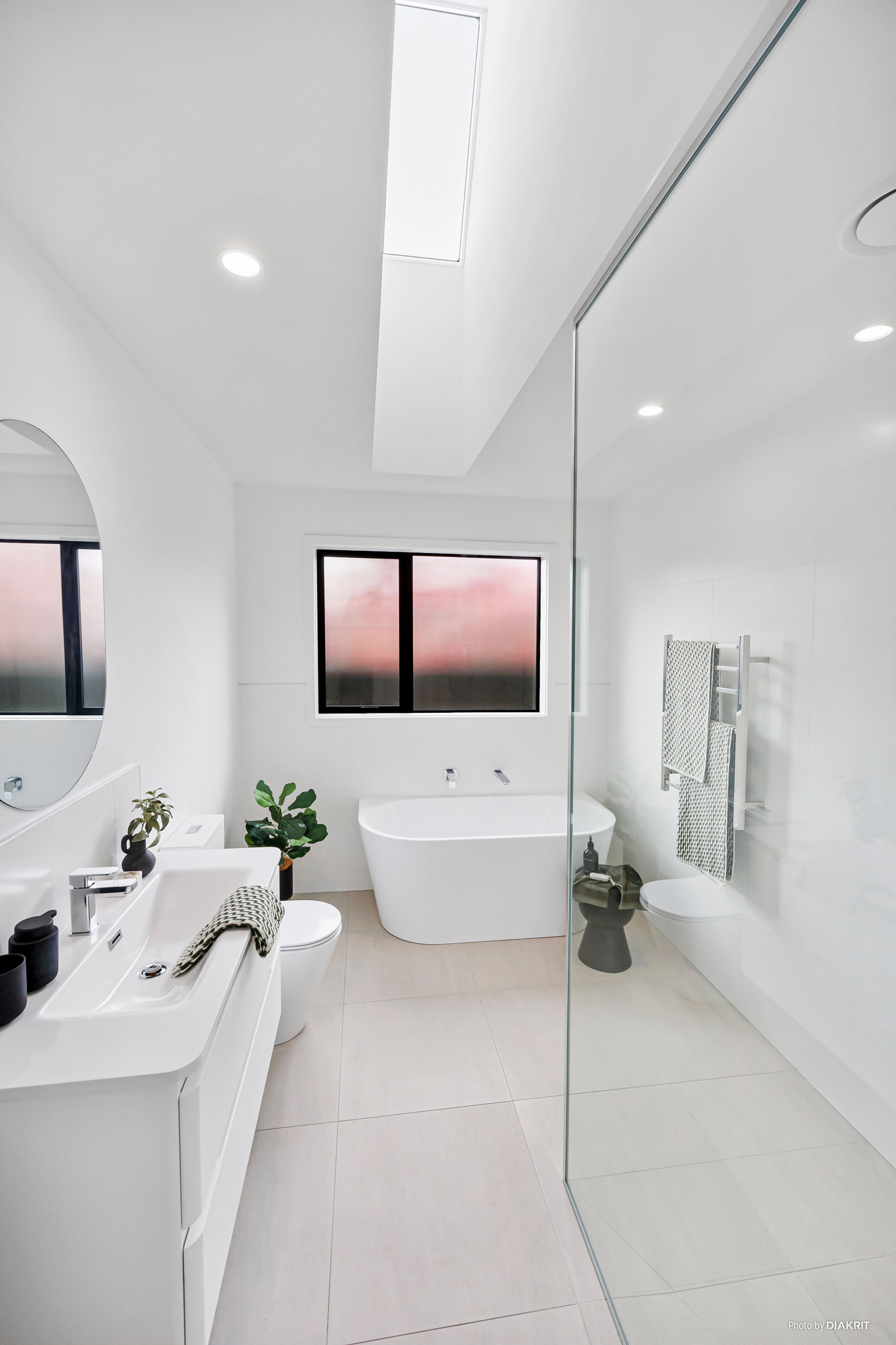 Sliders that run along two walls invite in natural light that further illuminates the airy space. These doors open directly onto north-facing timber decking encouraging alfresco dining and entertaining. The main bedroom, with walk-in wardrobe and ensuite, also has sliding doors onto a deck. Morning coffee and bagels, anyone? There’s a bathroom with a standalone bath and skylight, oversized single-car garage and separate laundry with a full-height linen cupboard and lots of shelving. It’s all polished and supremely practical.