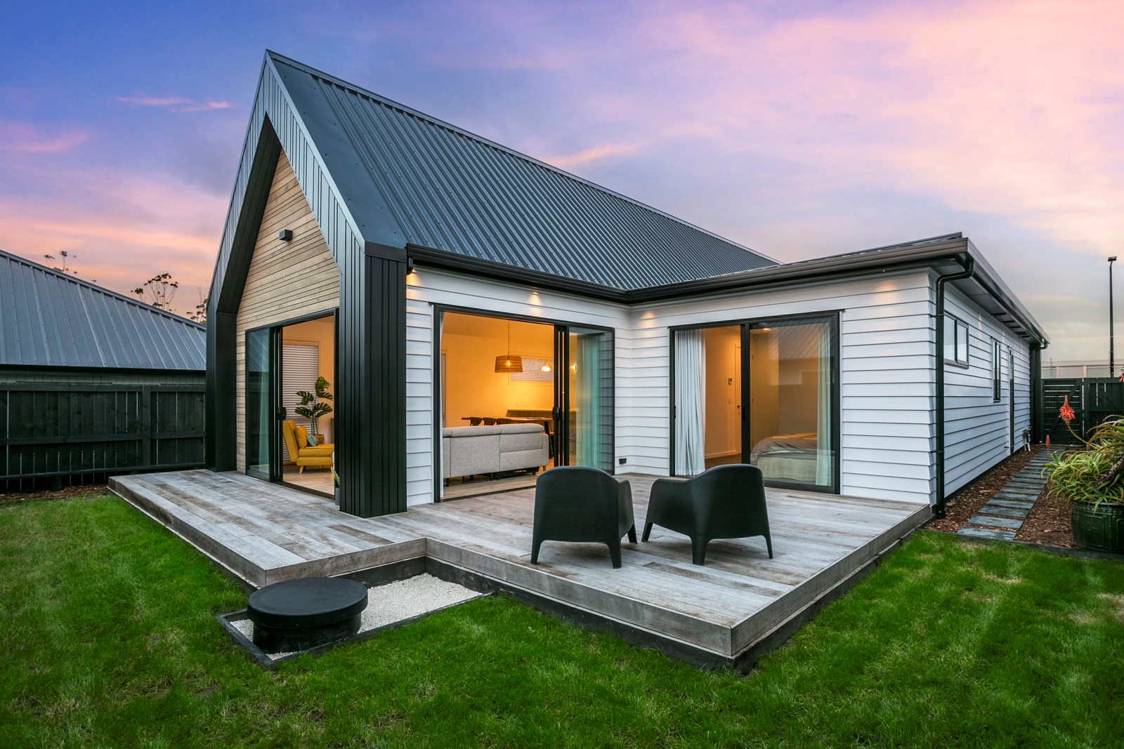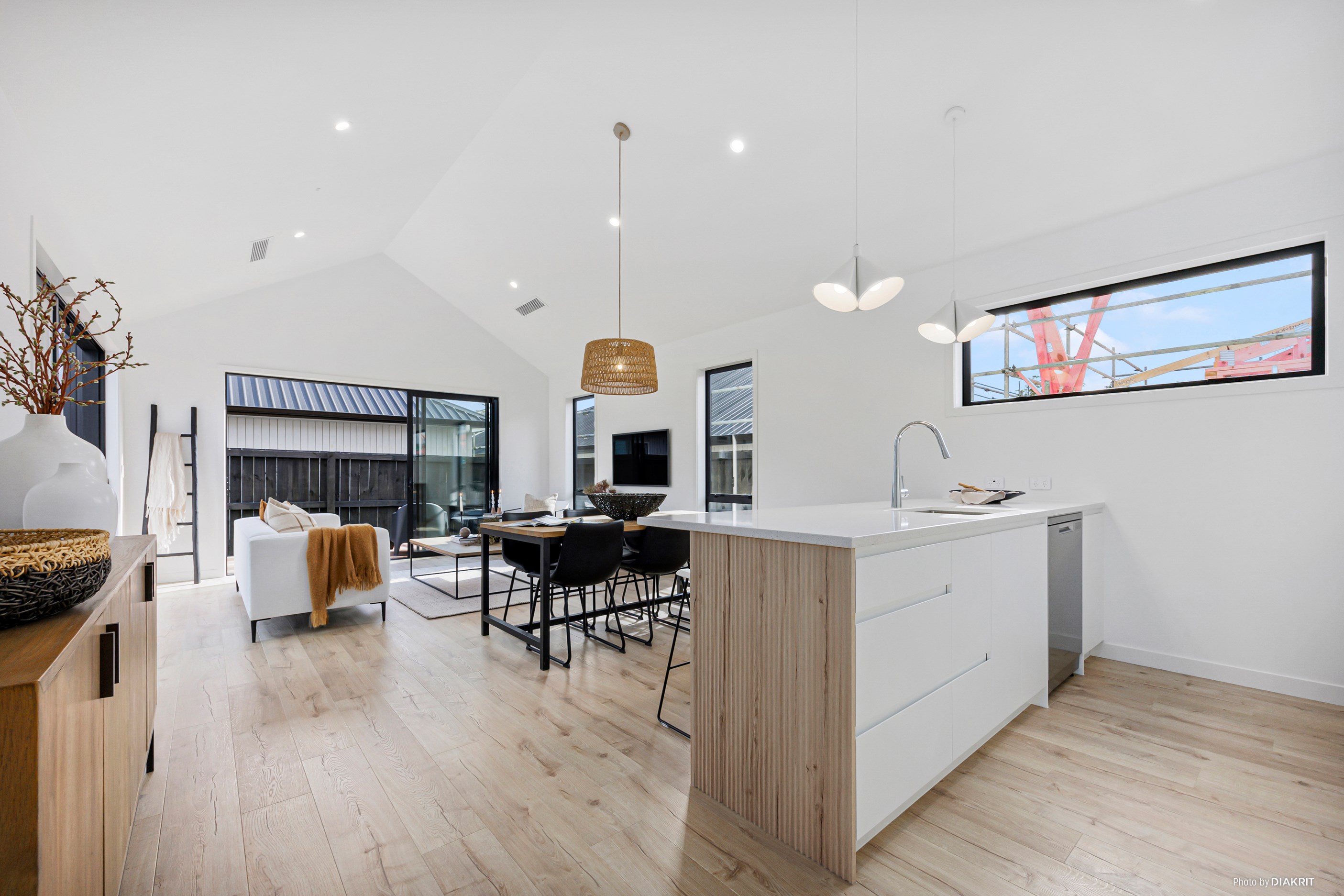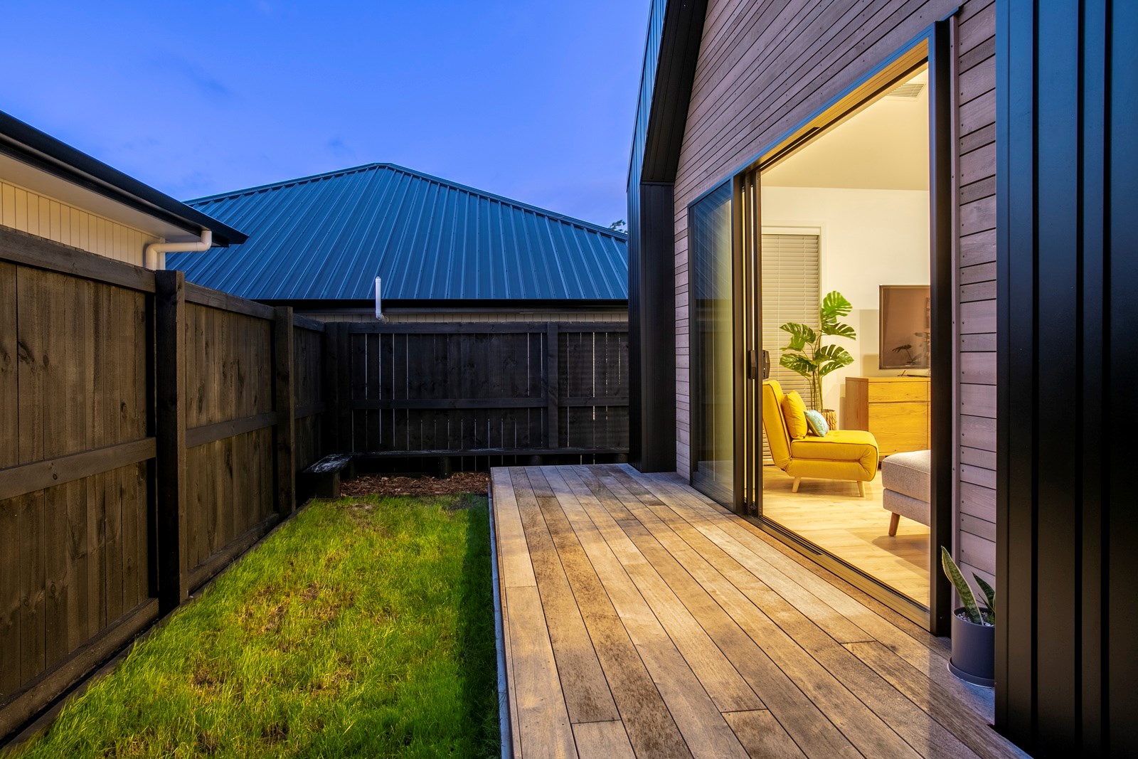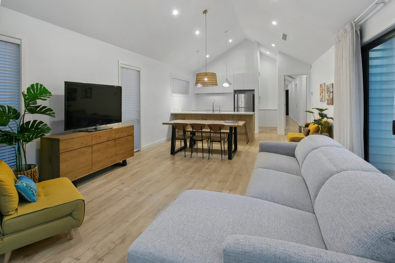Sliders that run along two walls invite in natural light that further illuminates the airy space. These doors open directly onto north-facing timber decking encouraging alfresco dining and entertaining. The main bedroom, with walk-in wardrobe and ensuite, also has sliding doors onto a deck. Morning coffee and bagels, anyone? There’s a bathroom with a standalone bath and skylight, oversized single-car garage and separate laundry with a full-height linen cupboard and lots of shelving. It’s all polished and supremely practical.