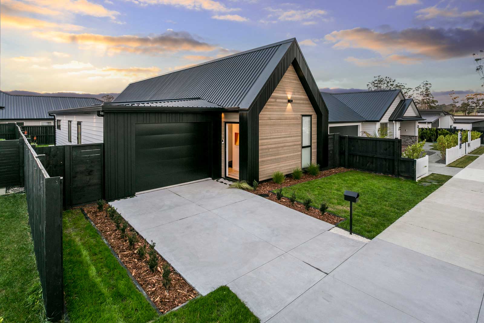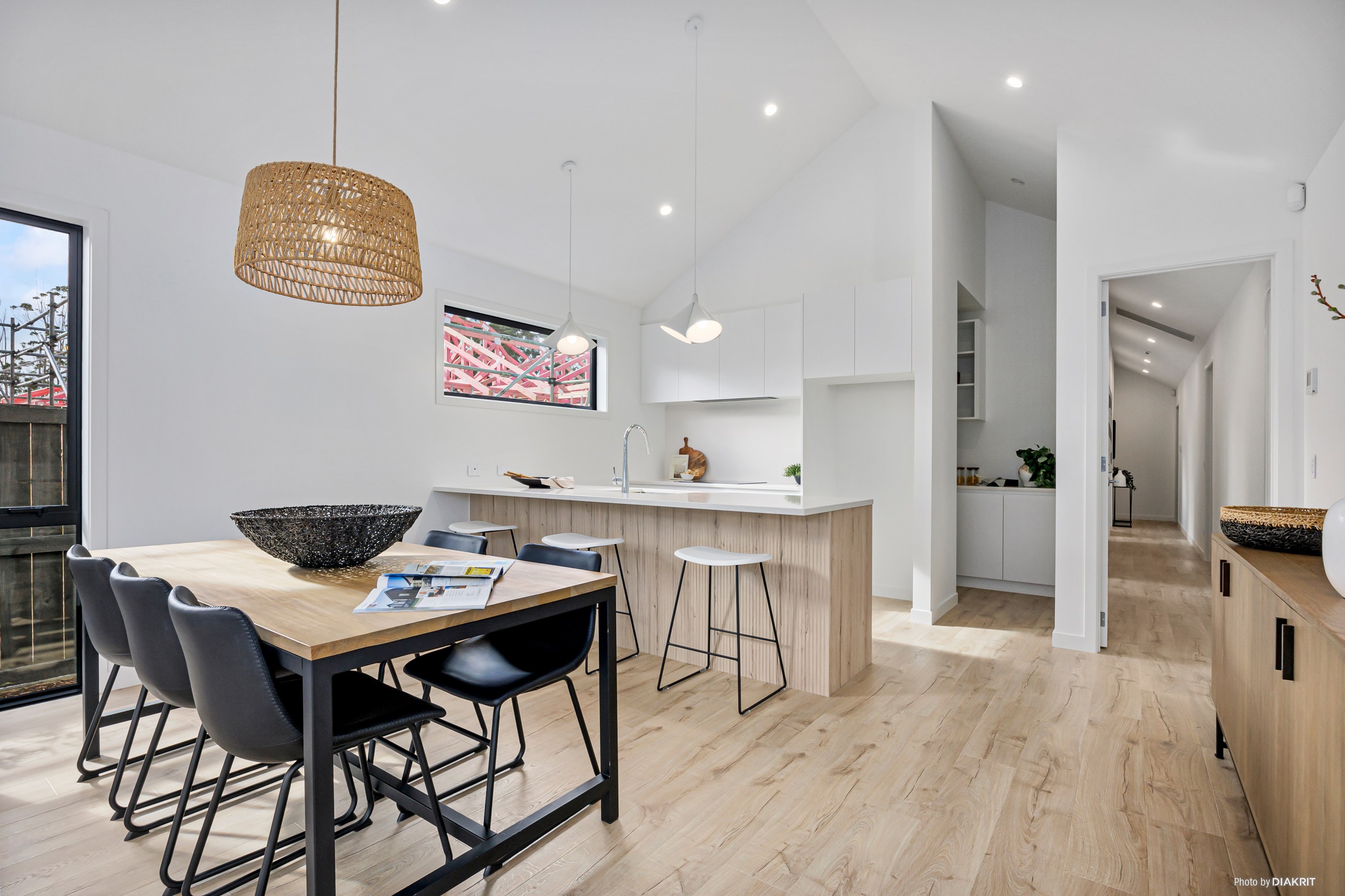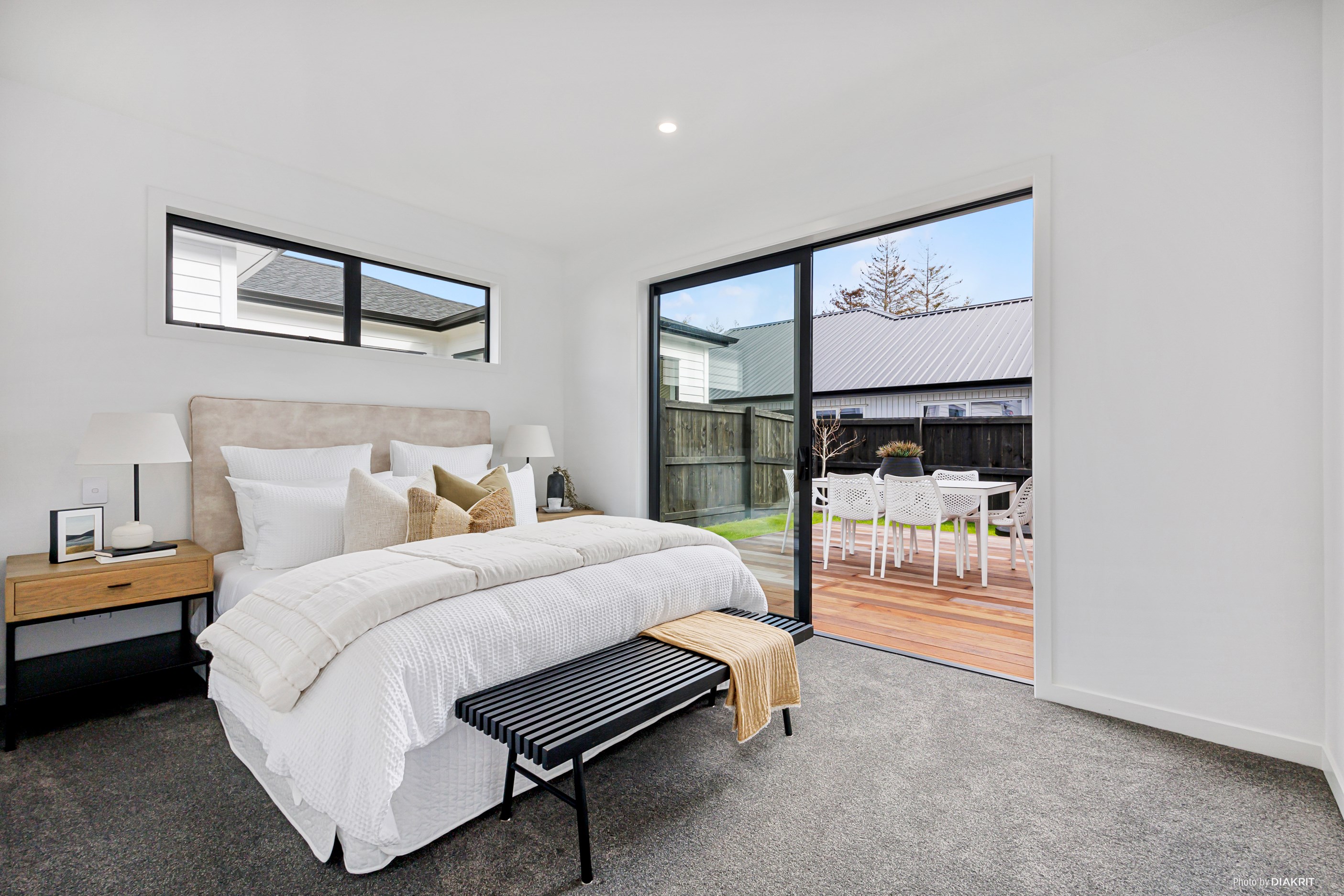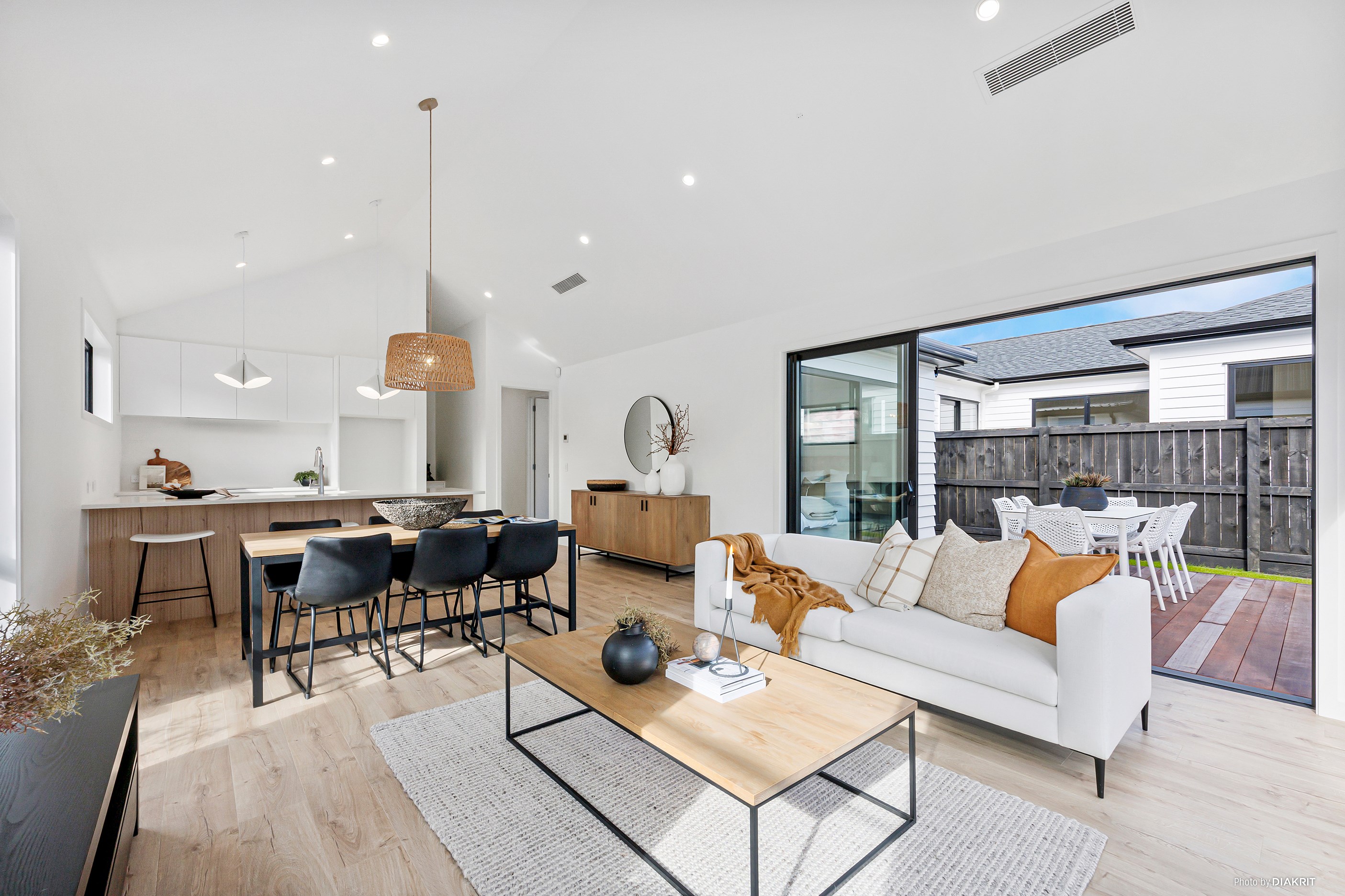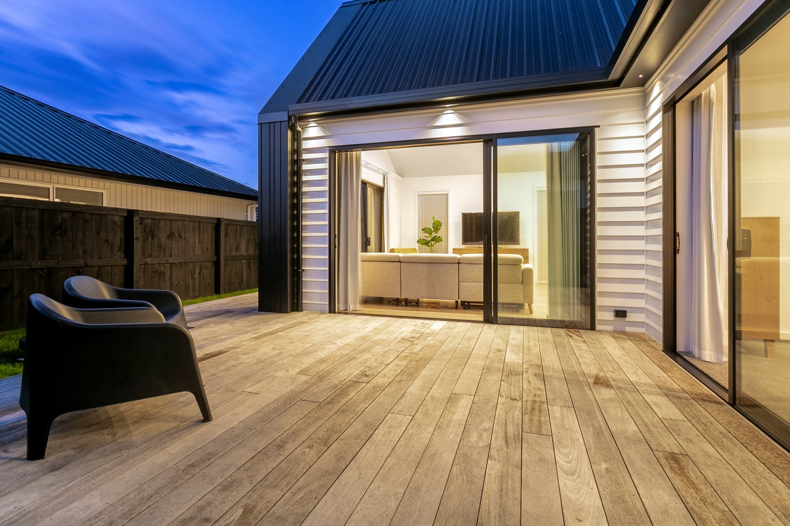 Sliders that run along two walls invite in natural light that further illuminates the airy space. These doors open directly onto north-facing timber decking encouraging alfresco dining and entertaining. The main bedroom, with walk-in wardrobe and ensuite, also has sliding doors onto a deck. Morning coffee and bagels, anyone? There’s a bathroom with a standalone bath and skylight, oversized single-car garage and separate laundry with a full-height linen cupboard and lots of shelving. It’s all polished and supremely practical.