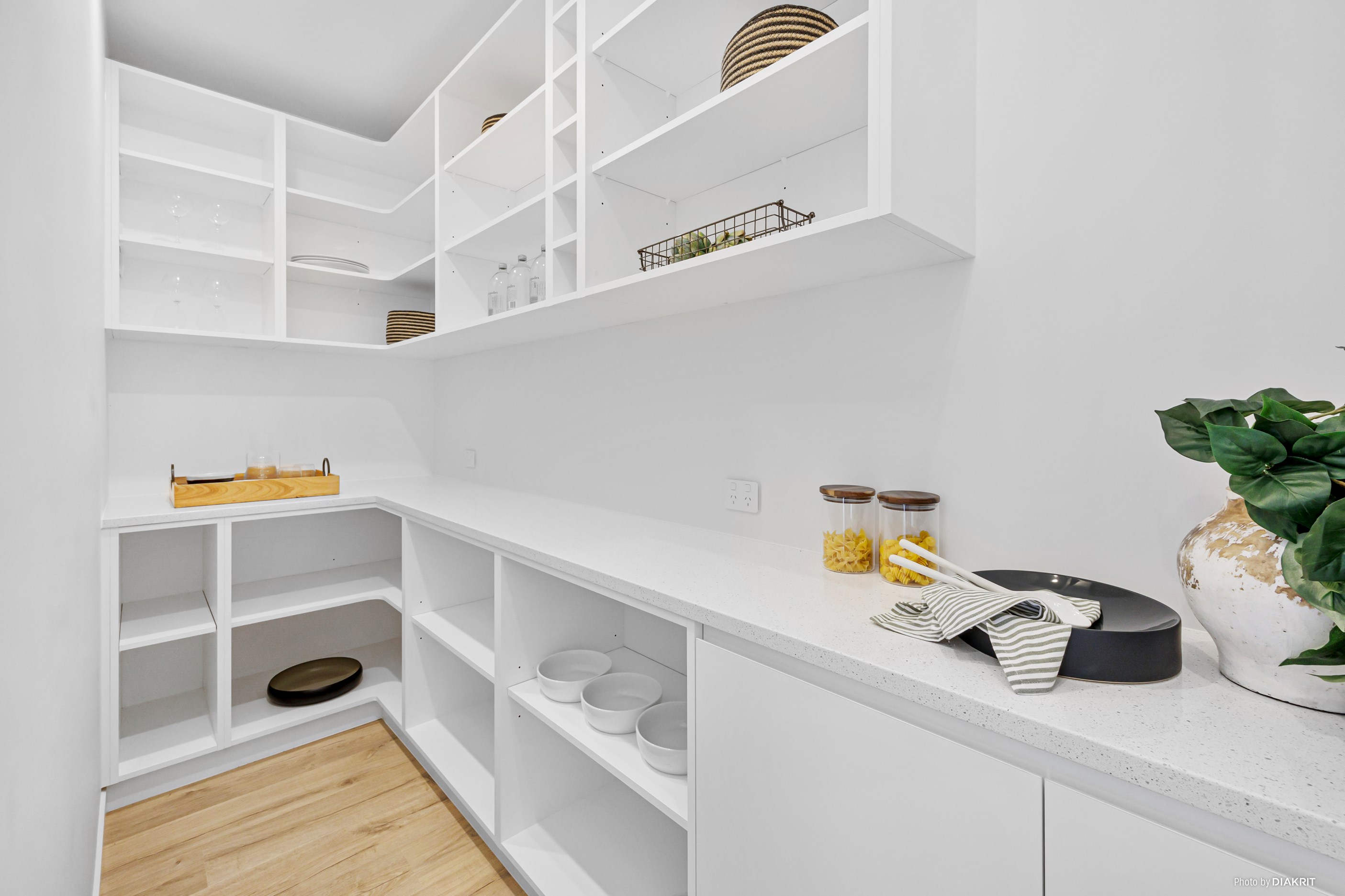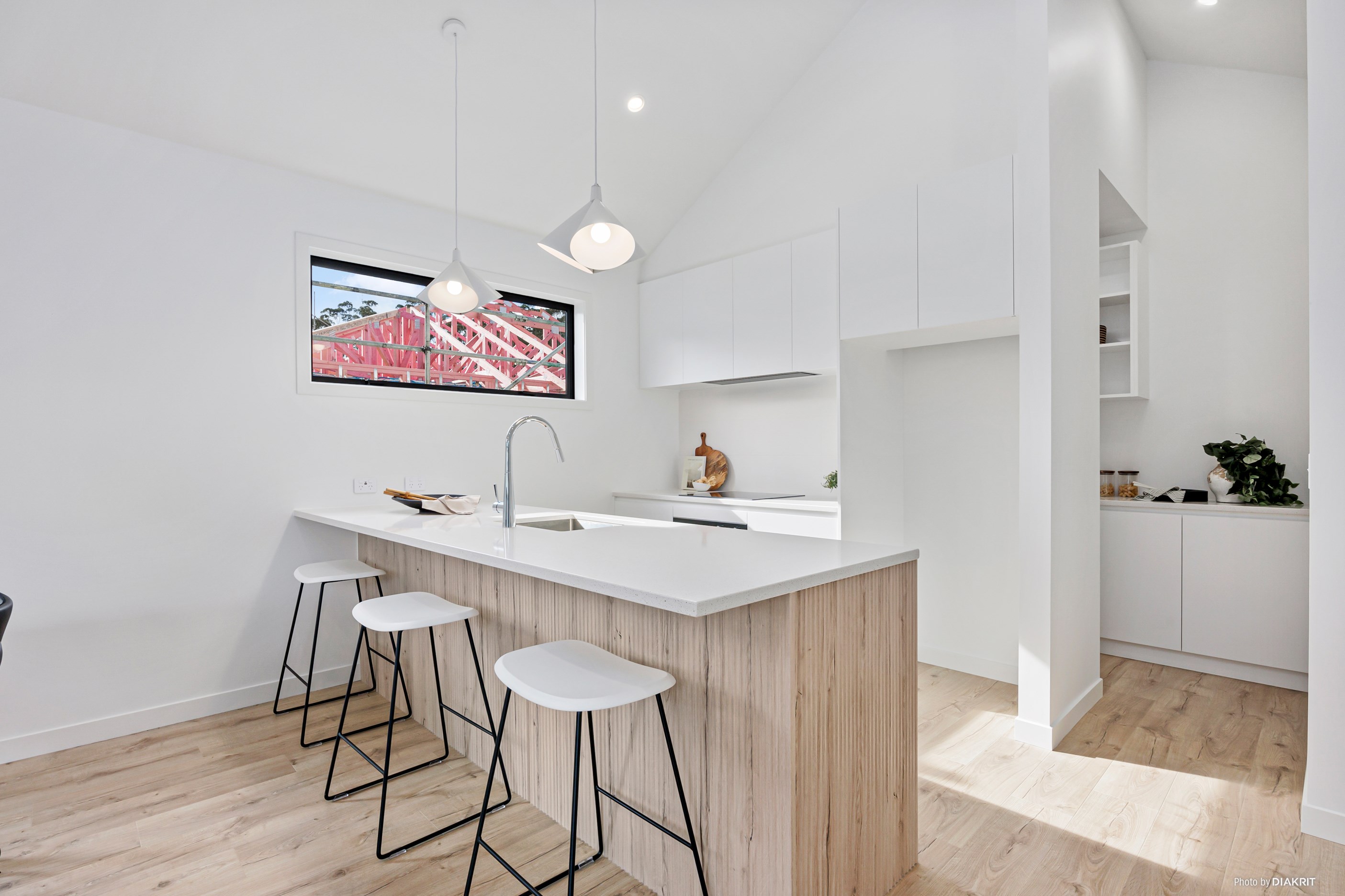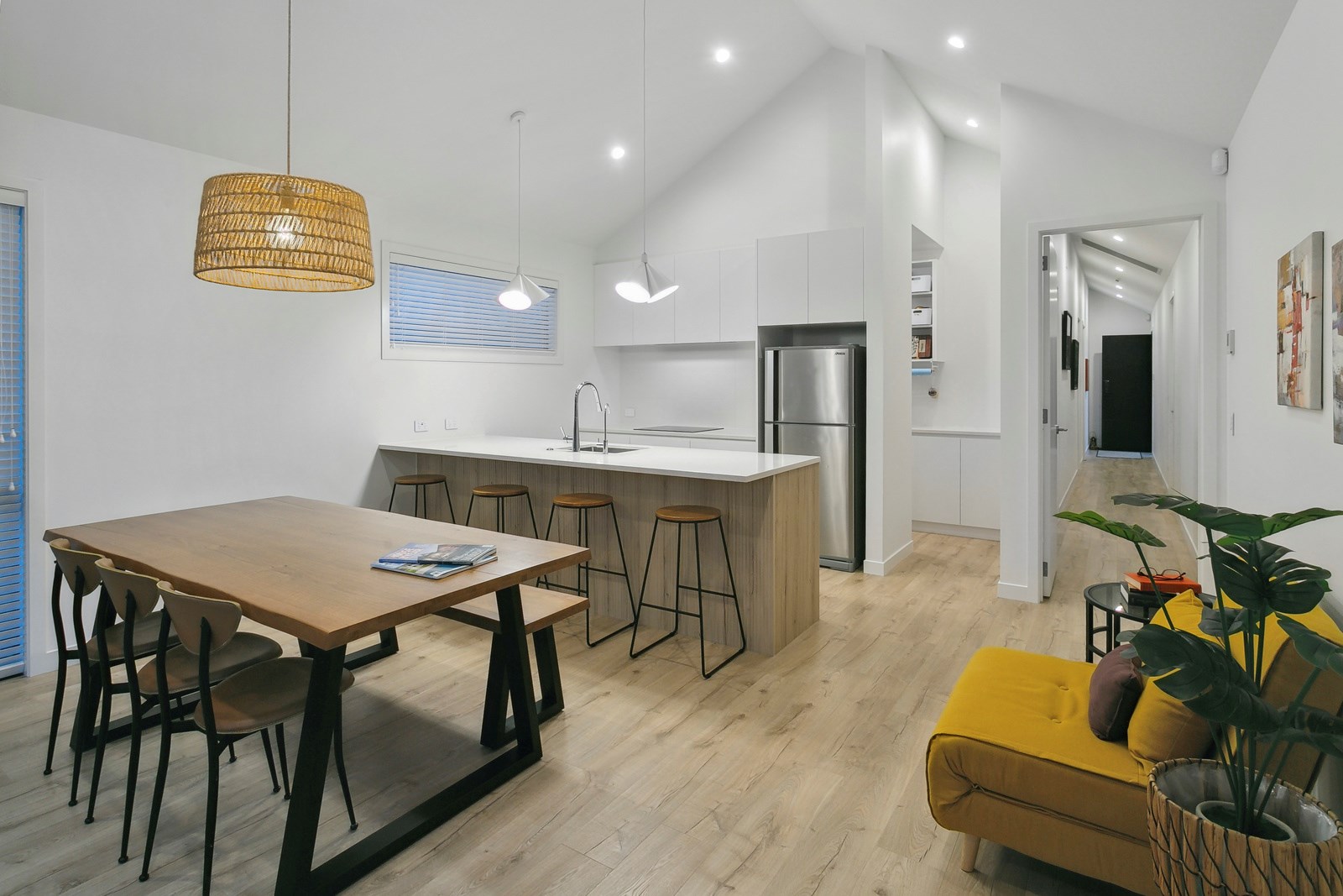 At 144sqm, this light-filled house isn’t the biggest in its suburb, but what it doesn’t have in terms of scale, it makes up for in architectural smarts: clean, pared-back style and great outdoor living. But the allure of this three-bedroom, two-bathroom house starts with first impressions, and street appeal is strong. The gabled form is clad in horizontal weatherboard and the outline edged with dark Nu-Wall metal cladding, and this extends to the exterior of the adjoining garage. Step inside and the living area feels large, almost grand, thanks to cathedral ceilings and a white-and-pale-wood aesthetic that has more than a touch of Scandi style. Natural and neutral extras never looked so good. The kitchen, at the base of this space, is pristine white, save for the island, which has a timber wrap. The walk-in pantry – also in white – has storage aplenty.