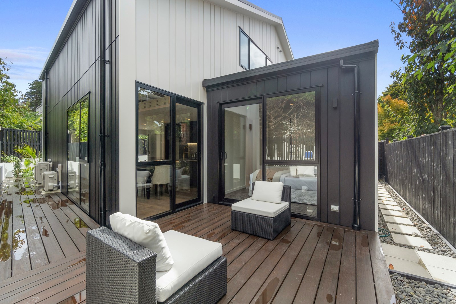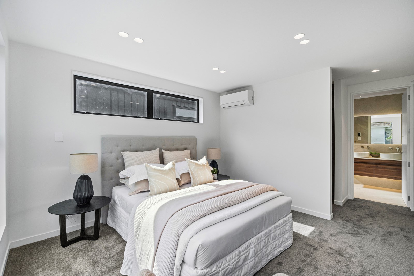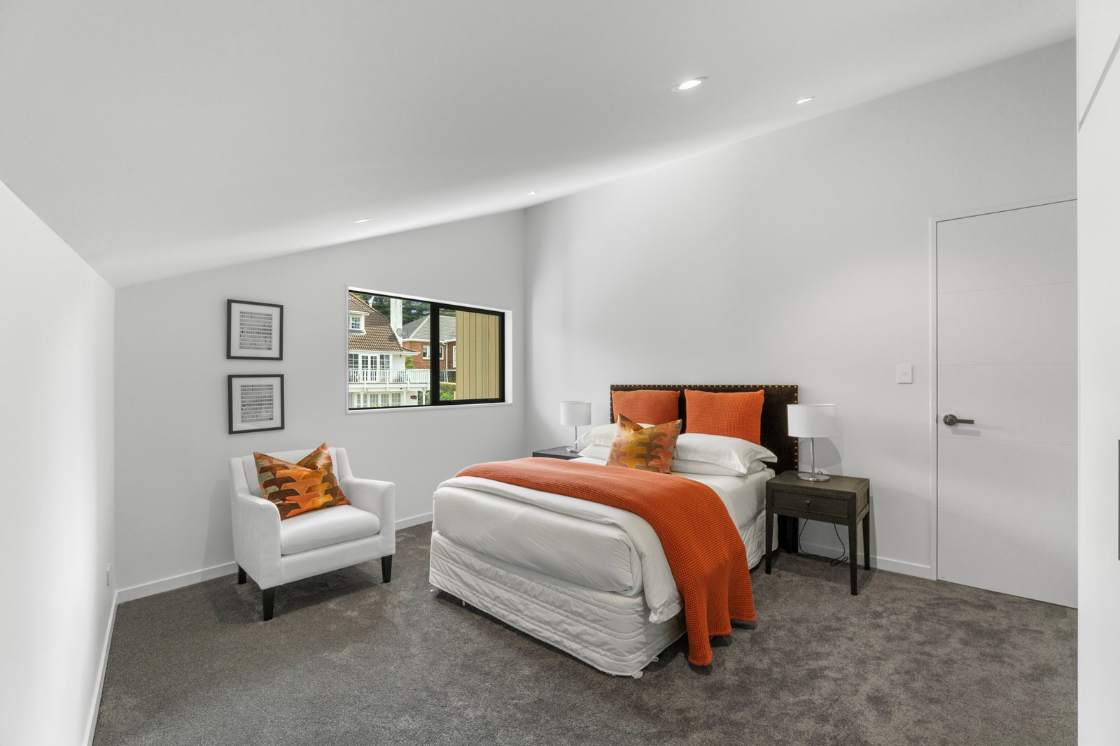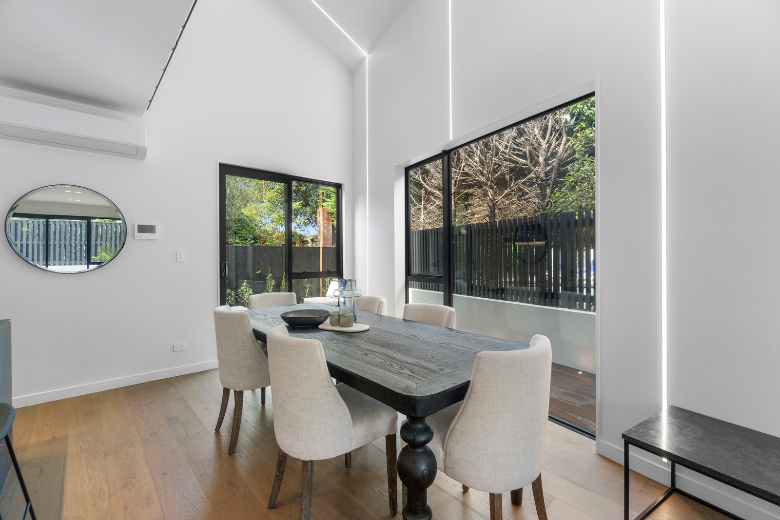 Step upstairs – perhaps to retreat to the second lounge – and take in the lovely views out to Mt Hobson. On this level there are three double bedrooms, including a large main suite with ensuite and walk-in robe, plus a family bathroom. A geometric wall light suspended in the stairwell adds another modern touch. On the exterior, James Hardie Oblique, Hermpac cedar cladding and Ebony aluminium joinery reflect the monochromatic palette inside. Premium materials and sophisticated design equal luxury living on one of Epsom’s finest streets.