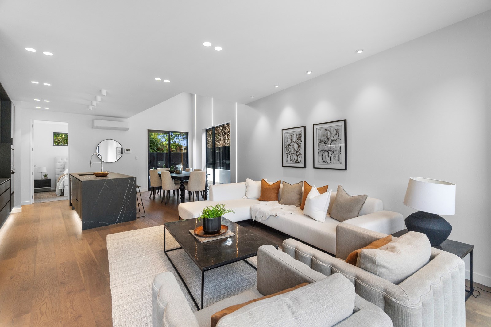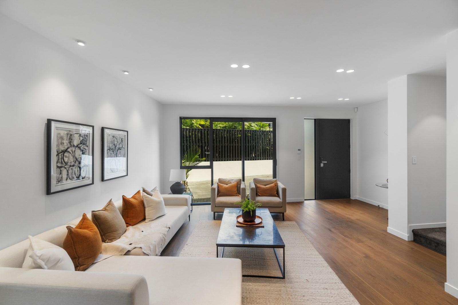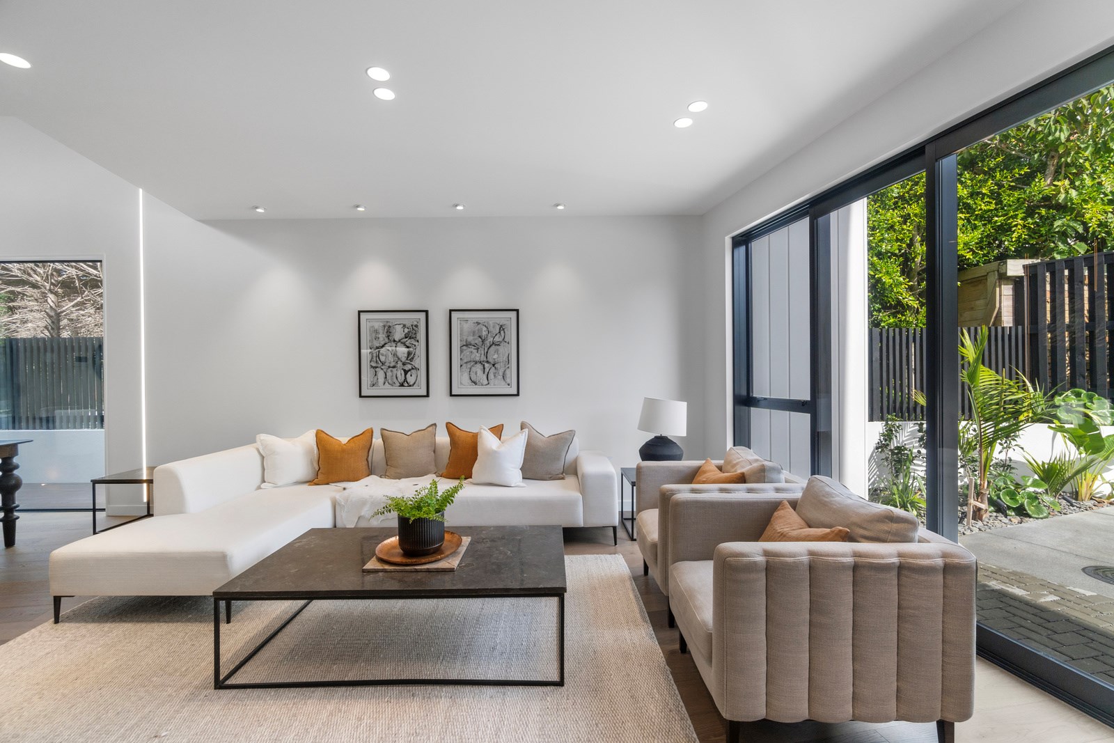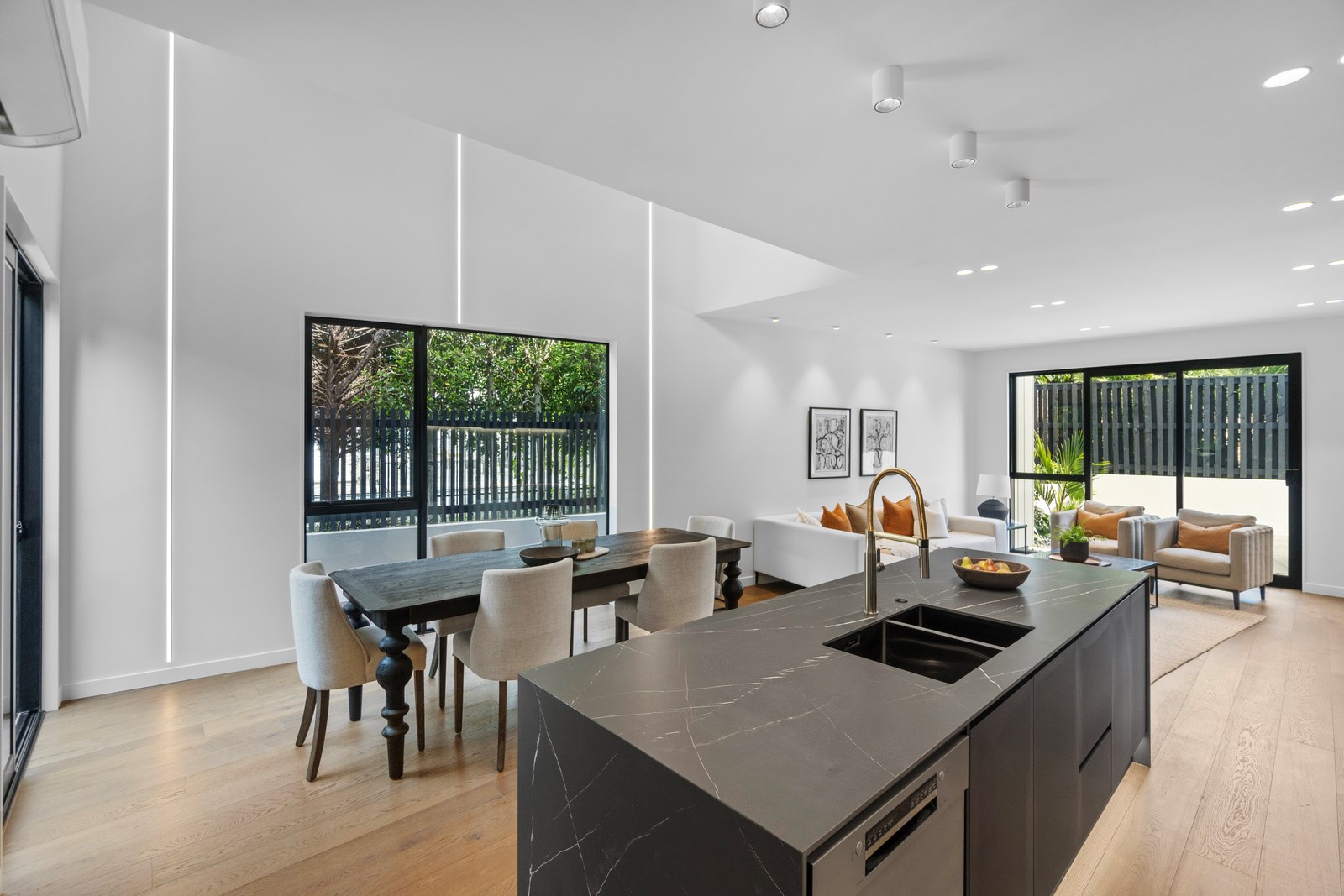 Step upstairs – perhaps to retreat to the second lounge – and take in the lovely views out to Mt Hobson. On this level there are three double bedrooms, including a large main suite with ensuite and walk-in robe, plus a family bathroom. A geometric wall light suspended in the stairwell adds another modern touch. On the exterior, James Hardie Oblique, Hermpac cedar cladding and Ebony aluminium joinery reflect the monochromatic palette inside. Premium materials and sophisticated design equal luxury living on one of Epsom’s finest streets.