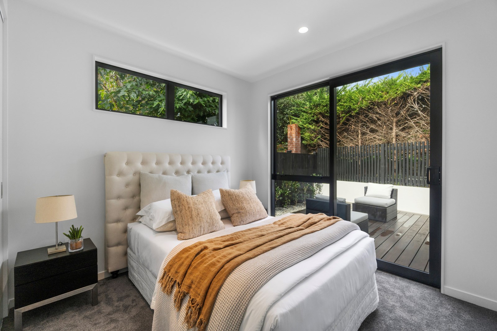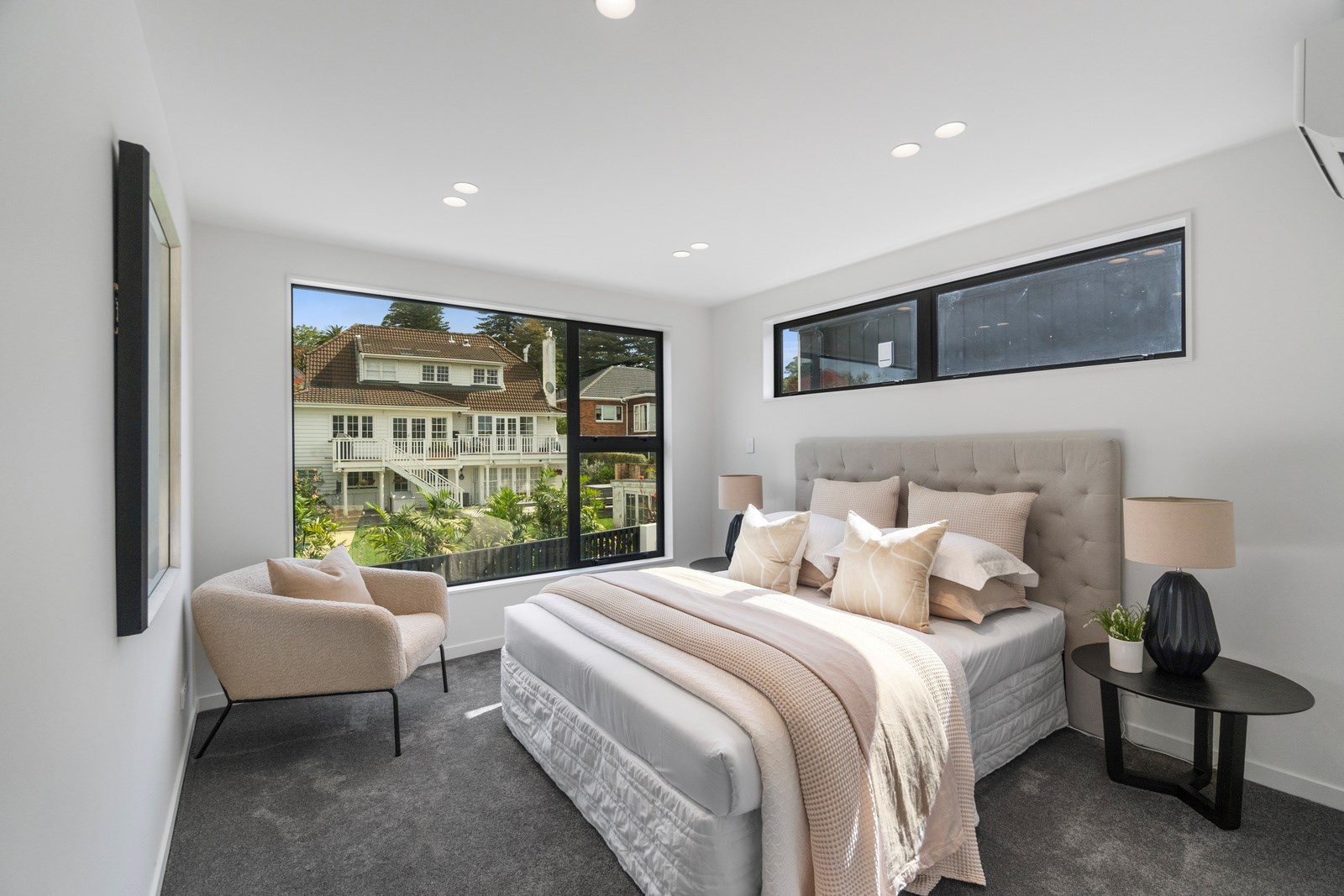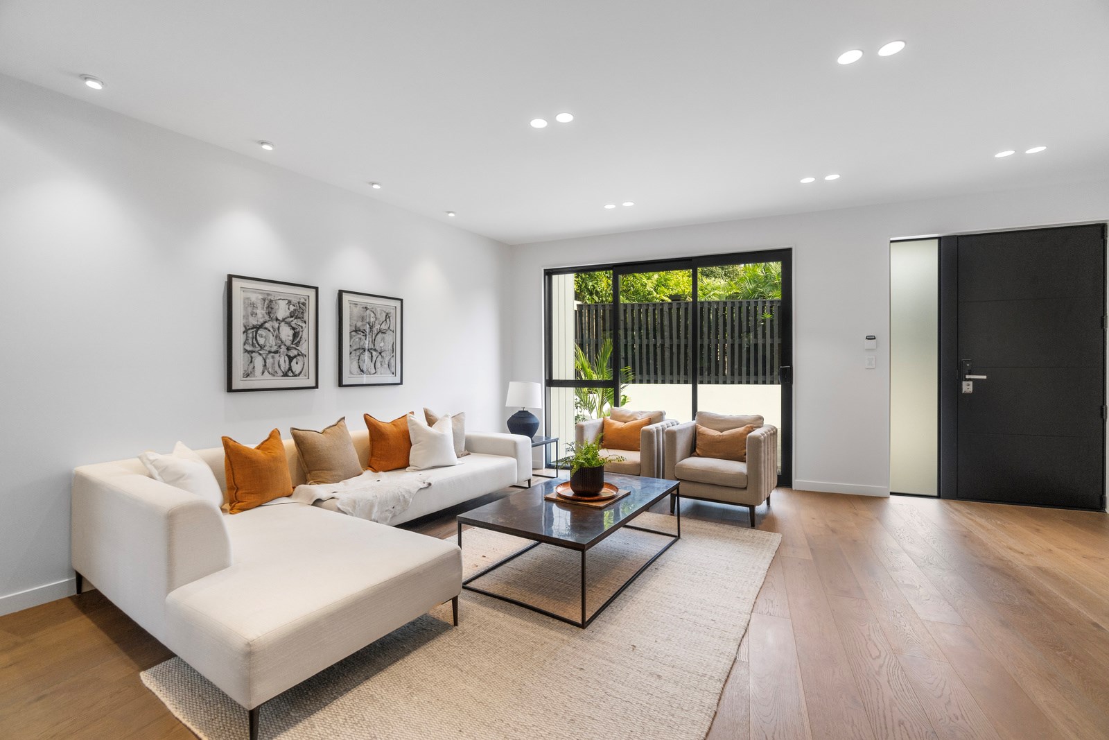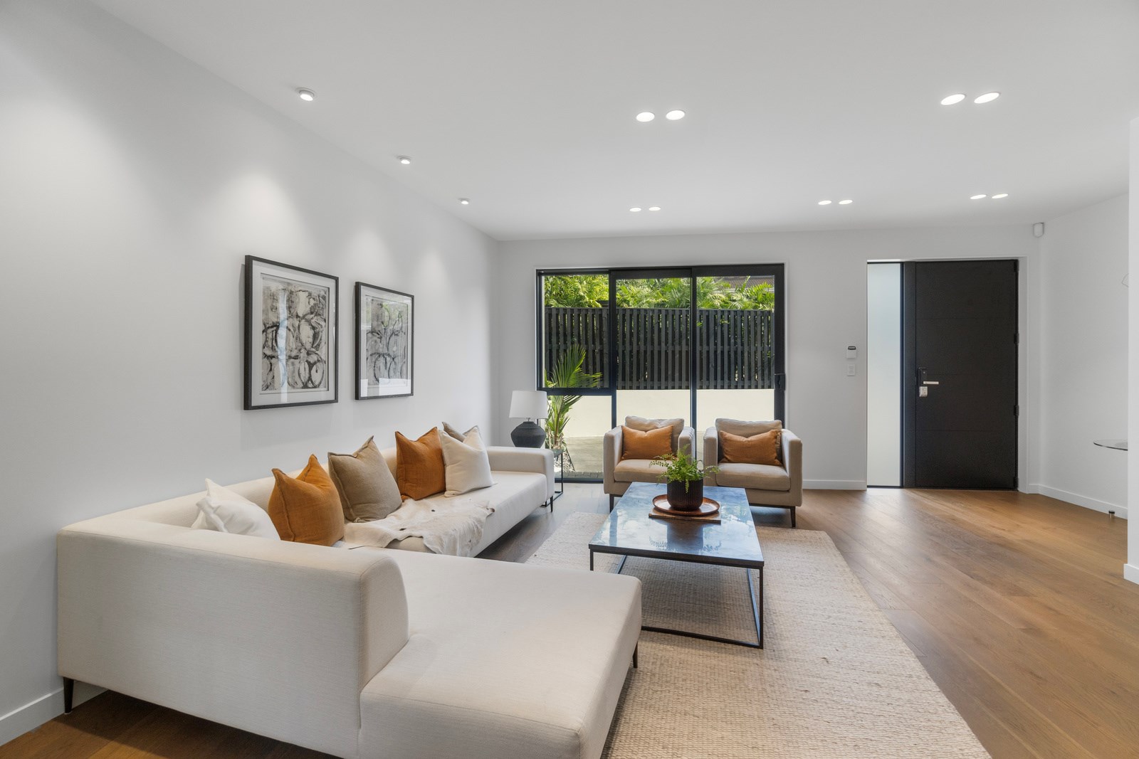 Step upstairs – perhaps to retreat to the second lounge – and take in the lovely views out to Mt Hobson. On this level there are three double bedrooms, including a large main suite with ensuite and walk-in robe, plus a family bathroom. A geometric wall light suspended in the stairwell adds another modern touch. On the exterior, James Hardie Oblique, Hermpac cedar cladding and Ebony aluminium joinery reflect the monochromatic palette inside. Premium materials and sophisticated design equal luxury living on one of Epsom’s finest streets.