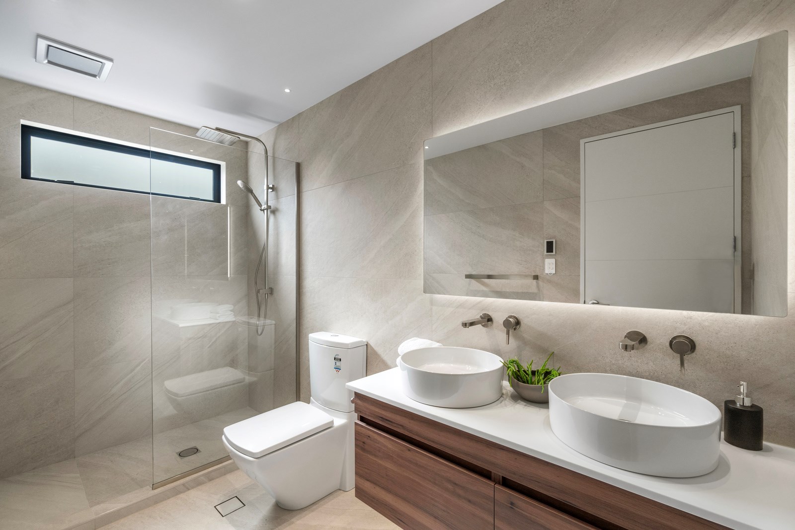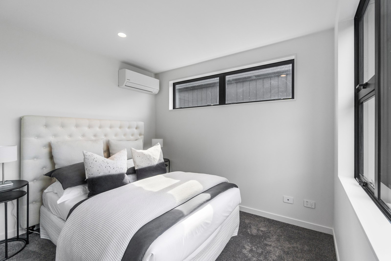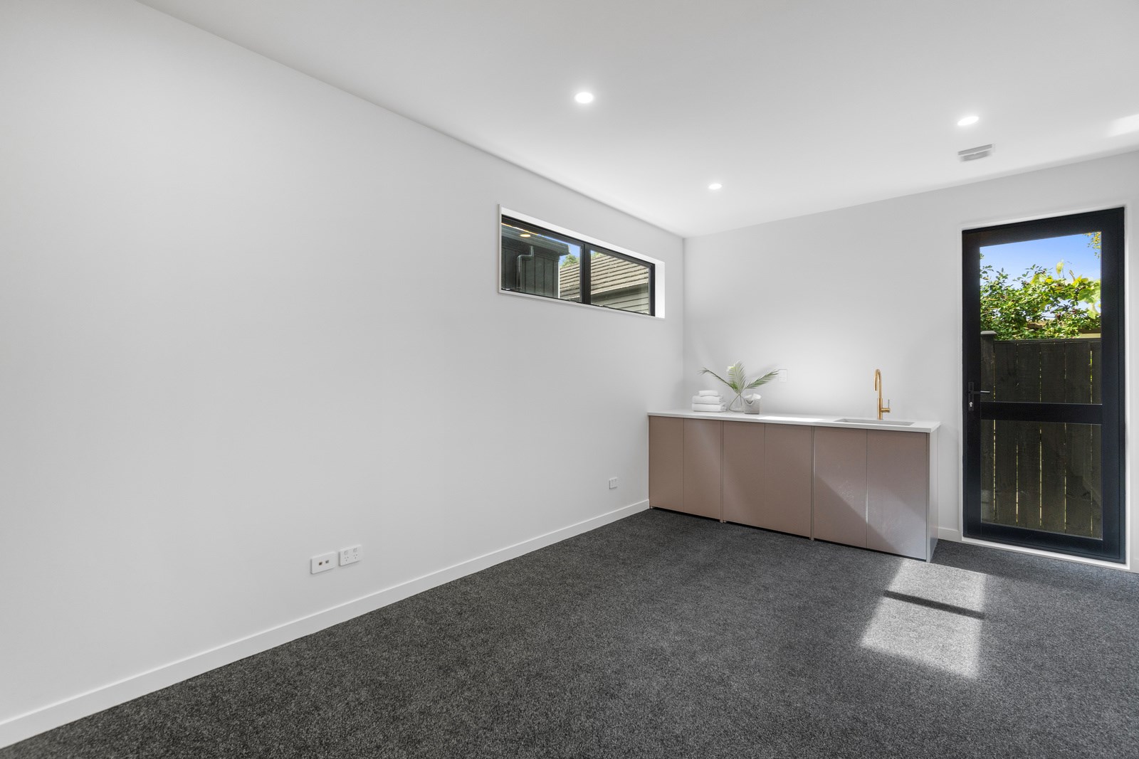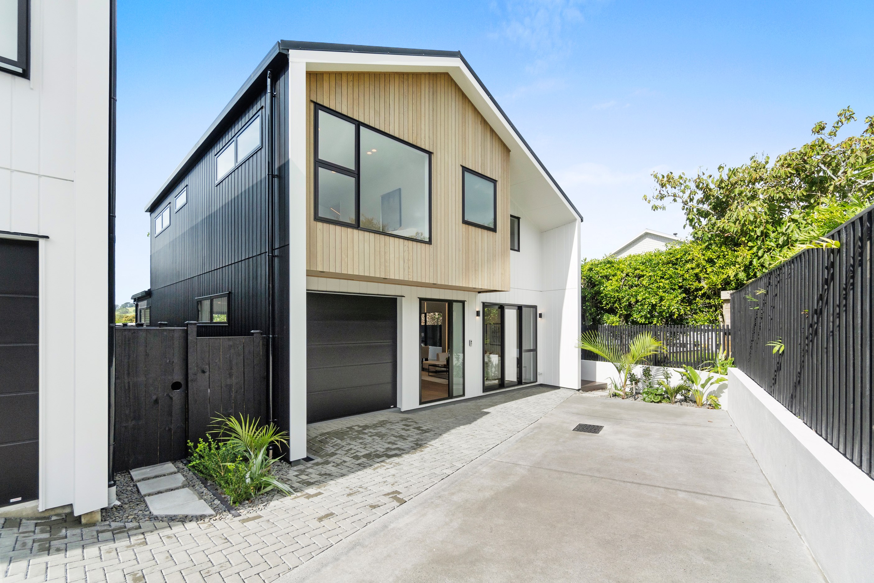 Step upstairs – perhaps to retreat to the second lounge – and take in the lovely views out to Mt Hobson. On this level there are three double bedrooms, including a large main suite with ensuite and walk-in robe, plus a family bathroom. A geometric wall light suspended in the stairwell adds another modern touch. On the exterior, James Hardie Oblique, Hermpac cedar cladding and Ebony aluminium joinery reflect the monochromatic palette inside. Premium materials and sophisticated design equal luxury living on one of Epsom’s finest streets.