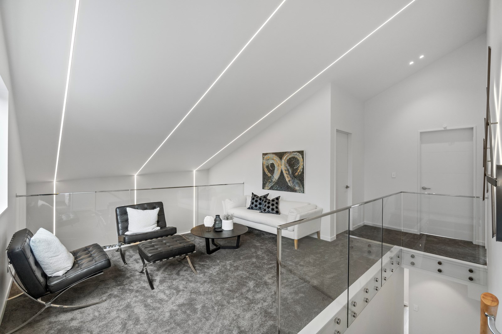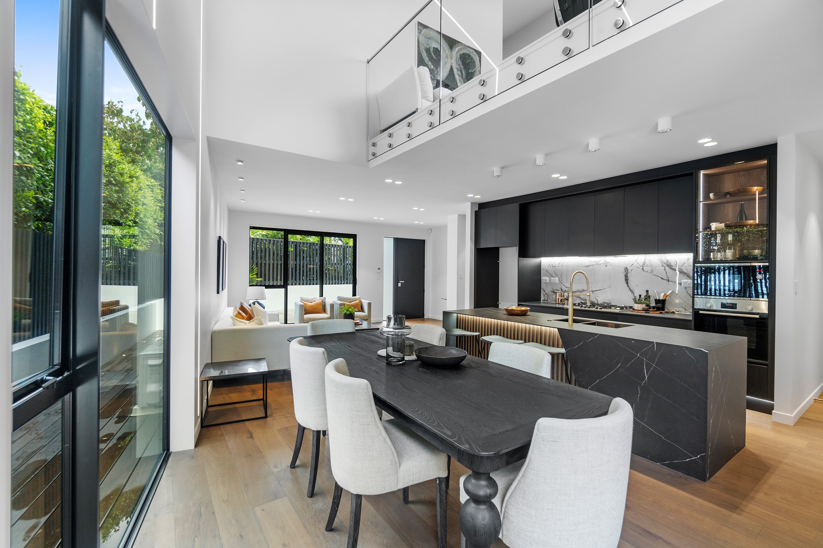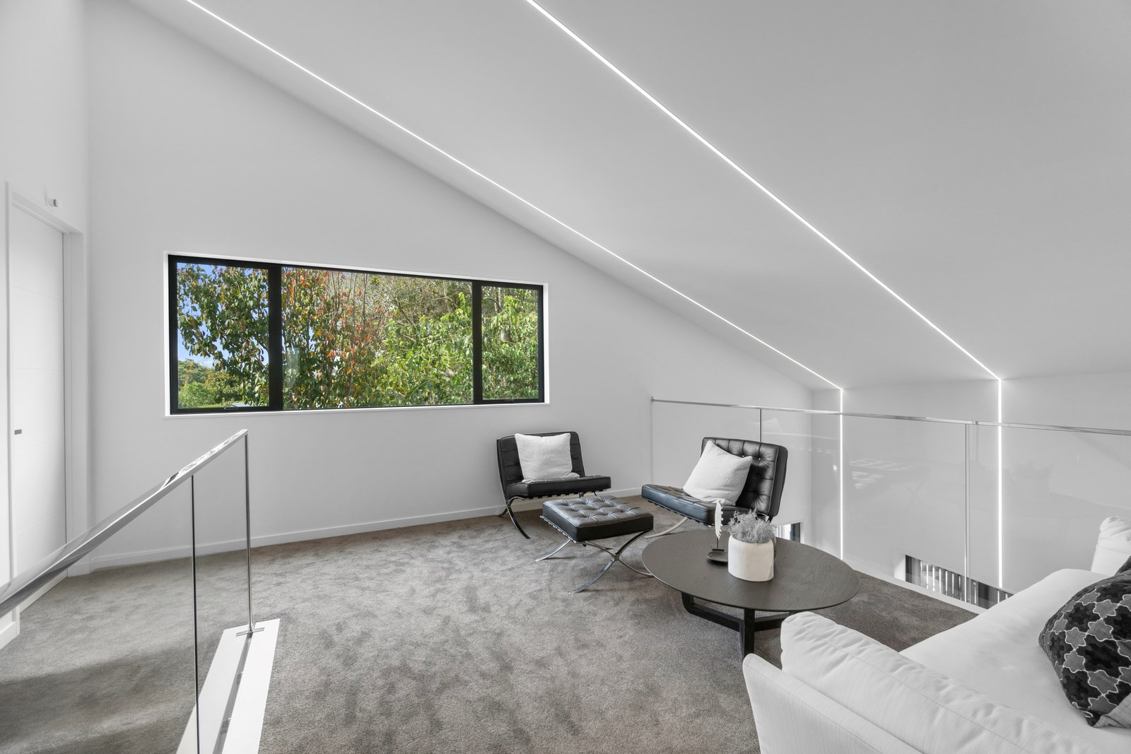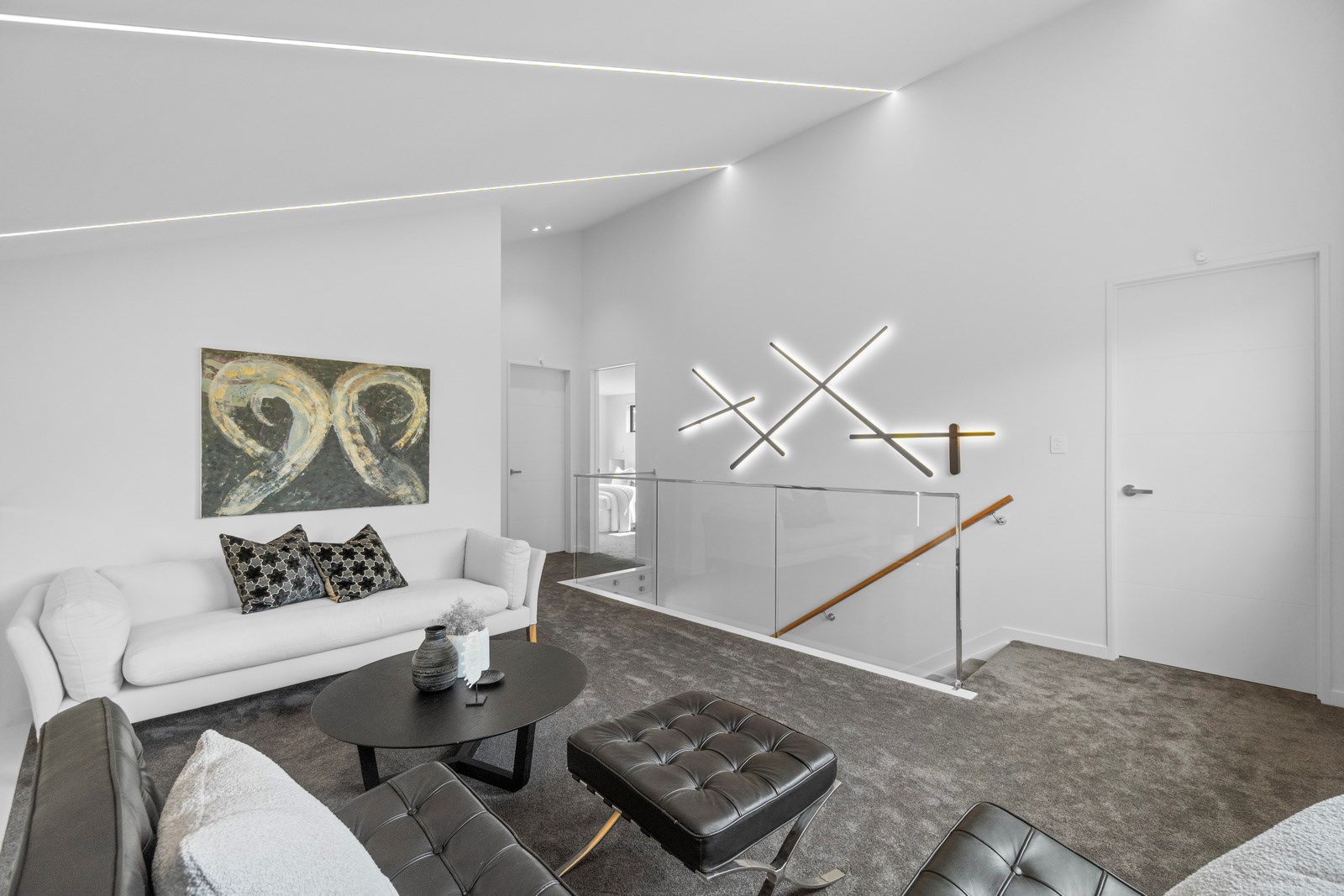 Open-plan living is both horizontal and vertical in this dynamic architecturally-designed home from QM Development. Look up from the spacious kitchen, dining and living room and you’ll see a mezzanine second lounge perched above. This works to open the space to ceiling height ,while segregating areas for communal and solitary moments. Perhaps even more striking are the angular LED strip lights that connect the two levels. Luxurious features include high vaulted ceilings, a matte-black chef’s kitchen with glossy splashback and spacious living areas which open right up to private decking. Guests will enjoy their own quiet spaces as a bedroom and full bathroom are located on the lower level, along with an oversized tandem garage with laundry.
