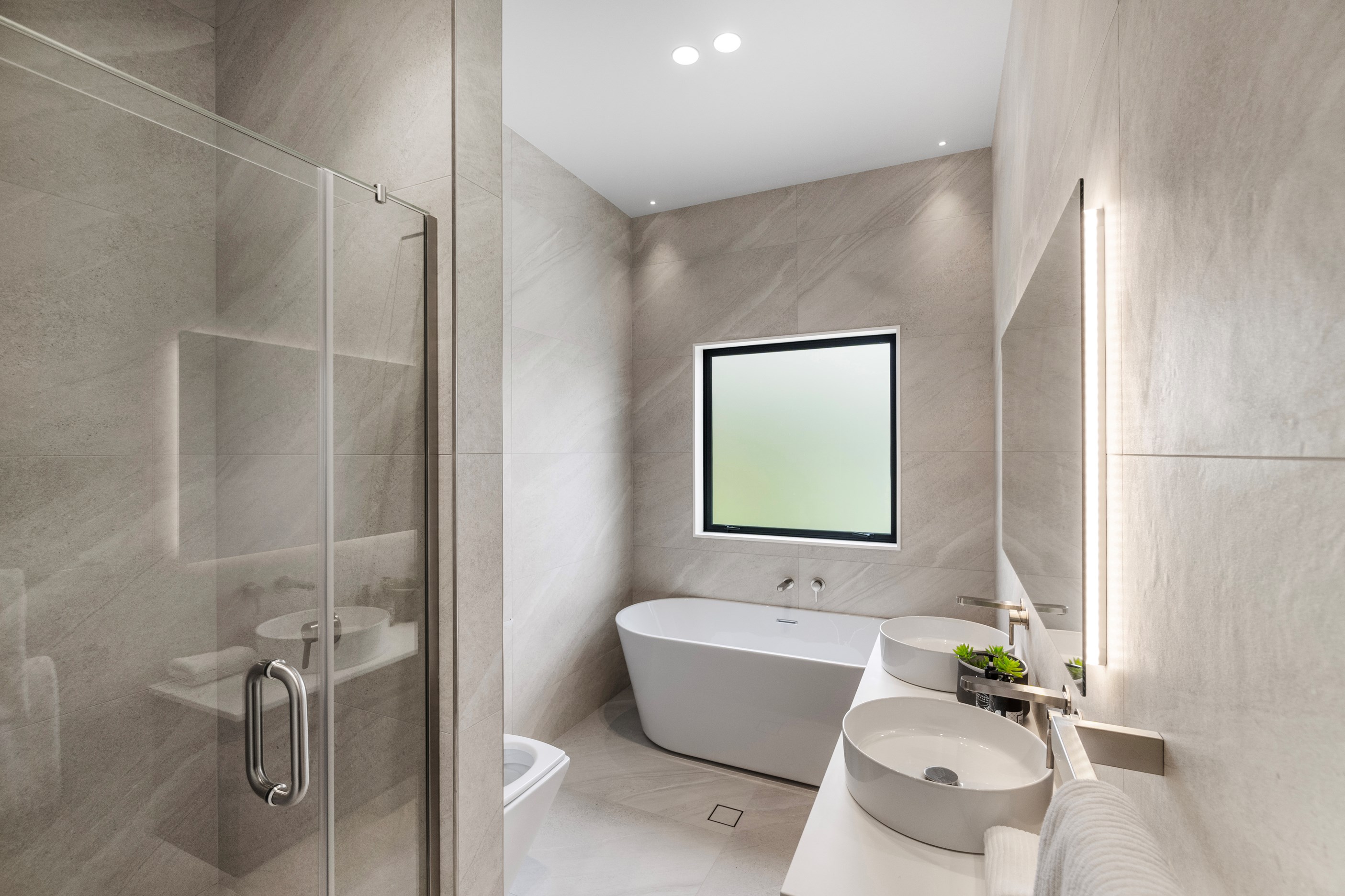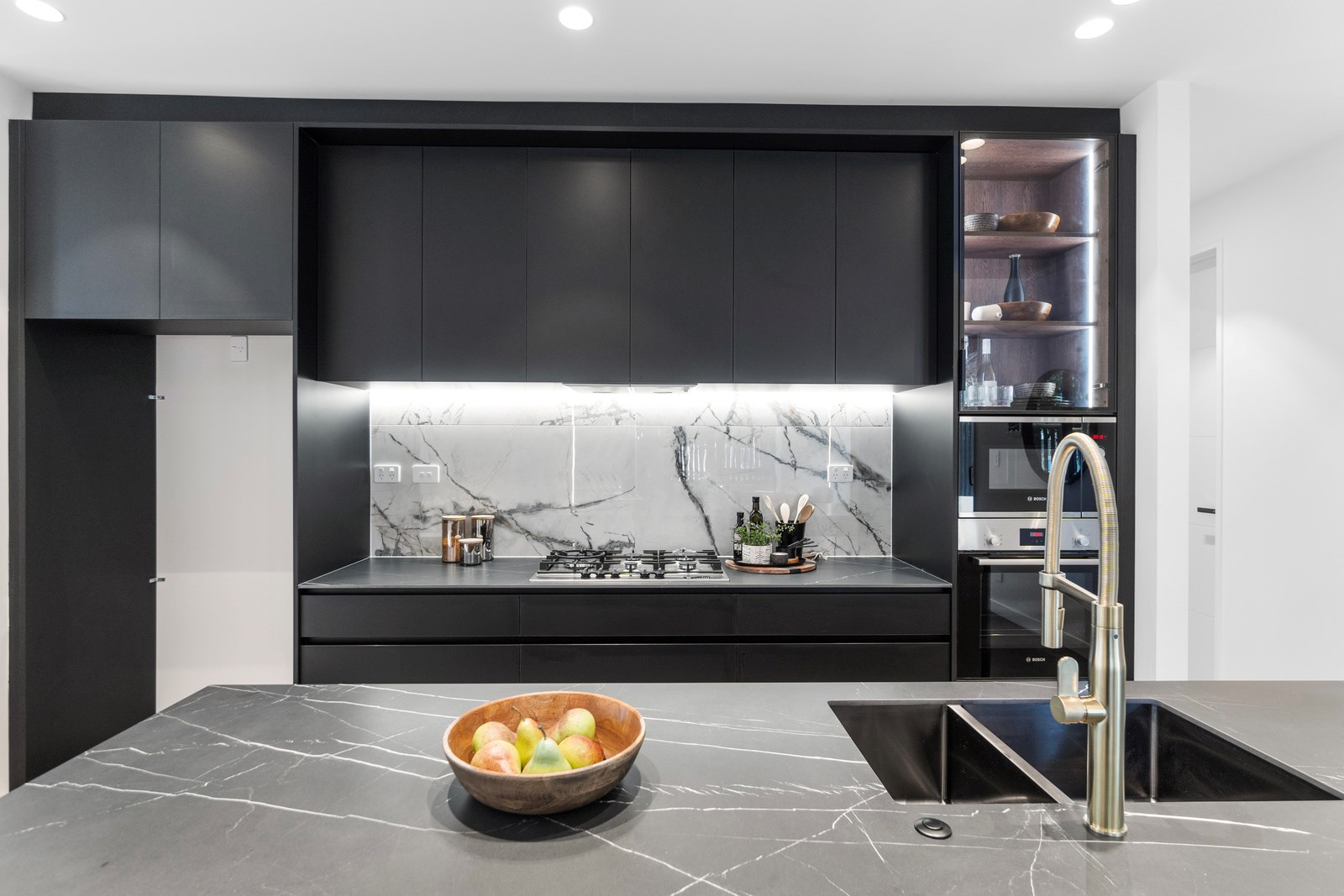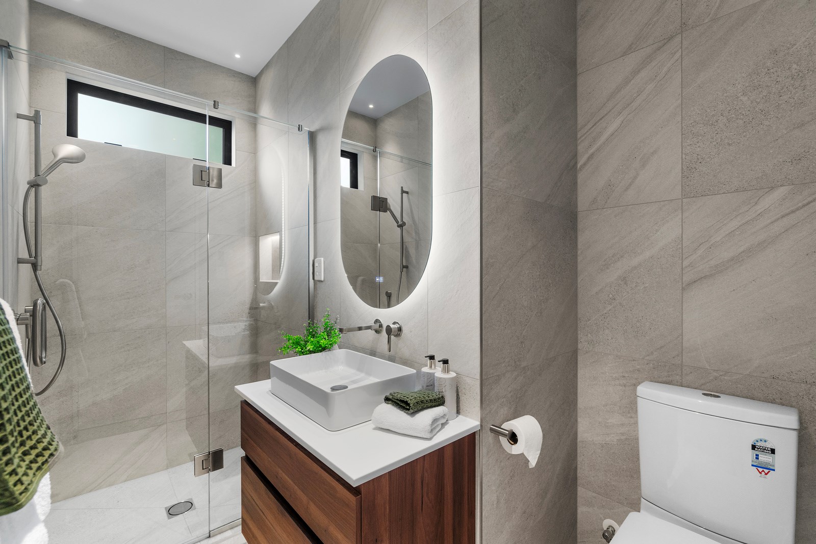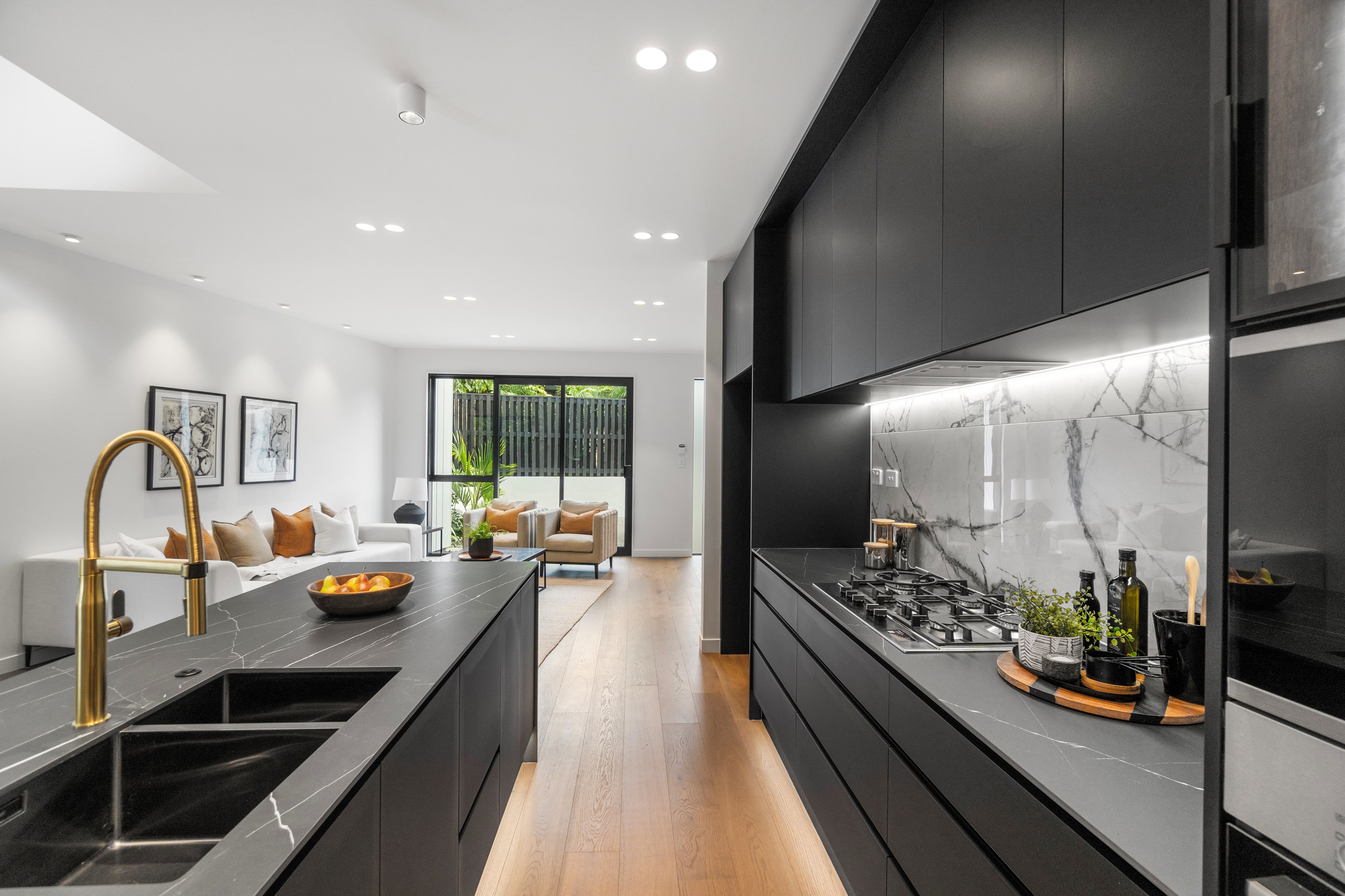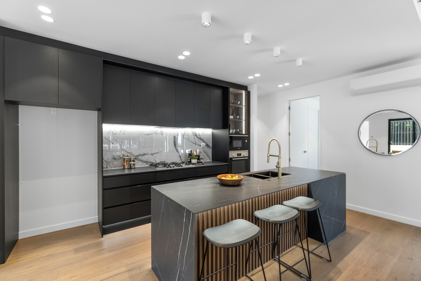 Open-plan living is both horizontal and vertical in this dynamic architecturally-designed home from QM Development. Look up from the spacious kitchen, dining and living room and you’ll see a mezzanine second lounge perched above. This works to open the space to ceiling height ,while segregating areas for communal and solitary moments. Perhaps even more striking are the angular LED strip lights that connect the two levels. Luxurious features include high vaulted ceilings, a matte-black chef’s kitchen with glossy splashback and spacious living areas which open right up to private decking. Guests will enjoy their own quiet spaces as a bedroom and full bathroom are located on the lower level, along with an oversized tandem garage with laundry.