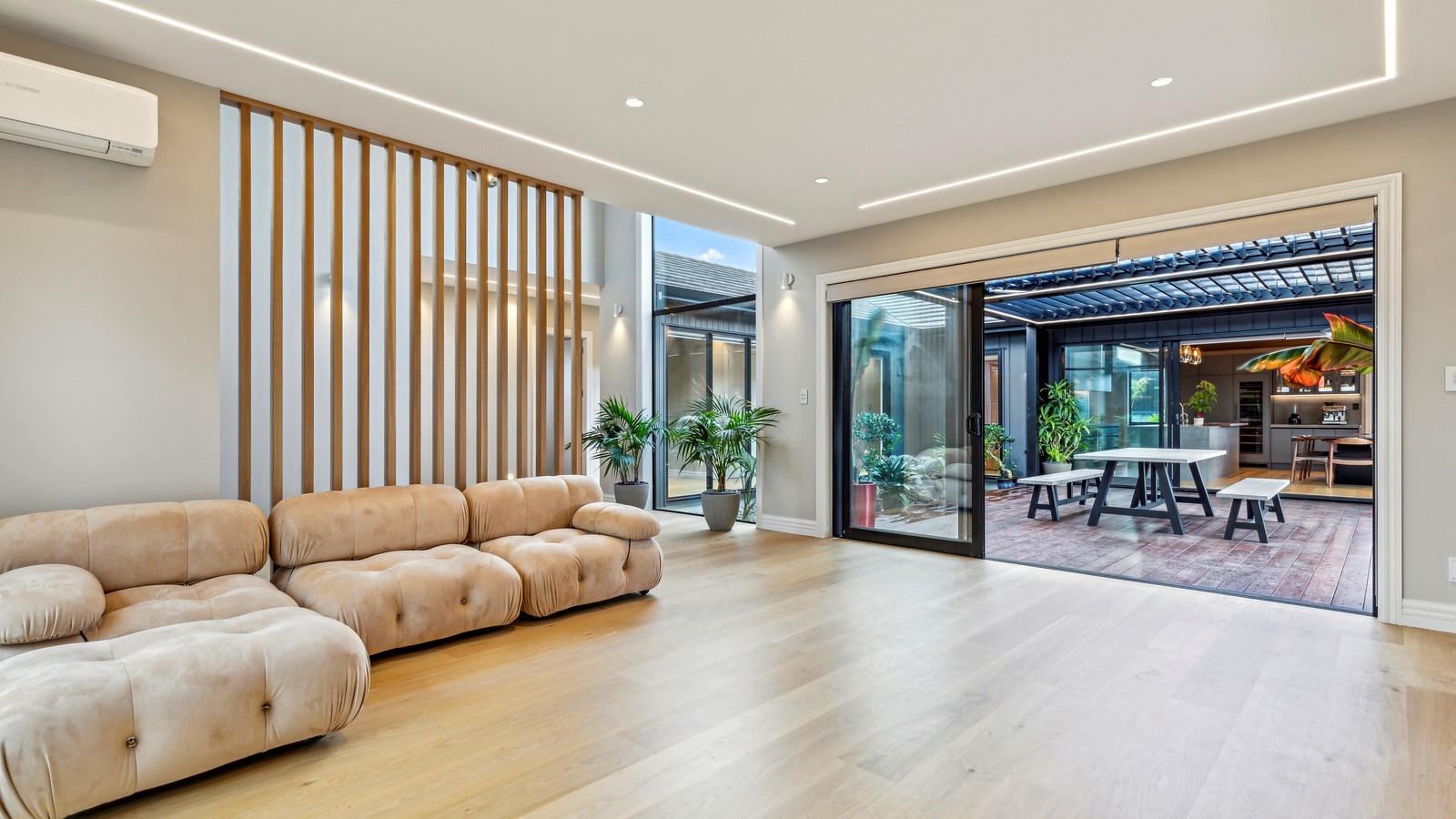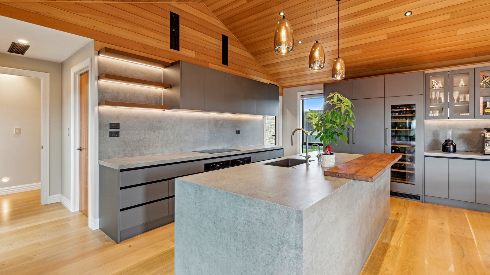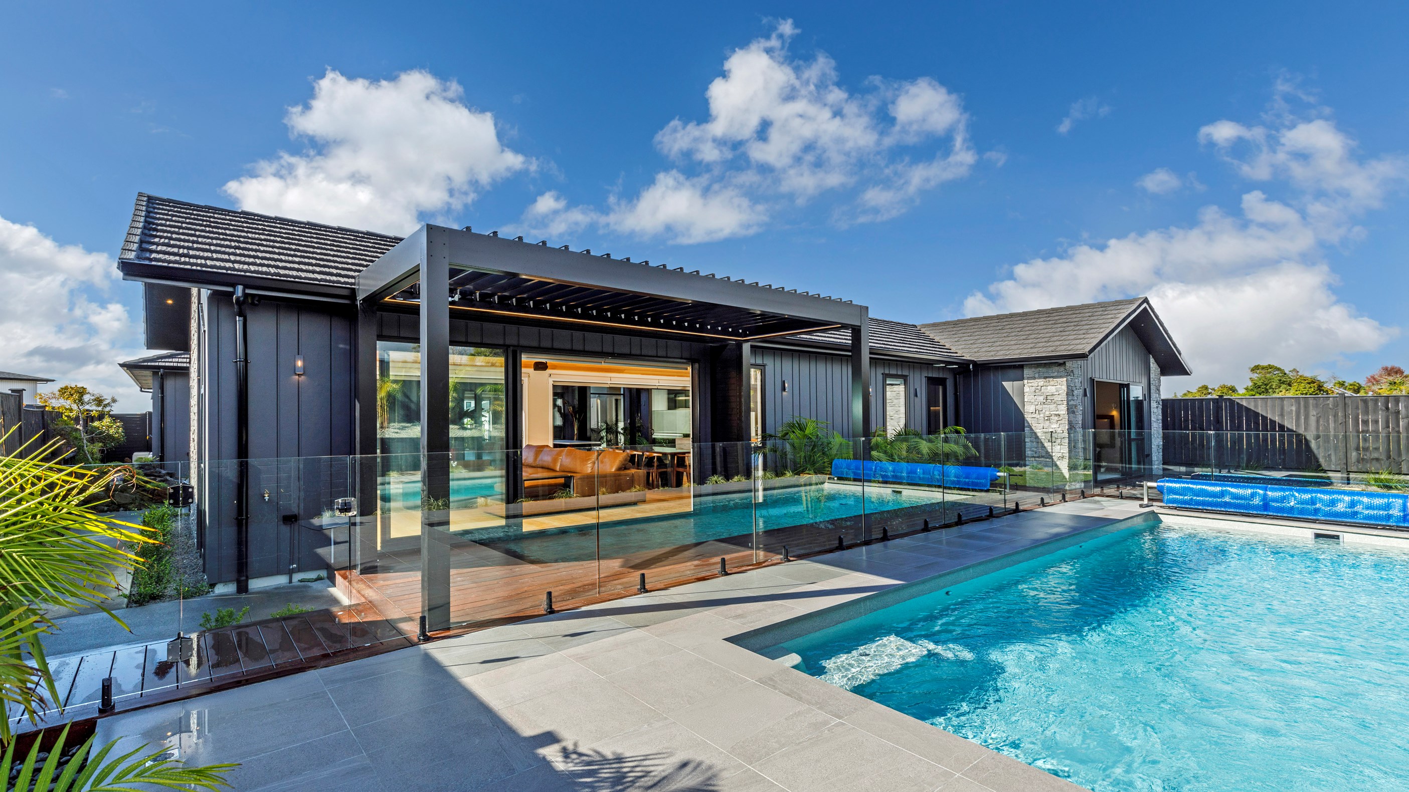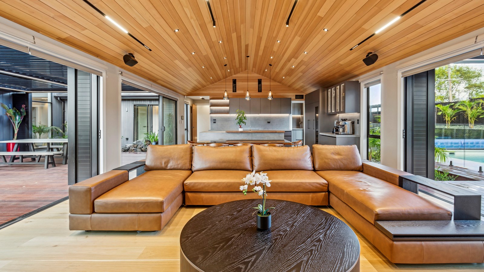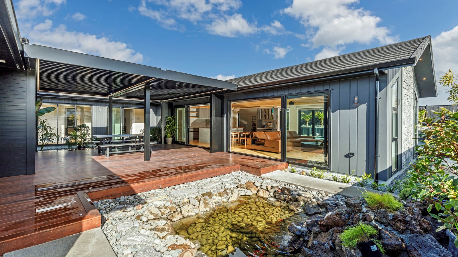This single-storey marvel exudes contemporary luxury. With 385sqm of living space positioned on a 1000sqm plot, this spacious home combines modern elegance with calming, natural elements. The exterior is a monochromatic design with cedar wood, cement board, block and schist stone walls while a central Japanese-inspired waterfall fishpond adds a tranquil element to the garden. Two living spaces, connected by a deck with pergolas, flow to the 8.8m fibreglass pool. The most stunning space, however, is the open-concept kitchen-living-dining area featuring European oak flooring, a vaulted timber ceiling, an electric fireplace and sleek grey-stone countertops. The chef’s kitchen boasts a gas stovetop and discrete storage. This spacious hub opens up on both sides to the pool and decking, for sumptuous indoor-outdoor entertaining.