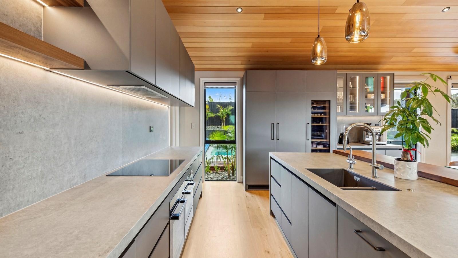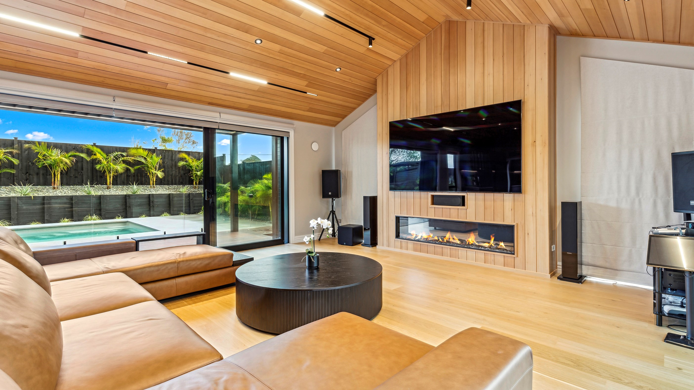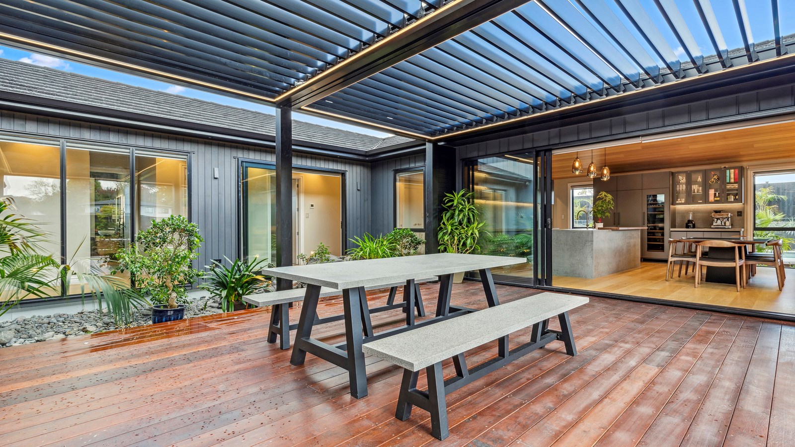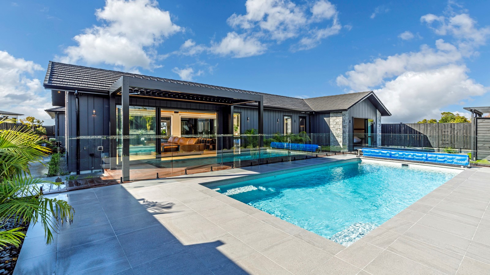 This single-storey marvel exudes contemporary luxury. With 385sqm of living space positioned on a 1000sqm plot, this spacious home combines modern elegance with calming, natural elements. The exterior is a monochromatic design with cedar wood, cement board, block and schist stone walls while a central Japanese-inspired waterfall fishpond adds a tranquil element to the garden. Two living spaces, connected by a deck with pergolas, flow to the 8.8m fibreglass pool. The most stunning space, however, is the open-concept kitchen-living-dining area featuring European oak flooring, a vaulted timber ceiling, an electric fireplace and sleek grey-stone countertops. The chef’s kitchen boasts a gas stovetop and discrete storage. This spacious hub opens up on both sides to the pool and decking, for sumptuous indoor-outdoor entertaining.