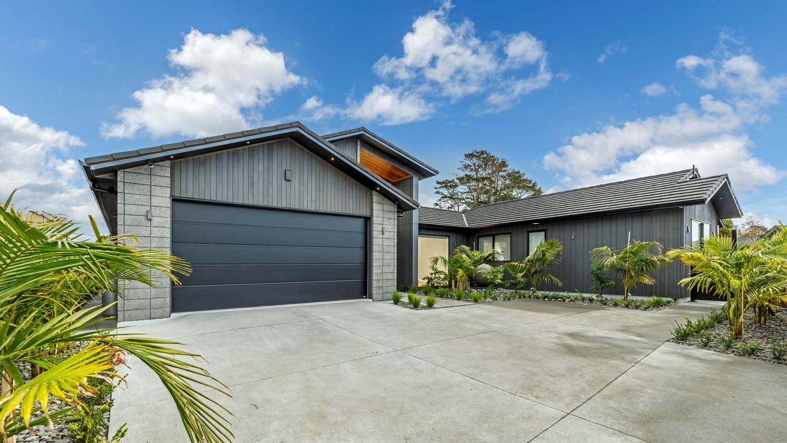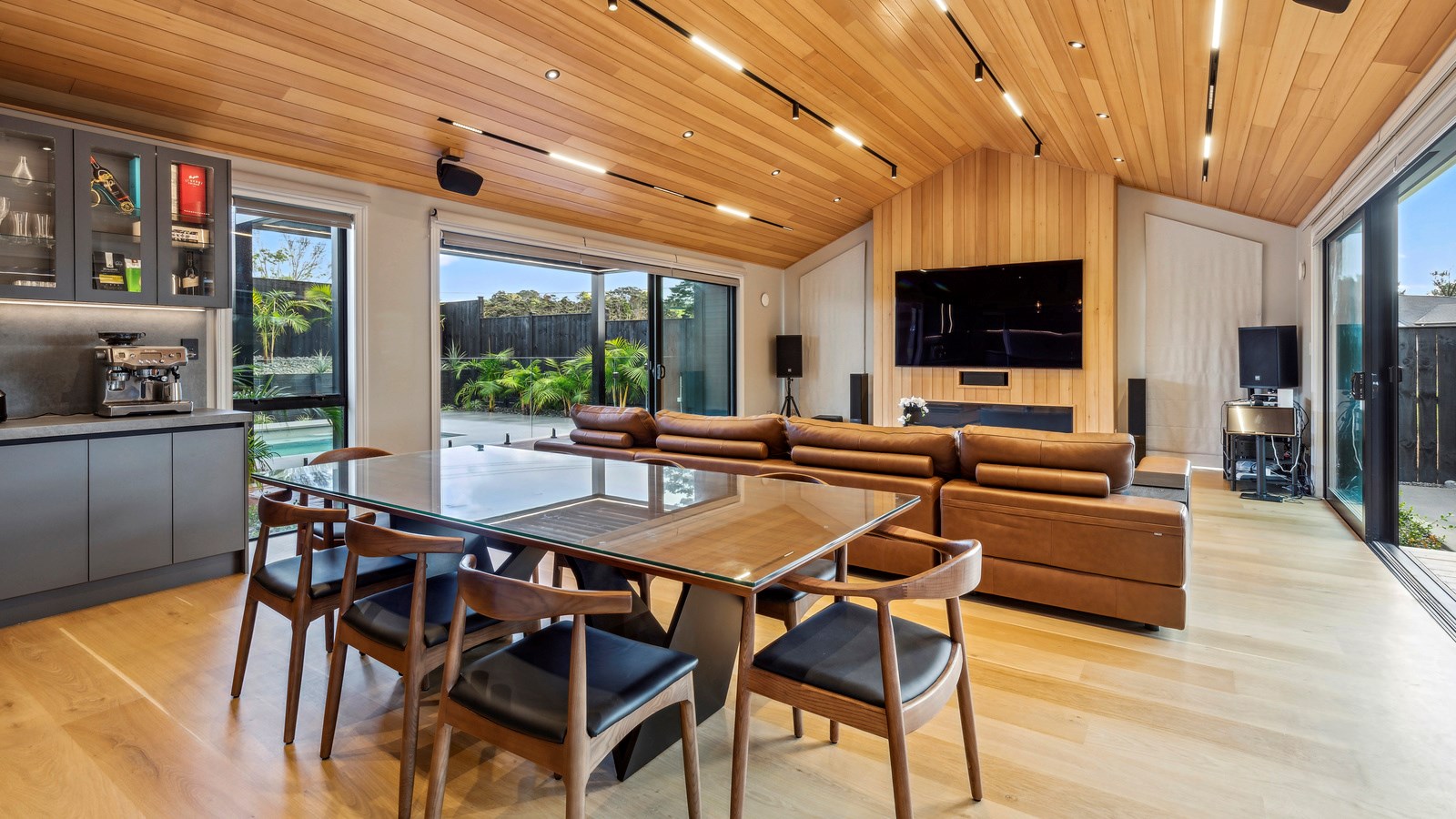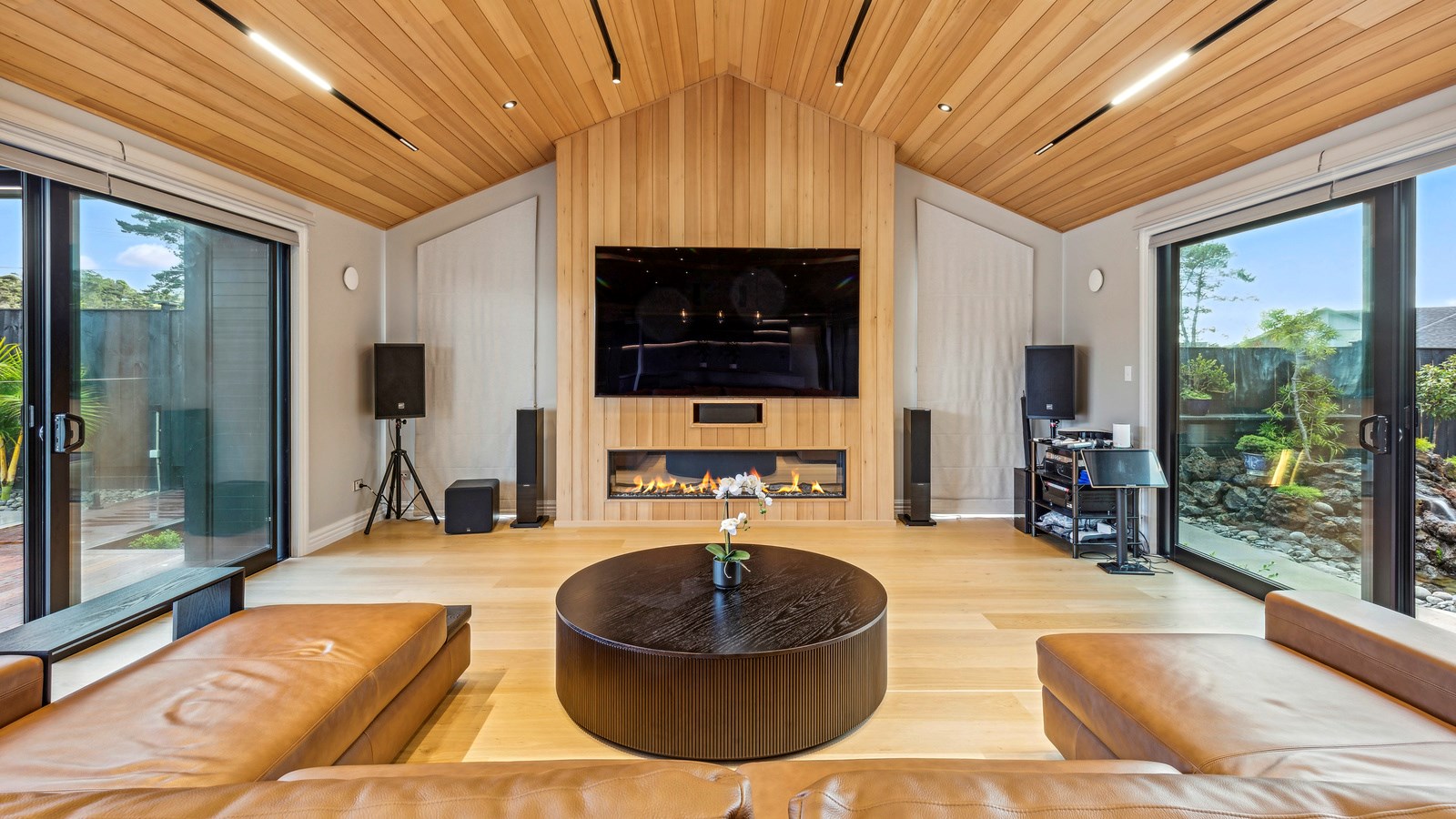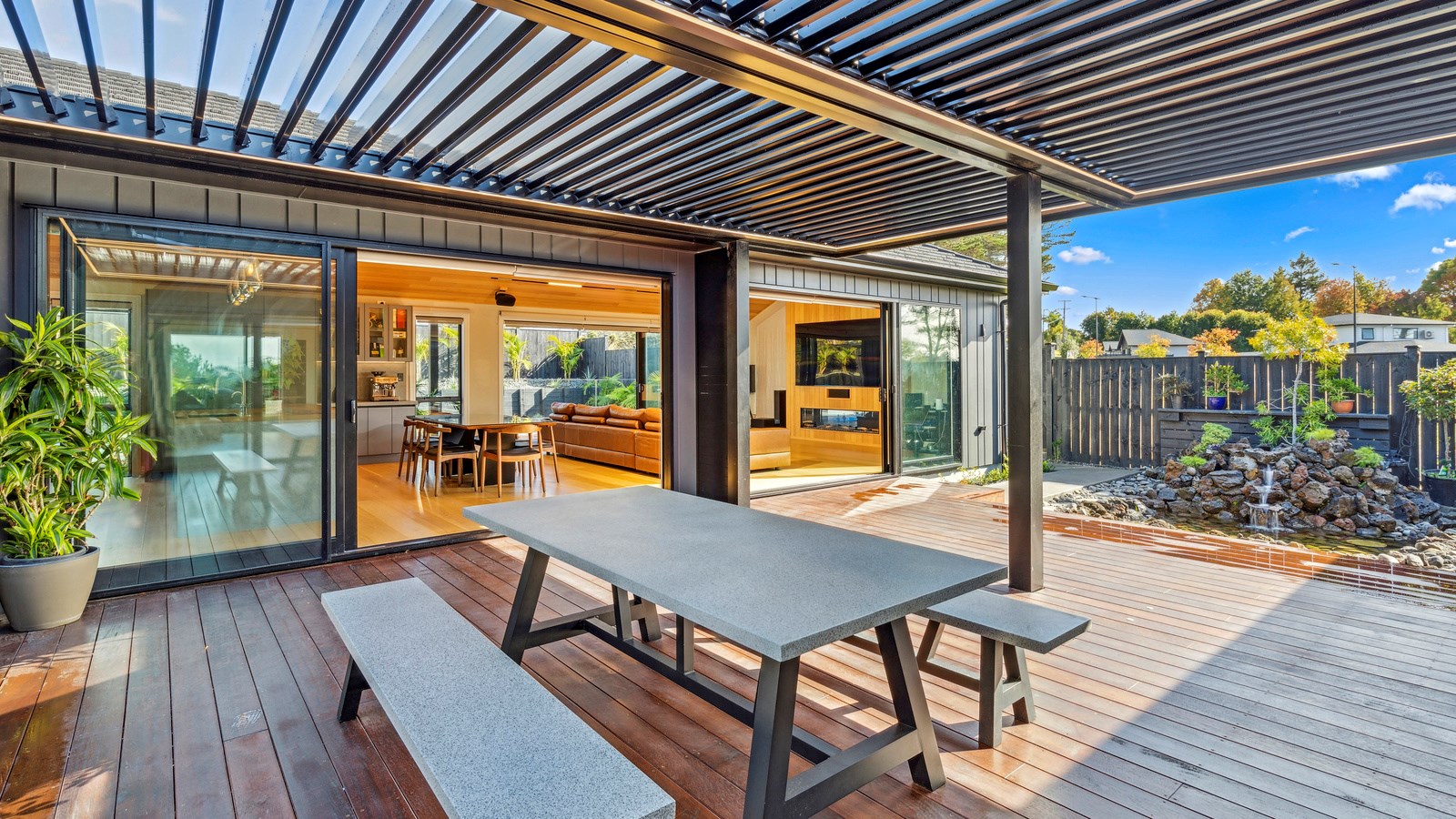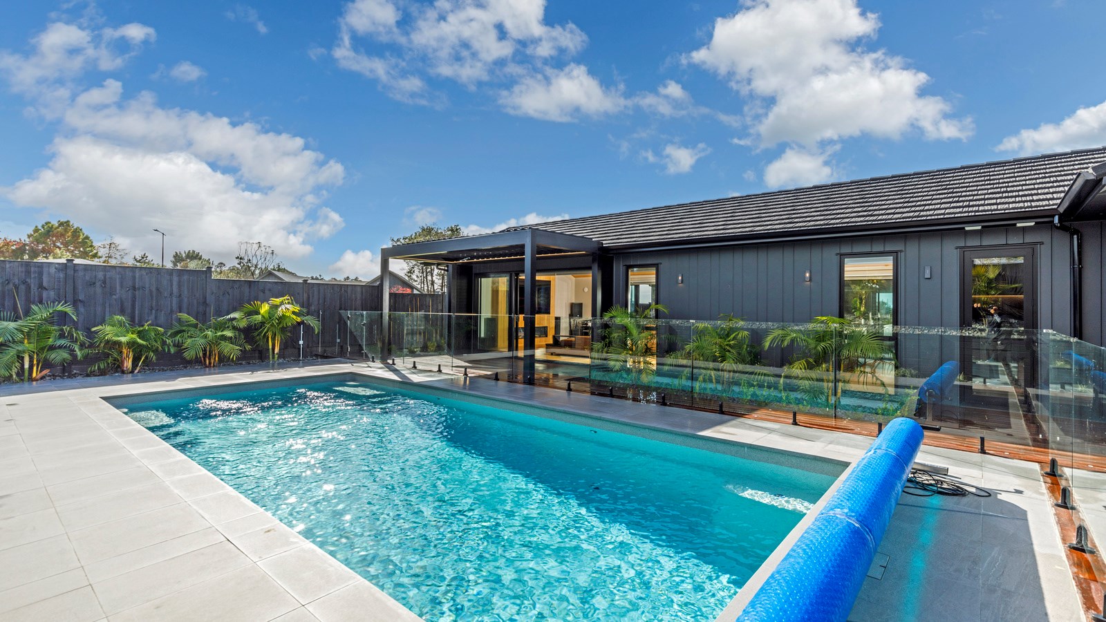 This single-storey marvel exudes contemporary luxury. With 385sqm of living space positioned on a 1000sqm plot, this spacious home combines modern elegance with calming, natural elements. The exterior is a monochromatic design with cedar wood, cement board, block and schist stone walls while a central Japanese-inspired waterfall fishpond adds a tranquil element to the garden. Two living spaces, connected by a deck with pergolas, flow to the 8.8m fibreglass pool. The most stunning space, however, is the open-concept kitchen-living-dining area featuring European oak flooring, a vaulted timber ceiling, an electric fireplace and sleek grey-stone countertops. The chef’s kitchen boasts a gas stovetop and discrete storage. This spacious hub opens up on both sides to the pool and decking, for sumptuous indoor-outdoor entertaining.