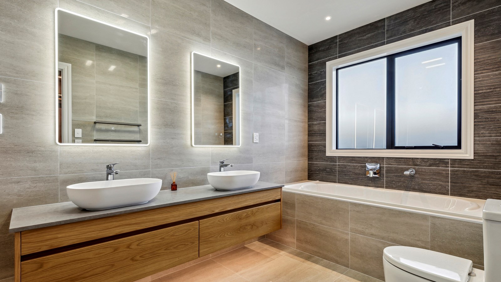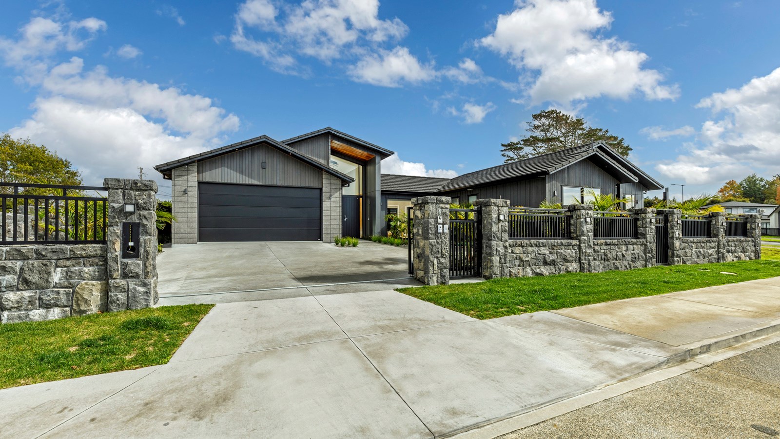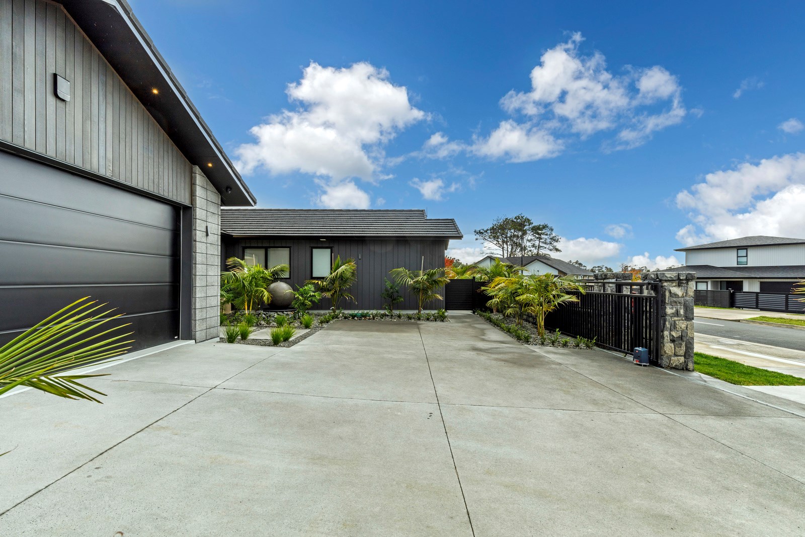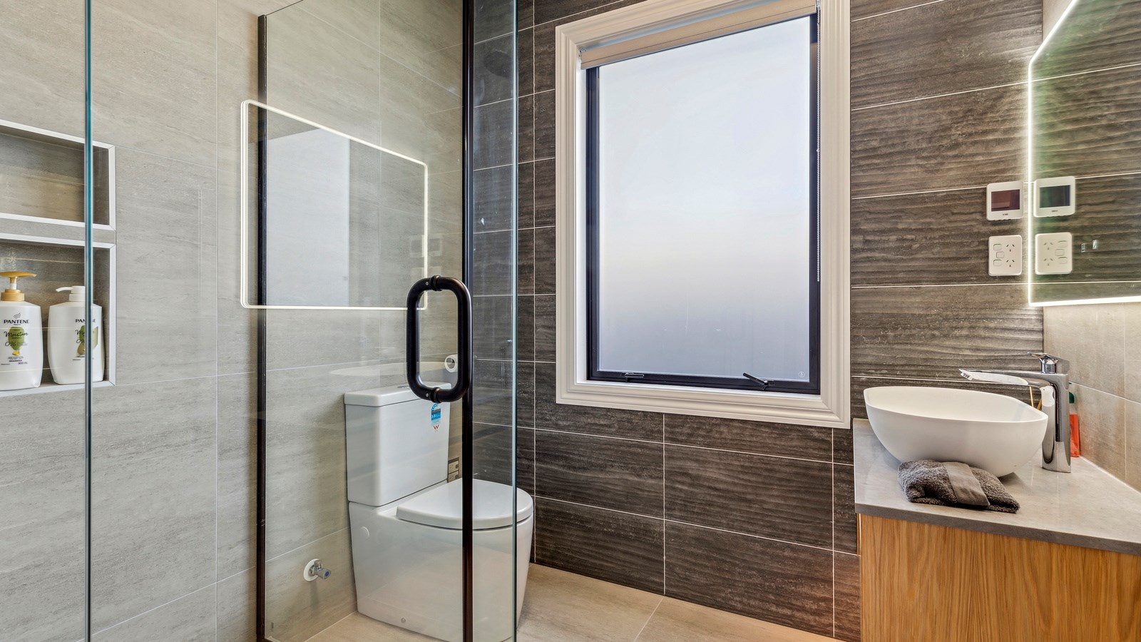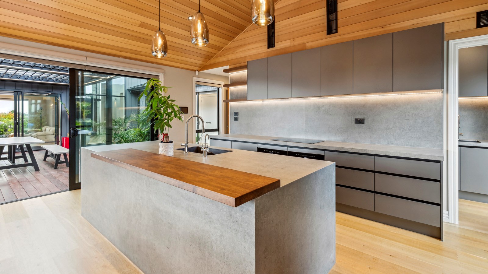 This single-storey marvel exudes contemporary luxury. With 385sqm of living space positioned on a 1000sqm plot, this spacious home combines modern elegance with calming, natural elements. The exterior is a monochromatic design with cedar wood, cement board, block and schist stone walls while a central Japanese-inspired waterfall fishpond adds a tranquil element to the garden. Two living spaces, connected by a deck with pergolas, flow to the 8.8m fibreglass pool. The most stunning space, however, is the open-concept kitchen-living-dining area featuring European oak flooring, a vaulted timber ceiling, an electric fireplace and sleek grey-stone countertops. The chef’s kitchen boasts a gas stovetop and discrete storage. This spacious hub opens up on both sides to the pool and decking, for sumptuous indoor-outdoor entertaining.