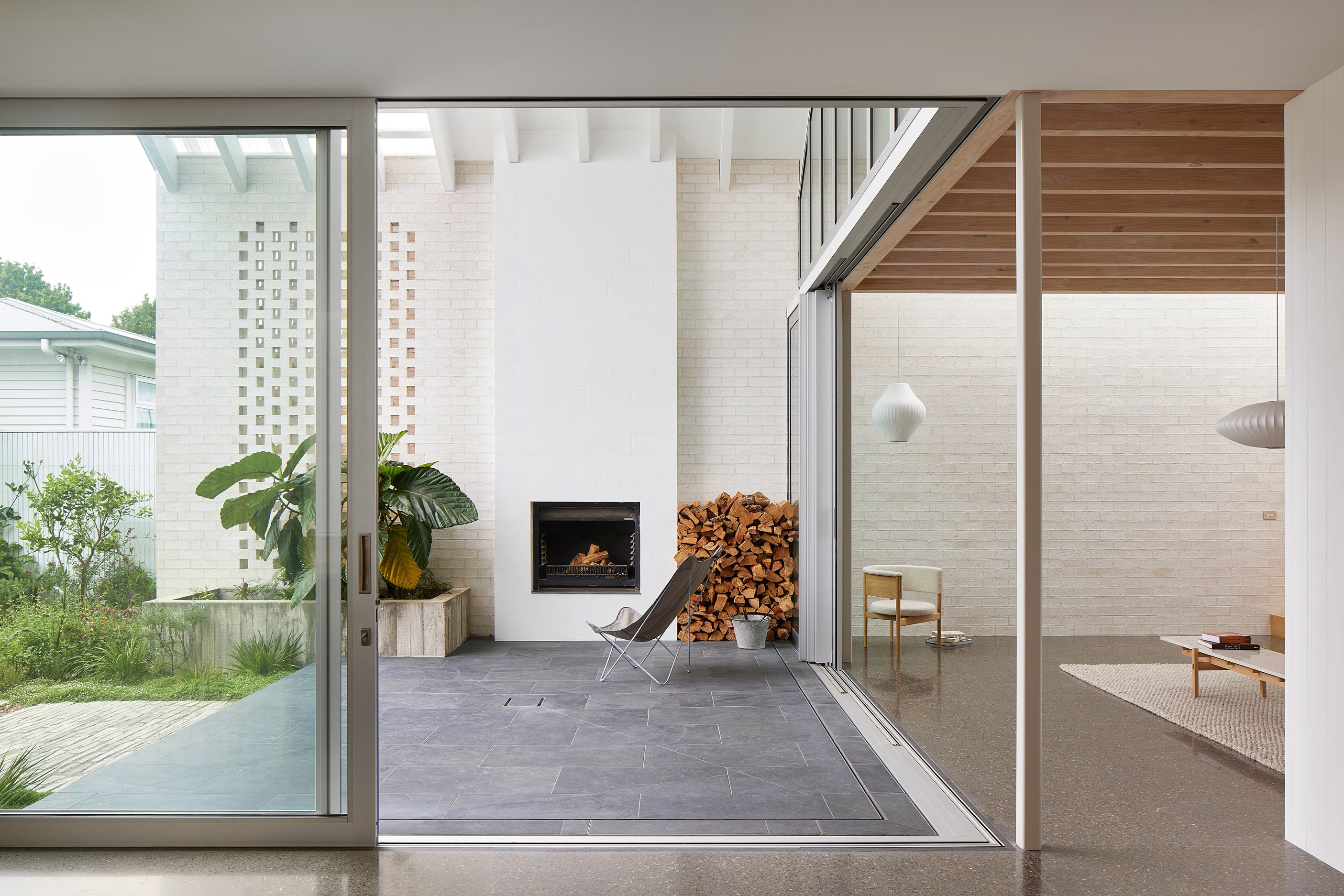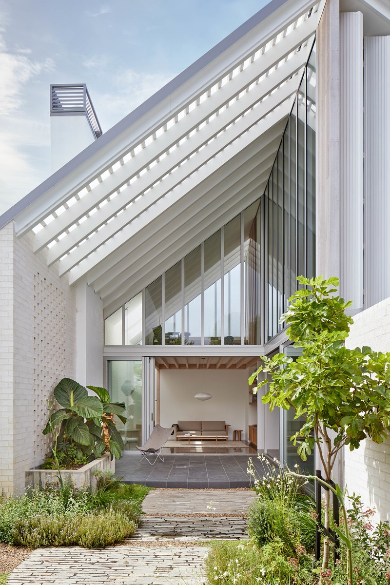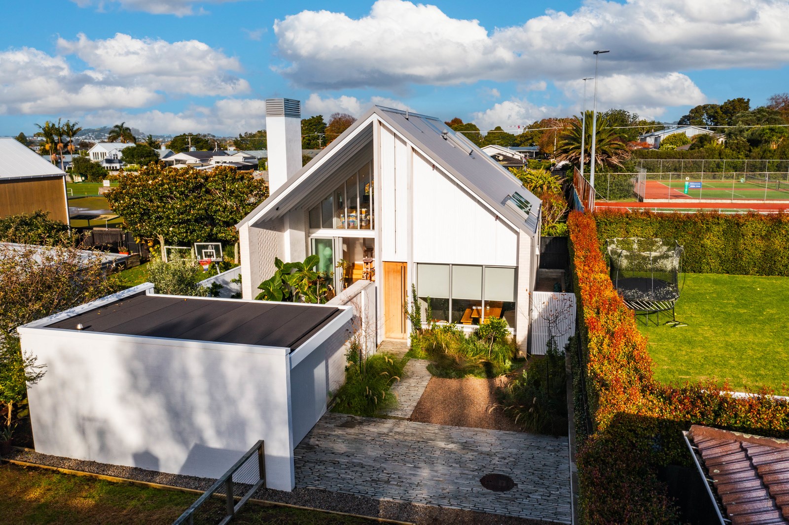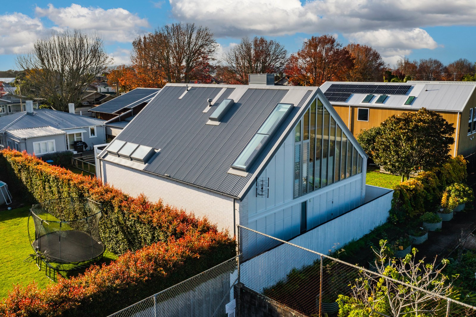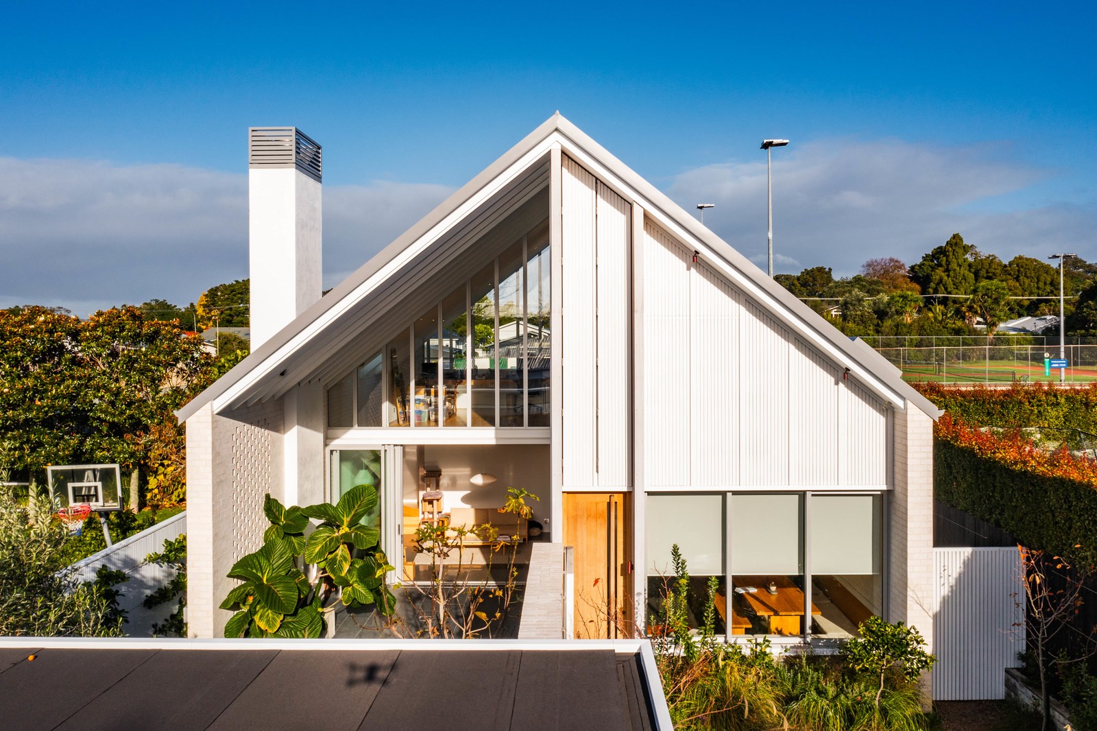 Here’s a simple gabled form encompassing a modest 180sqm – including a separate garage-studio. There can be no downplaying the sum of the many scrupulously designed and executed parts, however. The three-bedroom, two-bathroom home dubbed the Point House is utterly lovely. New Zealand-made cream bricks, oak, polished concrete and painted board-and-batten cladding coalesce into an exterior that provides textural richness and intrigue. There’s no better place to see evidence of this than the double-height outdoor room that flows from the living room and stars exposed rafters, a glass ceiling and a perforated brick wall that filters in even more natural light. The two-level house rises behind an existing bungalow on what was an empty backyard. One boundary adjoins a reserve with a community garden and tennis, bowling and croquet clubs.