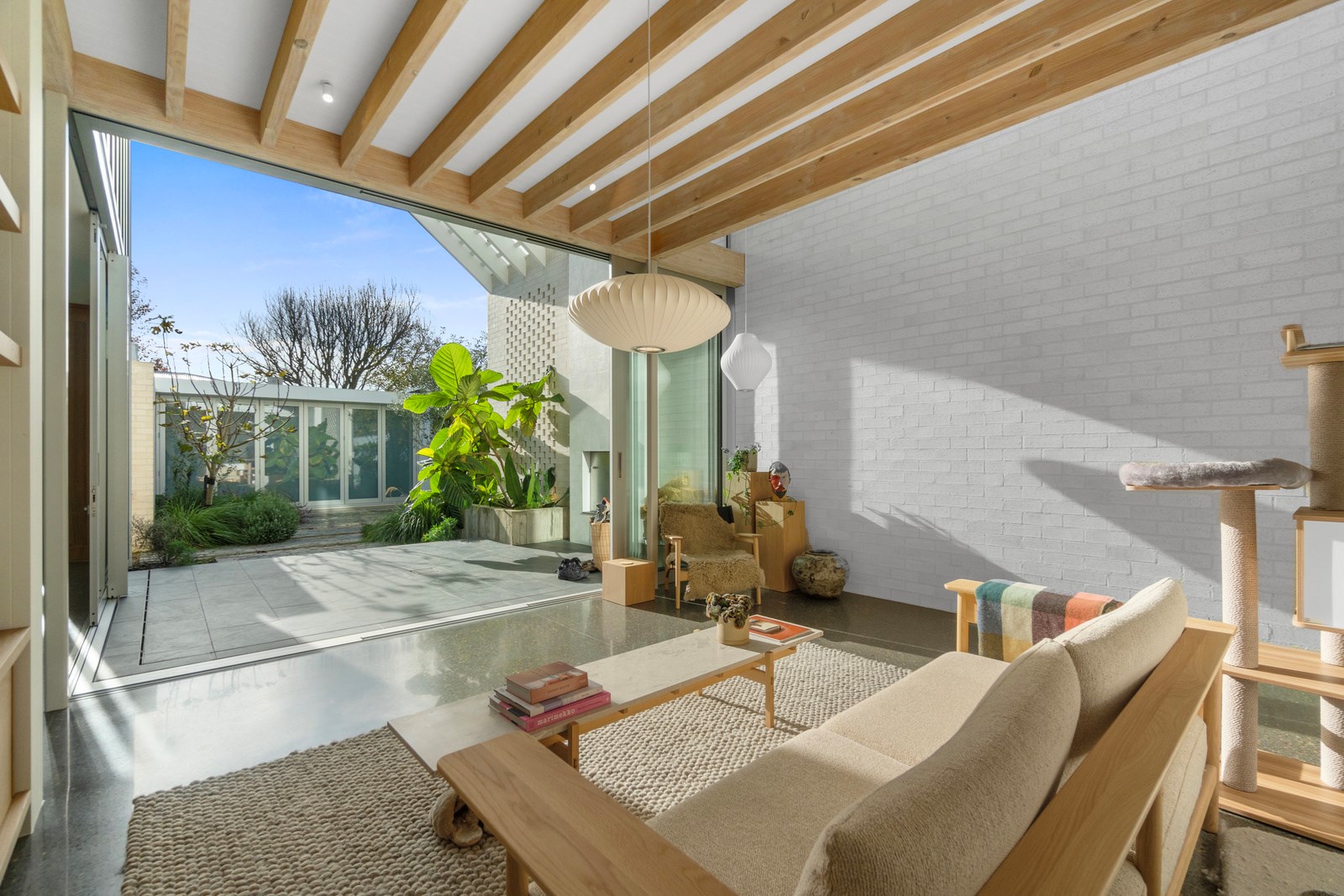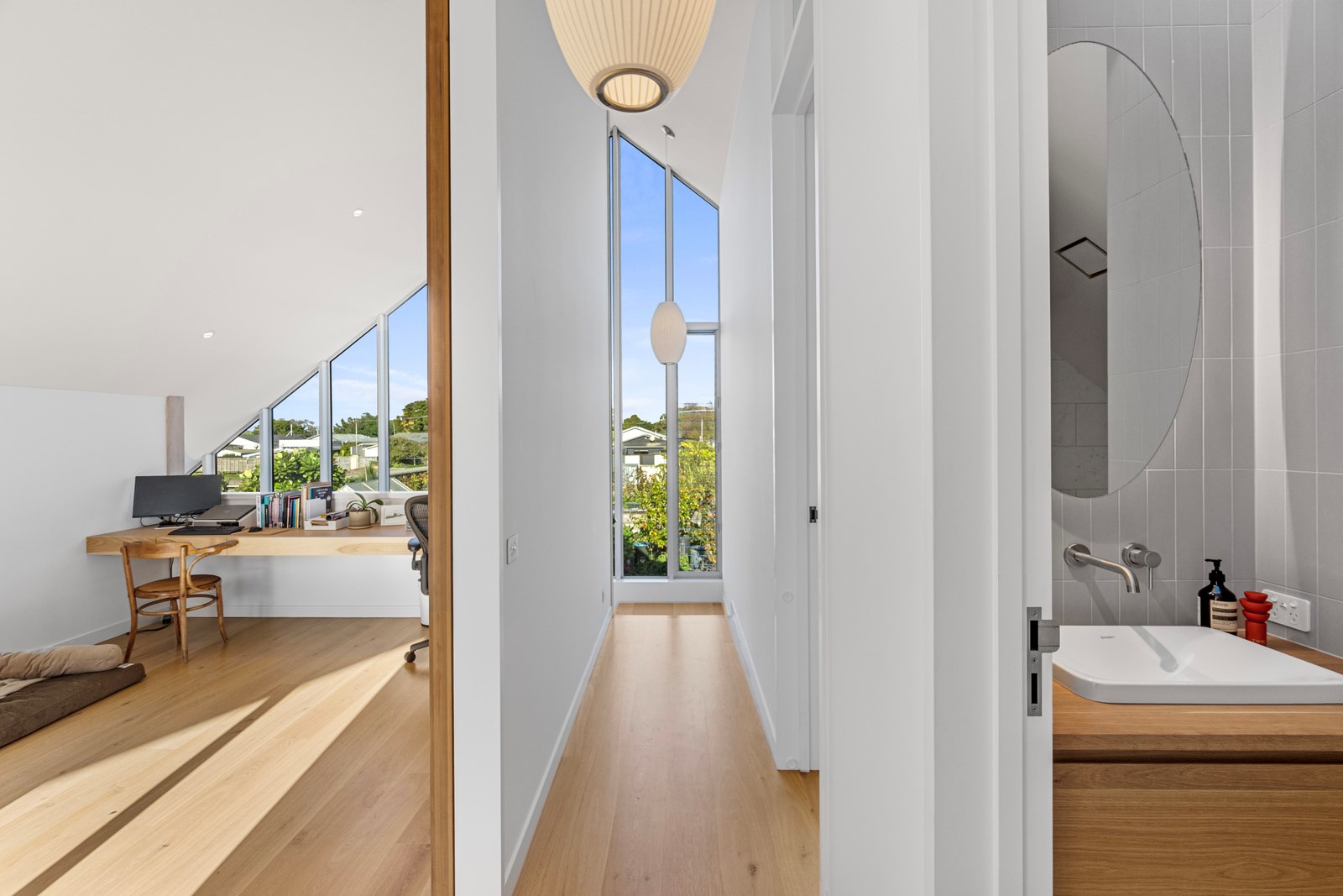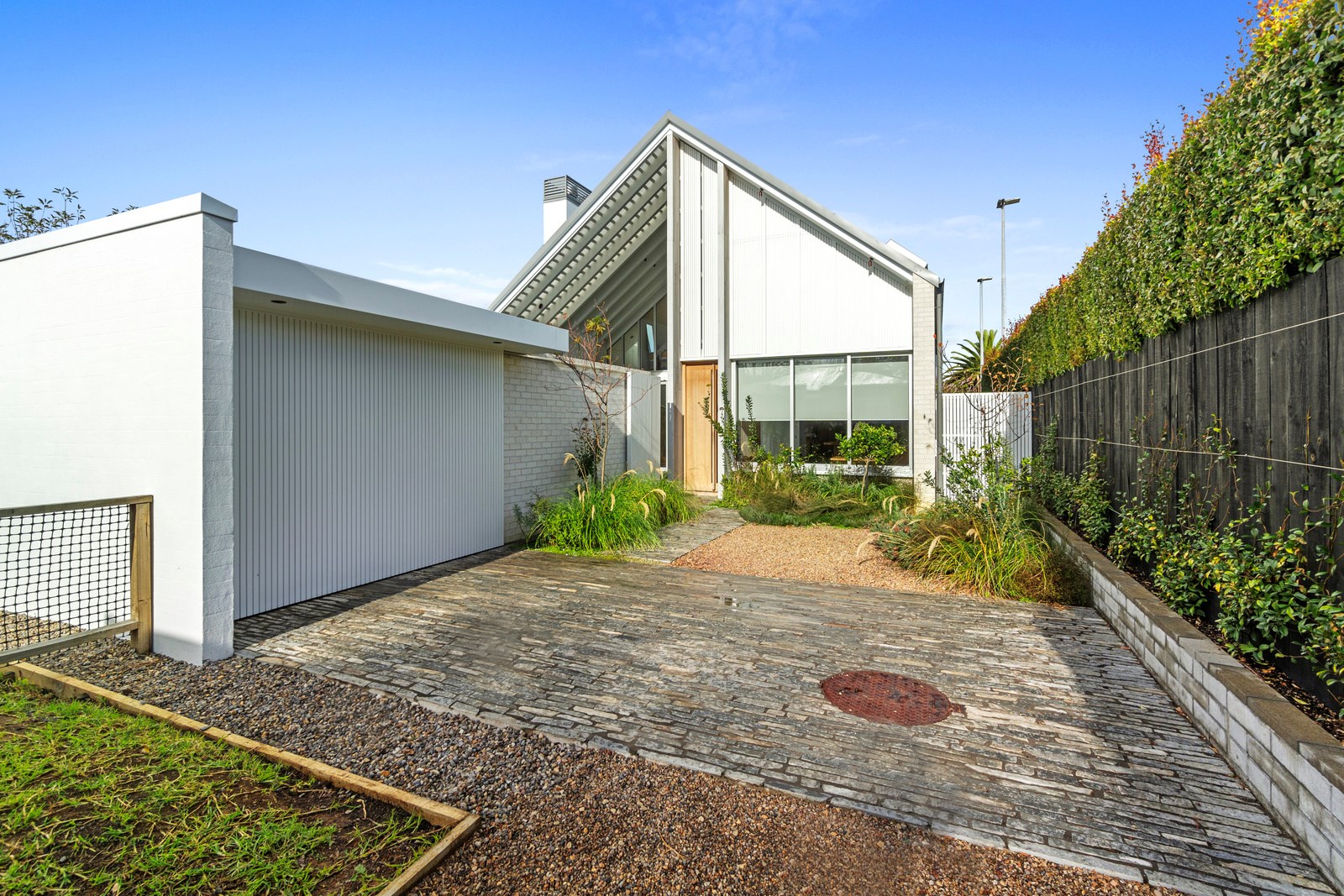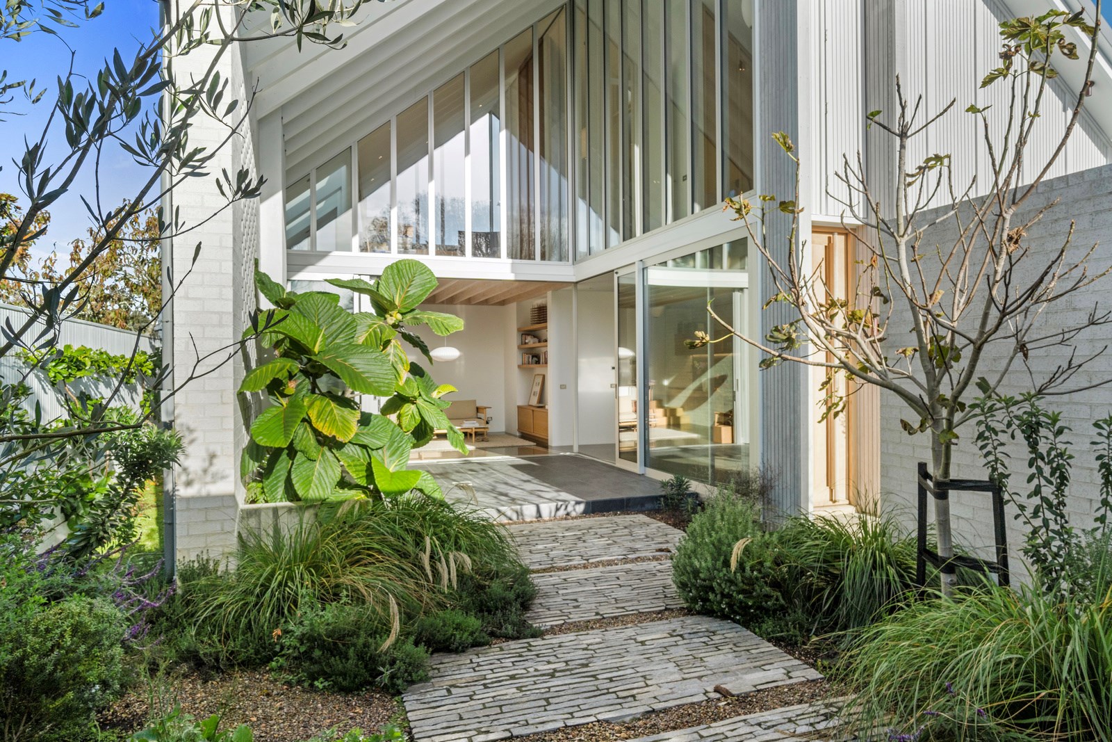 Here’s a simple gabled form encompassing a modest 180sqm – including a separate garage-studio. There can be no downplaying the sum of the many scrupulously designed and executed parts, however. The three-bedroom, two-bathroom home dubbed the Point House is utterly lovely. New Zealand-made cream bricks, oak, polished concrete and painted board-and-batten cladding coalesce into an exterior that provides textural richness and intrigue. There’s no better place to see evidence of this than the double-height outdoor room that flows from the living room and stars exposed rafters, a glass ceiling and a perforated brick wall that filters in even more natural light. The two-level house rises behind an existing bungalow on what was an empty backyard. One boundary adjoins a reserve with a community garden and tennis, bowling and croquet clubs.