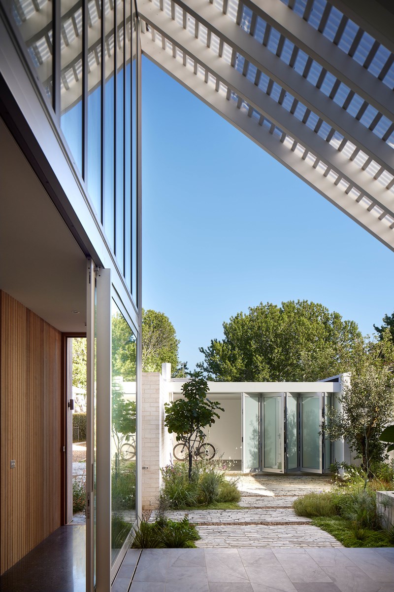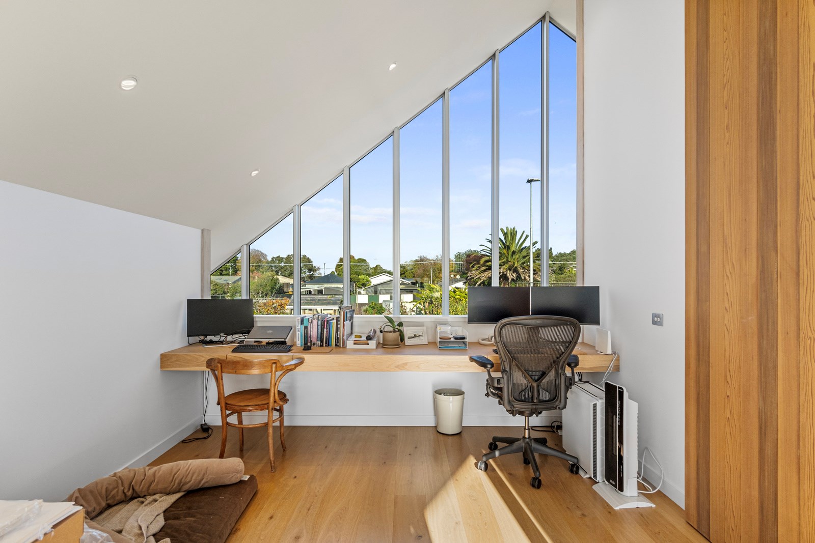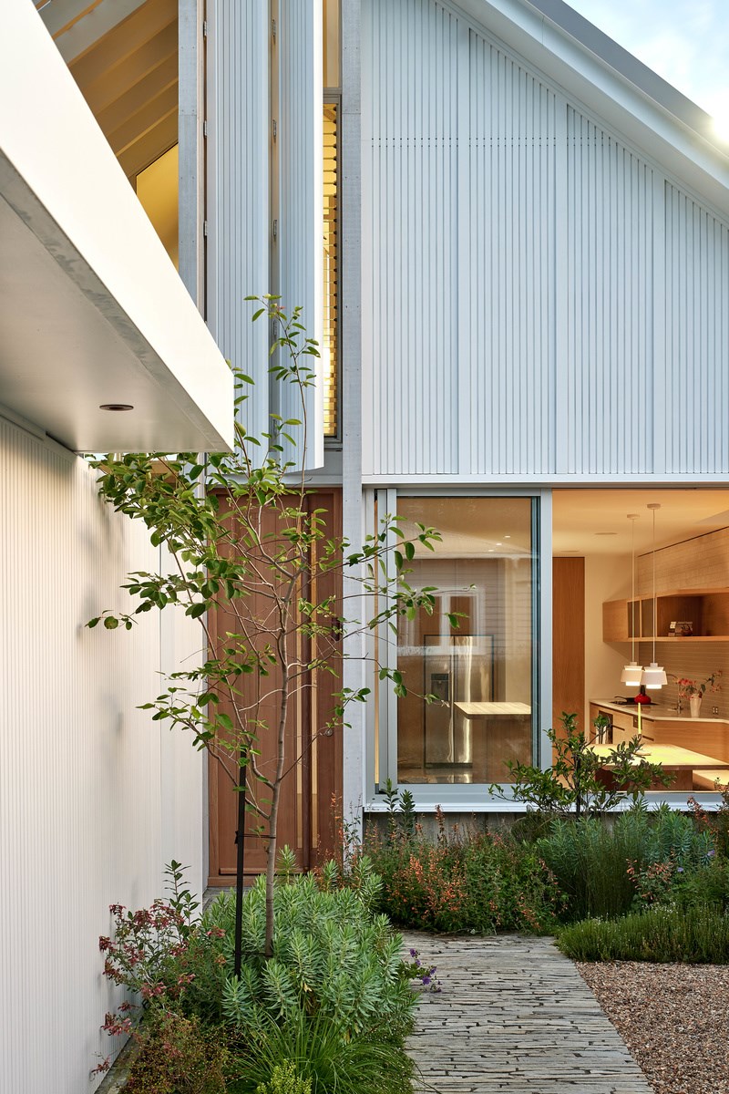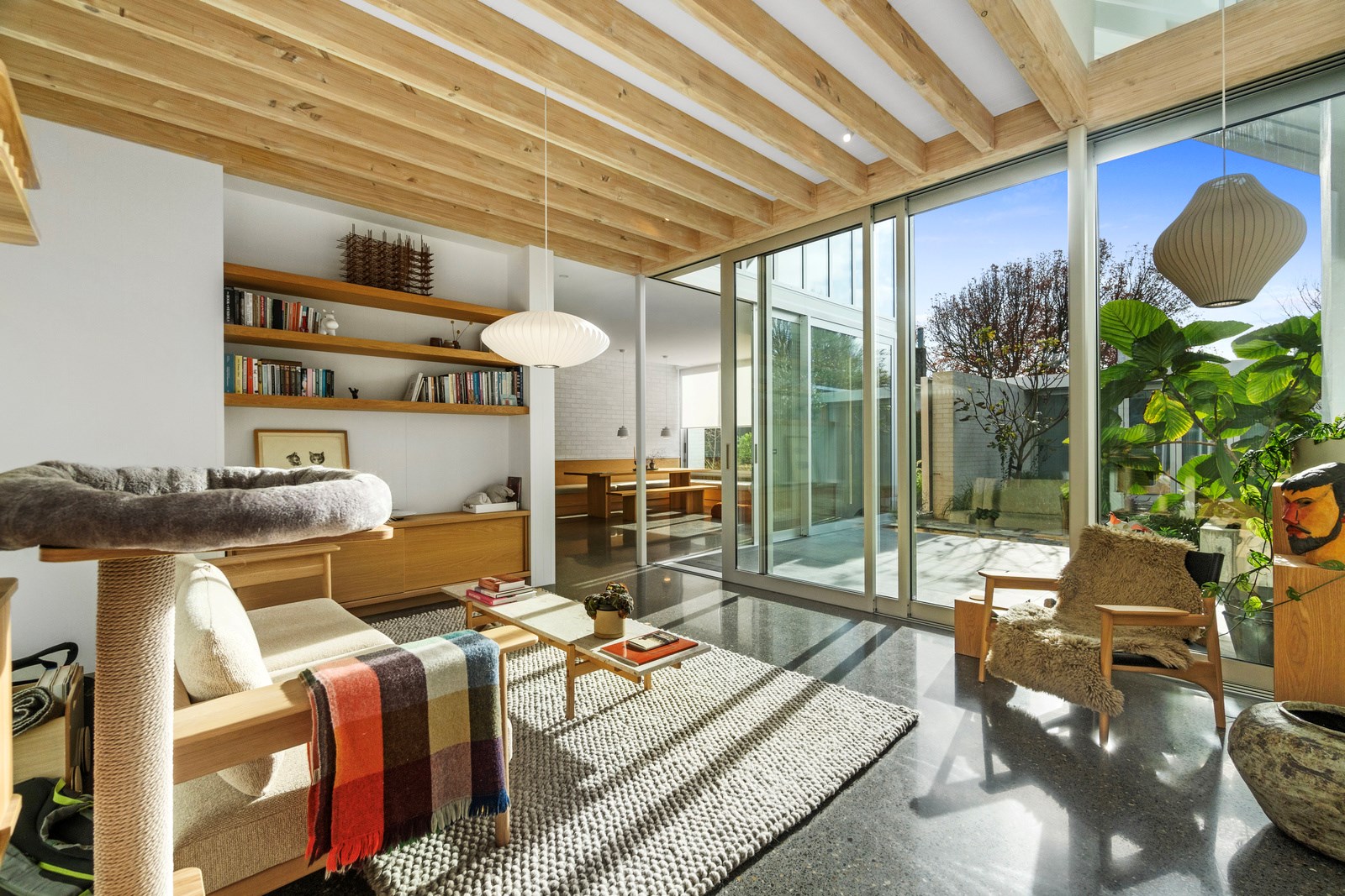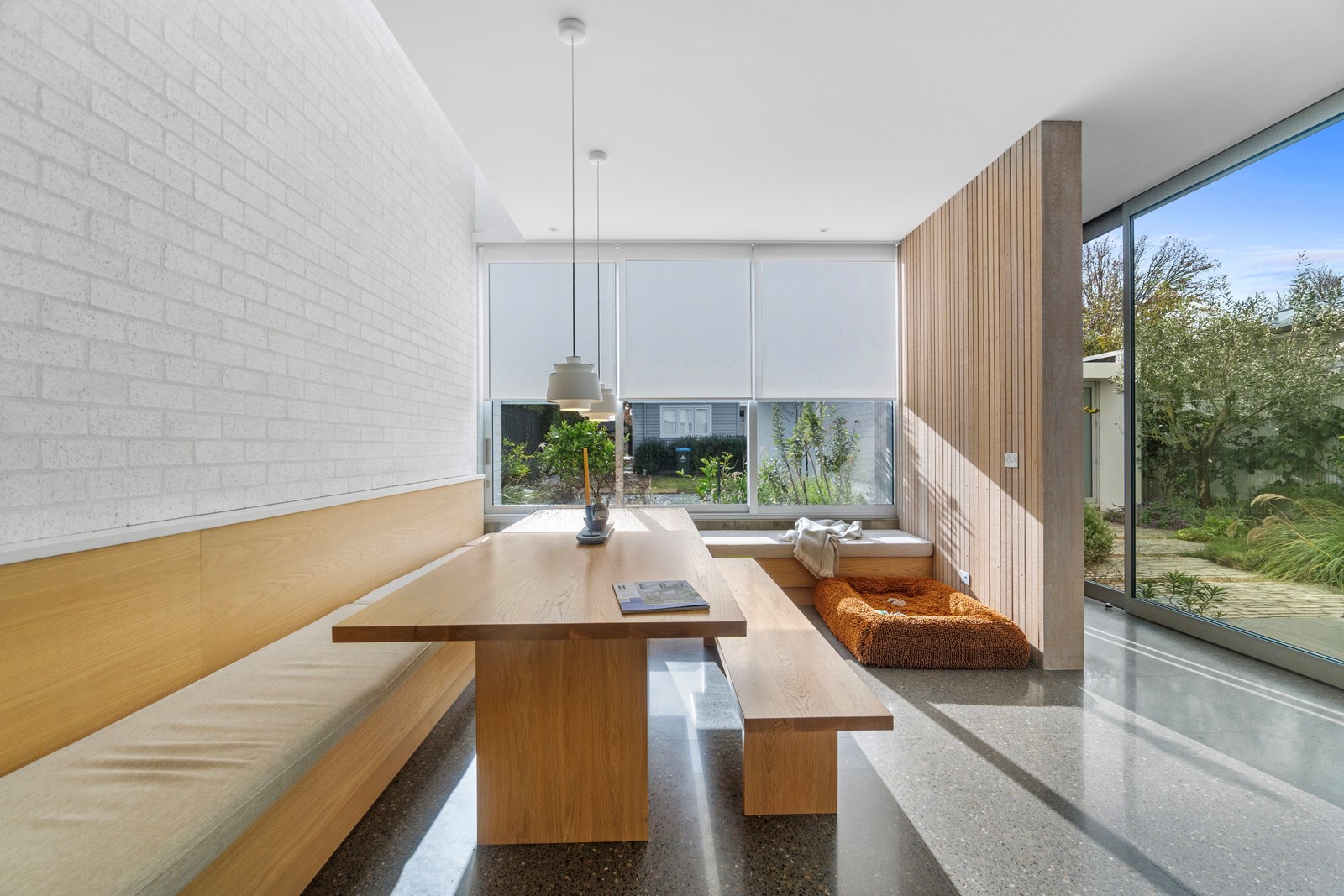 Here’s a simple gabled form encompassing a modest 180sqm – including a separate garage-studio. There can be no downplaying the sum of the many scrupulously designed and executed parts, however. The three-bedroom, two-bathroom home dubbed the Point House is utterly lovely. New Zealand-made cream bricks, oak, polished concrete and painted board-and-batten cladding coalesce into an exterior that provides textural richness and intrigue. There’s no better place to see evidence of this than the double-height outdoor room that flows from the living room and stars exposed rafters, a glass ceiling and a perforated brick wall that filters in even more natural light. The two-level house rises behind an existing bungalow on what was an empty backyard. One boundary adjoins a reserve with a community garden and tennis, bowling and croquet clubs.