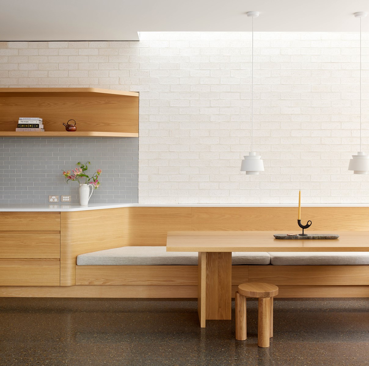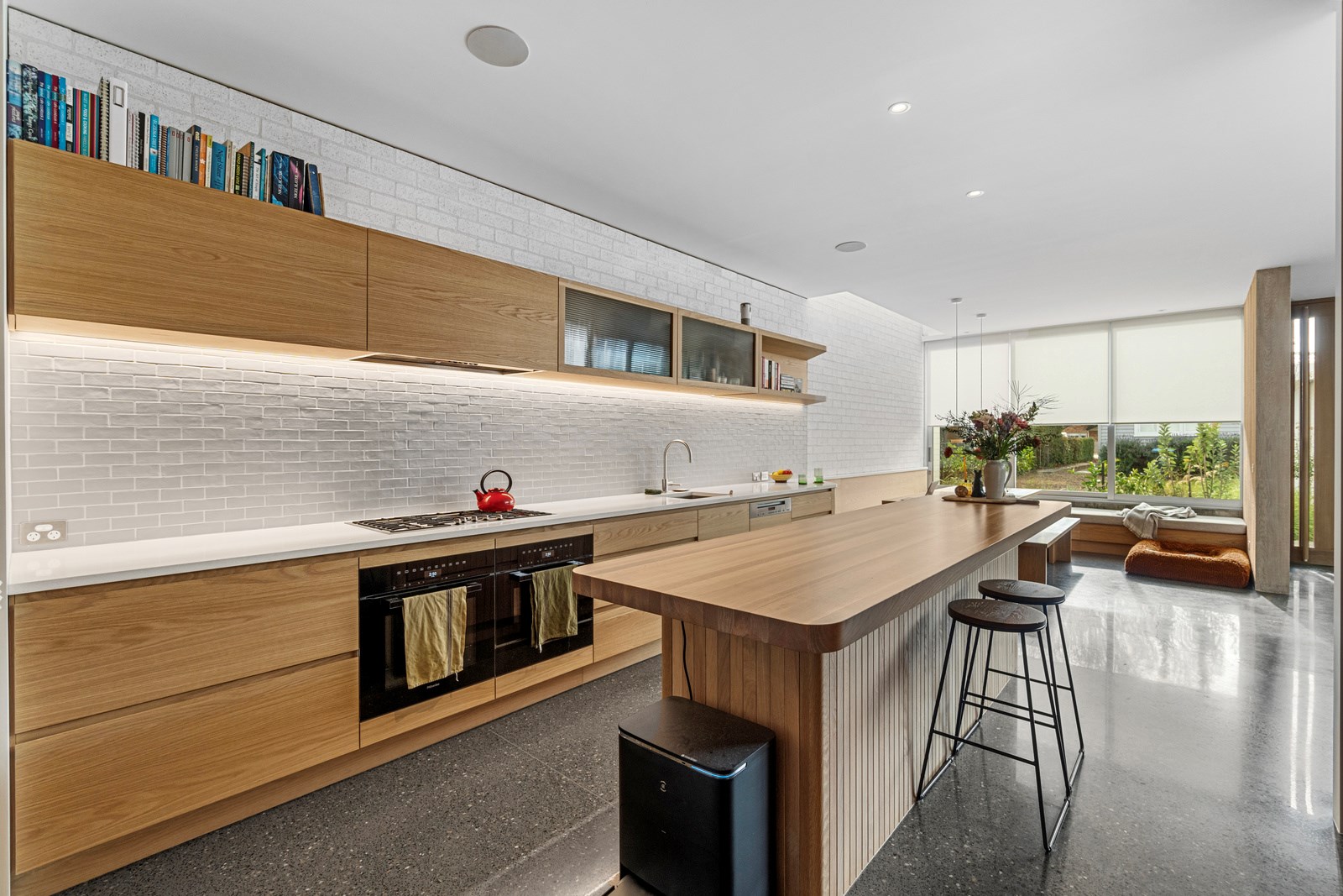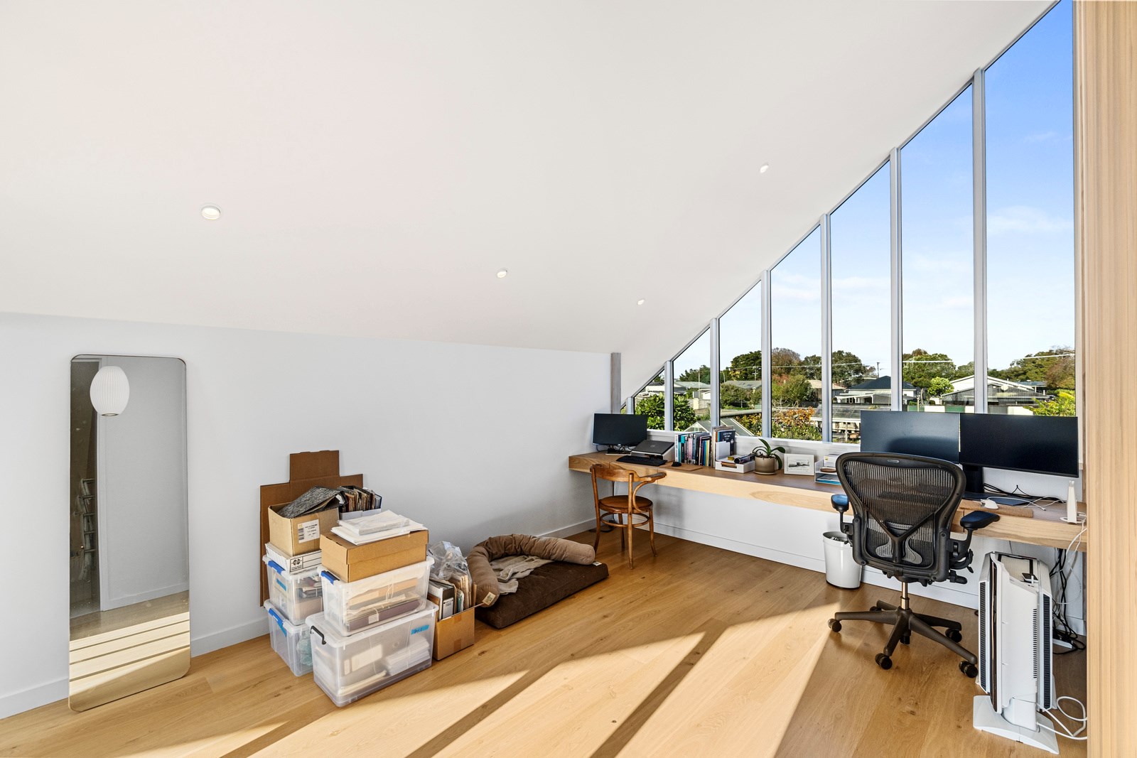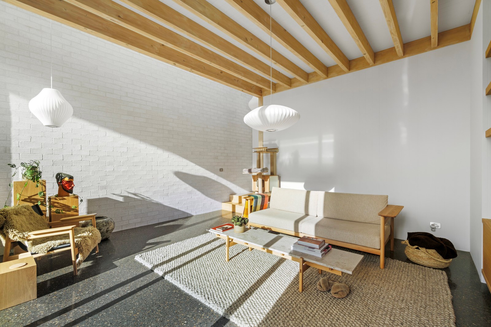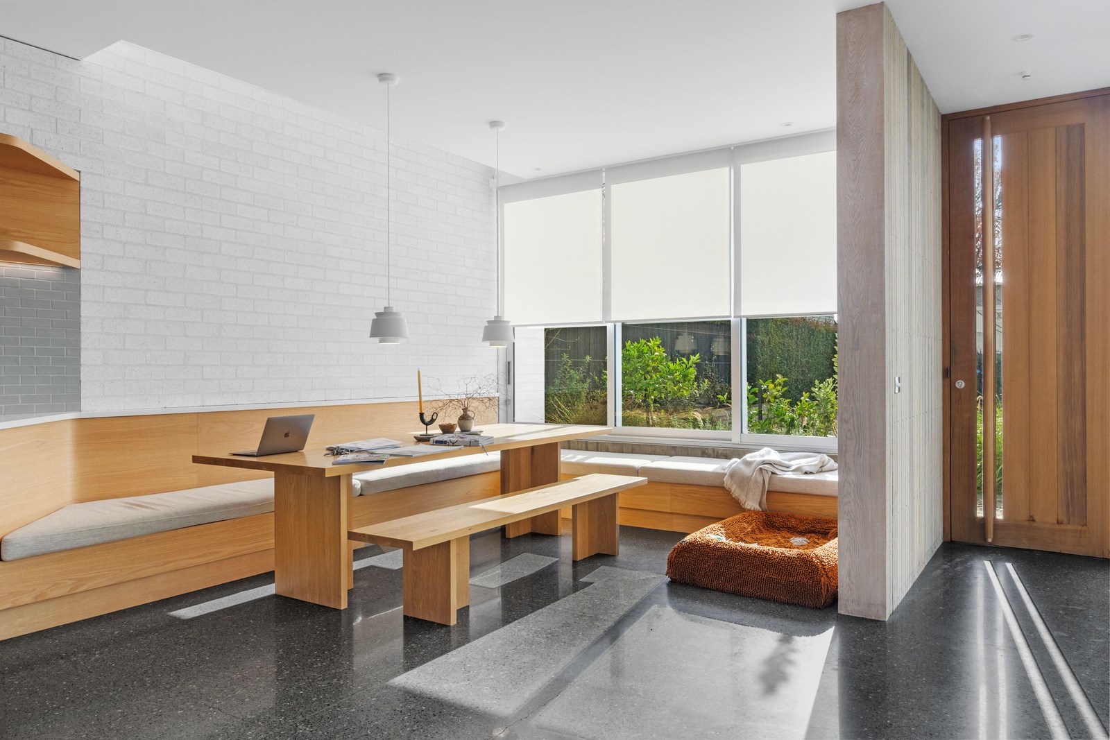 Here’s a simple gabled form encompassing a modest 180sqm – including a separate garage-studio. There can be no downplaying the sum of the many scrupulously designed and executed parts, however. The three-bedroom, two-bathroom home dubbed the Point House is utterly lovely. New Zealand-made cream bricks, oak, polished concrete and painted board-and-batten cladding coalesce into an exterior that provides textural richness and intrigue. There’s no better place to see evidence of this than the double-height outdoor room that flows from the living room and stars exposed rafters, a glass ceiling and a perforated brick wall that filters in even more natural light. The two-level house rises behind an existing bungalow on what was an empty backyard. One boundary adjoins a reserve with a community garden and tennis, bowling and croquet clubs.