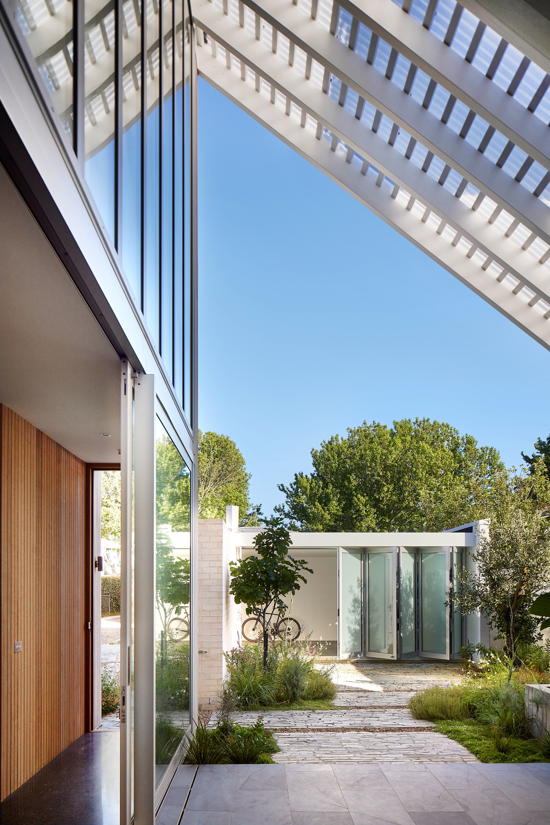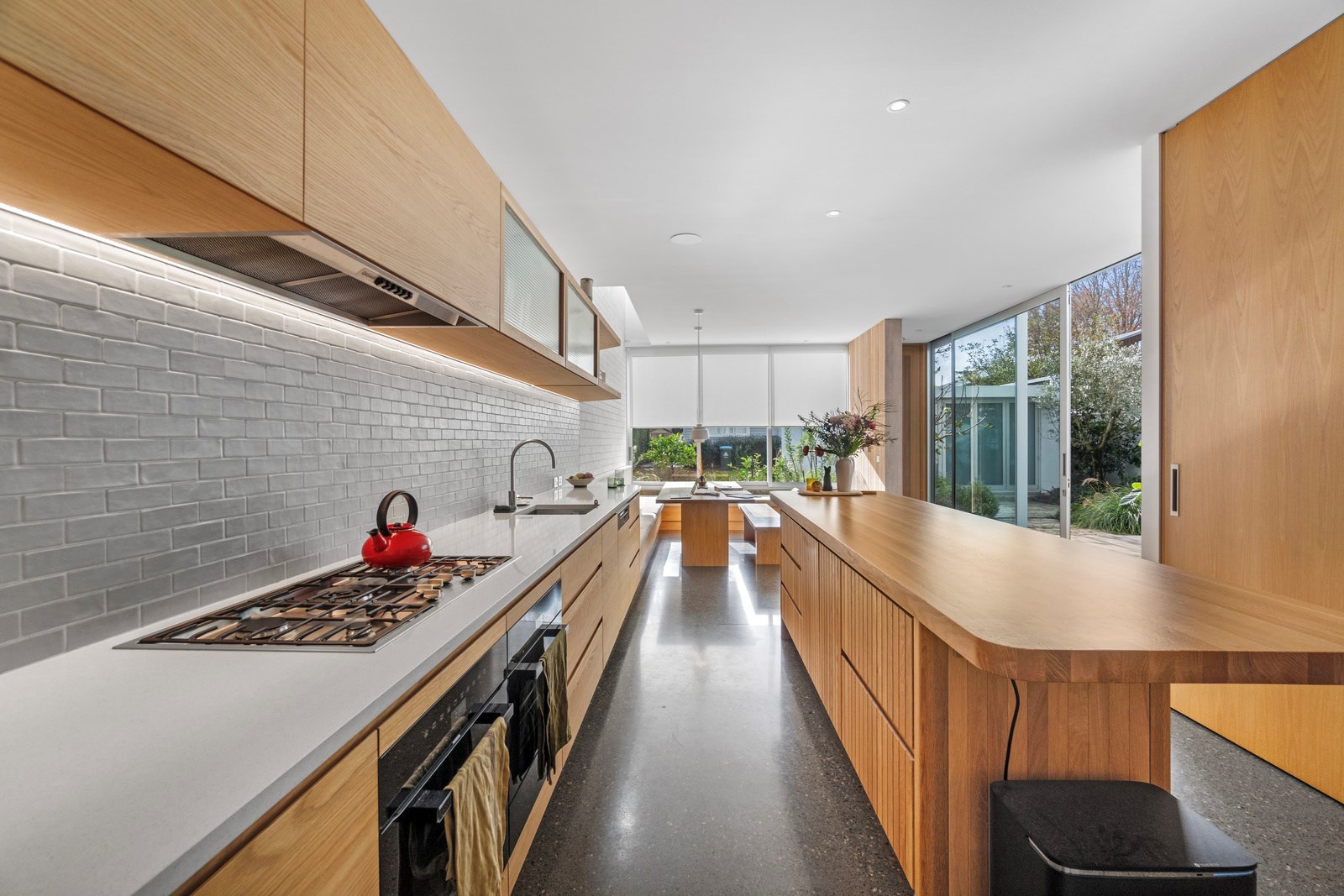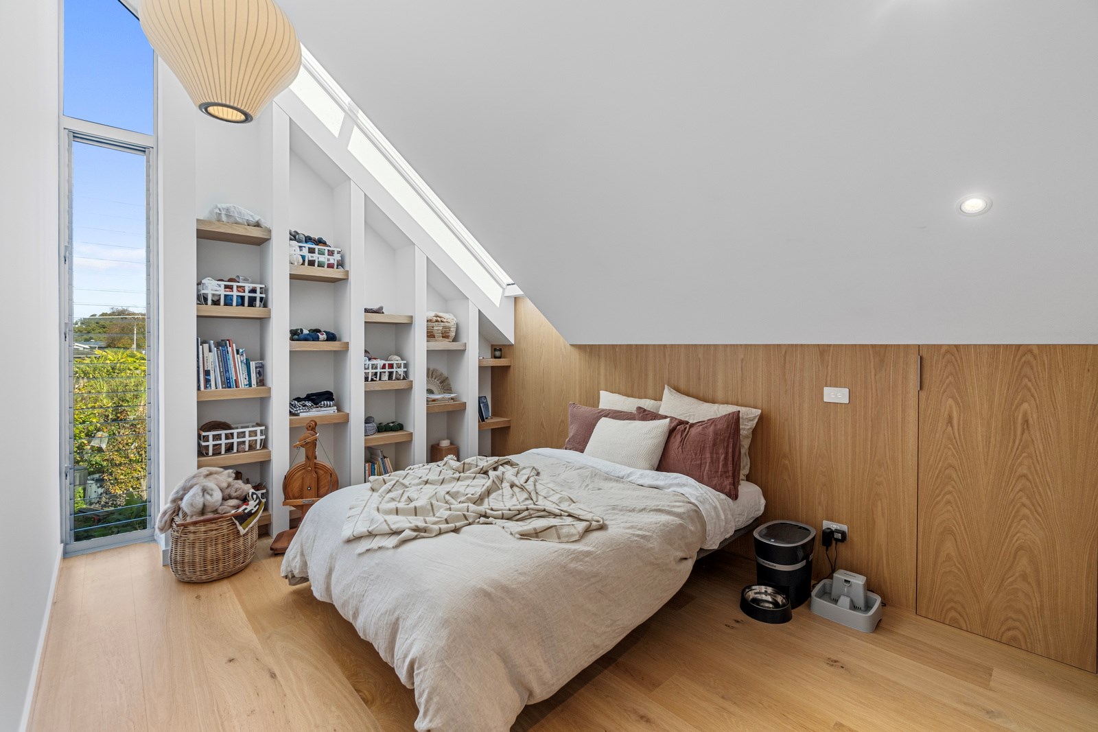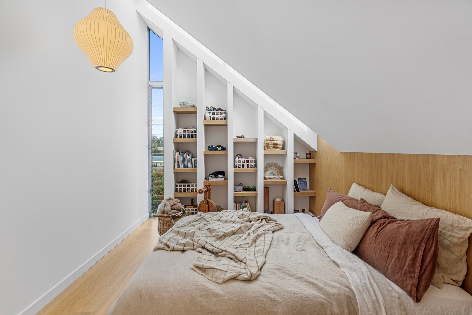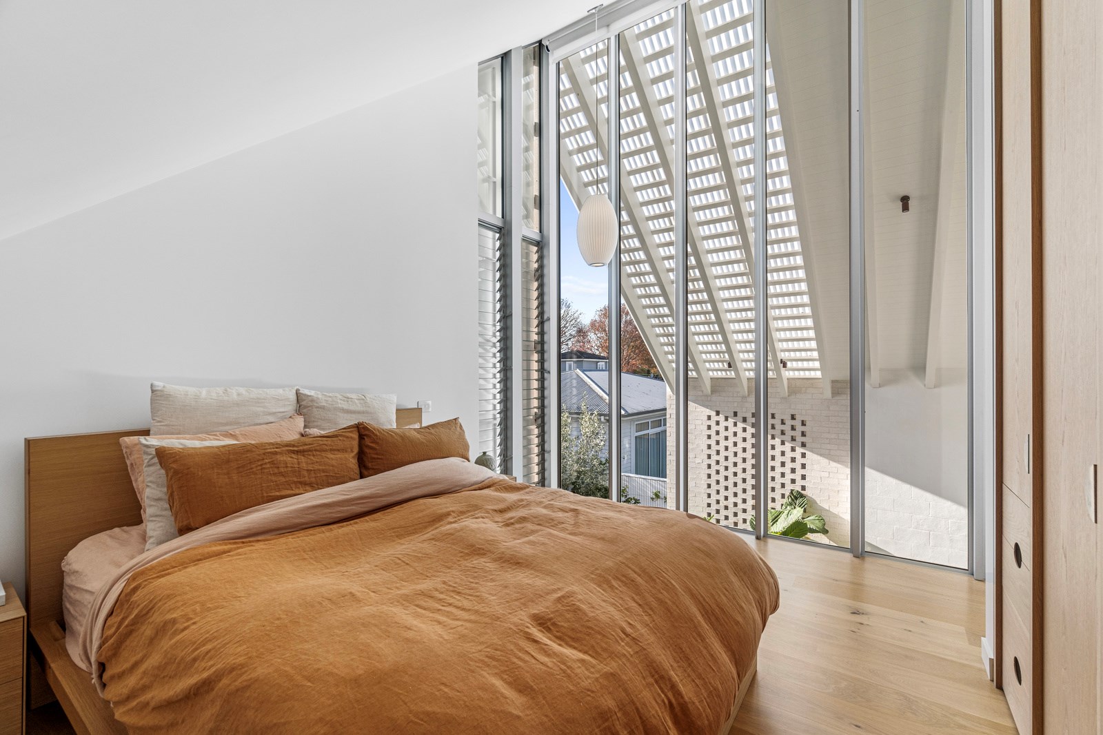 To the west are a 100-year-old church and hall. The home is a delightful addition to its neighbourhood and a model for building within our city suburbs. A square footprint has been expertly designed around the outdoor room. Downstairs is all about light, bright living spaces, including a streamlined kitchen with timber and grey tiles. Upstairs has the bedrooms and a bathroom. Here, windows and built-in shelving make the most of every square centimetre of the space created by the ceiling lines. This is elegance articulated with true craftsmanship